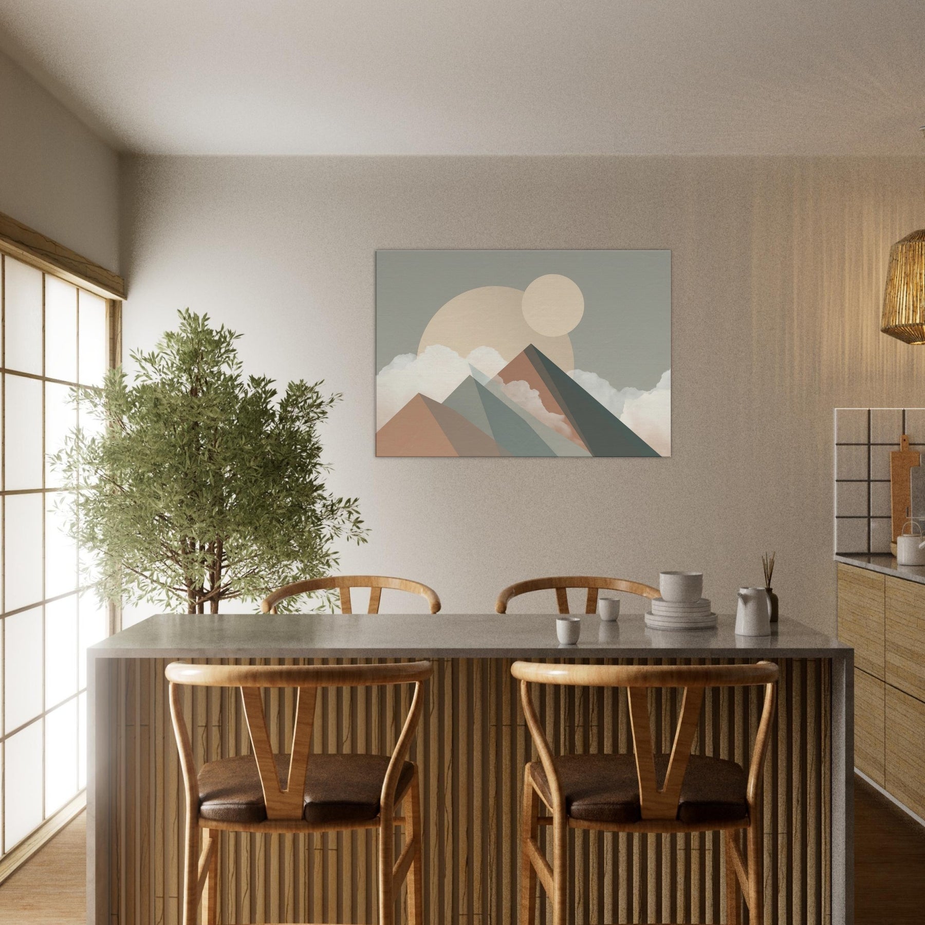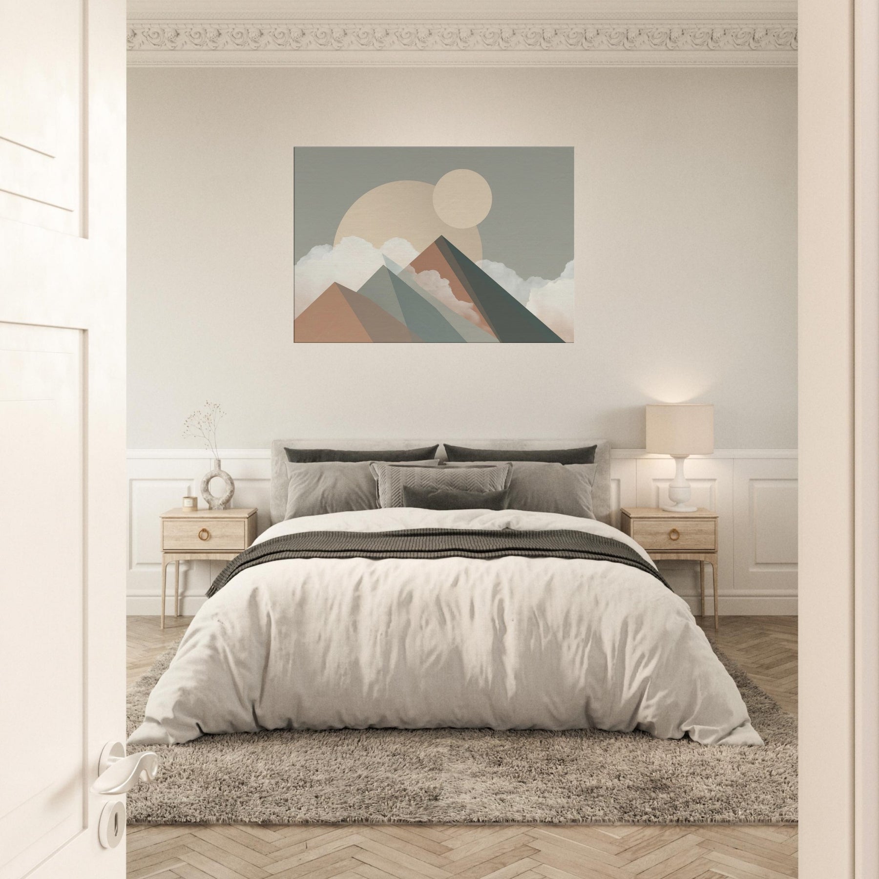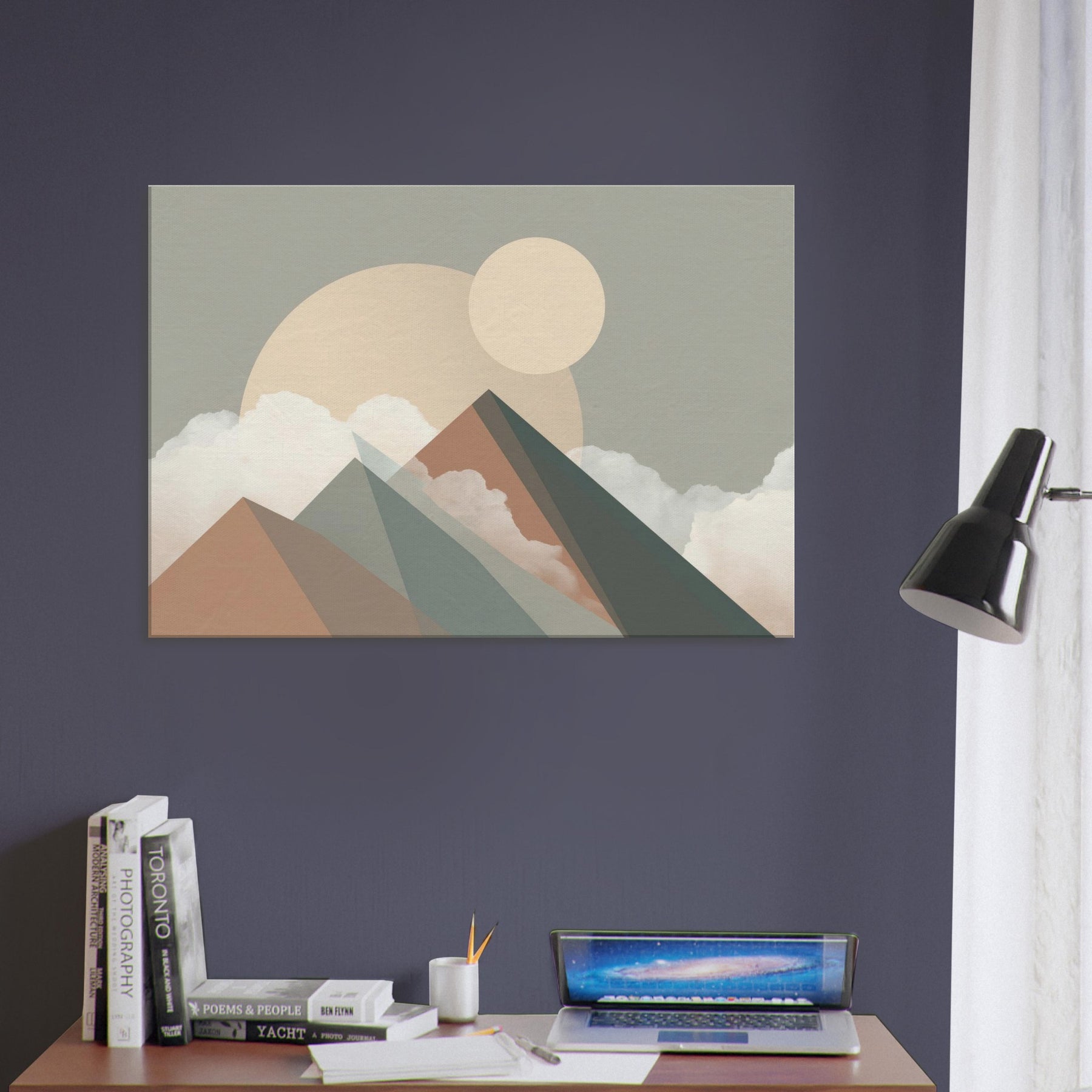 Moon over Mountains rises with quiet, celestial grace. This Moonlight Summit captures a serene, minimalist where soft geometric triangles meet a gentle horizon, while pale clouds drift by. The atmosphere feels almost mystical, inviting contemplation as light floods the room with calm and focus. Perfect for a living space or workspace, it pairs neatly with natural textures and warm neutrals, elevating mood and interrupting clutter. A subtle, refined statement that invites slower evenings and deeper breaths. The central subject is Moon over Mountains (Minimal).