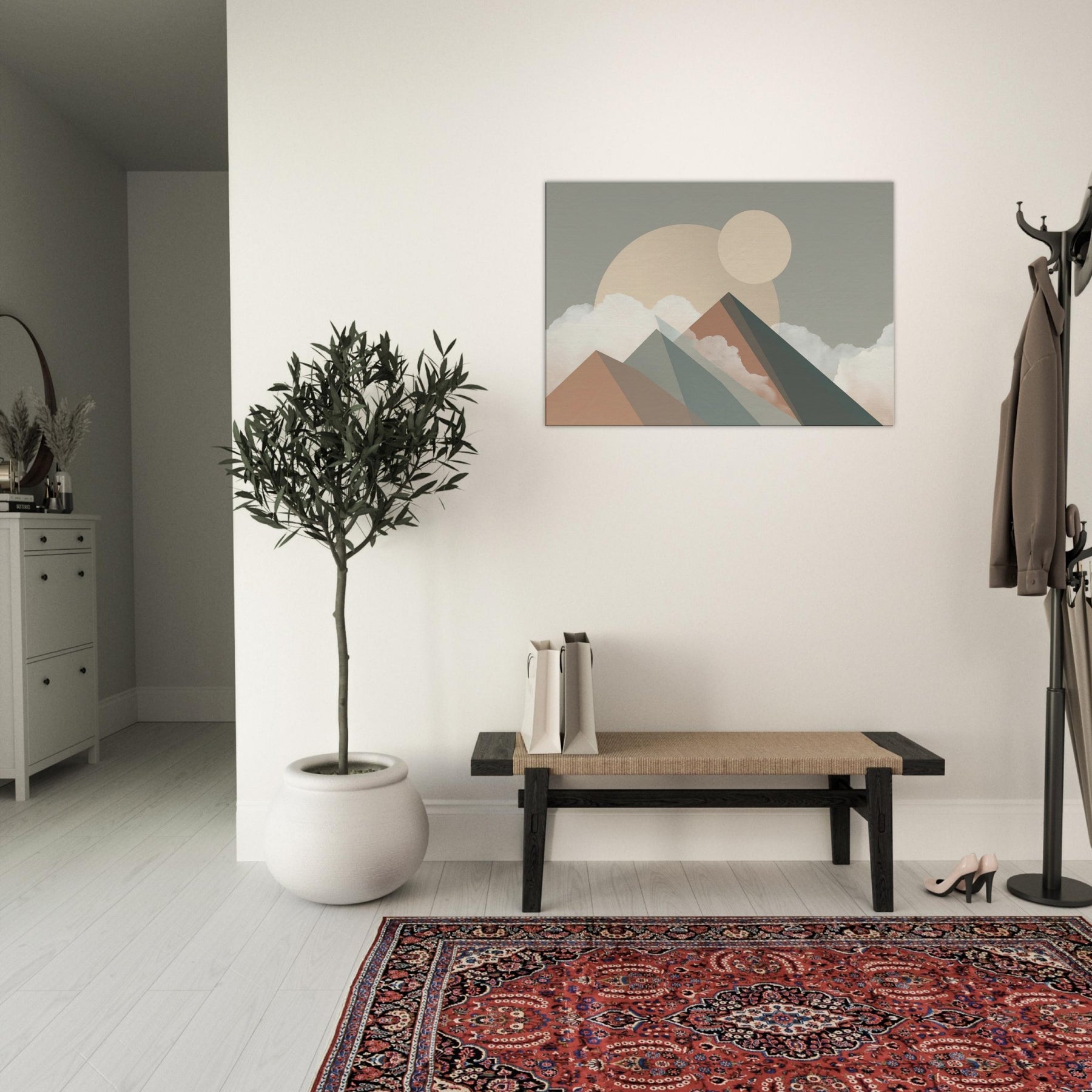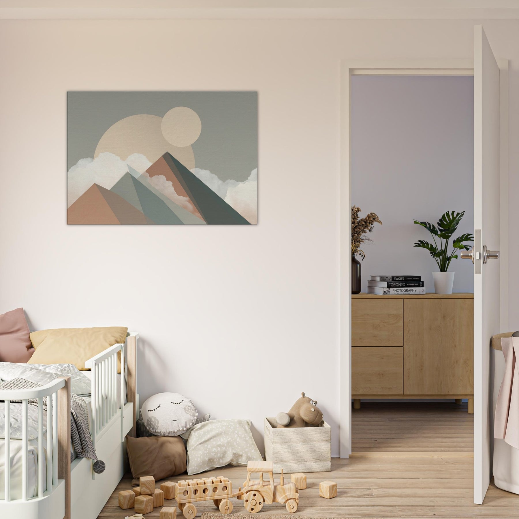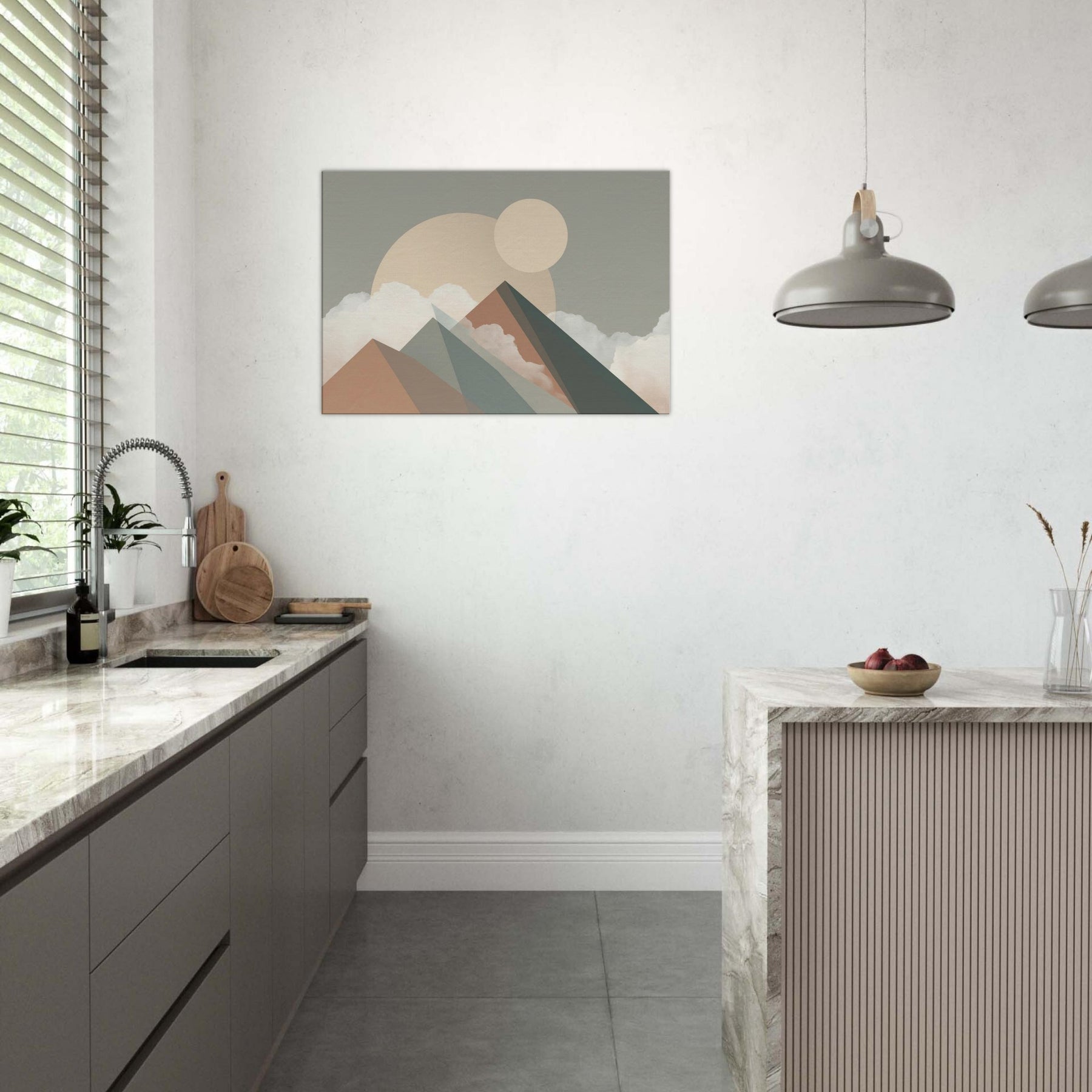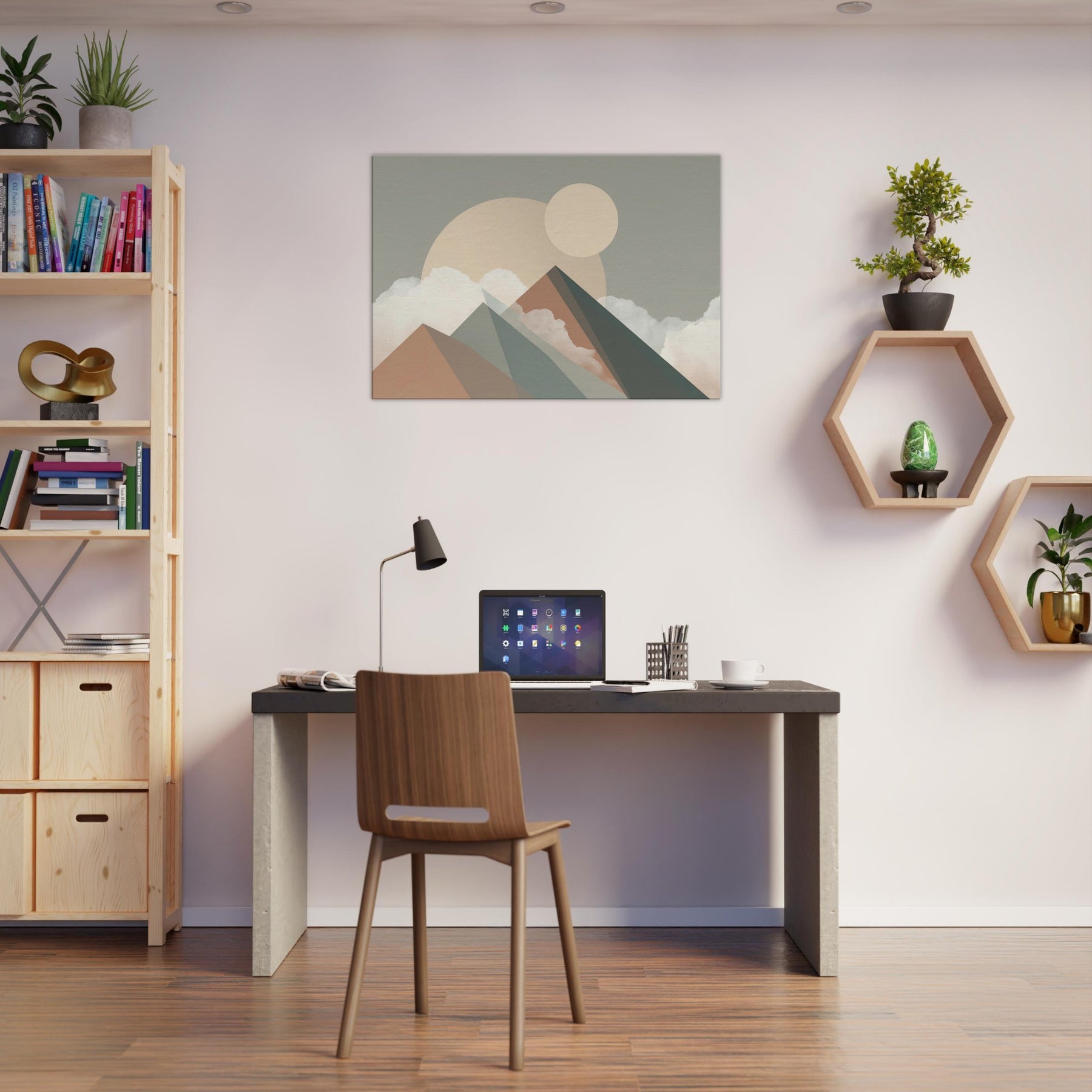 Moon over Mountains rises with quiet, celestial grace. This Moonlight Summit captures a serene, minimalist where soft geometric triangles meet a gentle horizon, while pale clouds drift by. The atmosphere feels almost mystical, inviting contemplation as light floods the room with calm and focus. Perfect for a living space or workspace, it pairs neatly with natural textures and warm neutrals, elevating mood and interrupting clutter. A subtle, refined statement that invites slower evenings and deeper breaths. The central subject is Moon over Mountains (Minimal).