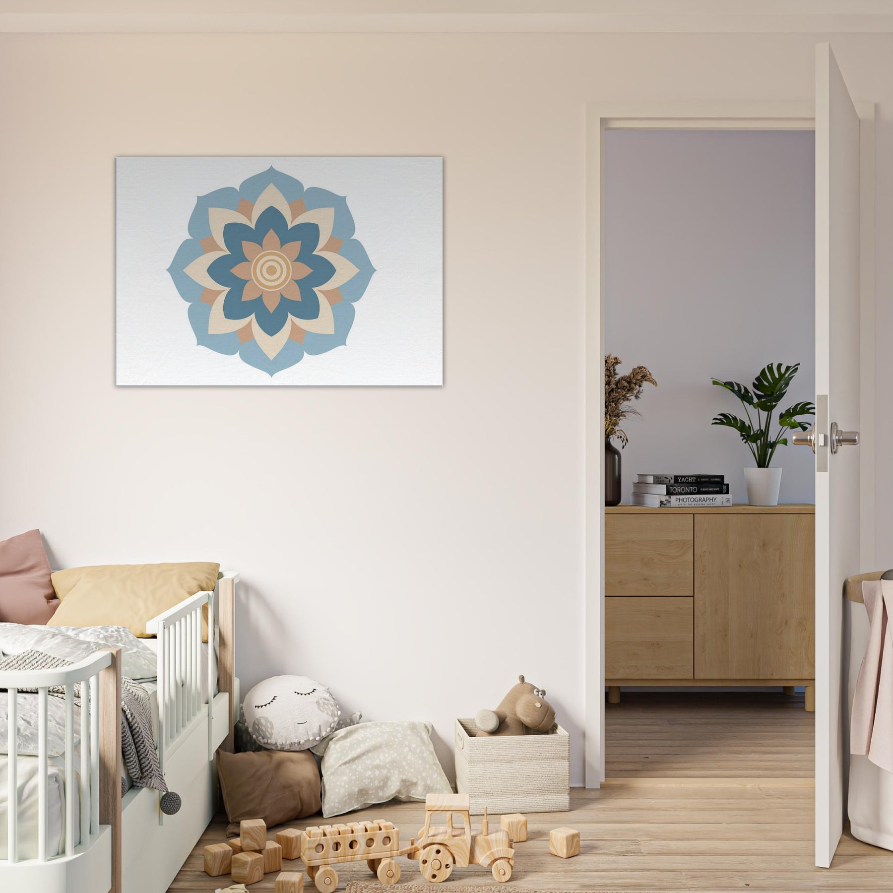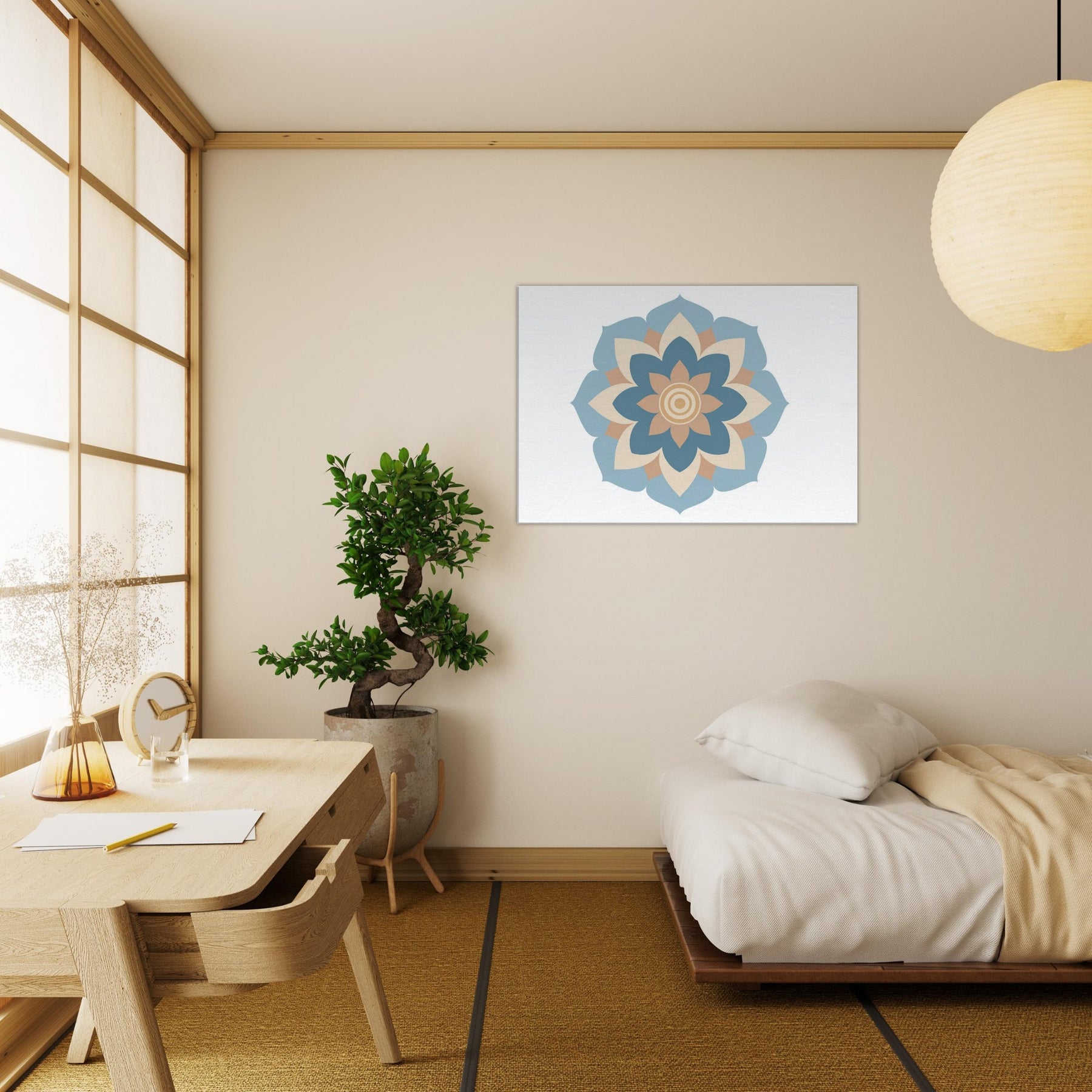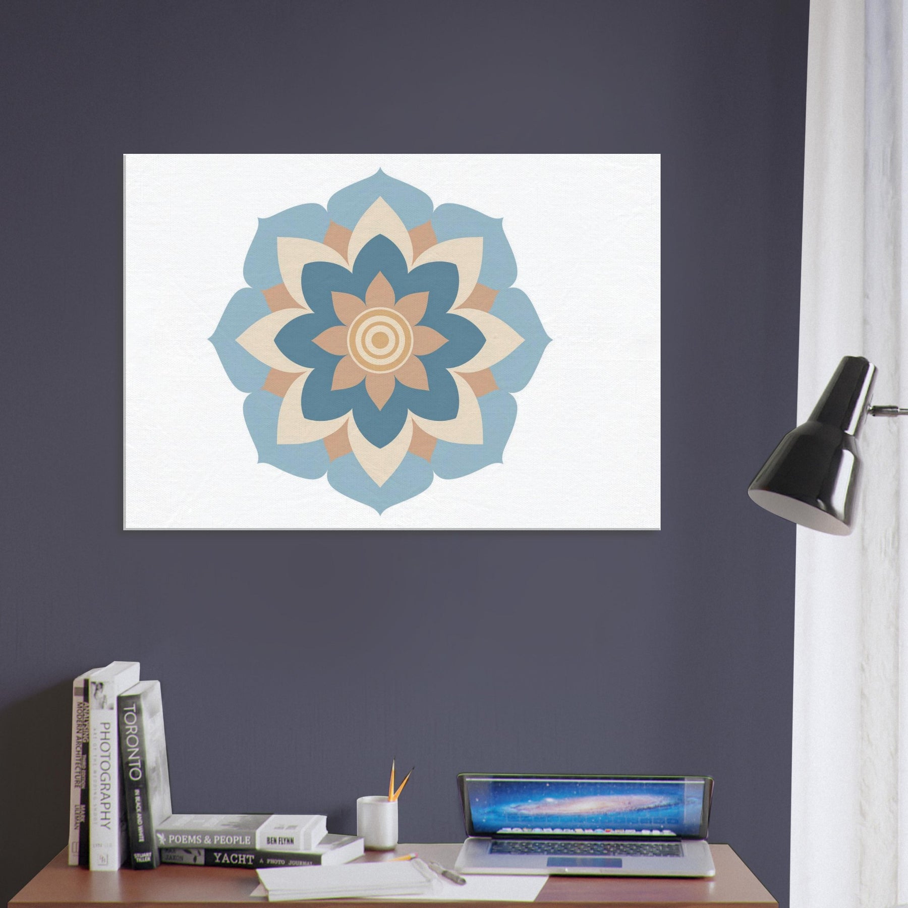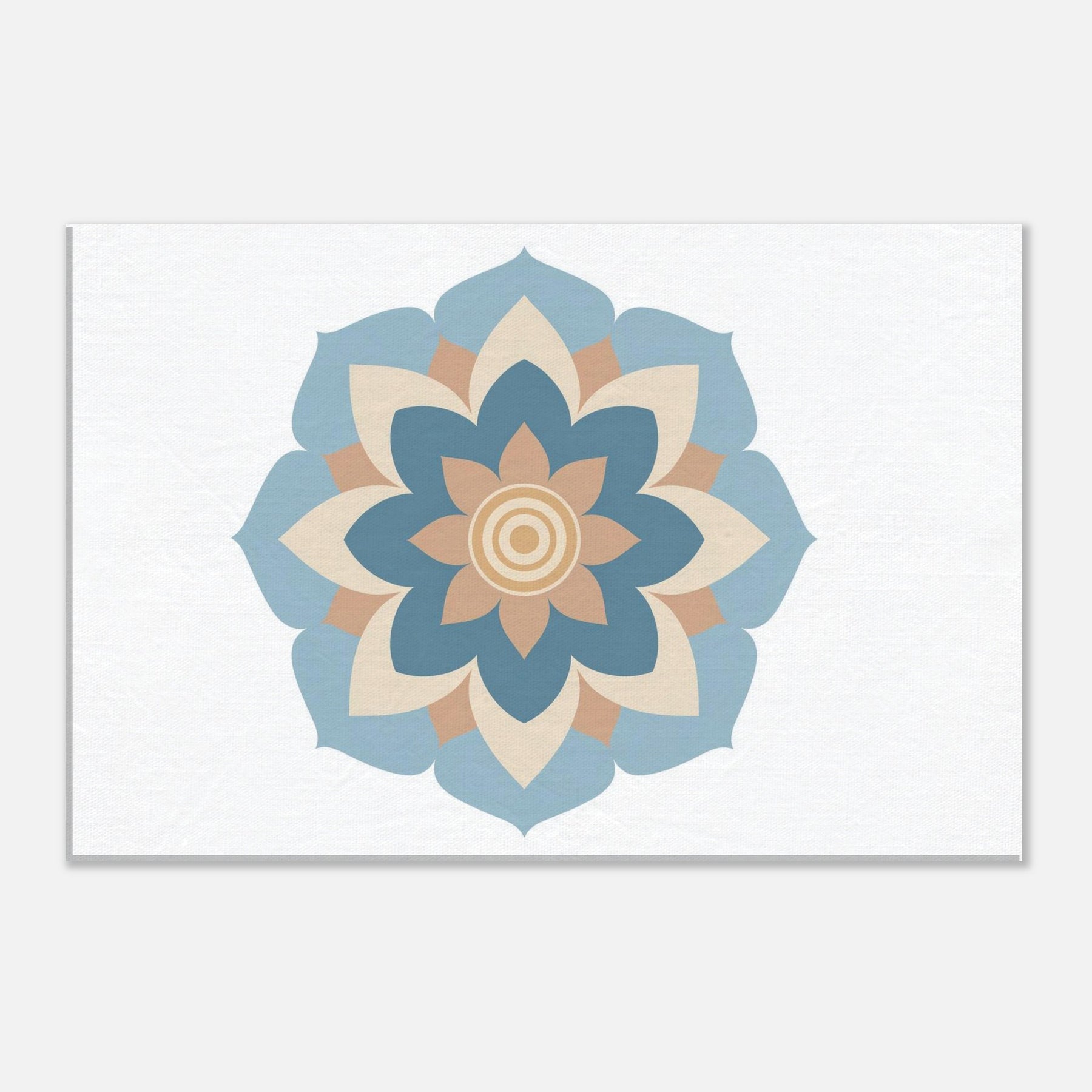 Immerse your space in the quiet pull of a Mandala rendered in minimalist calm. This sculpted circle of soft blues, warm creams, and sandy peaches exudes a yogic stillness that cools the room and centers the mind. The design unfolds like a gentle breath, inviting focus without shouting for attention. Perfect above a sofa, bed, or study, it softens edges, enhances light, and lends a mystical, contemplative atmosphere to daily life.