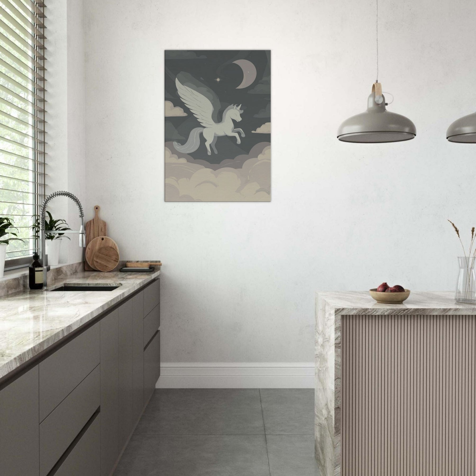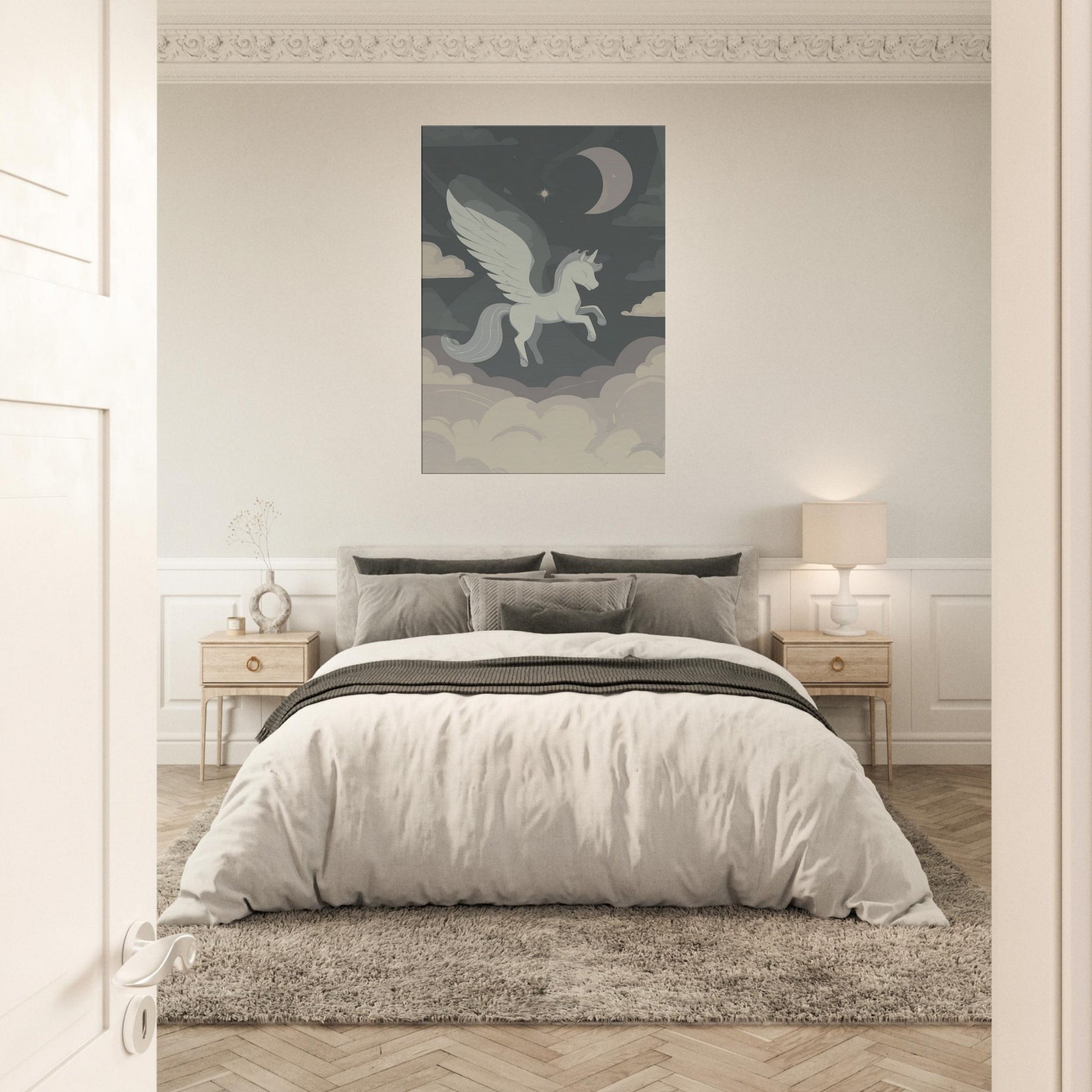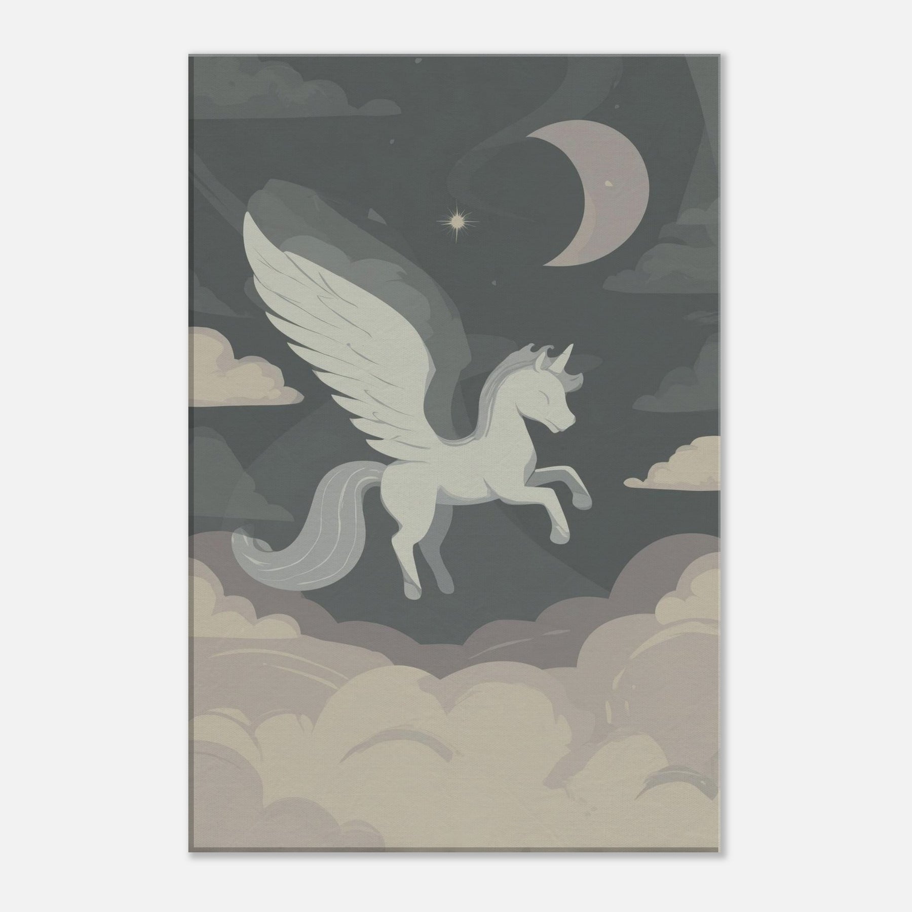 Pegasus floats above a quiet sea of clouds in a single, elegant line, inviting a moment of hush and wonder. The minimalist palette soft grays, ivory, and moonlit taupe drifts around the winged silhouette, turning any room into a sanctuary of air and possibility. This piece whispers of nocturnal skies and timeless journeys, offering a serene, contemplative glow that enhances living spaces without shouting. Hang it in a living room or bedroom to anchor a calm, creative mood a subtle muse for dreams and daily rituals.