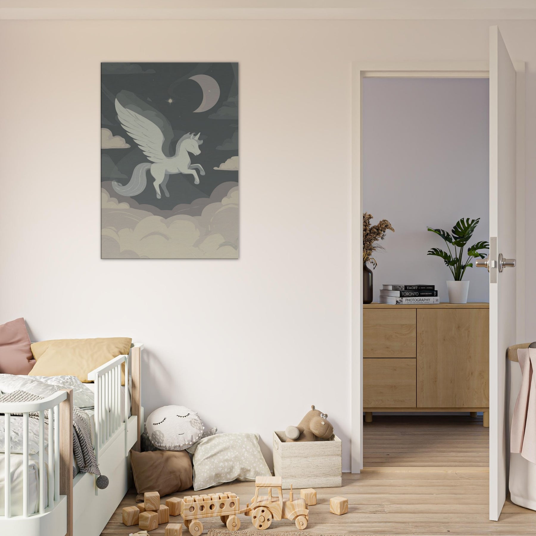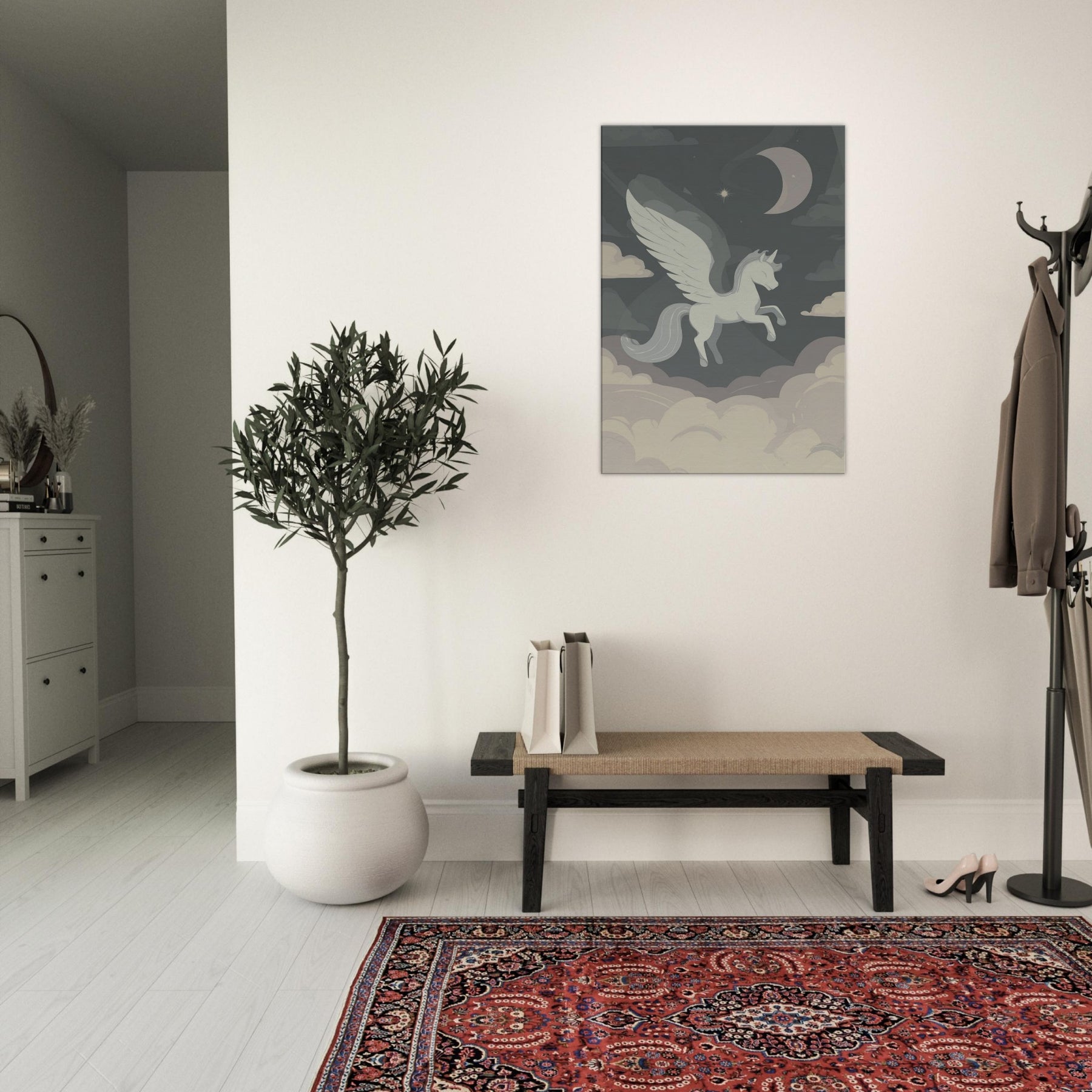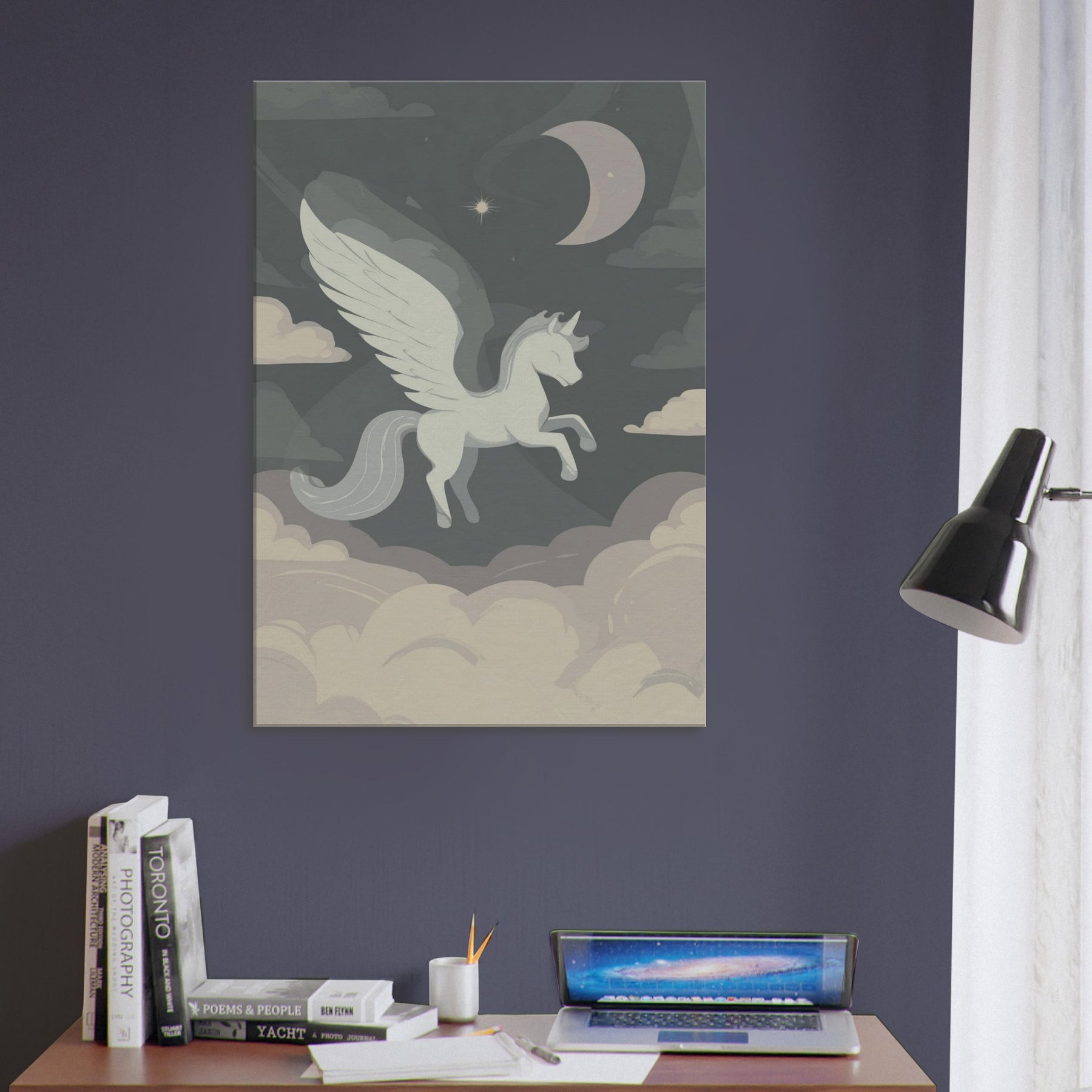Pegasus floats above a quiet sea of clouds in a single, elegant line, inviting a moment of hush and wonder. The minimalist palette soft grays, ivory, and moonlit taupe drifts around the winged silhouette, turning any room into a sanctuary of air and possibility. This piece whispers of nocturnal skies and timeless journeys, offering a serene, contemplative glow that enhances living spaces without shouting. Hang it in a living room or bedroom to anchor a calm, creative mood a subtle muse for dreams and daily rituals.