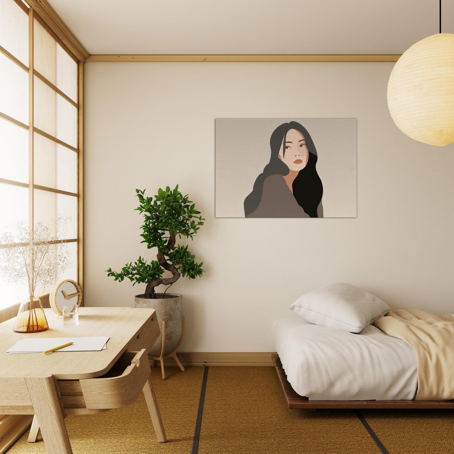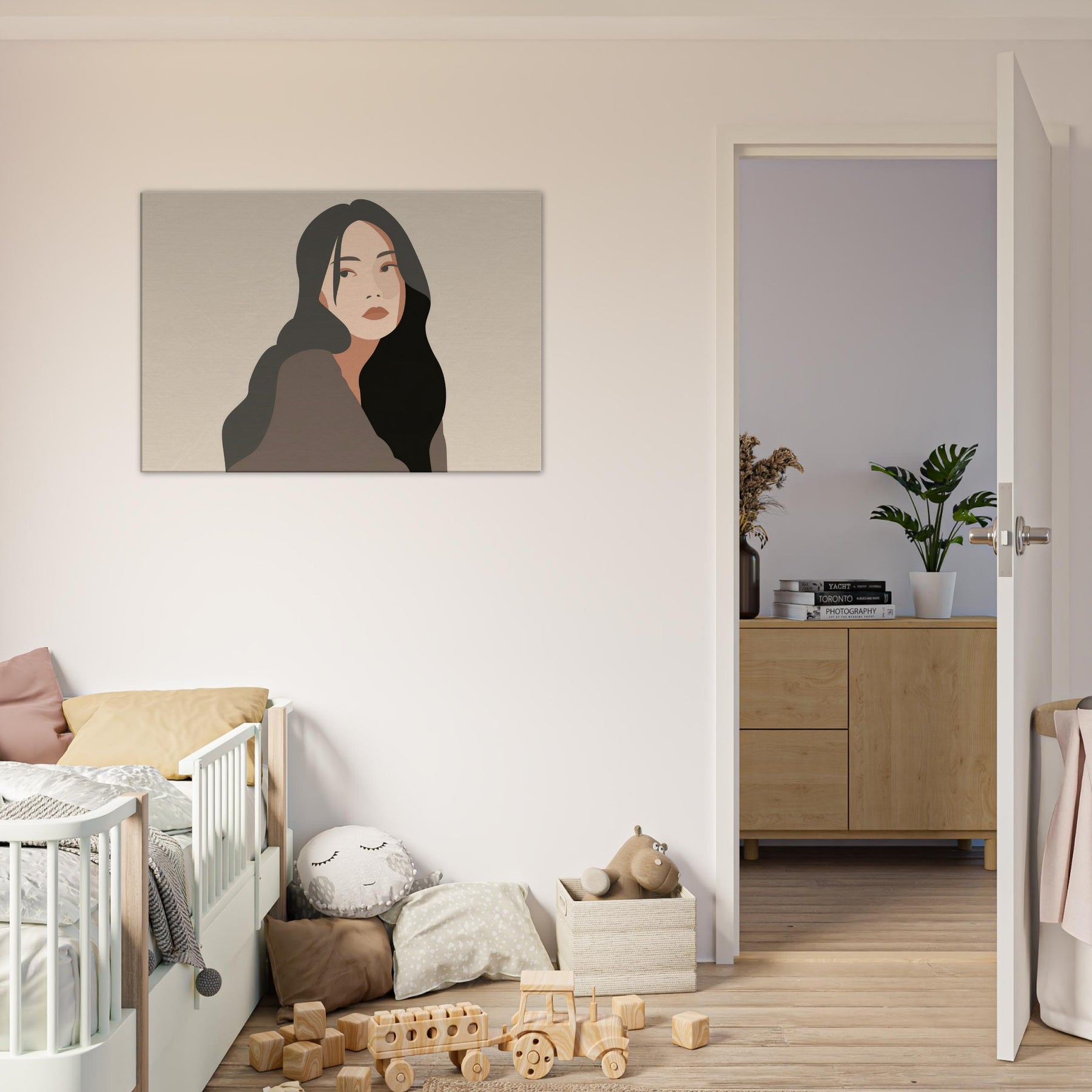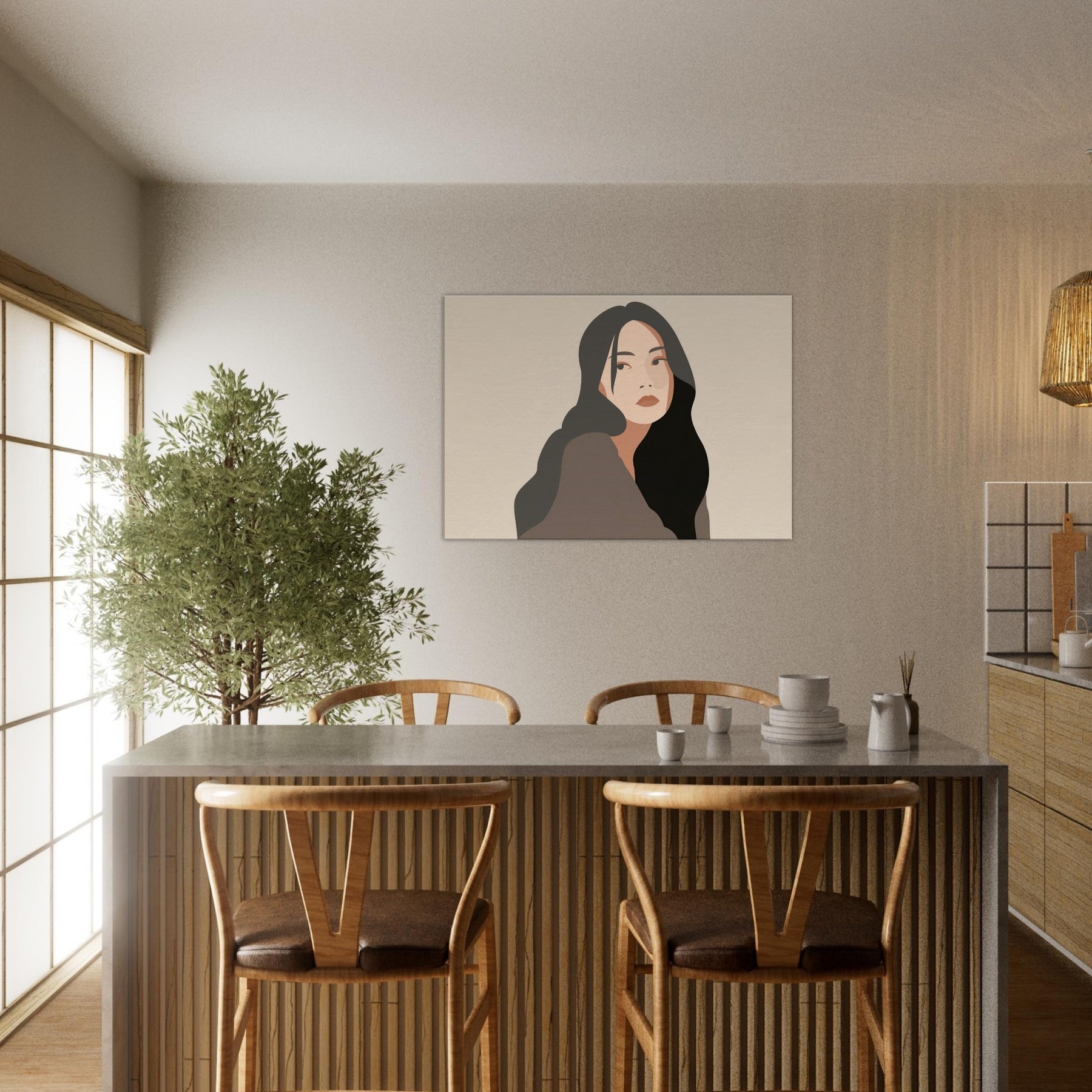 This minimalist study of an Asian Woman captures quiet presence and delicate nuance in a single, confident line. The soft, warm palette and pared down shapes invite calm reflection, turning any living space into a sanctuary. The sitter's shadowed hair frames a thoughtful gaze, suggesting memory and inner strength. Hang it beside a sofa or in a bedroom to soften edges with human presence, creating a serene, modern atmosphere that feels timeless yet fresh.