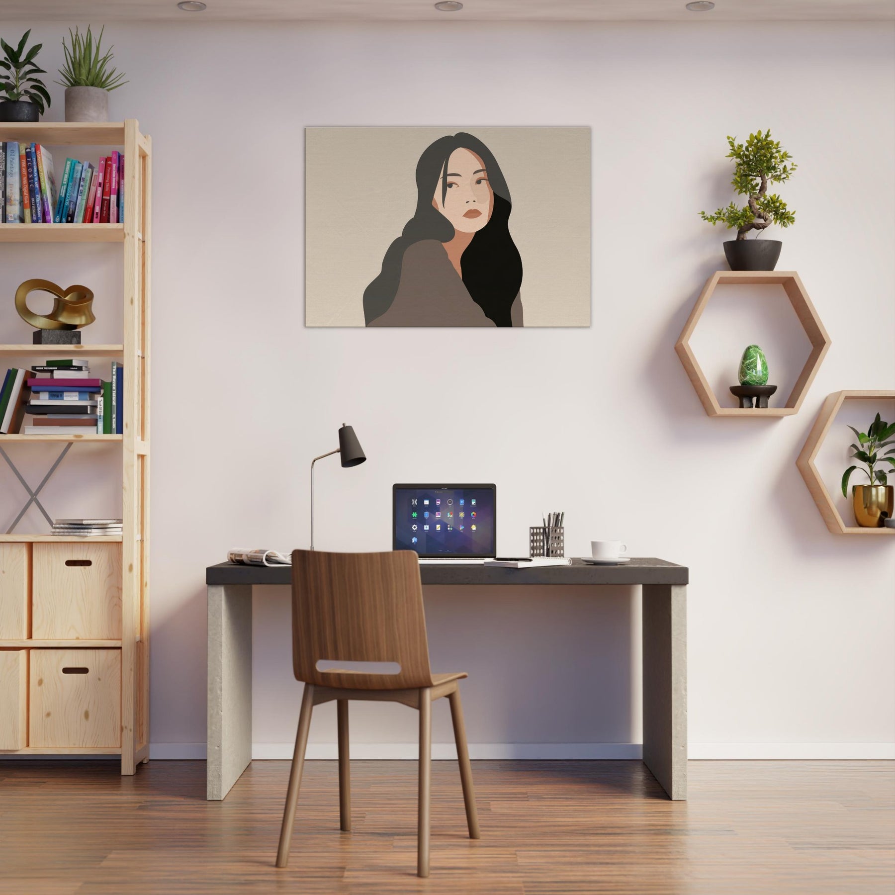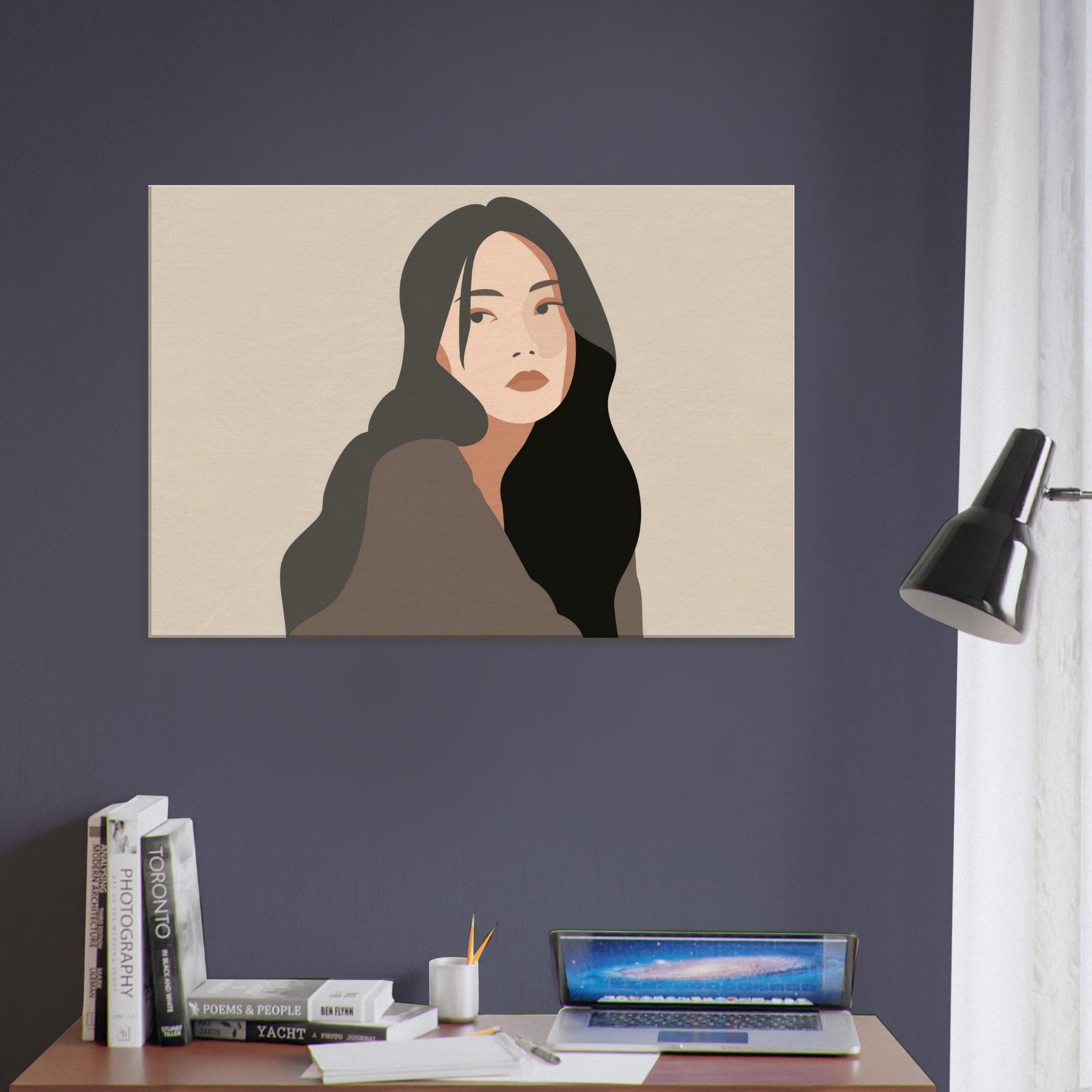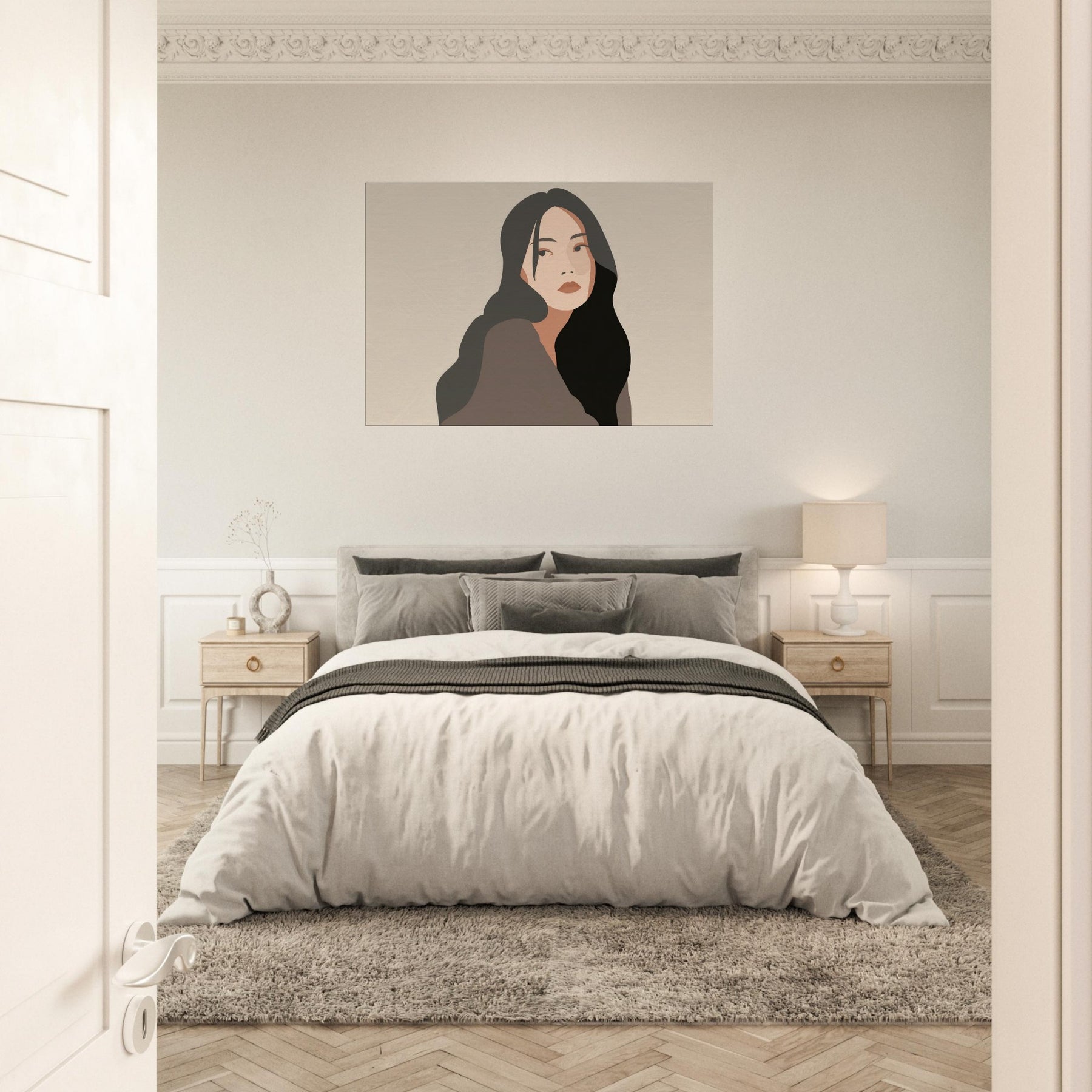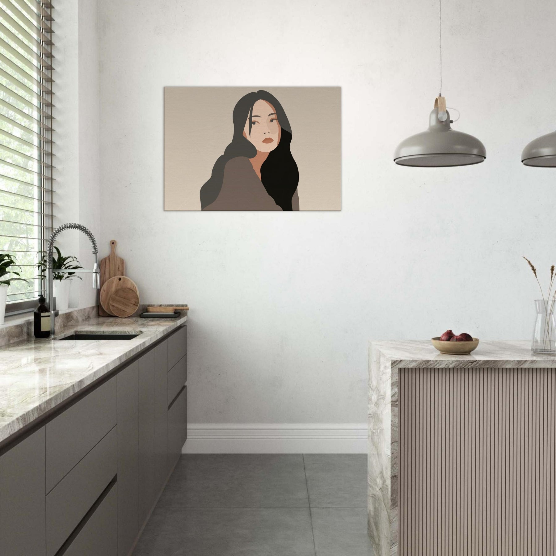 This minimalist study of an Asian Woman captures quiet presence and delicate nuance in a single, confident line. The soft, warm palette and pared down shapes invite calm reflection, turning any living space into a sanctuary. The sitter's shadowed hair frames a thoughtful gaze, suggesting memory and inner strength. Hang it beside a sofa or in a bedroom to soften edges with human presence, creating a serene, modern atmosphere that feels timeless yet fresh.