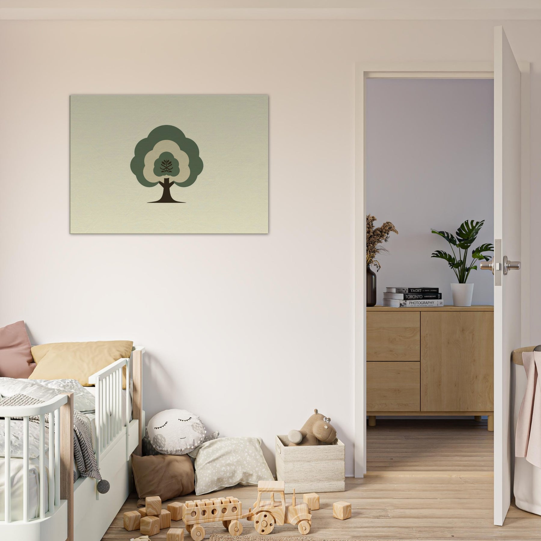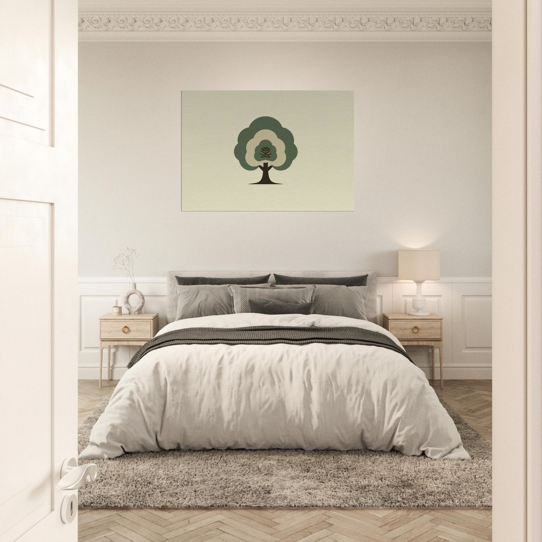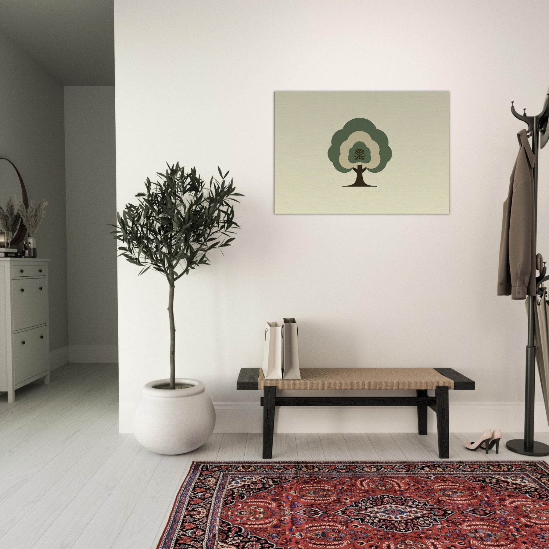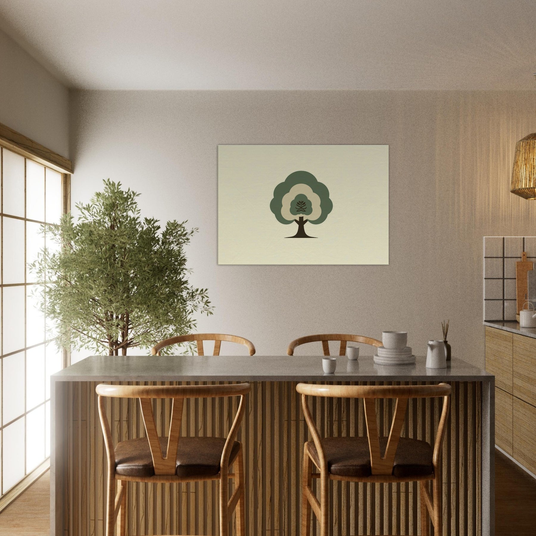 Delicate yet deeply resonant, this minimalist Tree of Life invites quiet reflection. The design traces growth through gentle, concentric forms and earthy greens that echo forest light, while a warm brown trunk anchors the scene. It evokes mystery and wonder, transforming a living room into a sanctuary where every glance feels a breath slower and more sure. Perfect for walls that crave balance, it pairs with natural textures to cultivate a serene, contemplative ambiance.