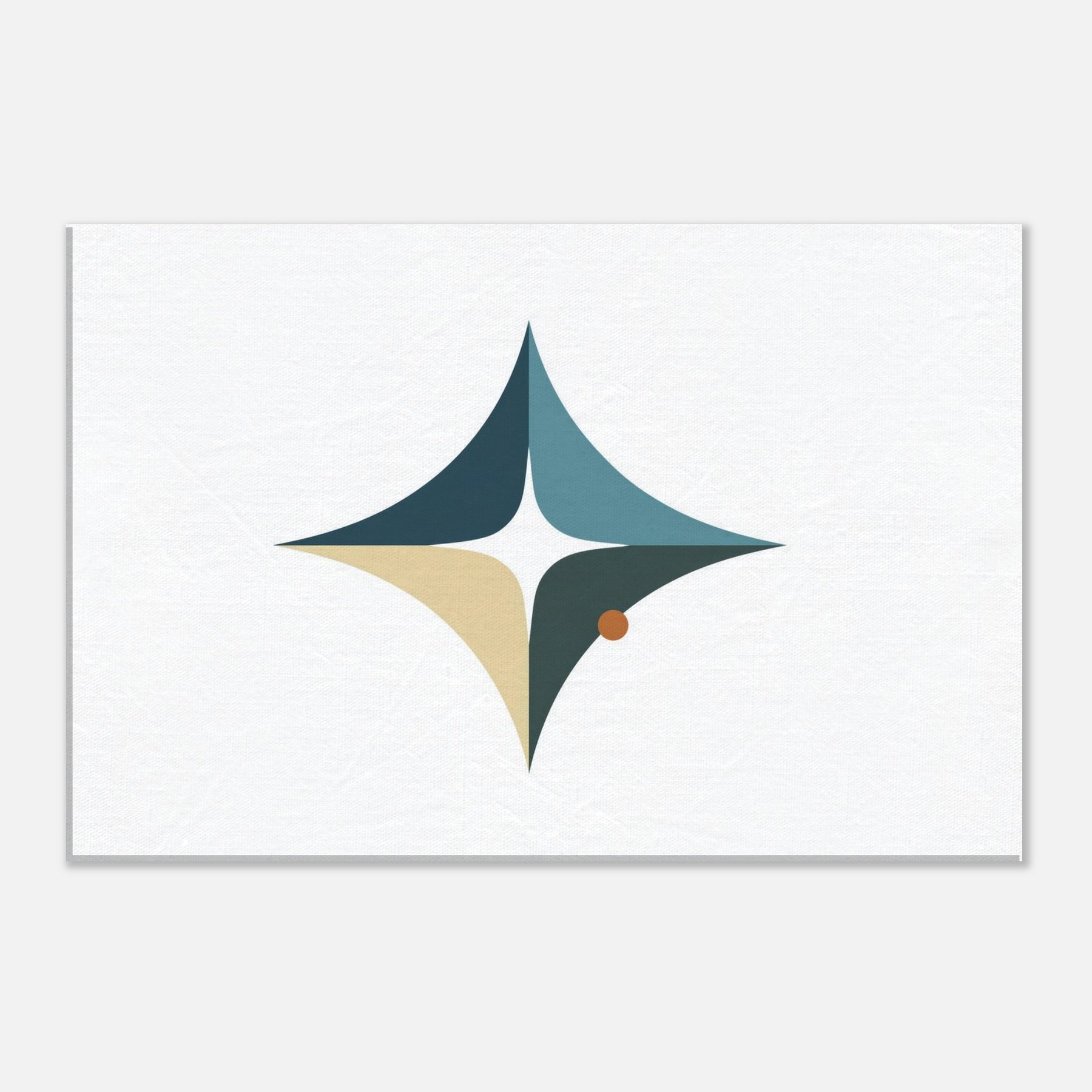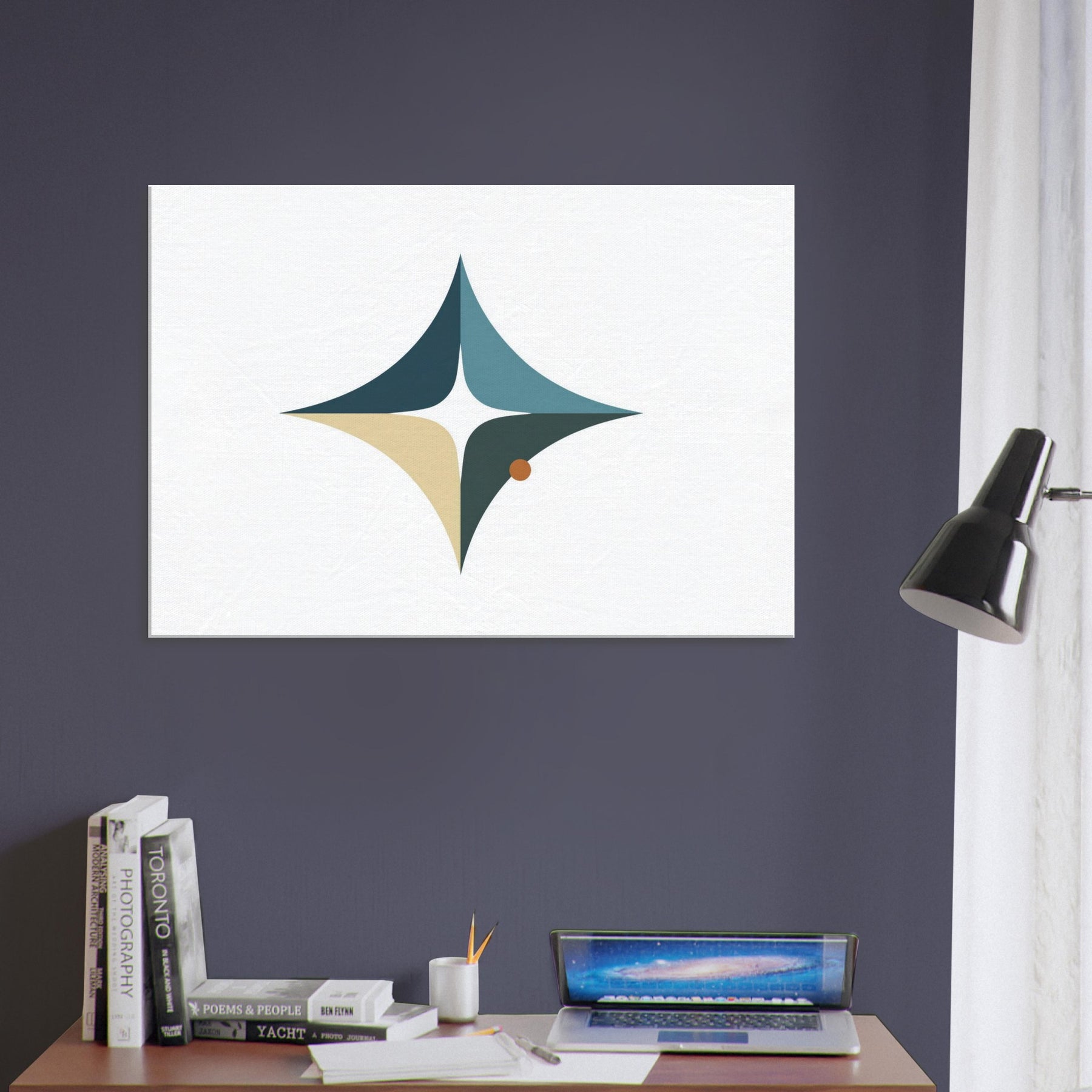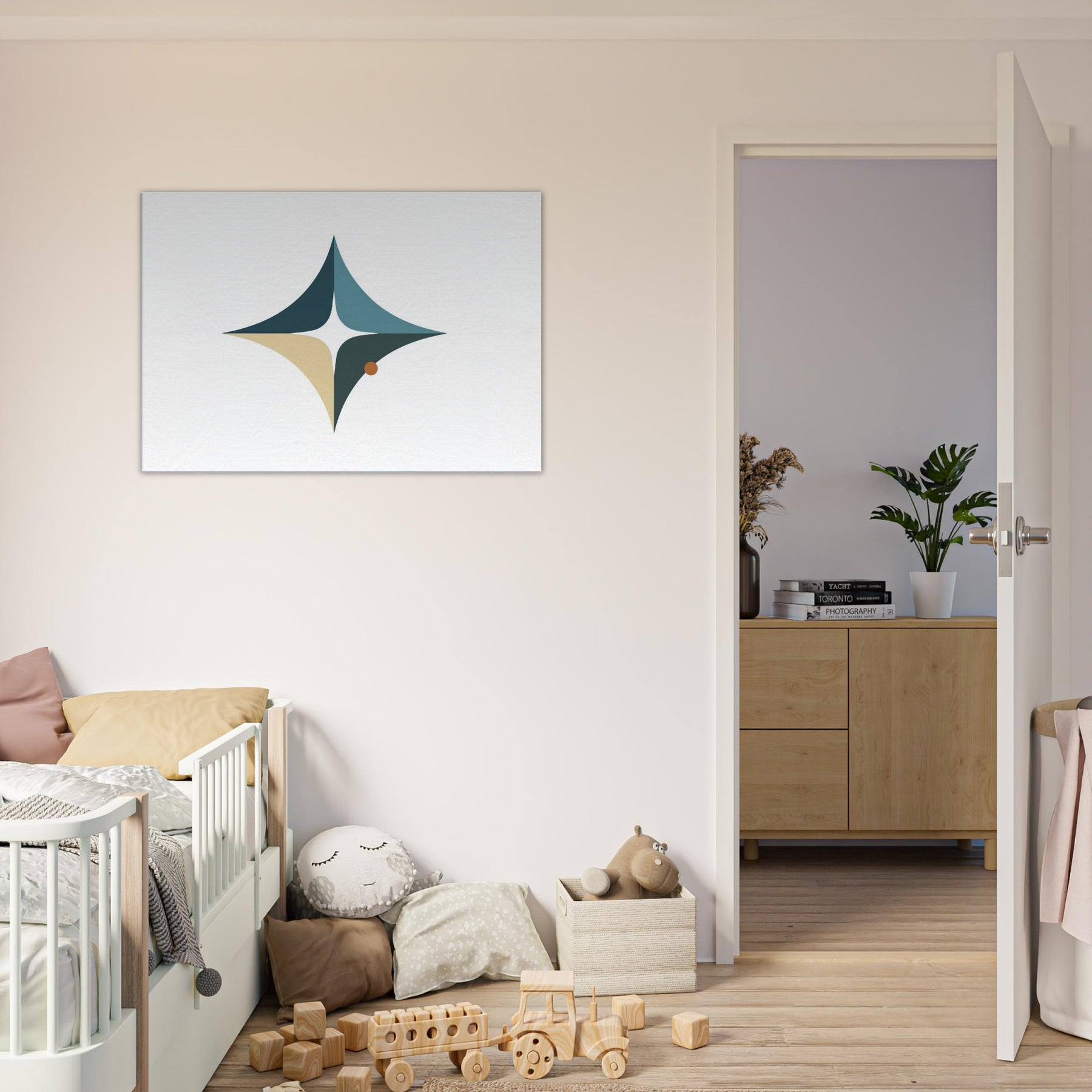 Nebula unfolds as the Primary Subject, a quiet starburst, a minimalist canvas distilling night sky into four sweeping planes. The blend of deep indigo, sea teal, pale sand, and a single warm dot conjures twilight’s hush and inner space. This piece invites a calm, luminous presence into any room, turning walls into a quiet constellation. Perfect for living rooms or studies, it elevates mood with subtle depth and mystical suggestion.