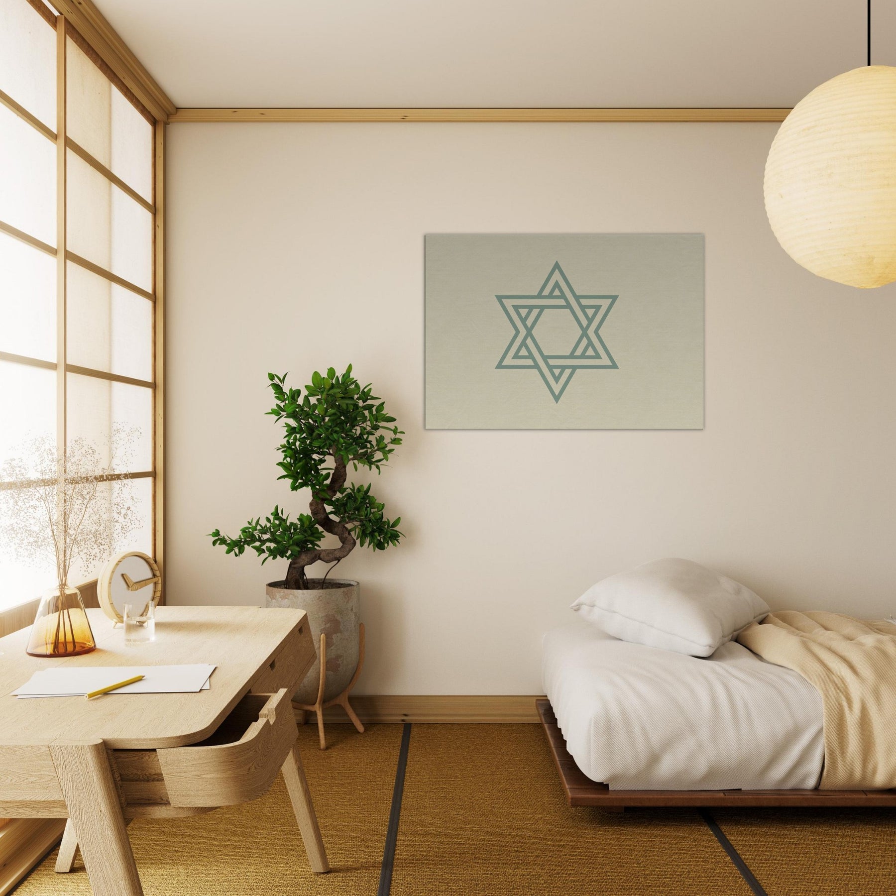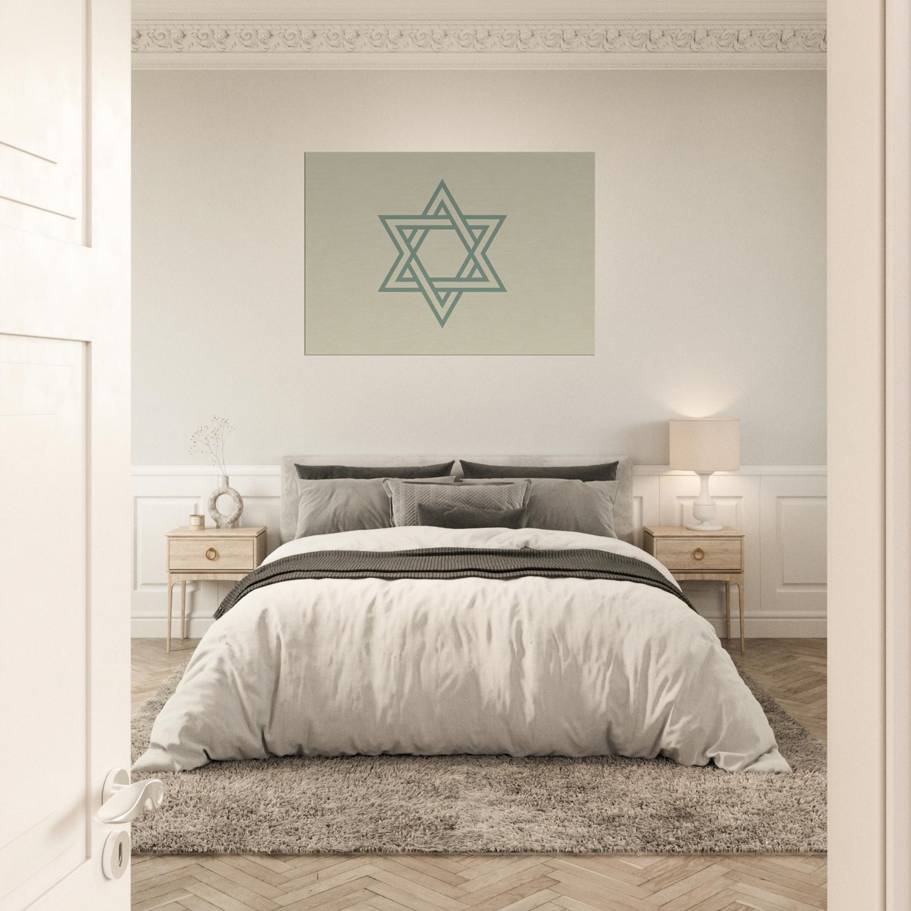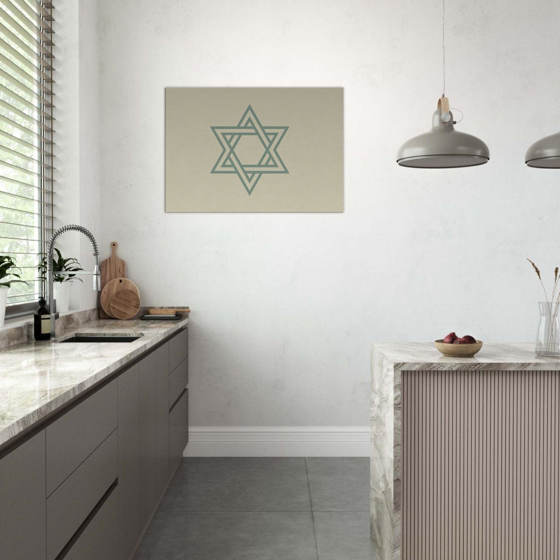 Shaped in a single, continuous line, the Star of David unfolds with quiet precision, each angle breathing in rhythm with the next. This minimalist study of sacred geometry invites calm into any space, its cool teal stroke resting against a warm beige field. It feels like a whispered mantra, guiding focus in a living room, study, or hallway. The piece balances clarity and mystery, turning walls into a contemplative sanctuary without shouting for attention. The central subject is Star of David (Minimal Line).