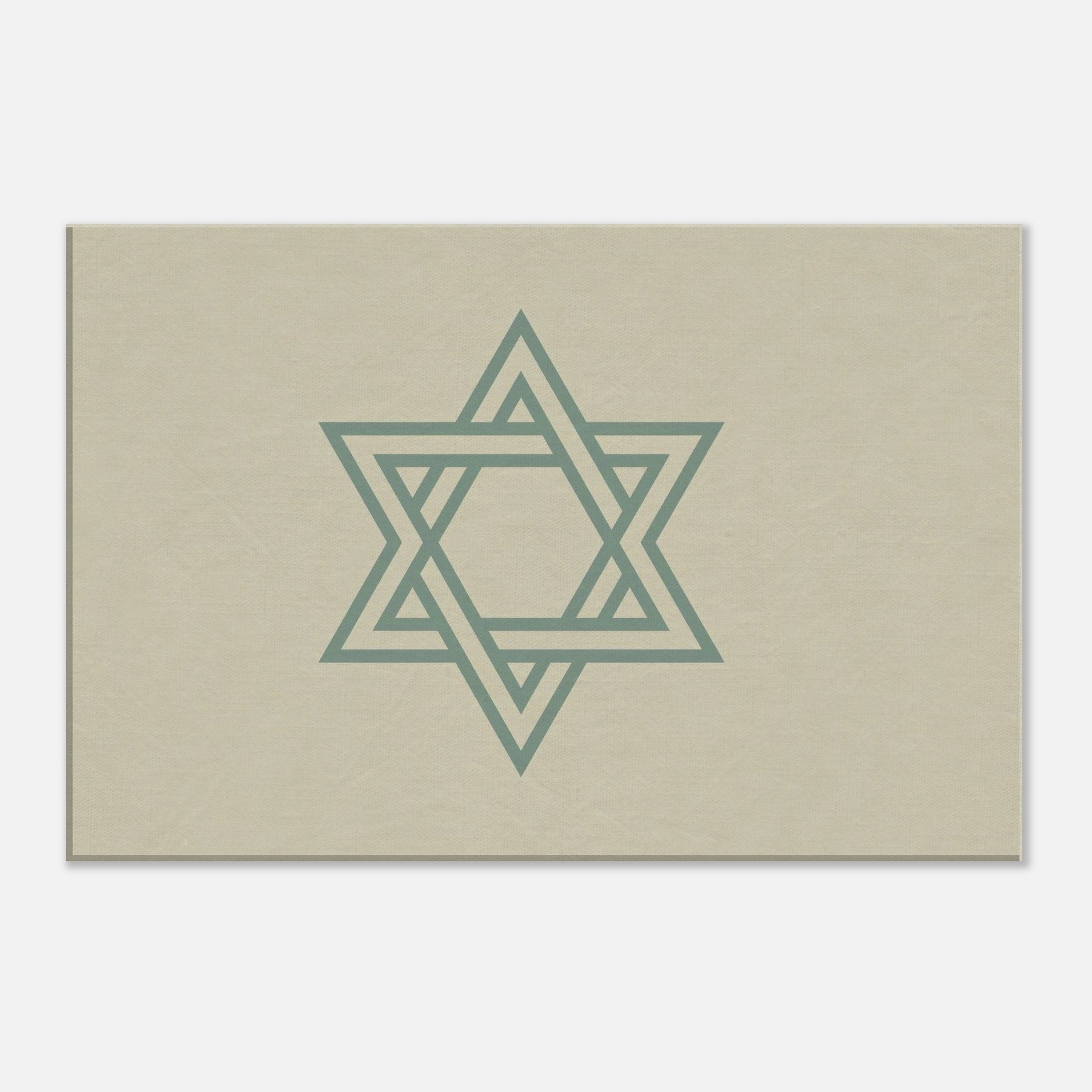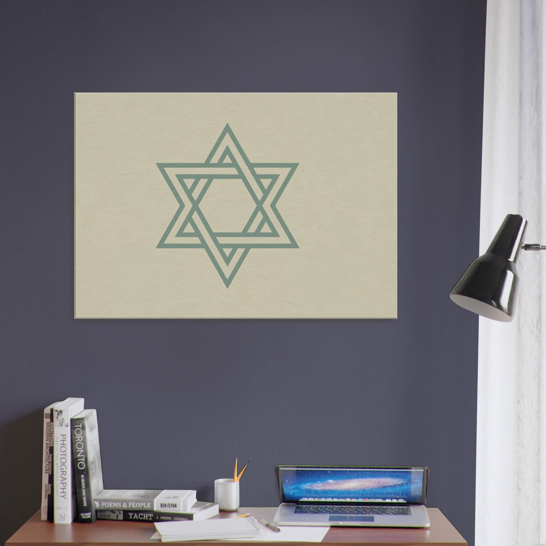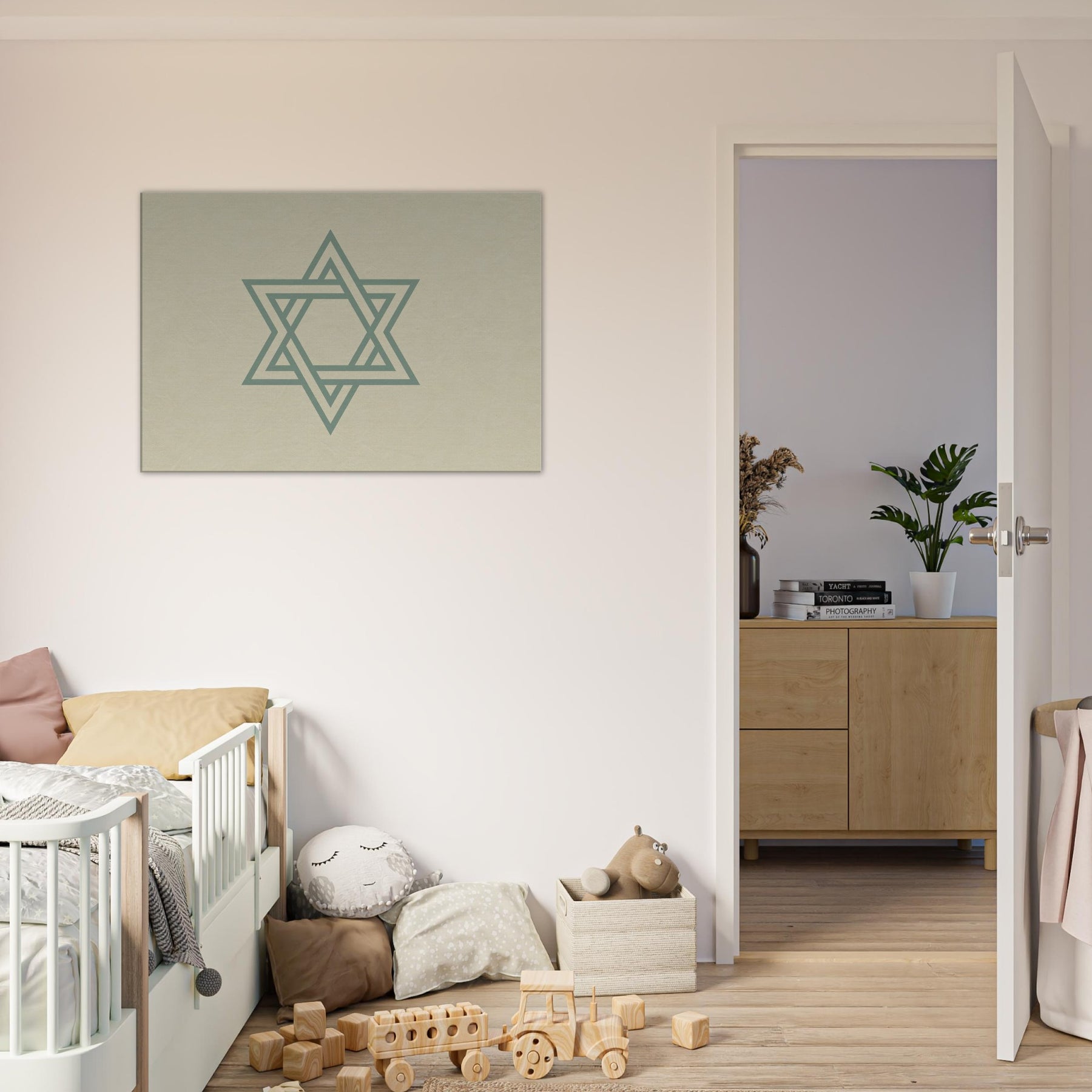 Shaped in a single, continuous line, the Star of David unfolds with quiet precision, each angle breathing in rhythm with the next. This minimalist study of sacred geometry invites calm into any space, its cool teal stroke resting against a warm beige field. It feels like a whispered mantra, guiding focus in a living room, study, or hallway. The piece balances clarity and mystery, turning walls into a contemplative sanctuary without shouting for attention. The central subject is Star of David (Minimal Line).