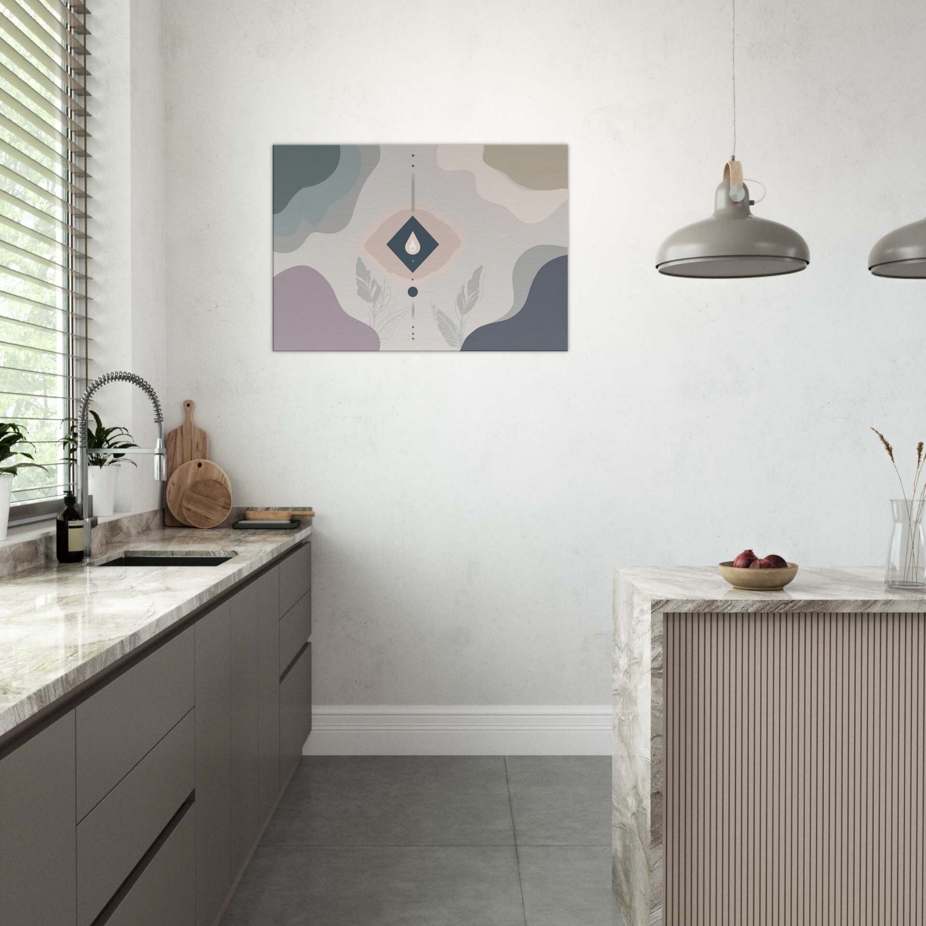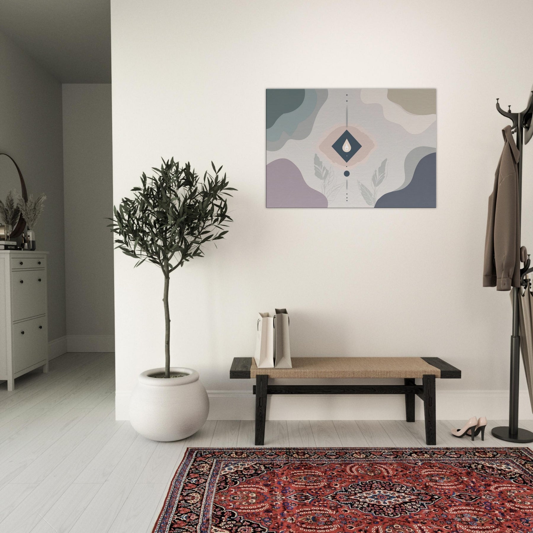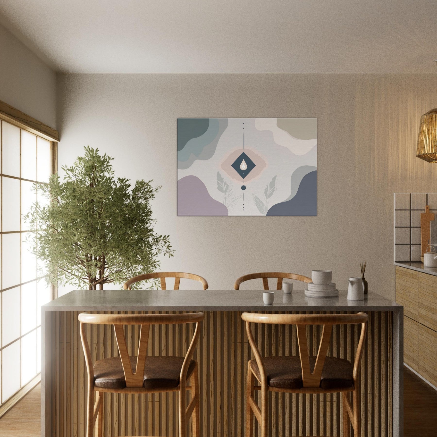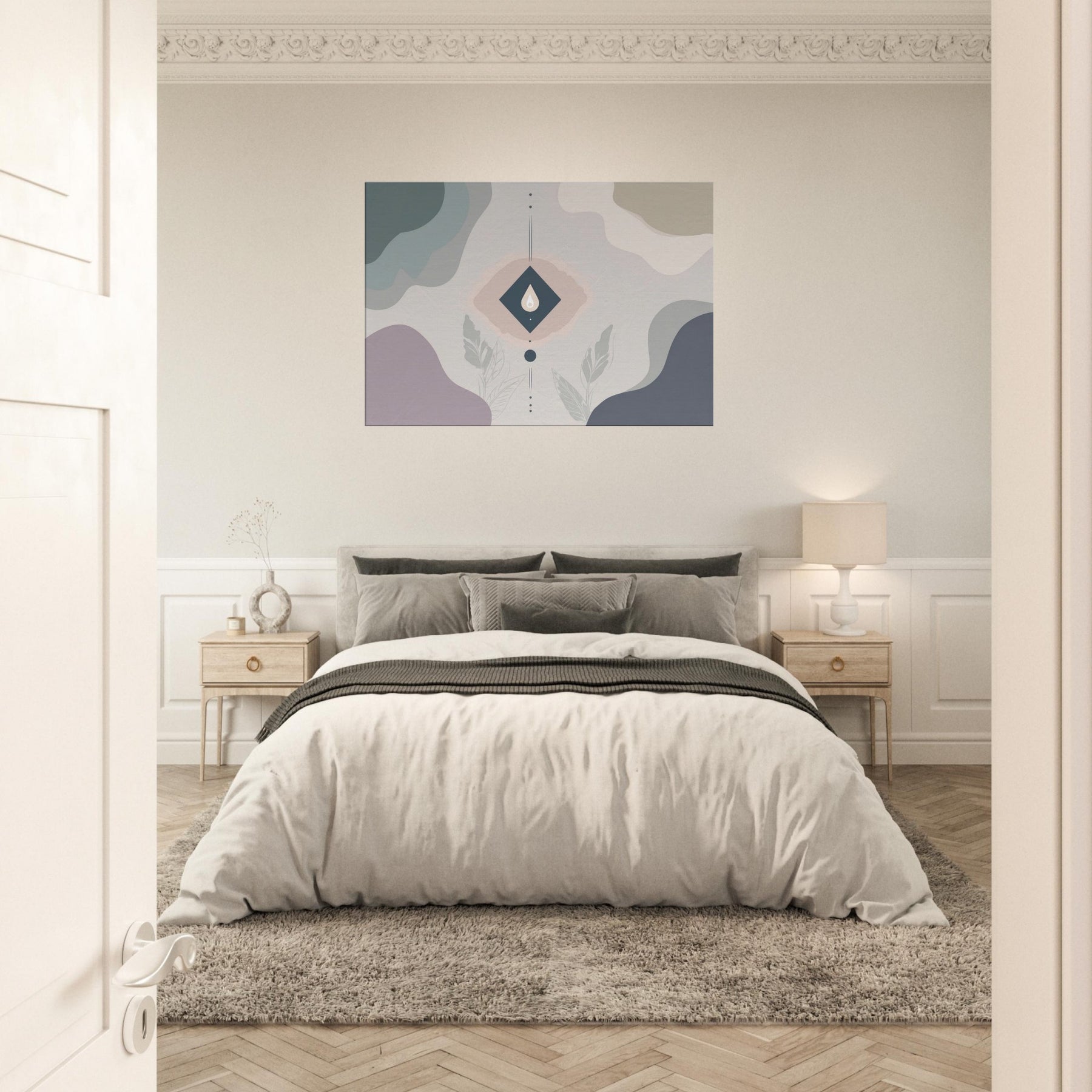 Let the Pendulum (Divination) swing into your room and slow the day. In hushed tones of pastel hues, the diamond centered motif centers the eye like a tiny altar. A teardrop core cradled by a navy diamond suggests a moment of choice, a breath before meaning unfolds. Soft shadows, airy leaves, and delicate lines create a contemplative mood that invites quiet reflection perfect above a sofa or desk. The minimalist palette enhances light, while the subtle rhythm of its shapes lends a meditative calm to living spaces.