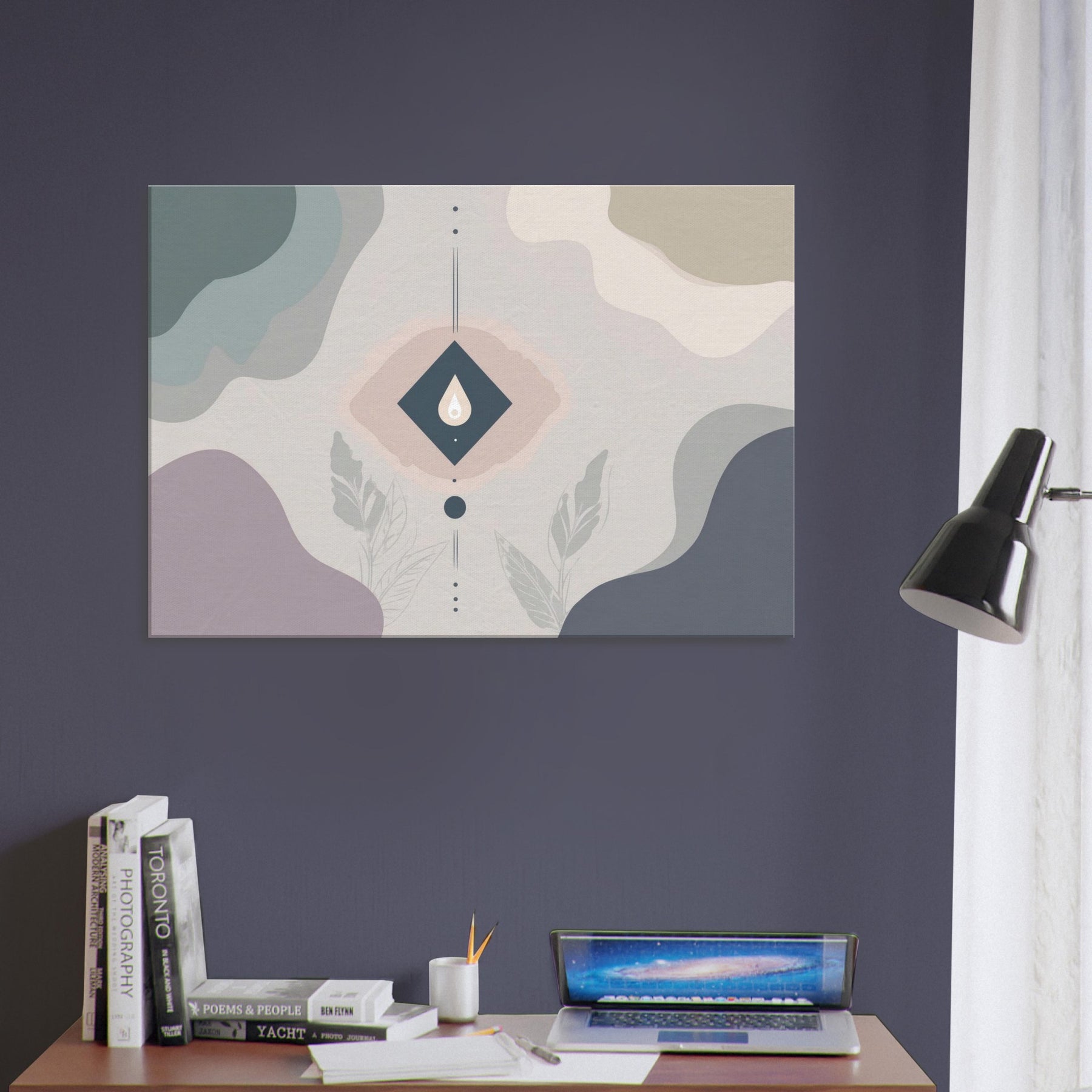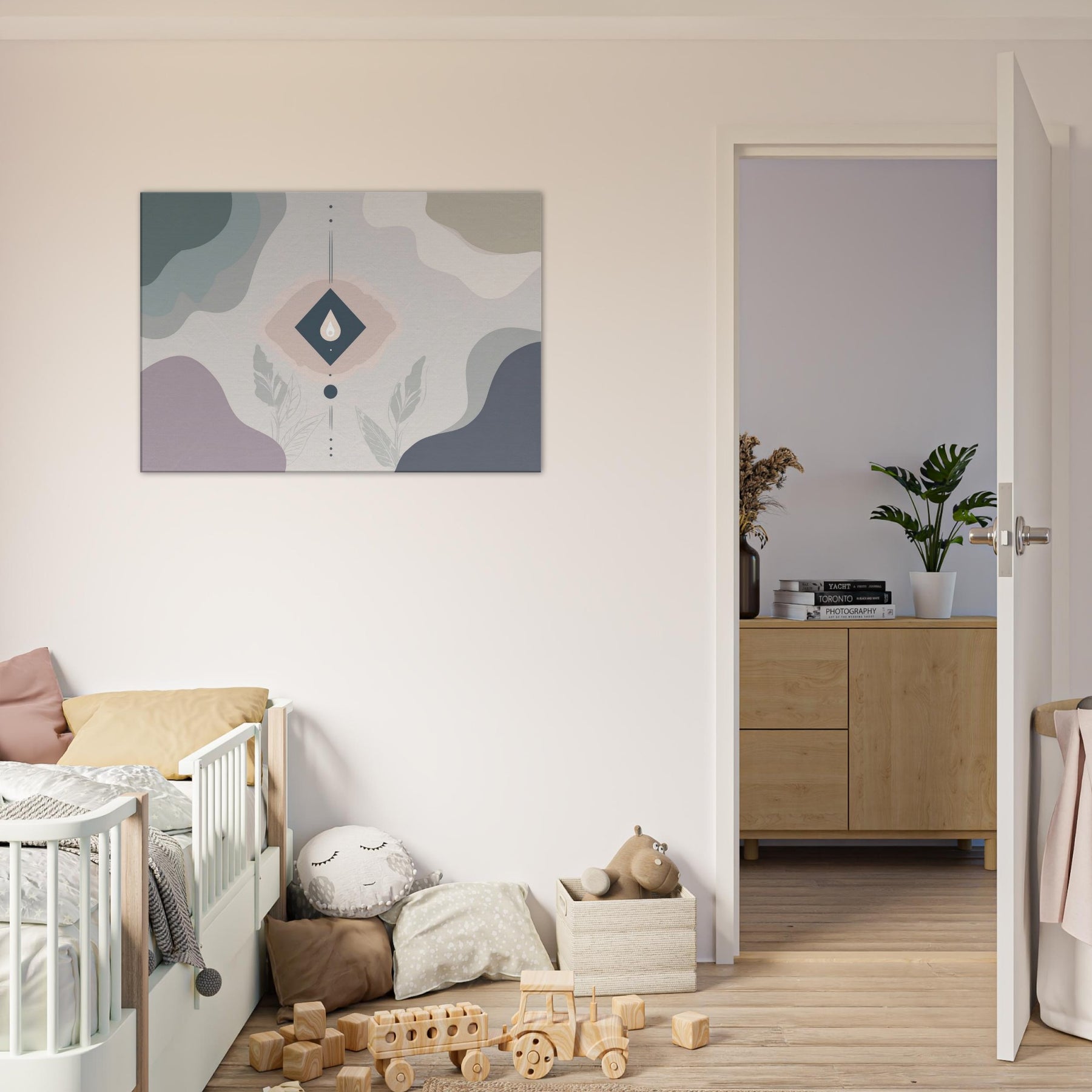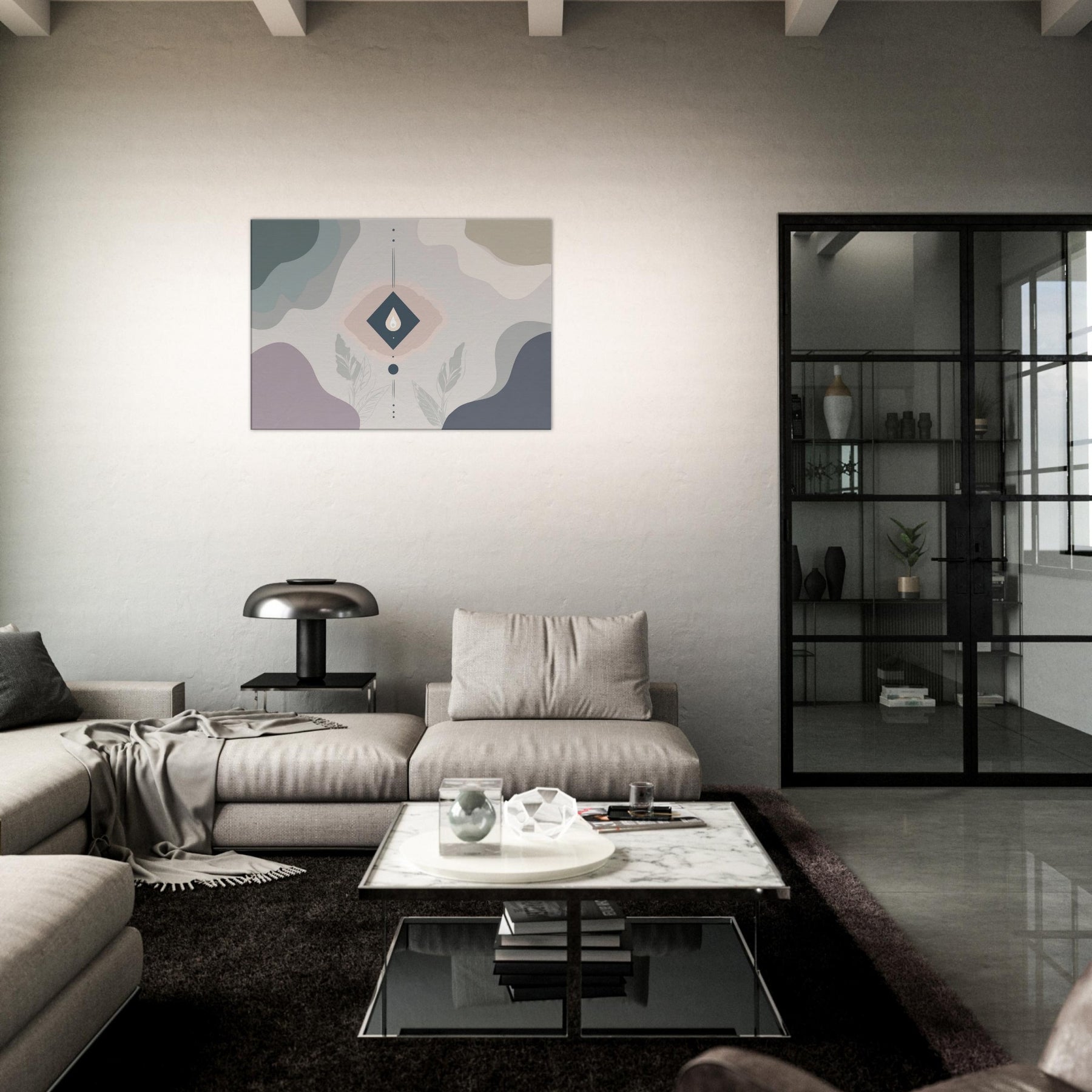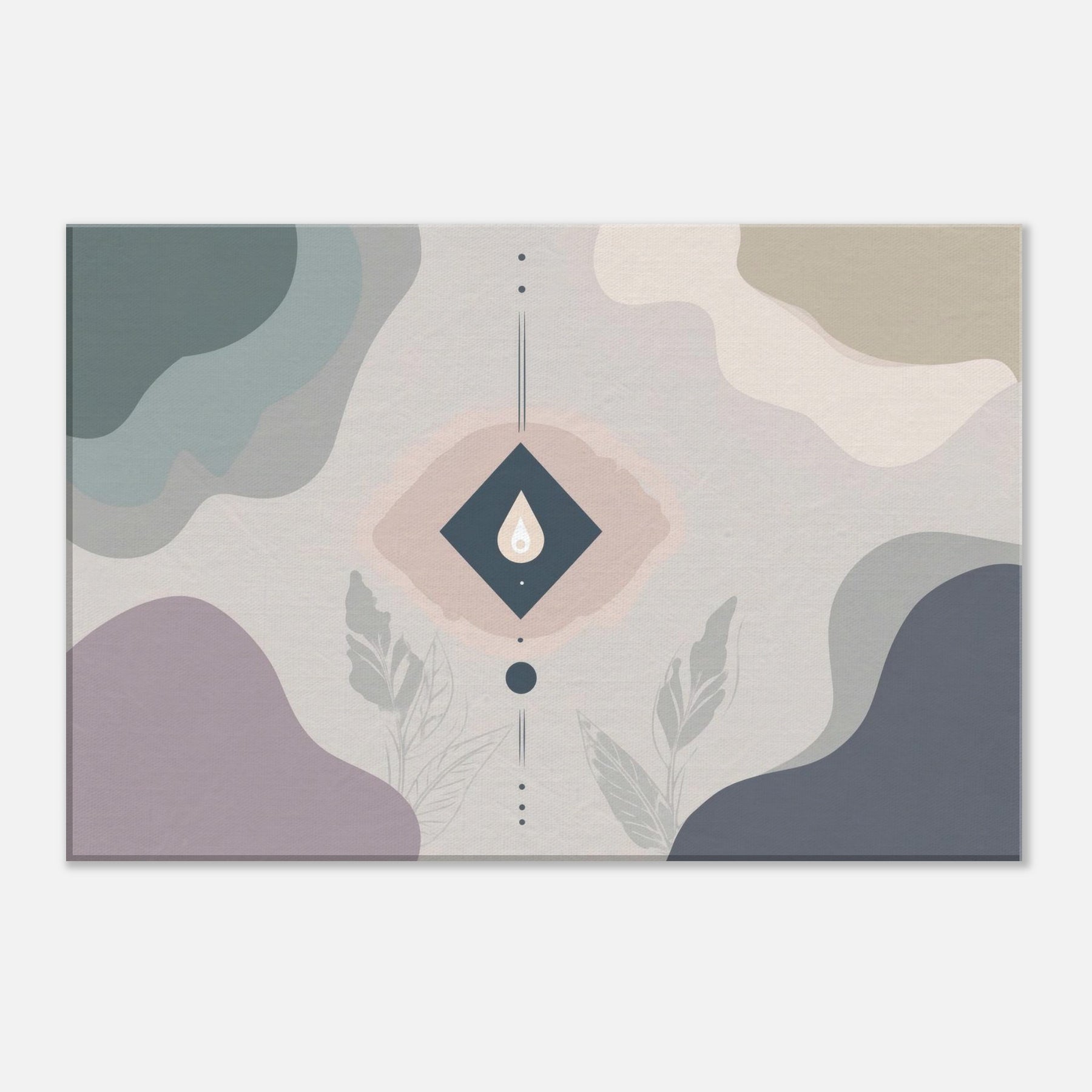 Let the Pendulum (Divination) swing into your room and slow the day. In hushed tones of pastel hues, the diamond centered motif centers the eye like a tiny altar. A teardrop core cradled by a navy diamond suggests a moment of choice, a breath before meaning unfolds. Soft shadows, airy leaves, and delicate lines create a contemplative mood that invites quiet reflection perfect above a sofa or desk. The minimalist palette enhances light, while the subtle rhythm of its shapes lends a meditative calm to living spaces.