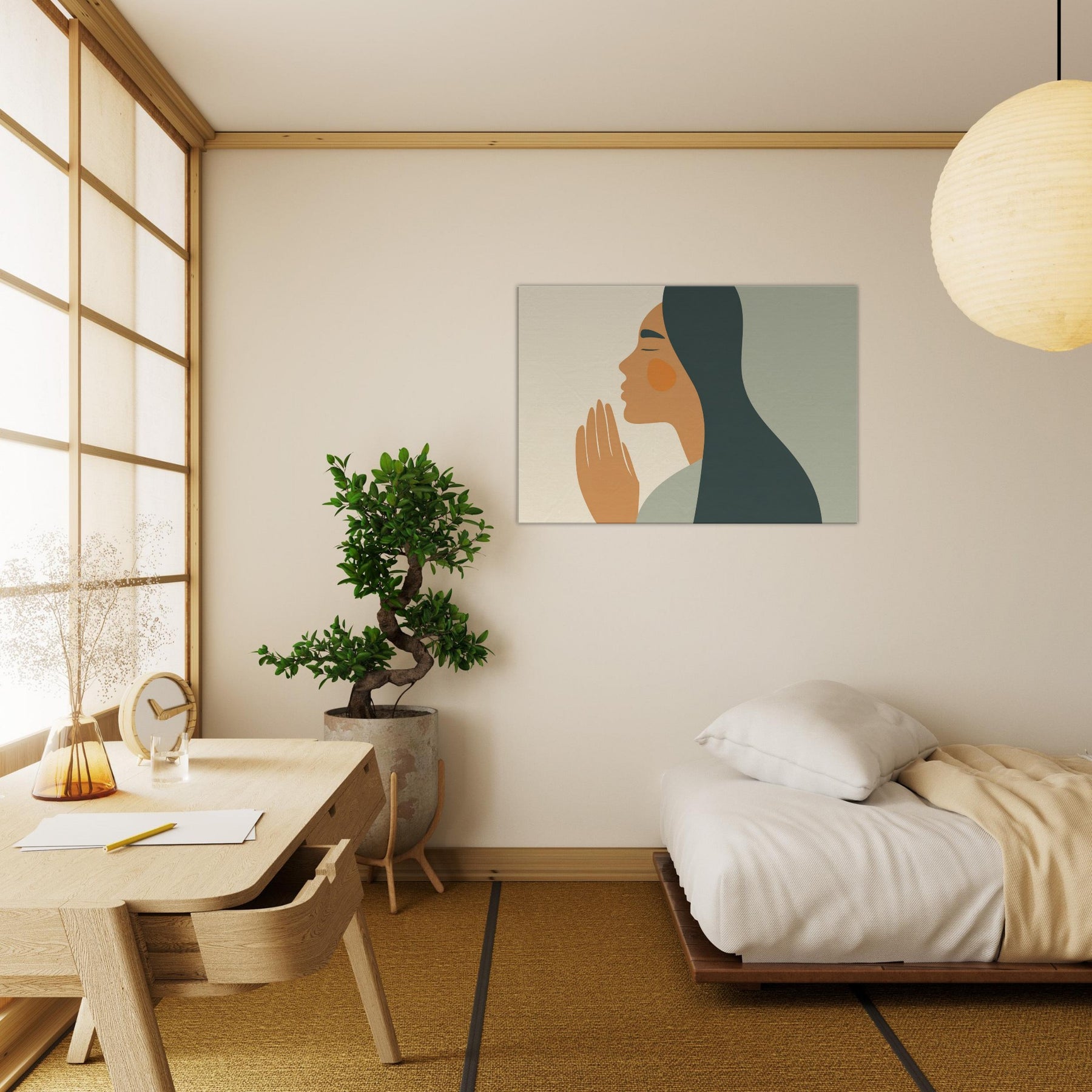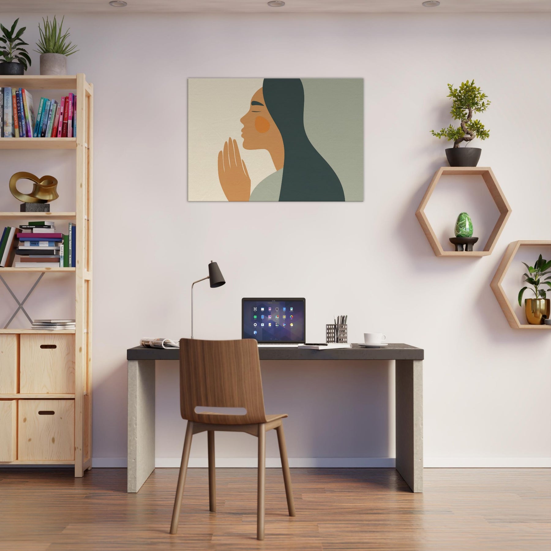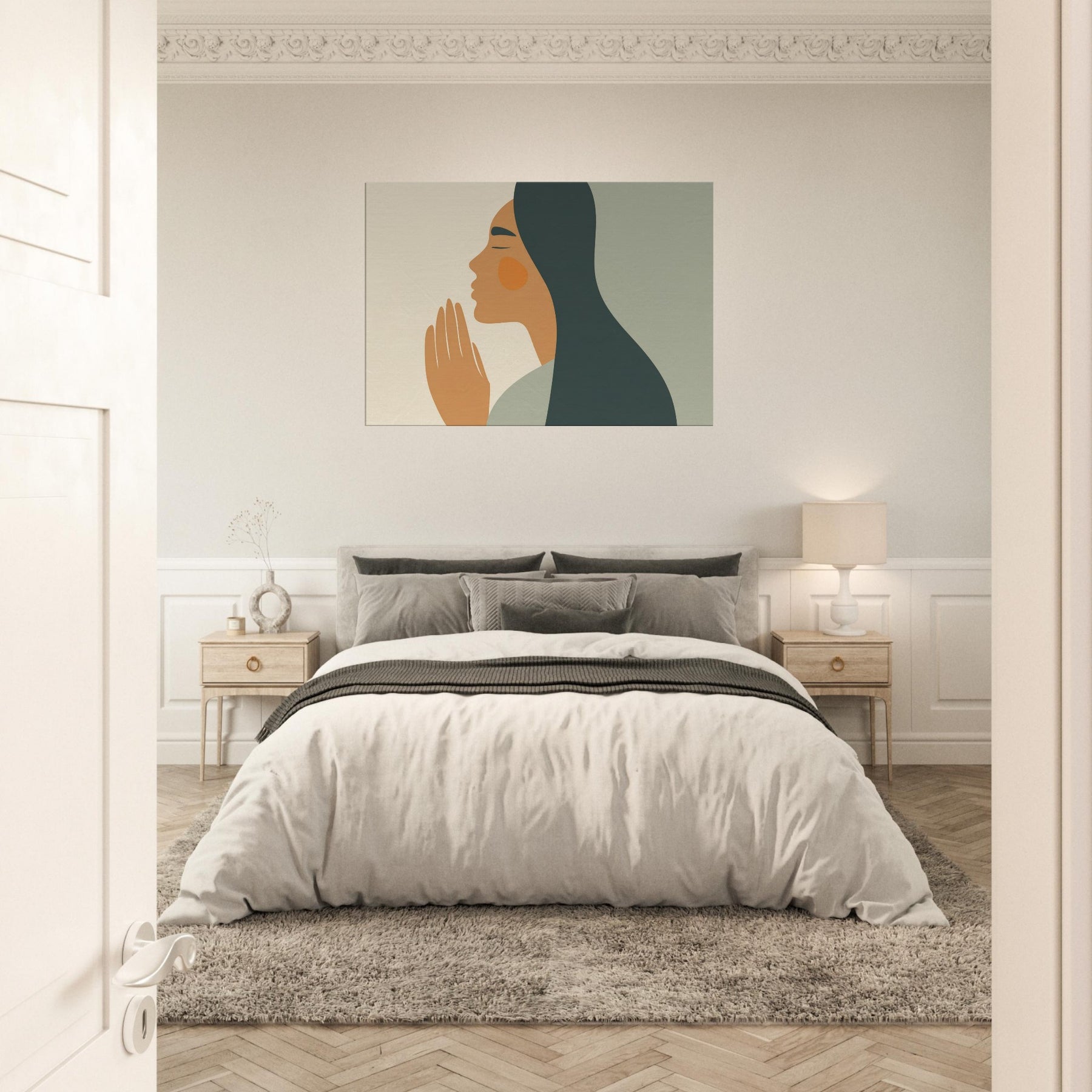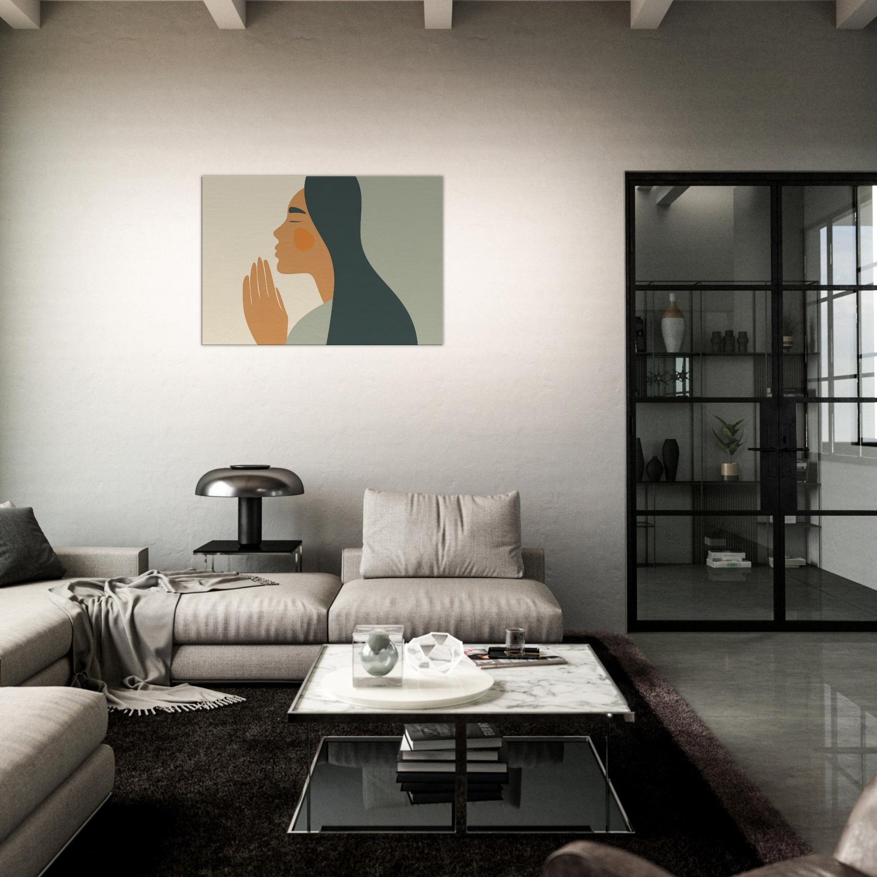 Softly luminous and deeply calm, this minimalist study centers the Primary Subject: Hands in Prayer, in a quiet act of reverence. The fluid profile and warm ochre skin tones rest against a muted backdrop, while the elongated silhouette invites contemplation. A gentle rhythm of negative space breathes serenity, turning any wall into a sanctuary. In living rooms, bedrooms, or entryways, this piece harmonizes with natural light and quiet mornings, turning daily rituals into artful moments of pause.