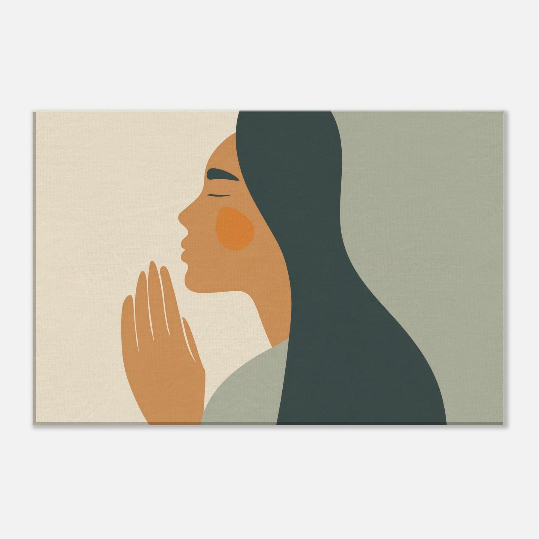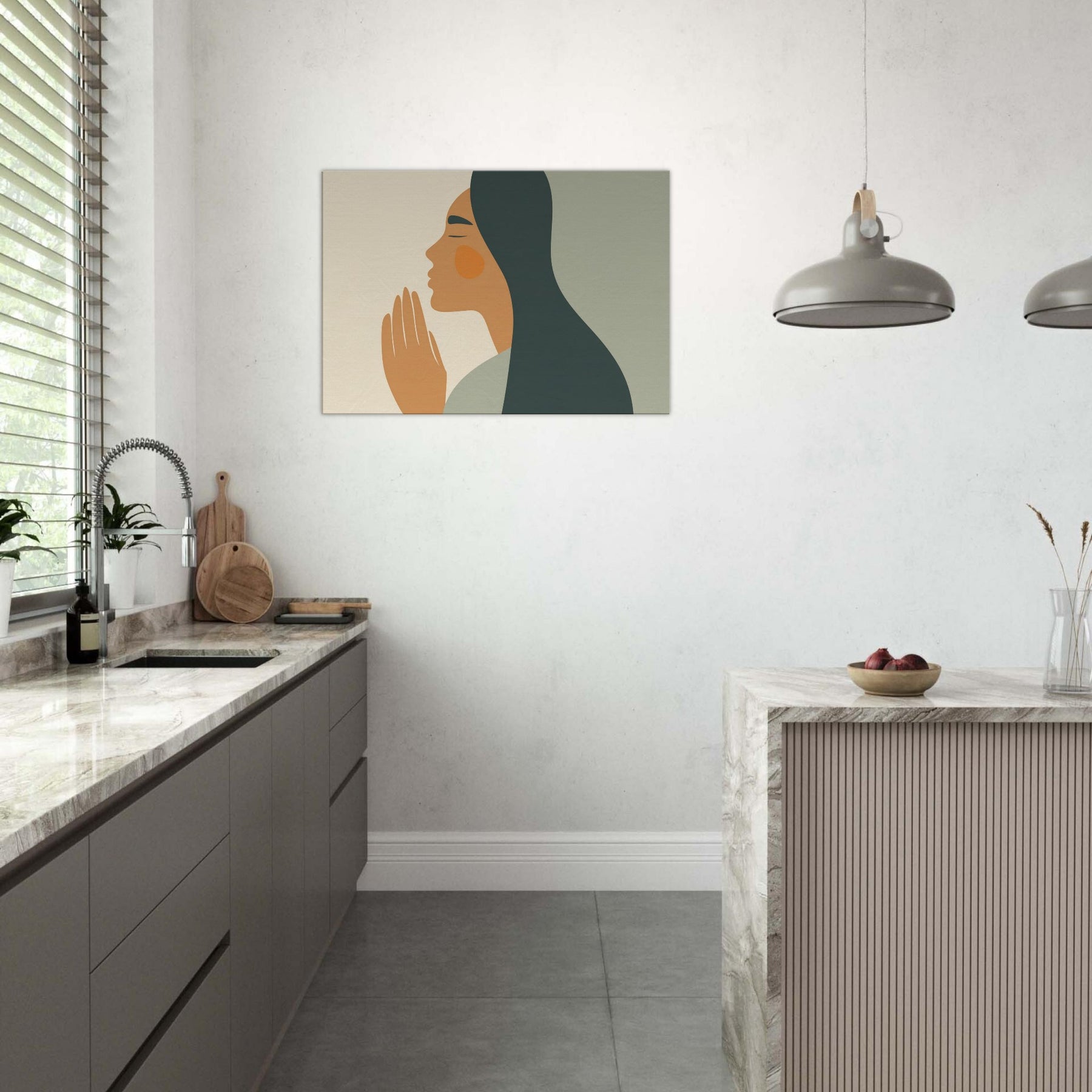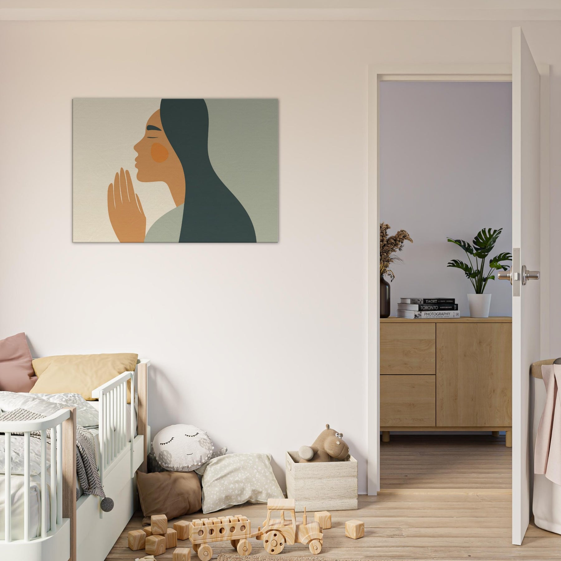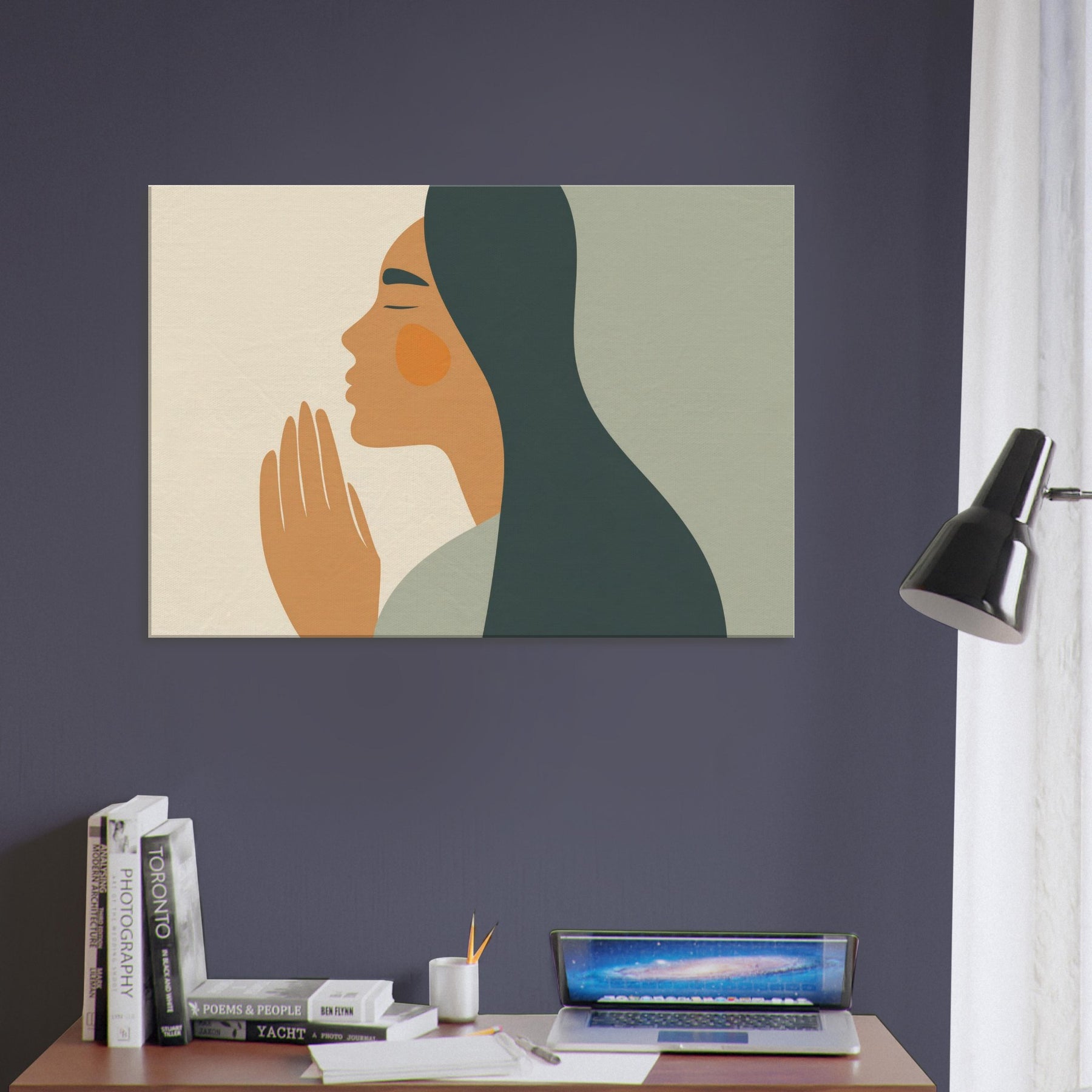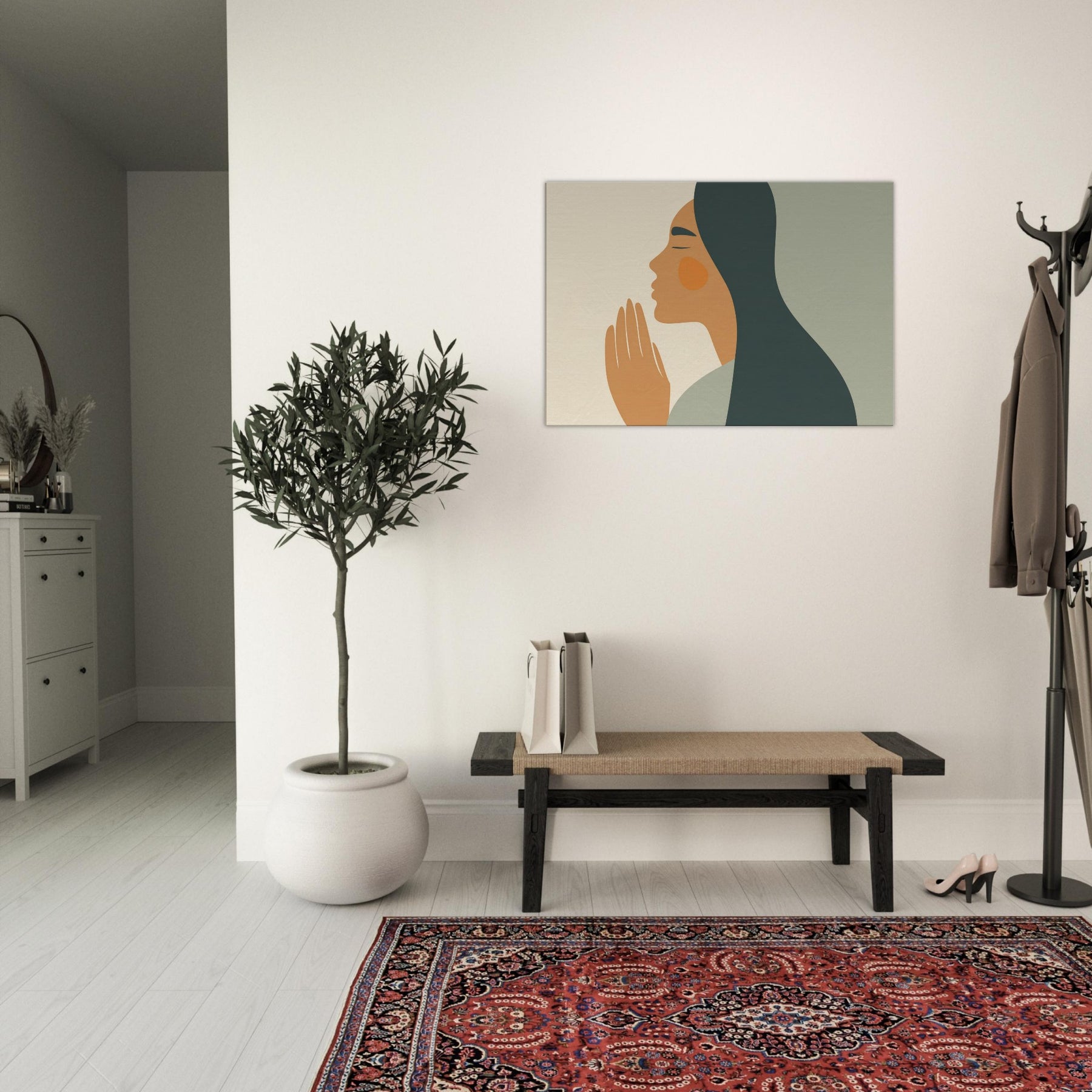 Softly luminous and deeply calm, this minimalist study centers the Primary Subject: Hands in Prayer, in a quiet act of reverence. The fluid profile and warm ochre skin tones rest against a muted backdrop, while the elongated silhouette invites contemplation. A gentle rhythm of negative space breathes serenity, turning any wall into a sanctuary. In living rooms, bedrooms, or entryways, this piece harmonizes with natural light and quiet mornings, turning daily rituals into artful moments of pause.