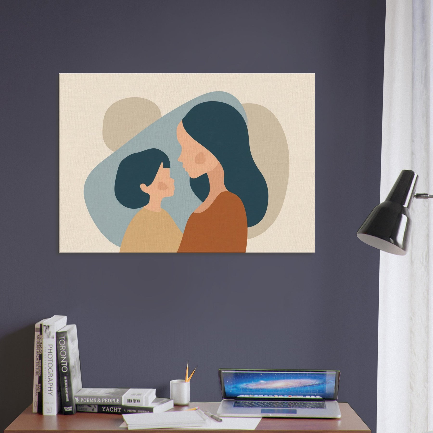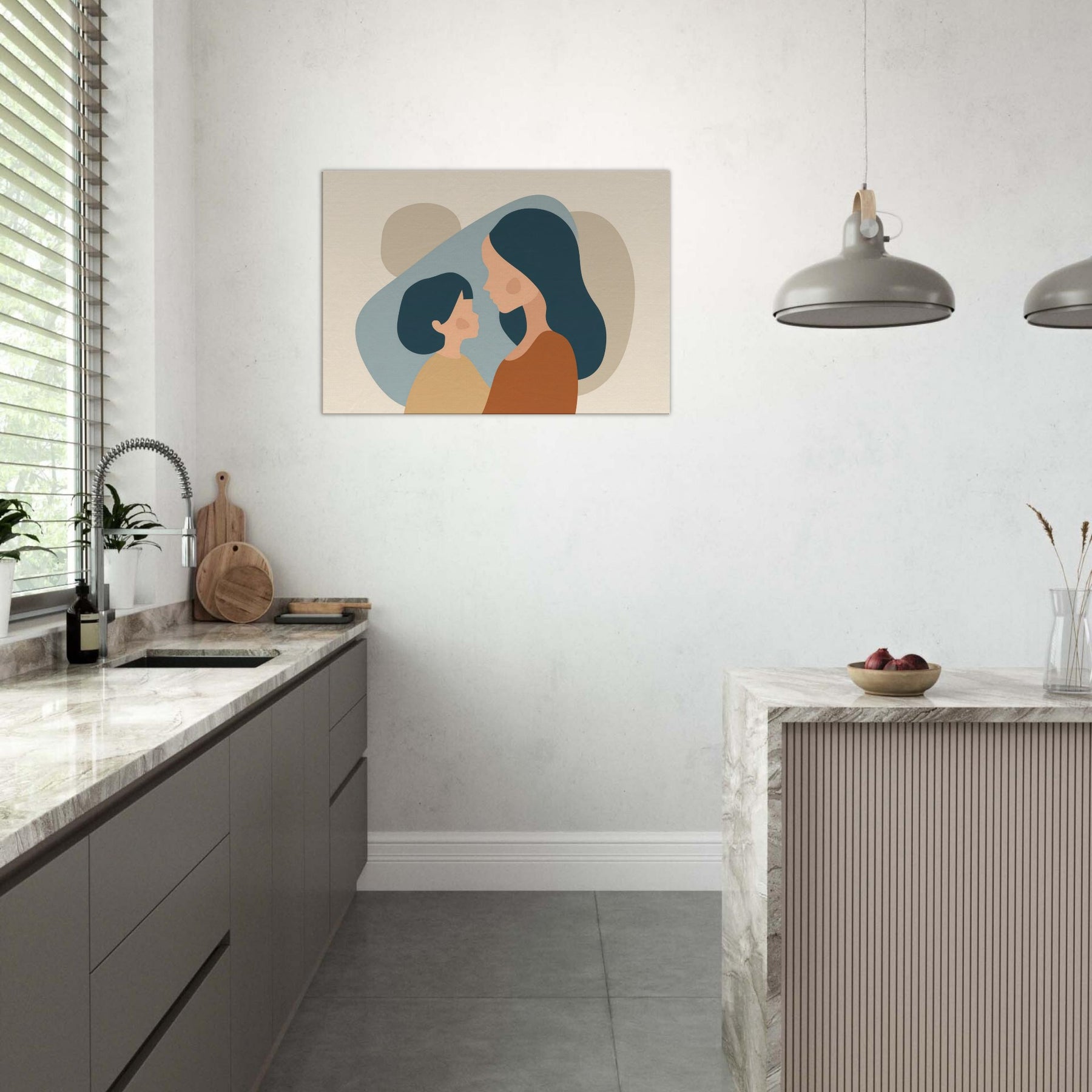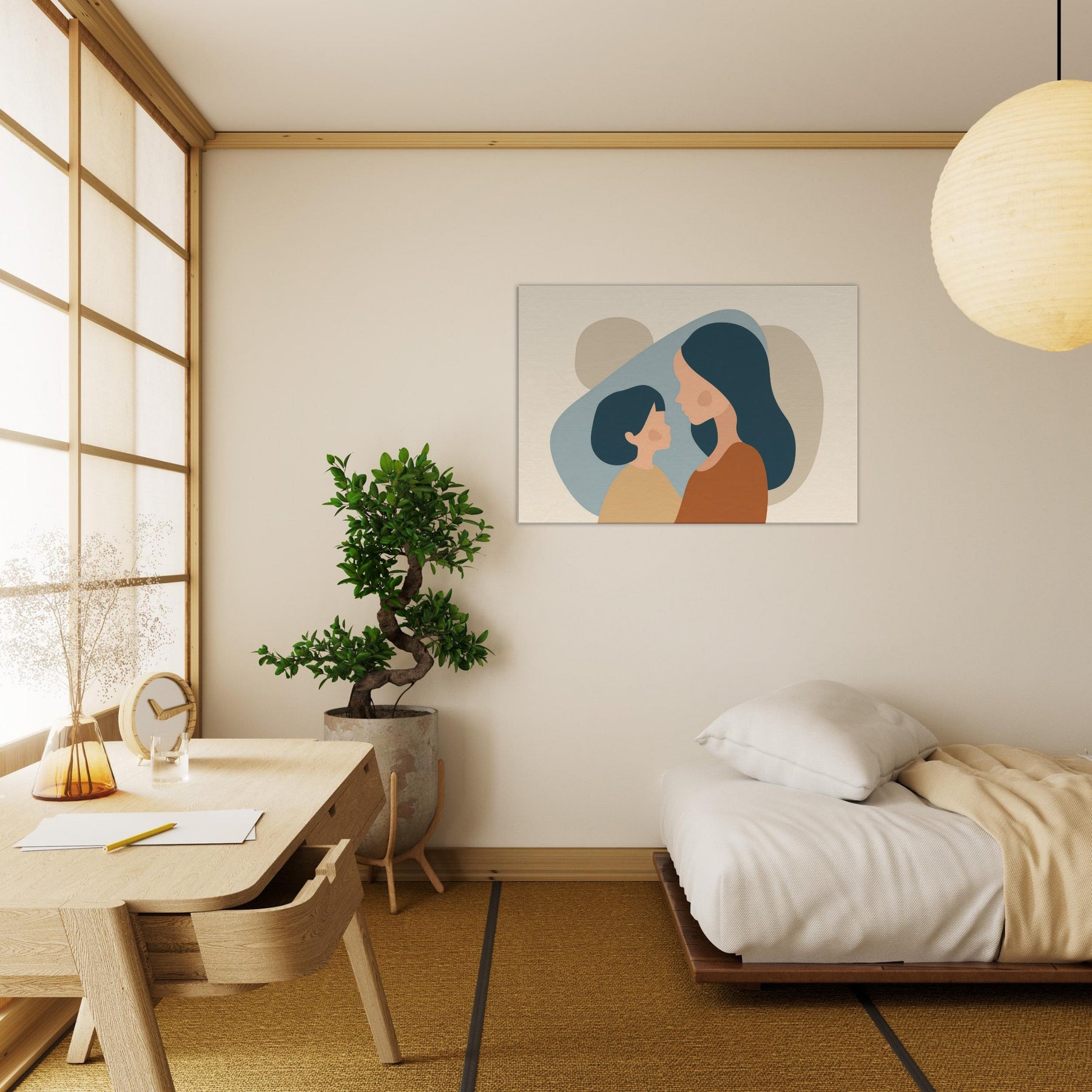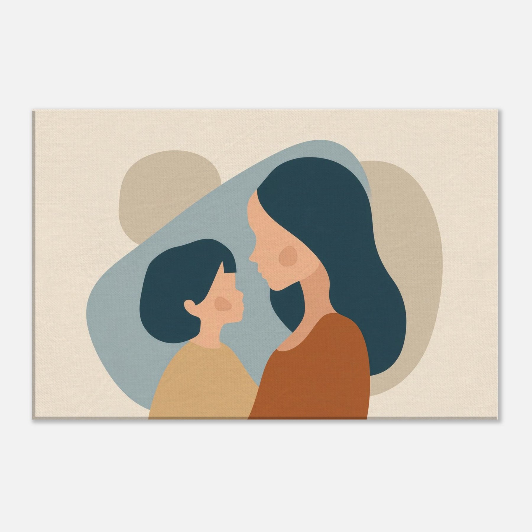 An intimate silhouette study that speaks softly of connection. The minimalist forms cradle light and shadow, turning a quiet moment between a parent and child into a universal pause for home. The warm earth tones and gentle curves invite calm, making any wall feel like a sanctuary perfect above a sofa or in a nurturing corner. This piece breathes tenderness into everyday life, turning routine spaces into places of reflection and belonging.