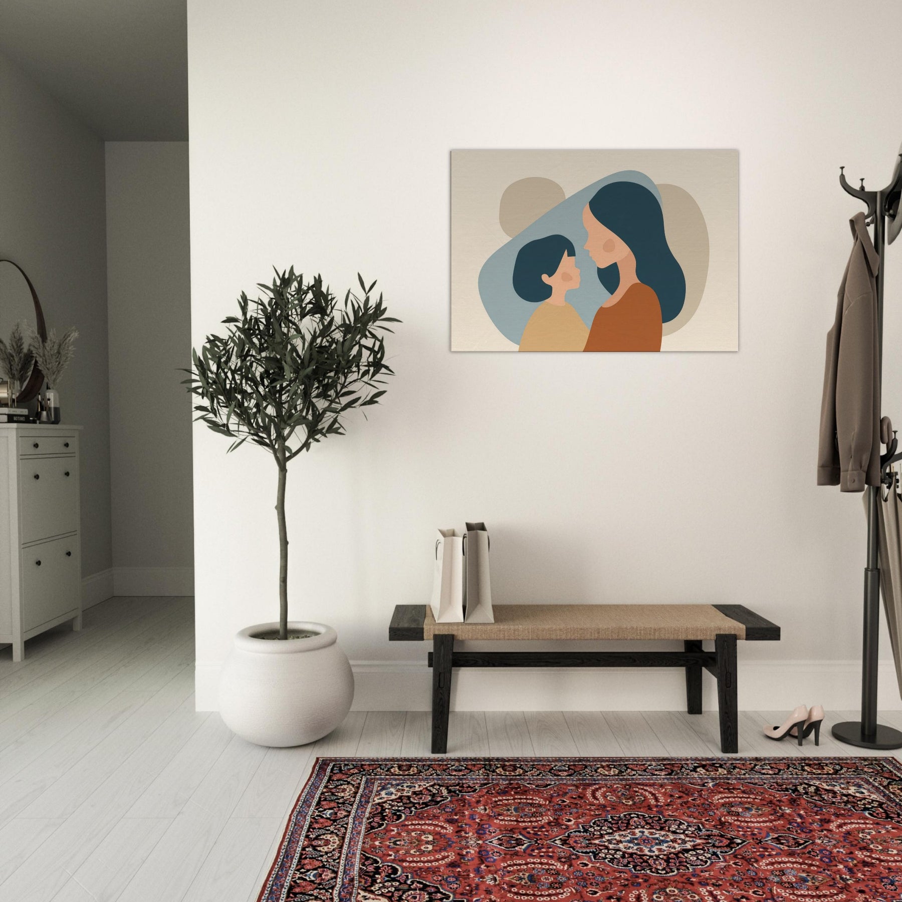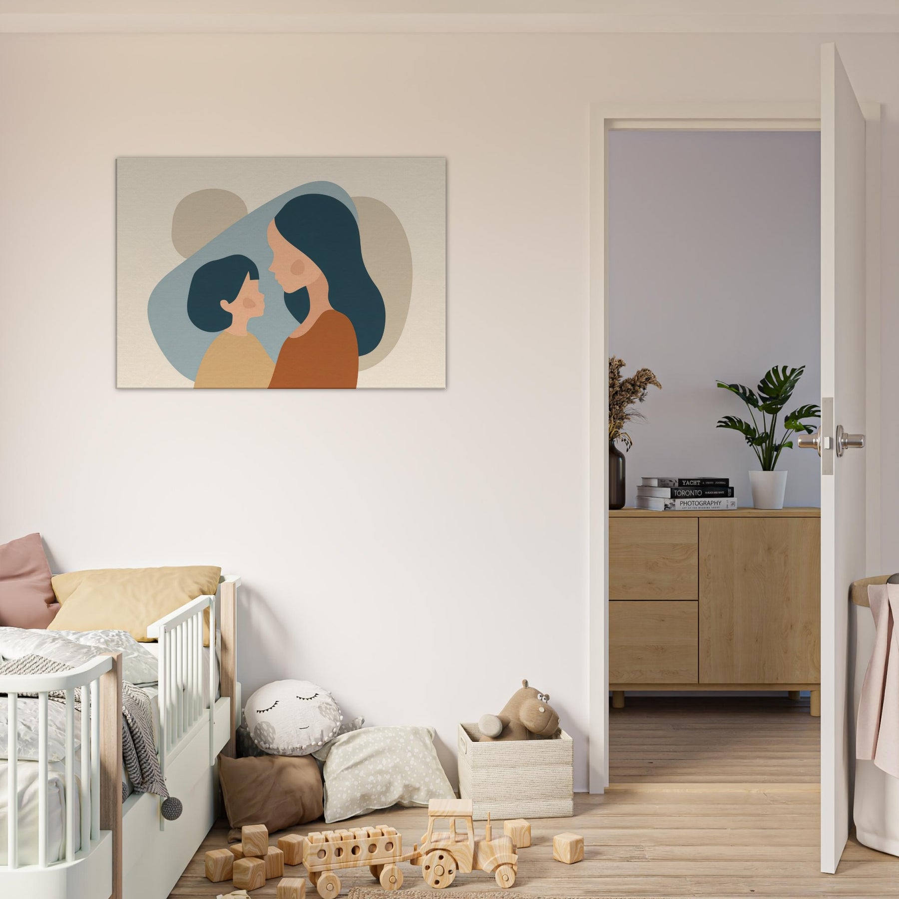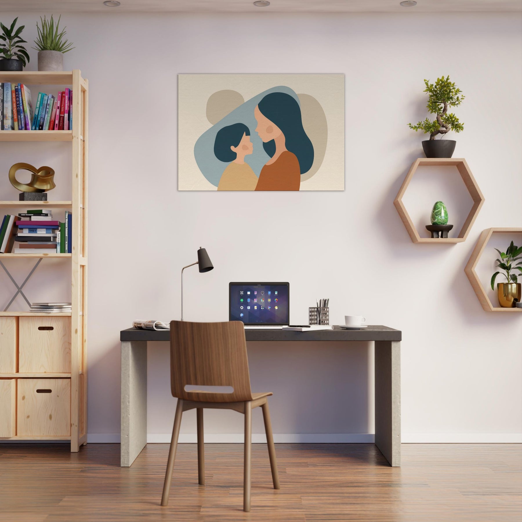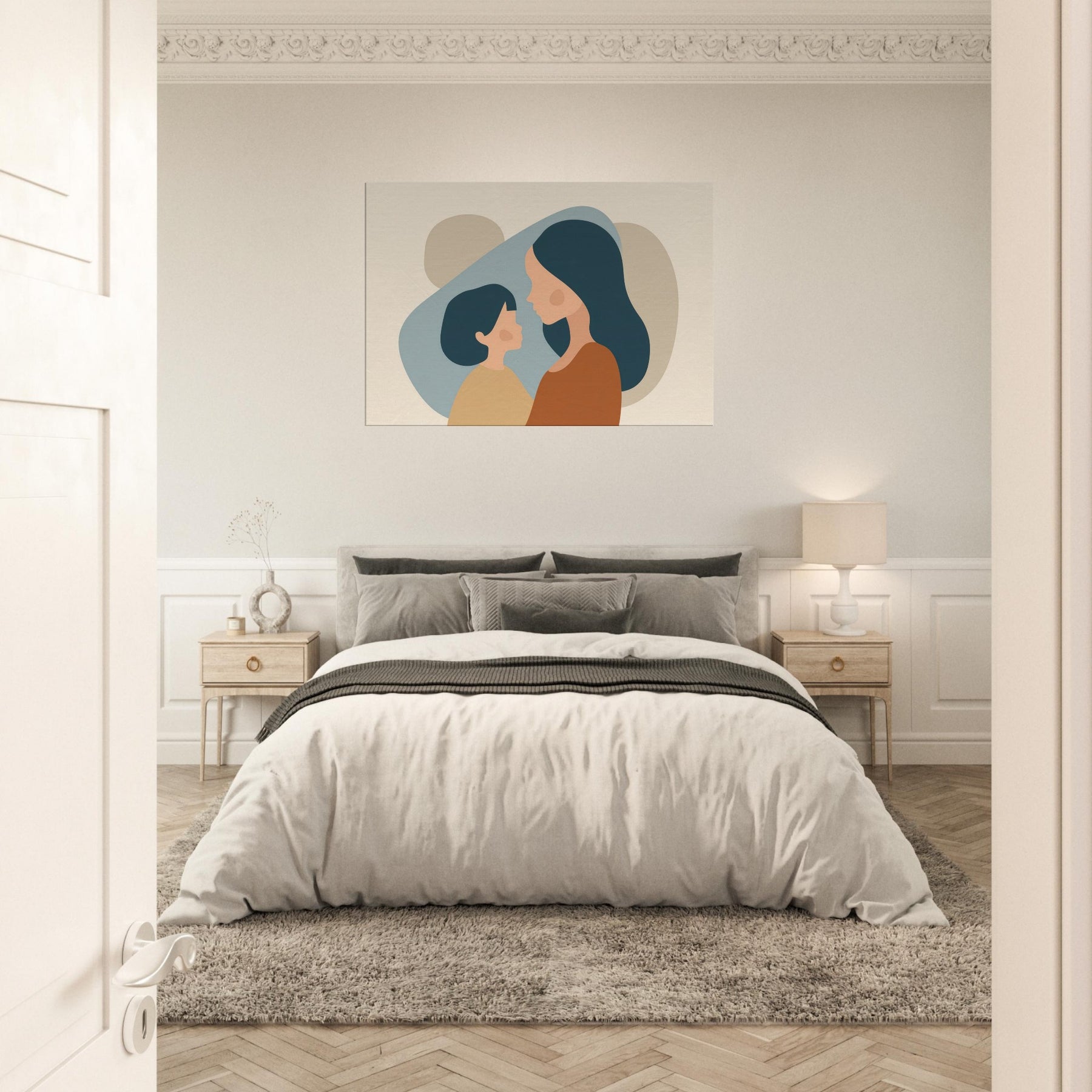 An intimate silhouette study that speaks softly of connection. The minimalist forms cradle light and shadow, turning a quiet moment between a parent and child into a universal pause for home. The warm earth tones and gentle curves invite calm, making any wall feel like a sanctuary perfect above a sofa or in a nurturing corner. This piece breathes tenderness into everyday life, turning routine spaces into places of reflection and belonging.