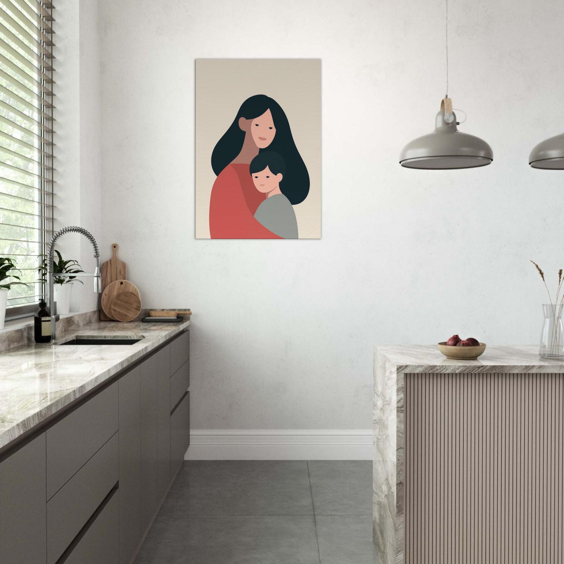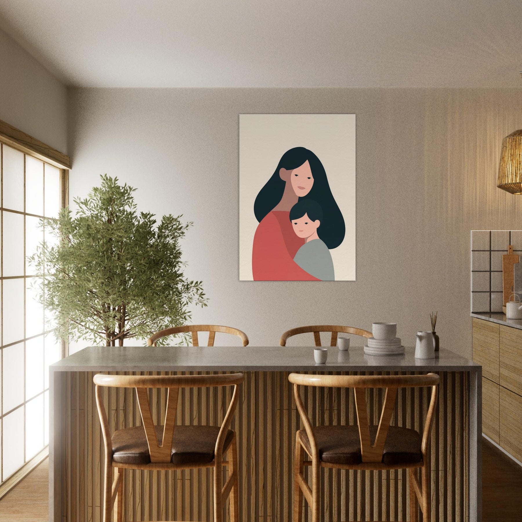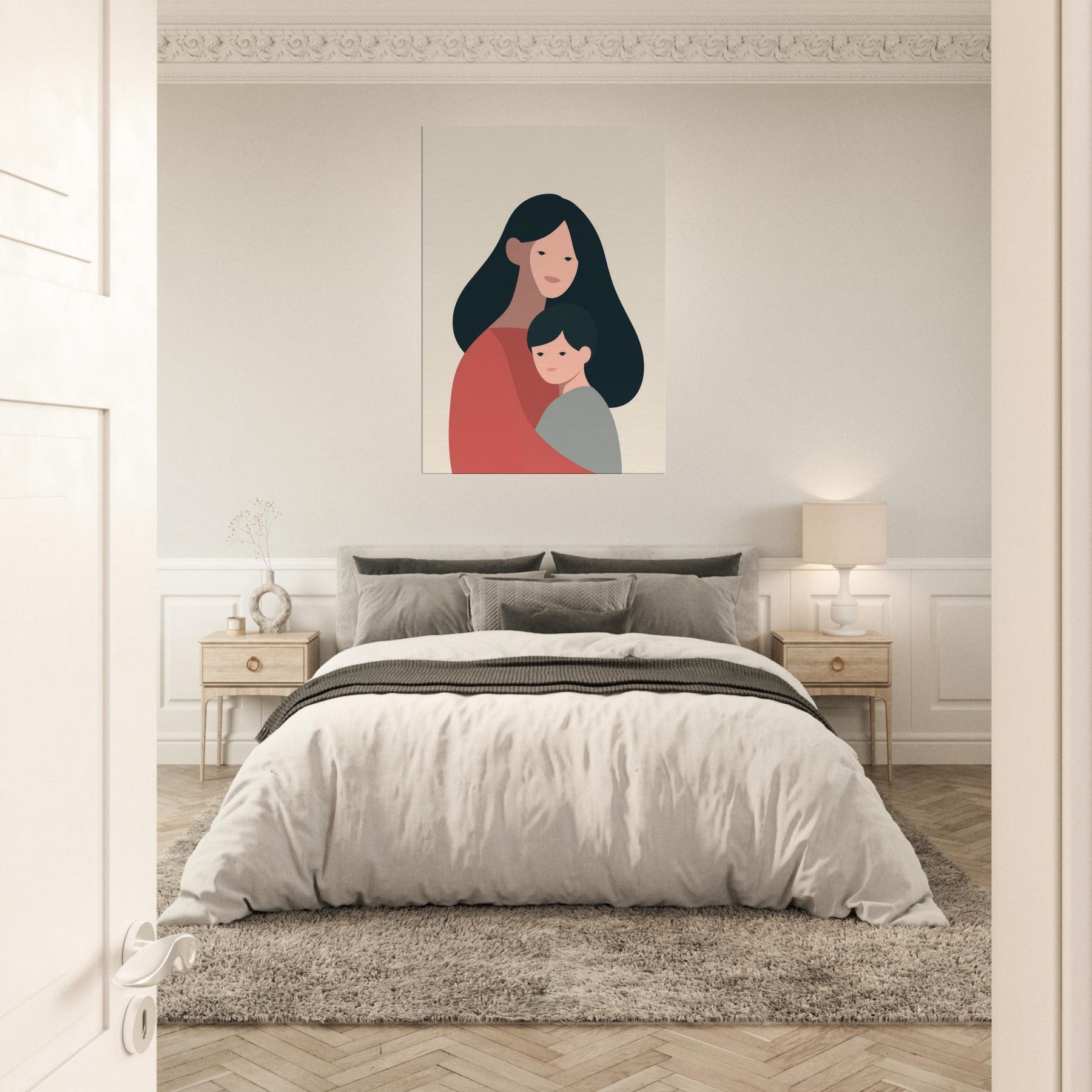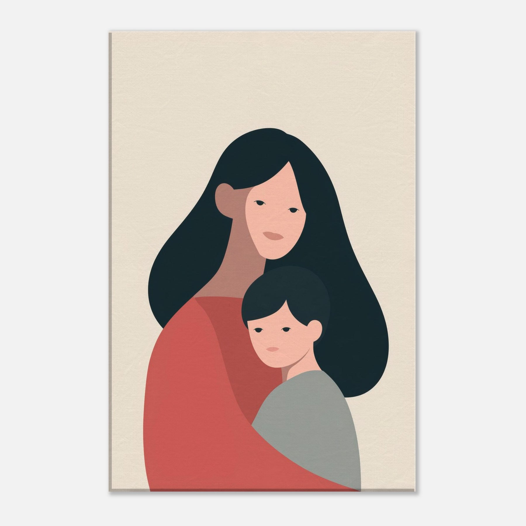 A quiet communion between two figures, rendered in generous negative space and warm earth tones. This minimalist study celebrates the tenderness of the Parent and Child connection where a mother's embrace meets a child's quiet gaze. The soft curves and restrained palette invite a calm rhythm into any room, turning a wall into a gentle vignette of home. Place it in a living room or bedroom to foster warmth, reflection, and the intimate atmosphere of family.