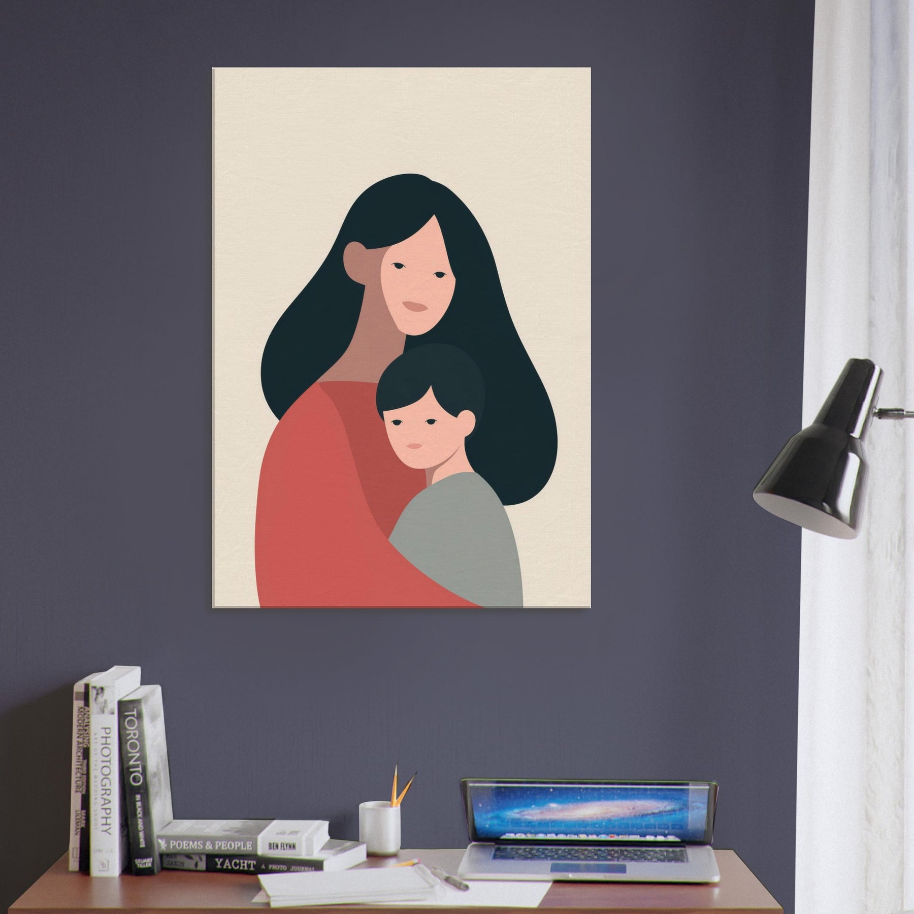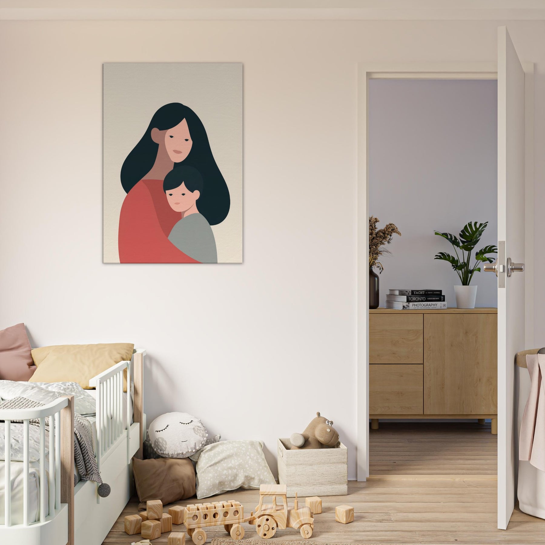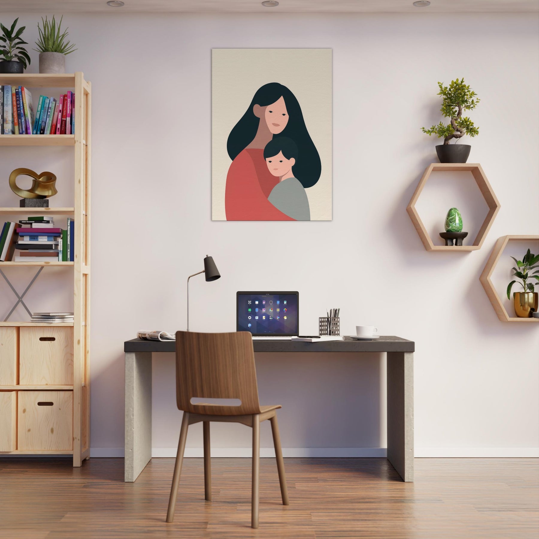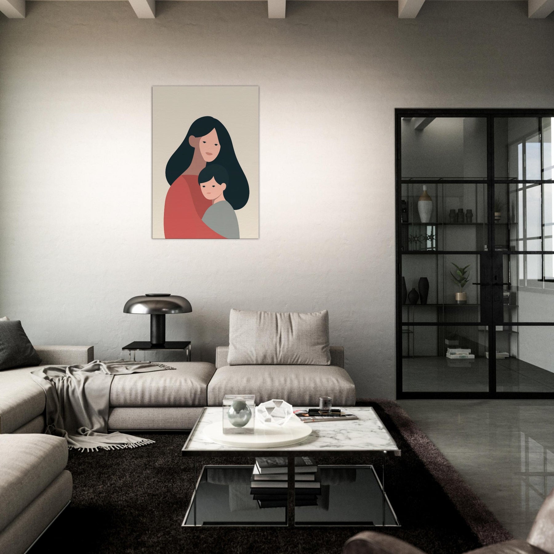 A quiet communion between two figures, rendered in generous negative space and warm earth tones. This minimalist study celebrates the tenderness of the Parent and Child connection where a mother's embrace meets a child's quiet gaze. The soft curves and restrained palette invite a calm rhythm into any room, turning a wall into a gentle vignette of home. Place it in a living room or bedroom to foster warmth, reflection, and the intimate atmosphere of family.