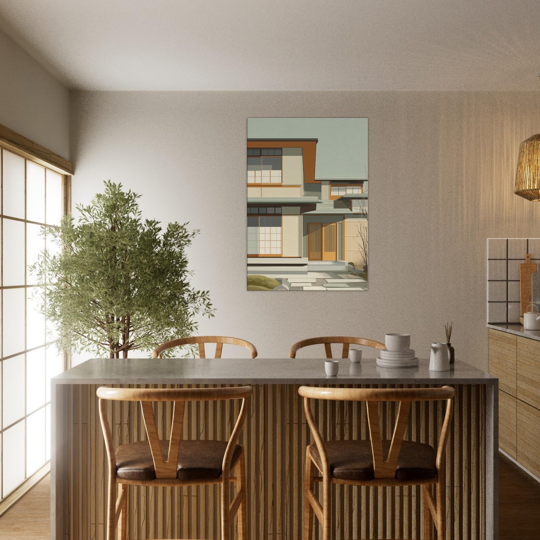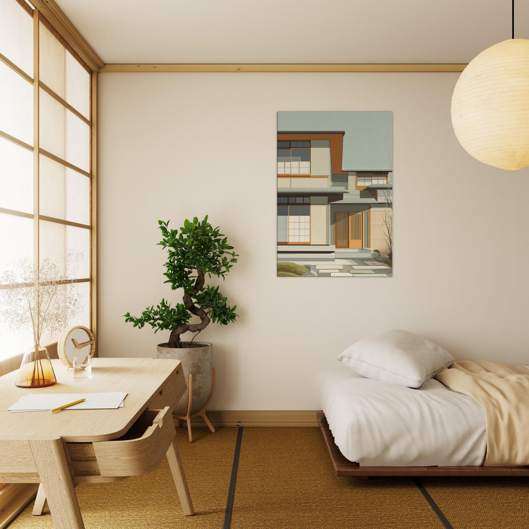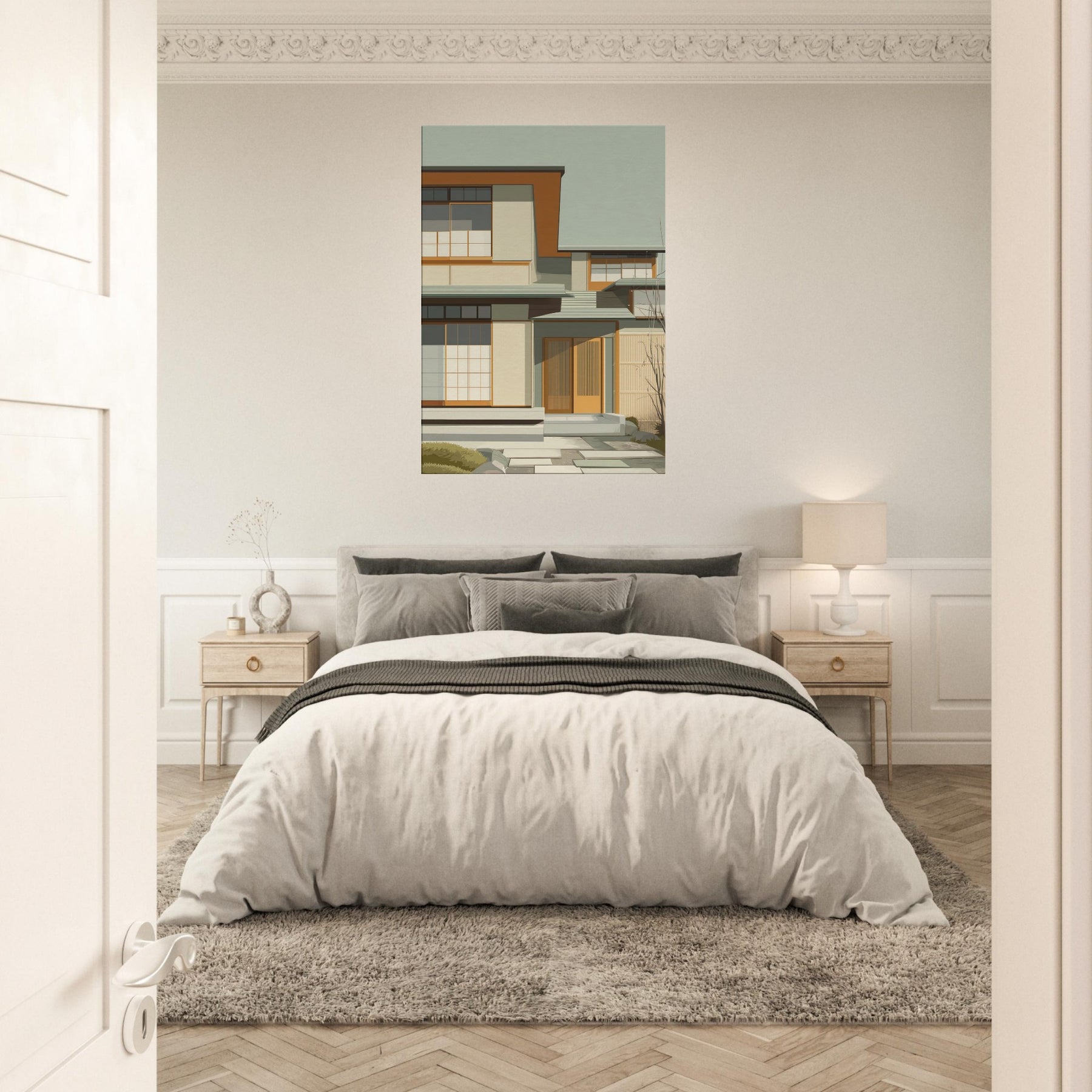 Step into a hush of lines and pale light with this study of Japanese Houses rendered in a minimalist palette. The architecture becomes a quiet poem soft edges, warm wood, and careful shade that suggest morning sun on the steps. The arrangement invites stillness, guiding the eye along clean planes and generous gaps. Hung in a living room or study, it fosters calm focus, balances a busy day with a sense of measured space, and turns everyday walls into a serene vignette of urban grace.