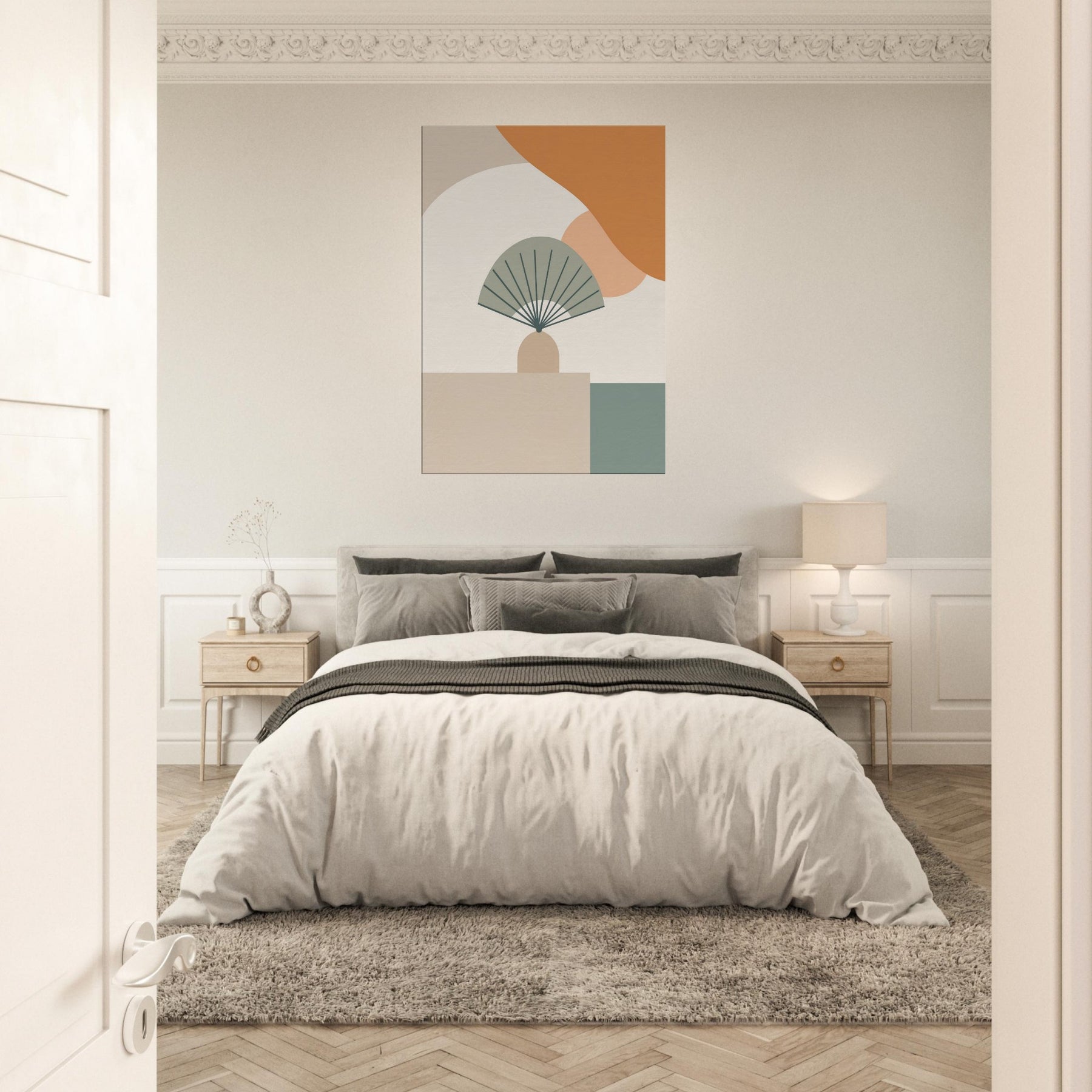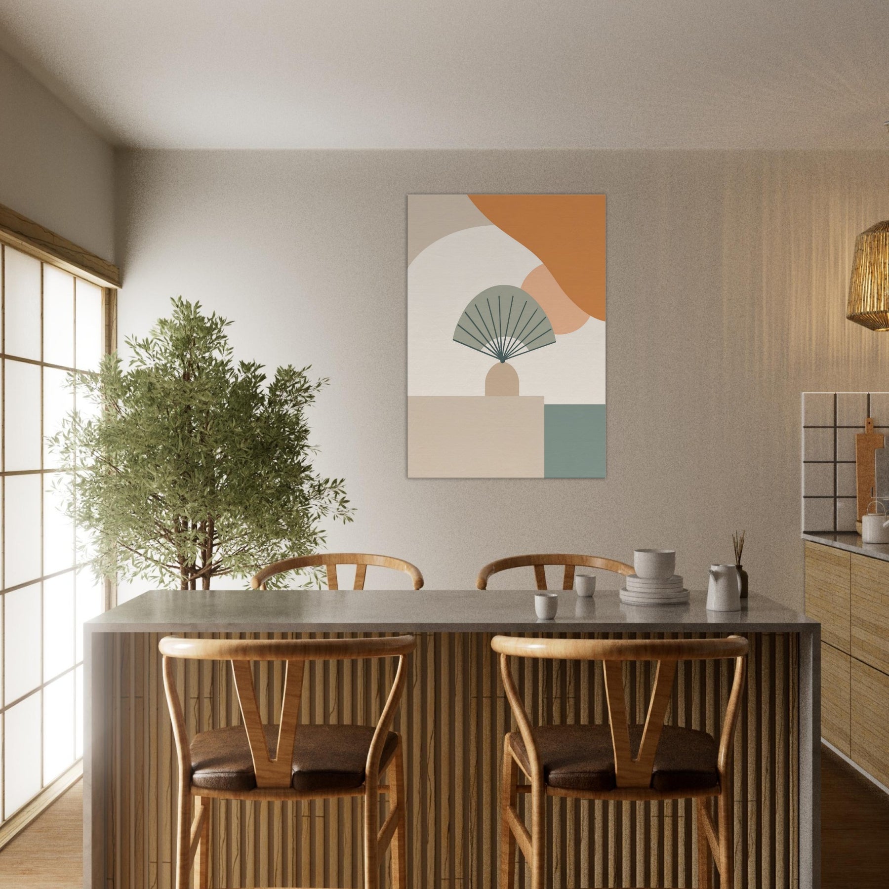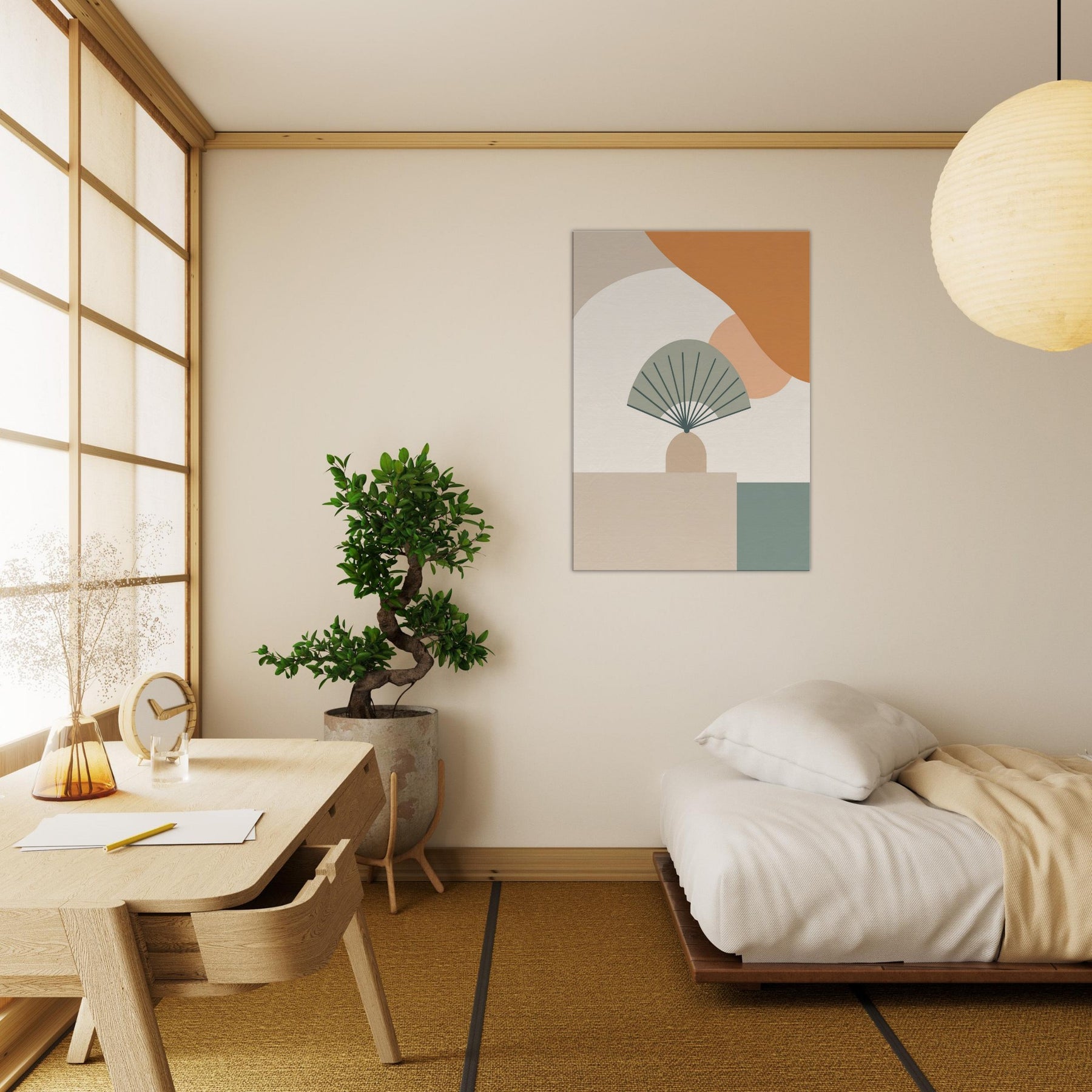 Folding Fan on Table settles into the room as a whisper. This minimalist composition folds space into a calm, architectural moment, where pale curves meet clean lines and gentle neutrals. The Folding Fan on Table becomes a quiet companion, catching light and casting soft shadow on the surface beneath. Hang it in a living room or dining nook to invite stillness, subtle sophistication, and a touch of quiet drama an everyday icon reimagined as calm color and form.