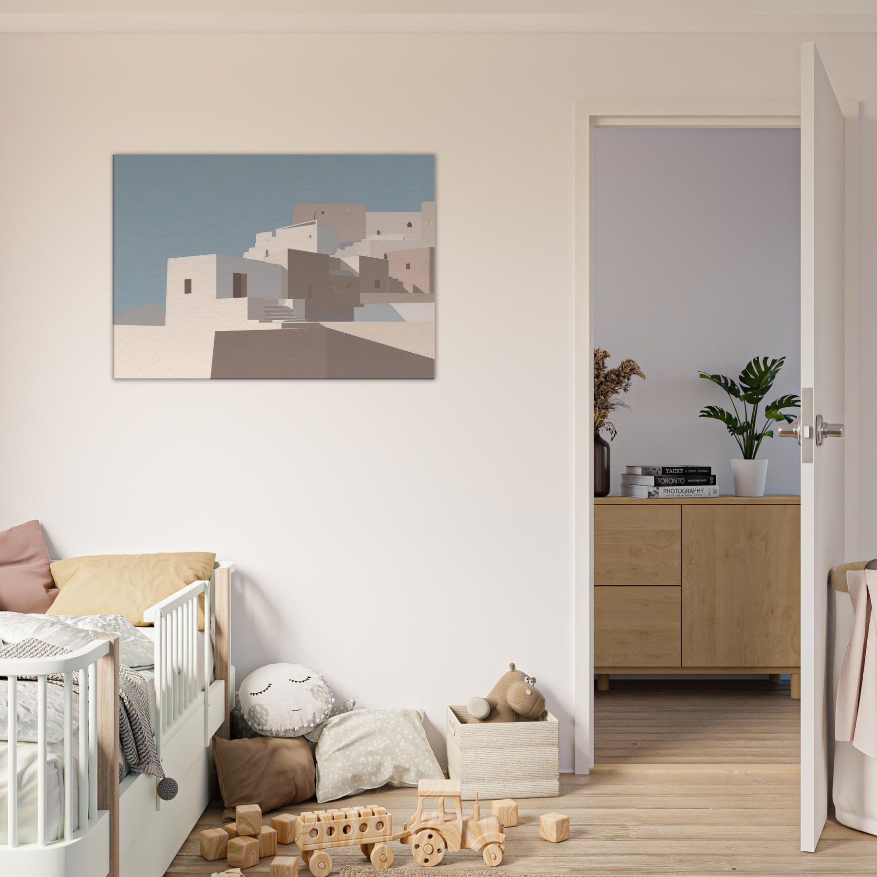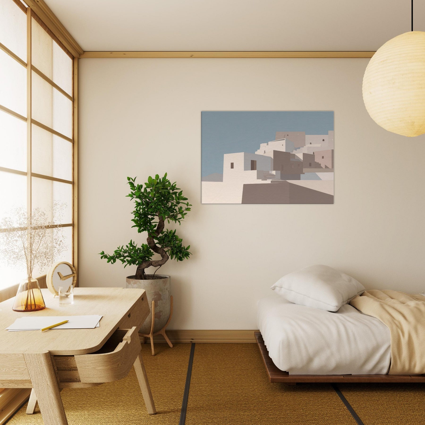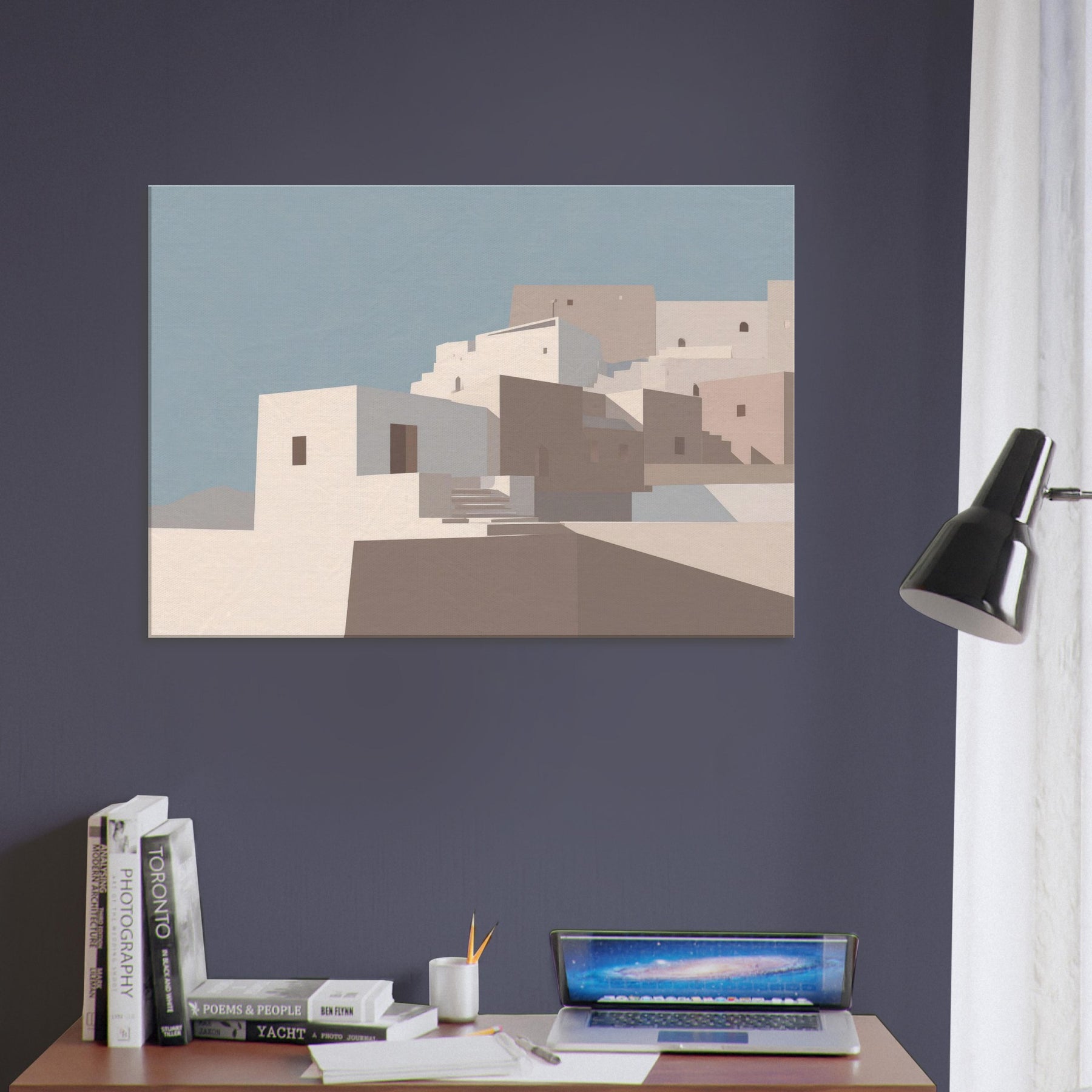 An orderly cascade of sun washed blocks ascends into a quiet blue sky, capturing the fortress as a calm, sculptural memory. This minimalist composition uses simple planes and soft taupe, ivory, and clay tones to suggest stone and sun warmed plaster. The restraint of form invites quiet reflection, turning walls into a meditative horizon. Hang it in a living room or study to slow the day, to anchor conversations, and to linger on the sensation of space becoming still.