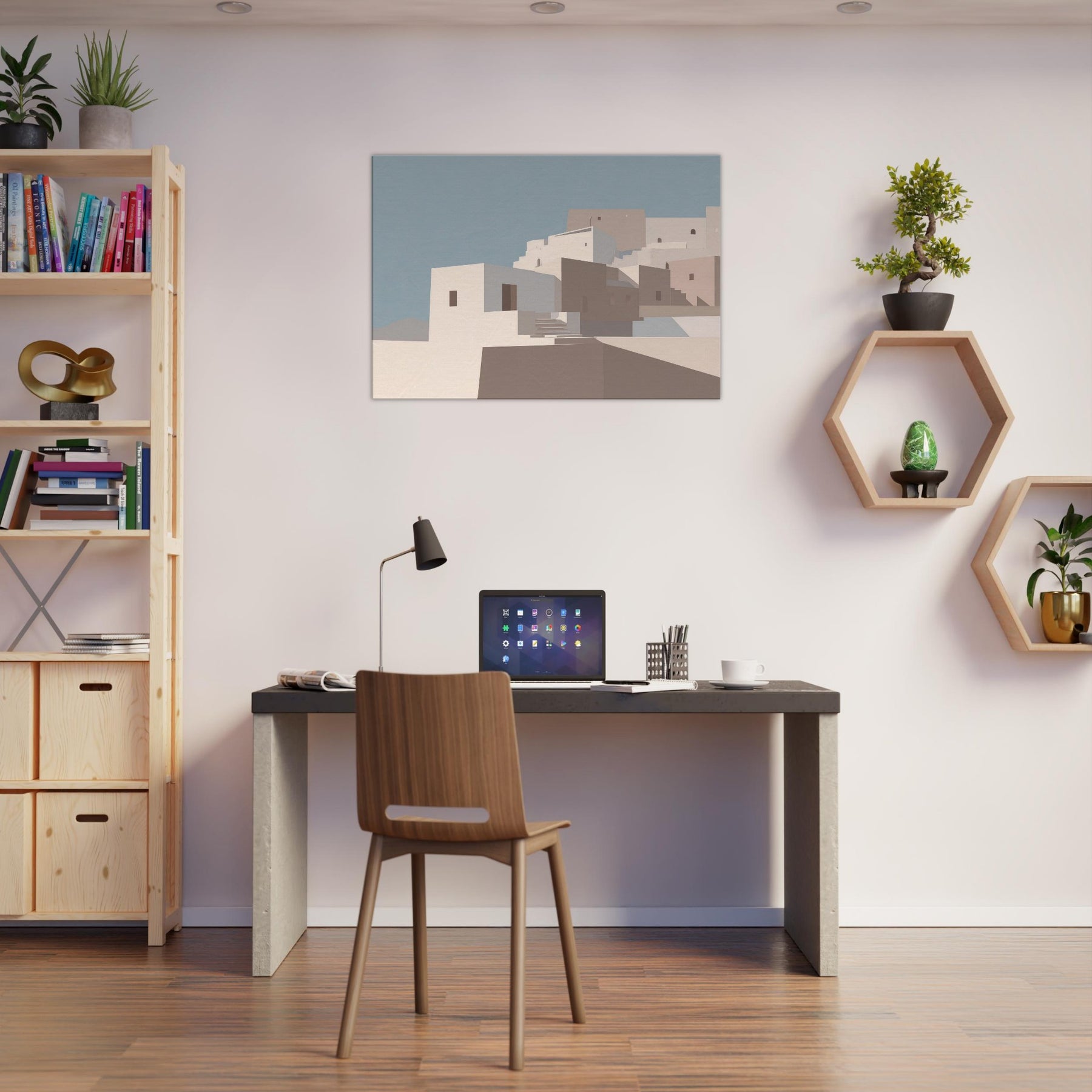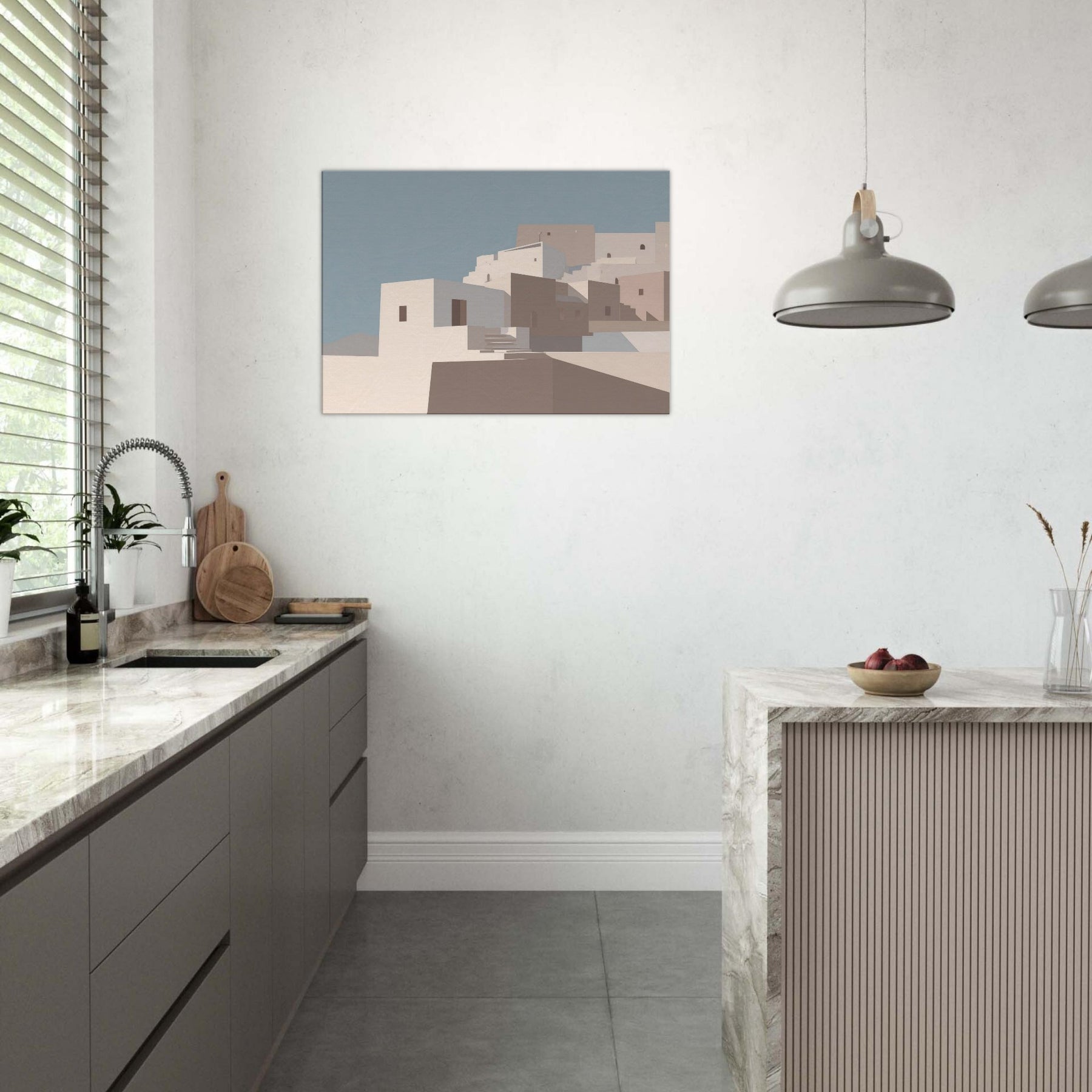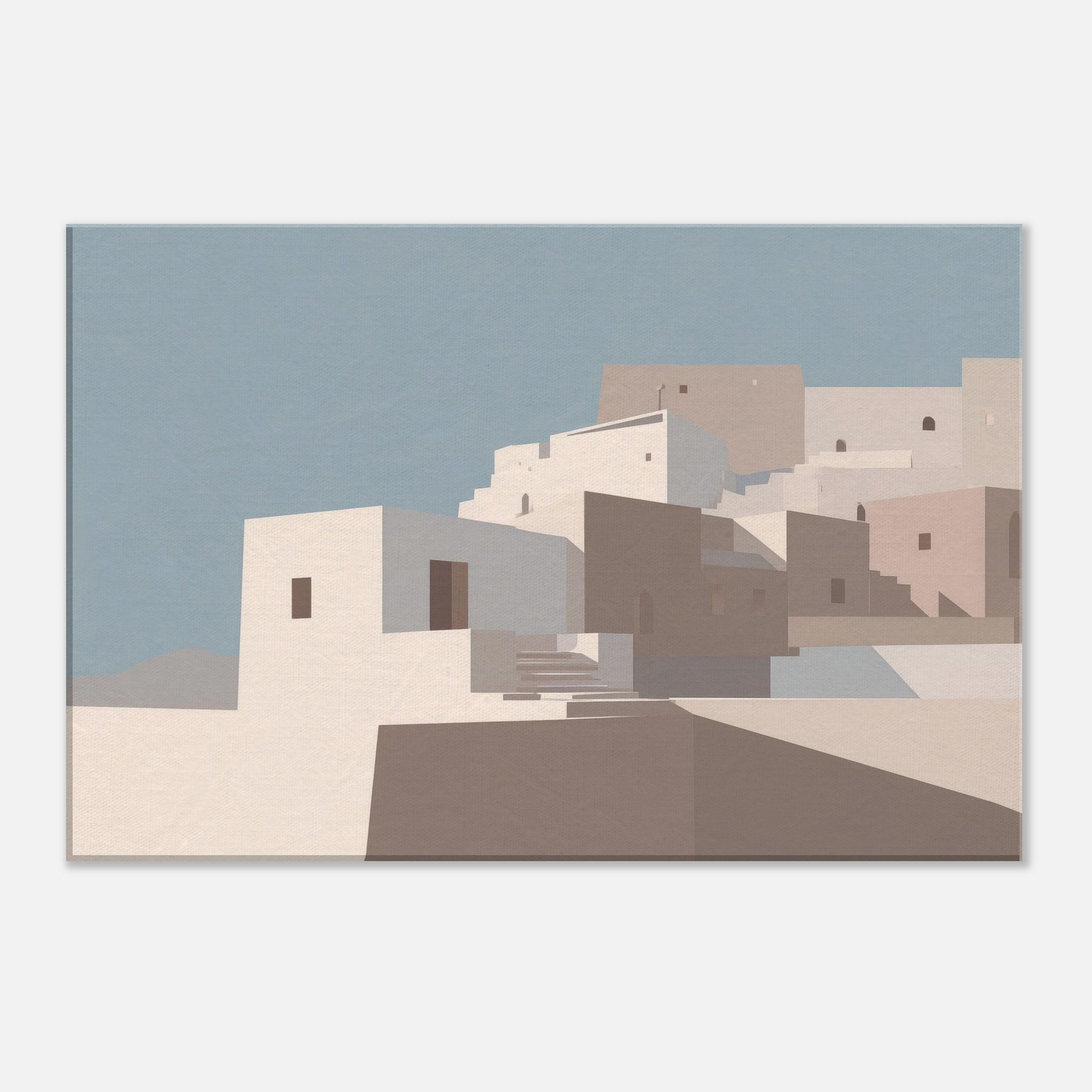 An orderly cascade of sun washed blocks ascends into a quiet blue sky, capturing the fortress as a calm, sculptural memory. This minimalist composition uses simple planes and soft taupe, ivory, and clay tones to suggest stone and sun warmed plaster. The restraint of form invites quiet reflection, turning walls into a meditative horizon. Hang it in a living room or study to slow the day, to anchor conversations, and to linger on the sensation of space becoming still.