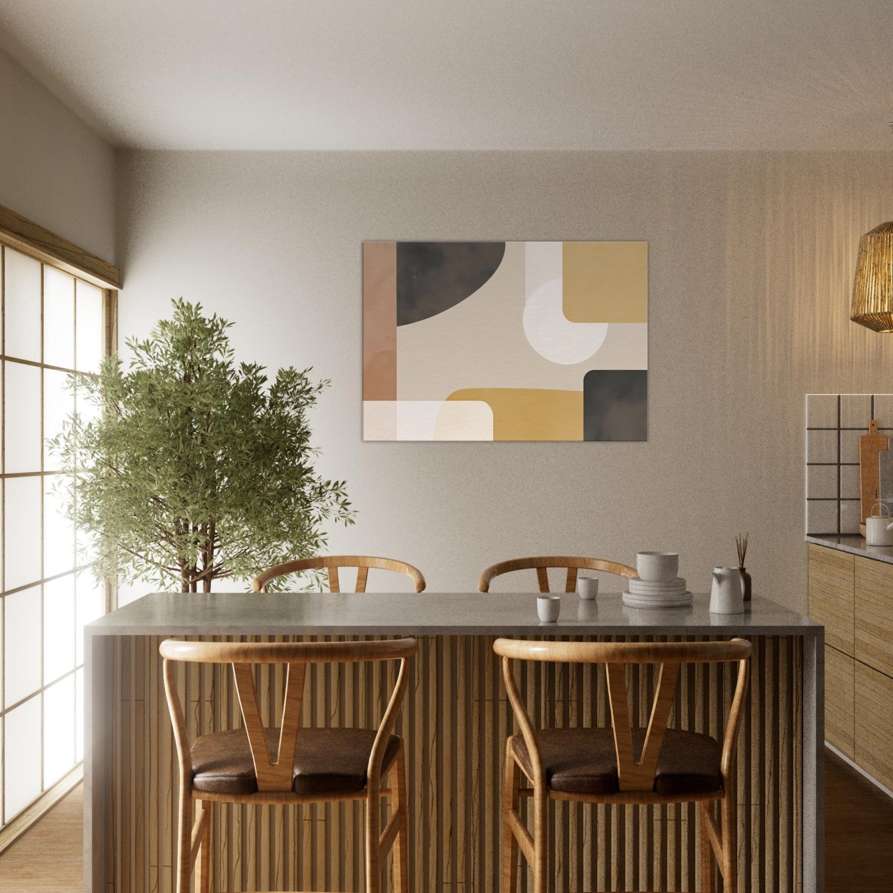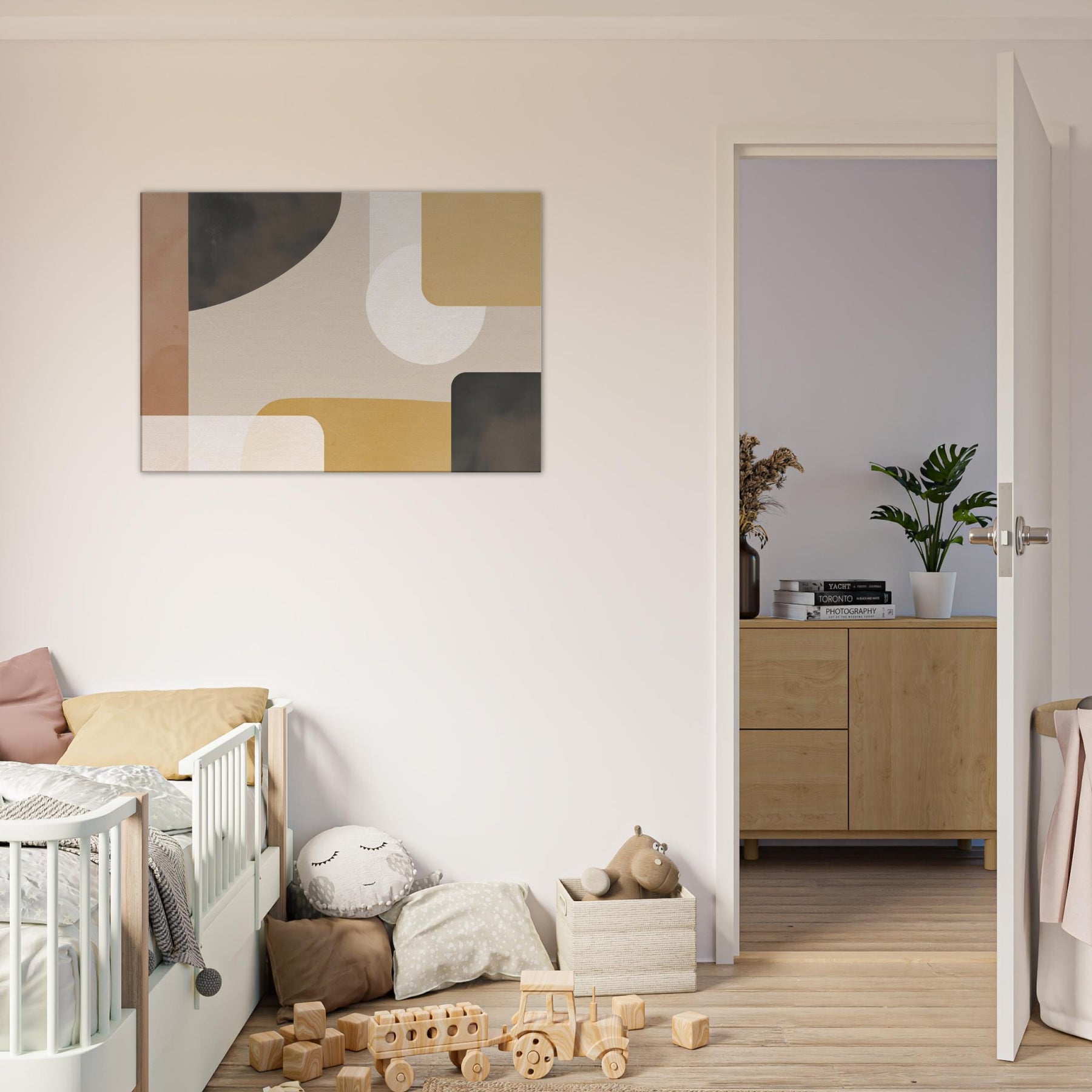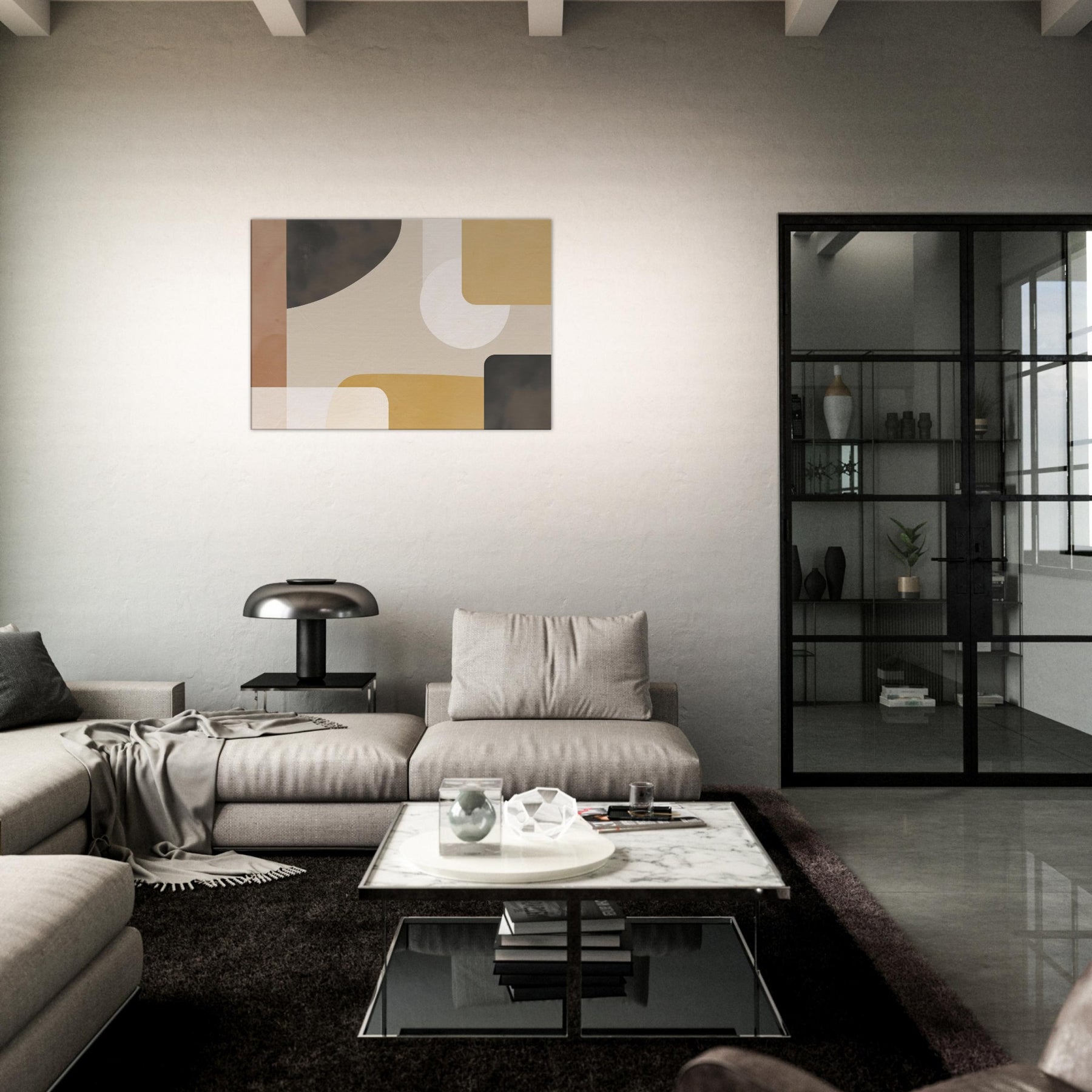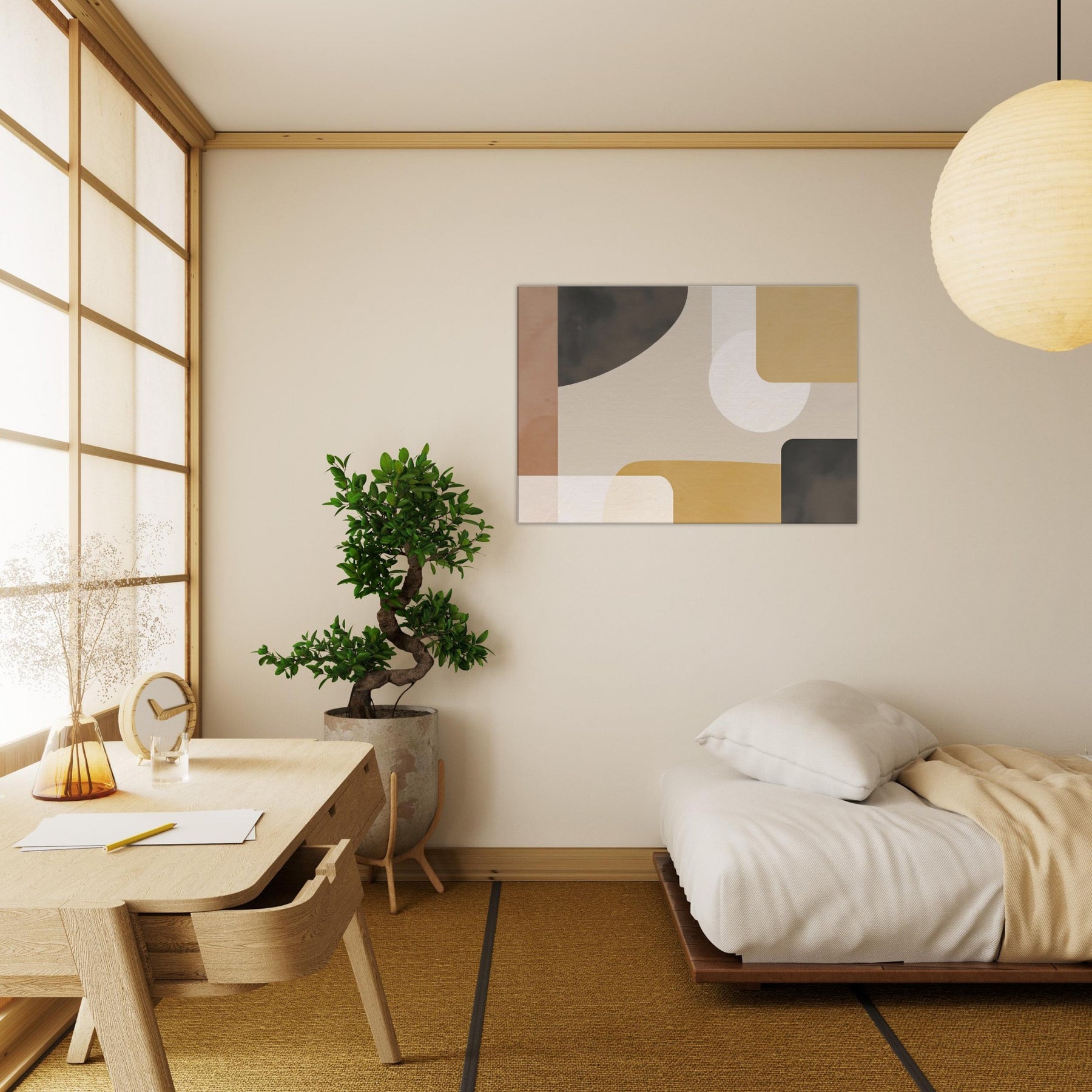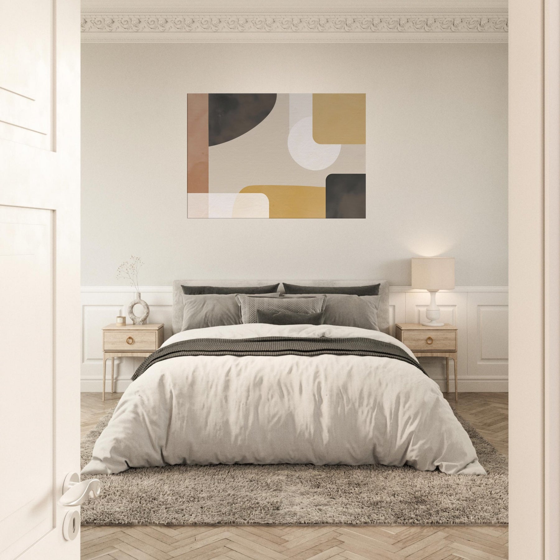 Geometric Shapes float in a serene field of neutrals, each curve and edge hinting at quiet narratives. This minimalist composition invites calm focus, turning walls into a subtle stage for daily life. The Geometric Shapes speak in soft ochres, ash, and charcoal, revealing faces and bodies more through suggestion than detail. Hang it where light shifts through the day and watch the space transform an architectural breath that pairs with coffee mornings or candlelit evenings, elevating a room with restraint, texture, and cinematic stillness.