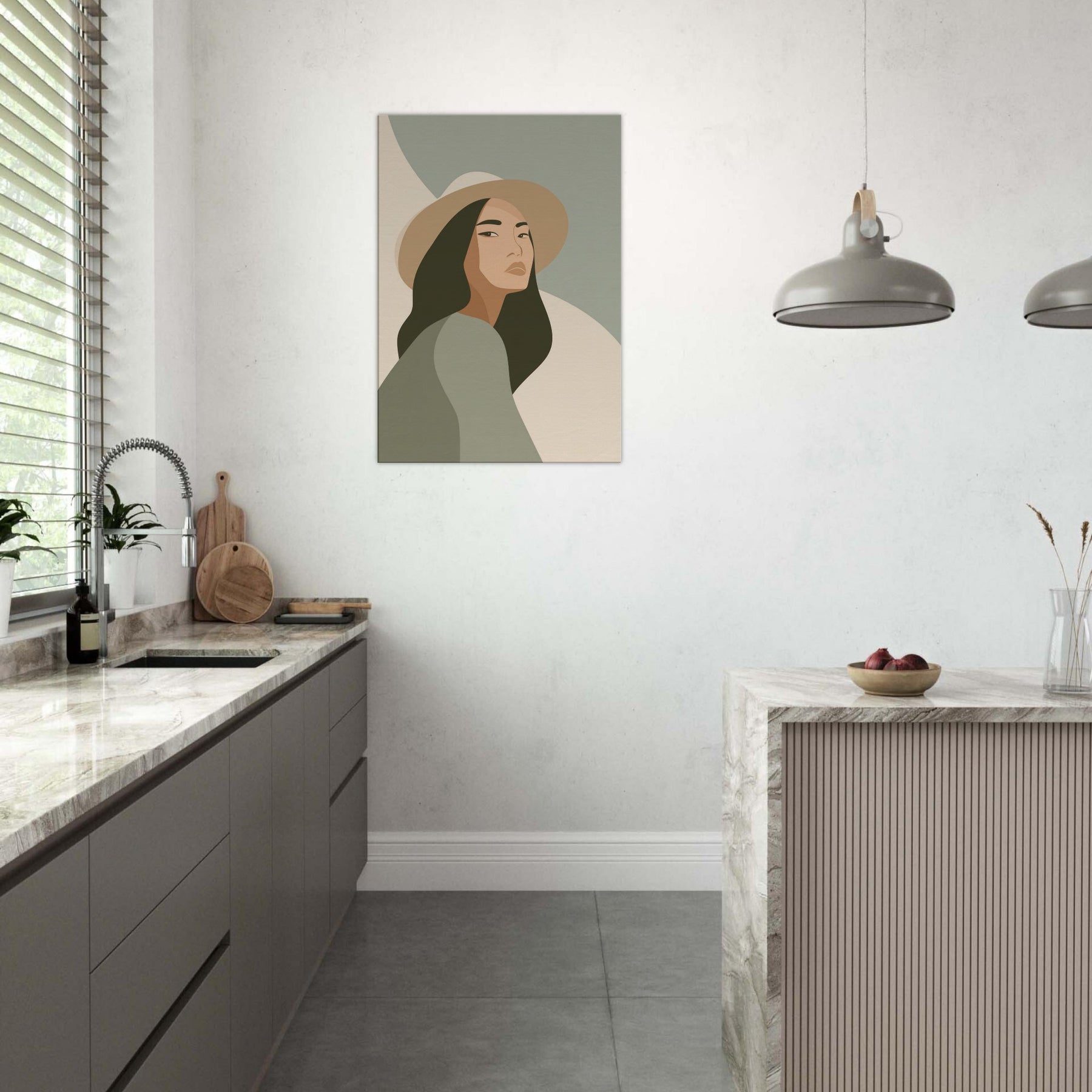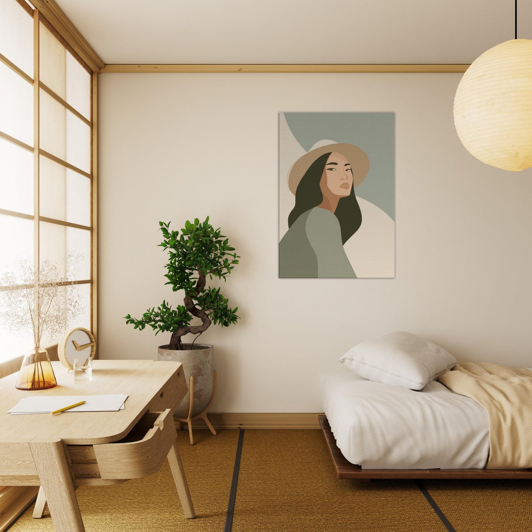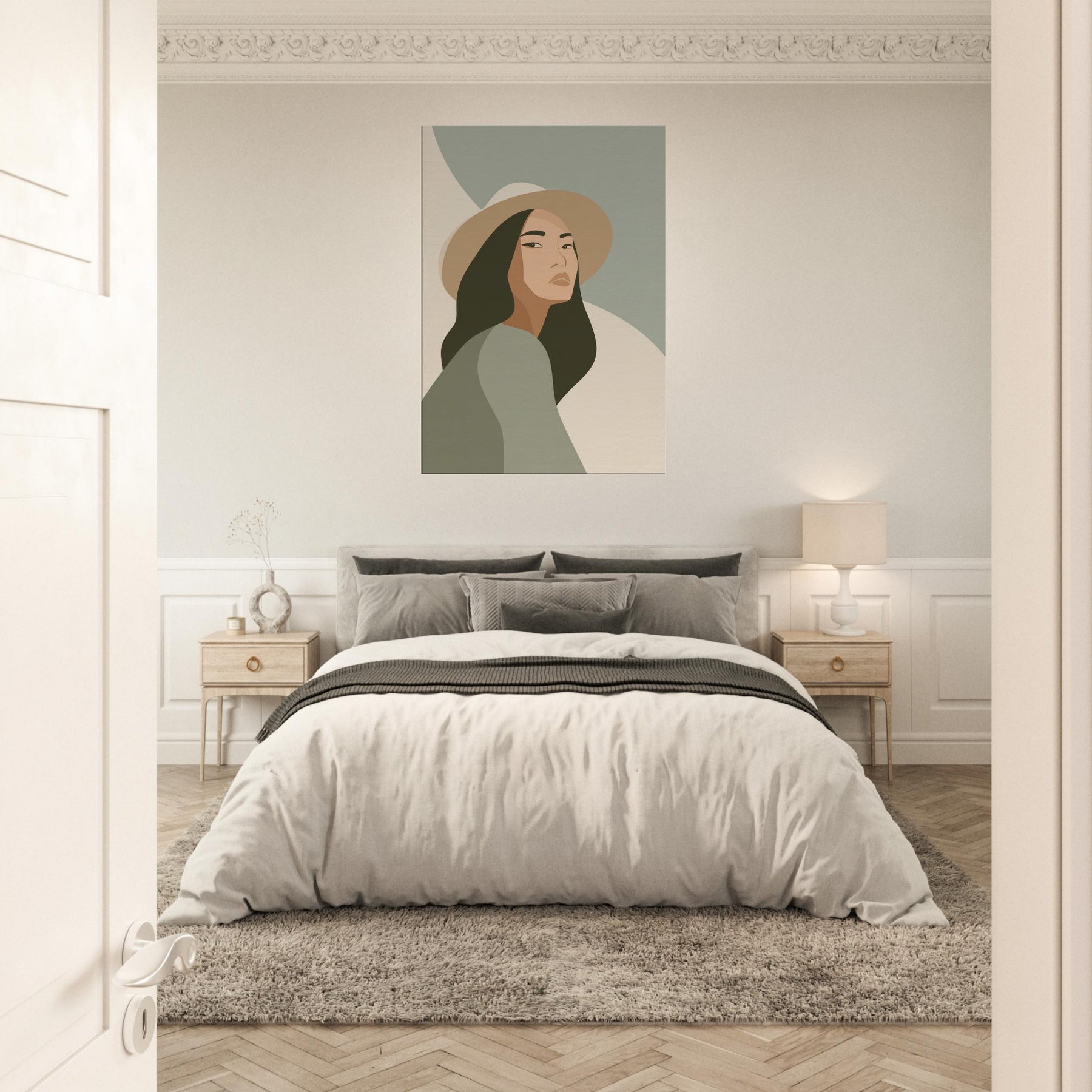 Softly lit and endlessly poised, this minimalist study of the Woman with Hat invites calm into any room. The clean lines and restrained palette glide across the wall, creating a sense of quiet grace that enhances everyday living spaces without shouting for attention. The gaze is contemplative, the hat a gentle silhouette that frames the skin tones and evokes warmth, memory, and possibility. Hang it in a living room or bedroom to soften edges, spark conversation, and invite everyday stillness.