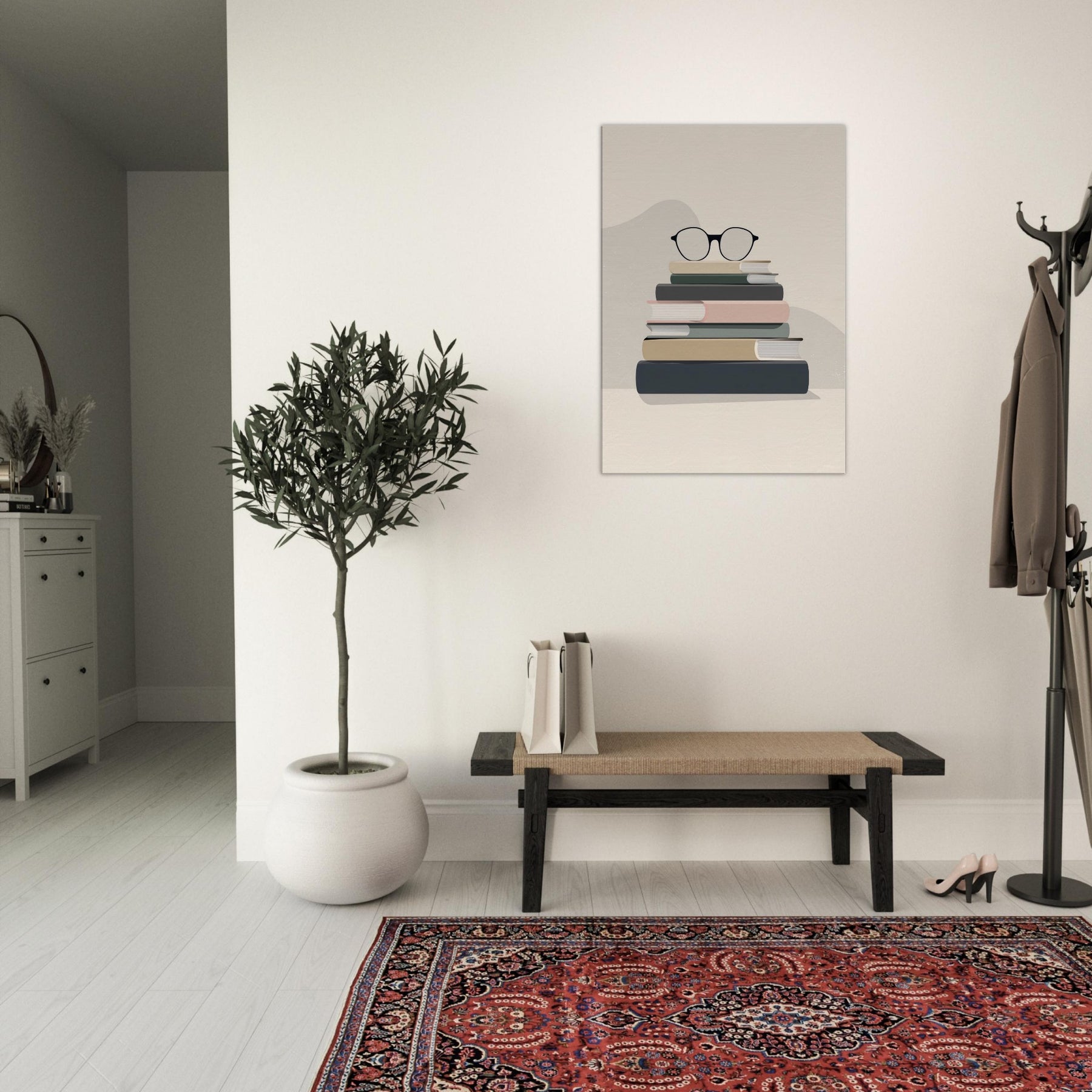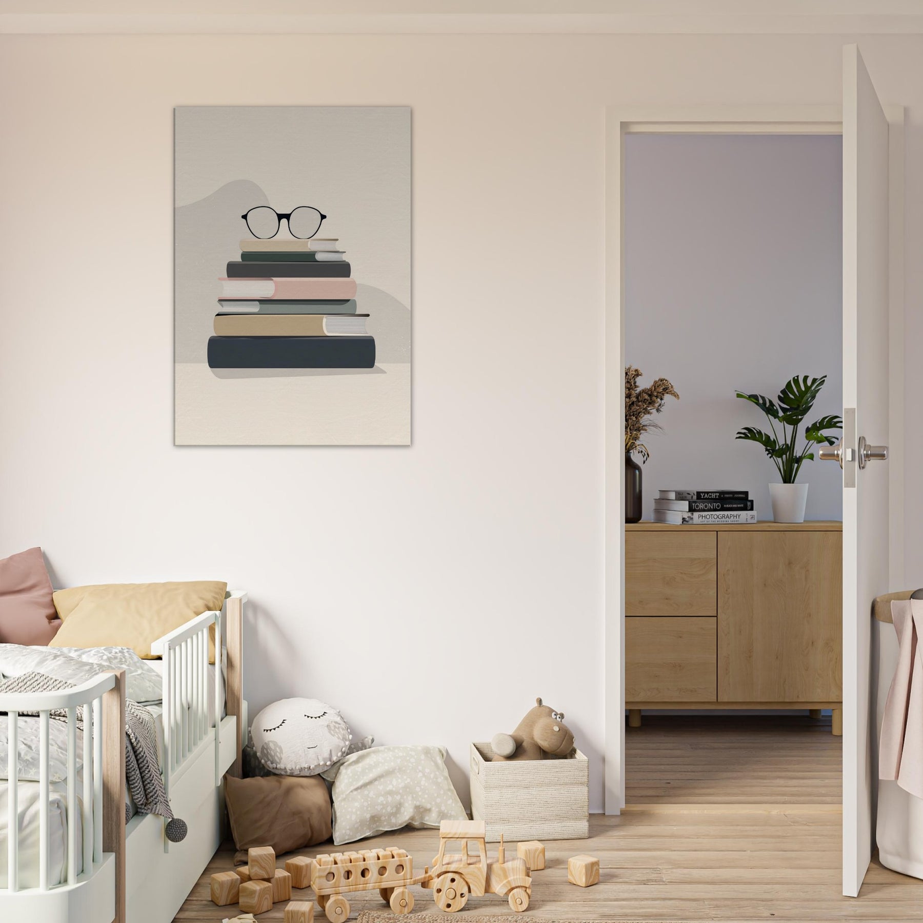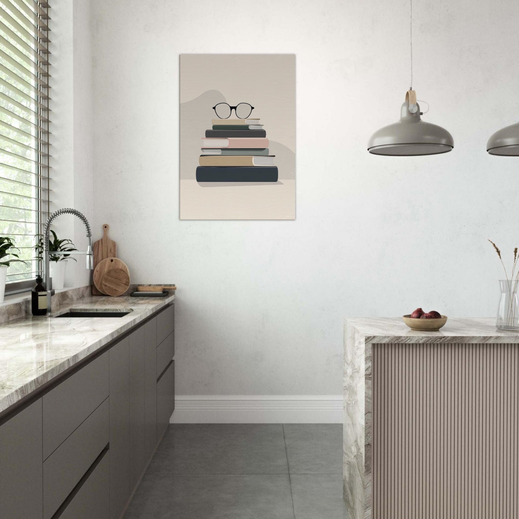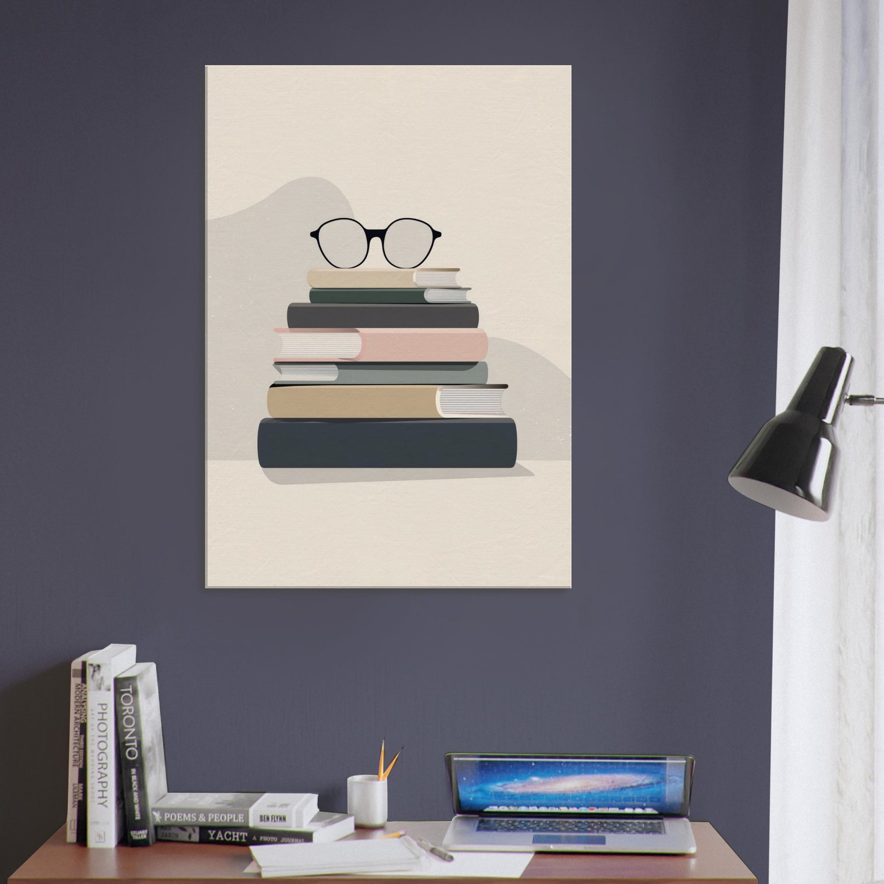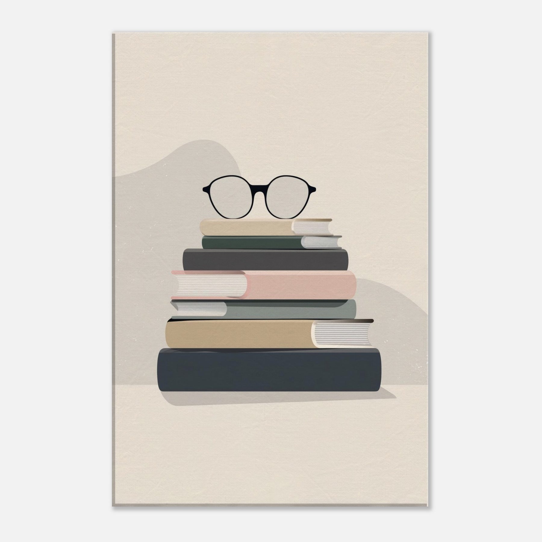 In a quiet breath of neutral tones, this work centers a Book Stack with Glasses, a deliberate pause in a busy room. The clean blocks of color mimic worn covers, and the glasses rest like a thoughtful punctuation mark, inviting contemplation. Minimalist by design, it creates an atmosphere of calm focus, turning a reading nook into a sanctuary of texture and light. Place it above a sofa or workstation to anchor conversations with a gentle, bookish elegance.