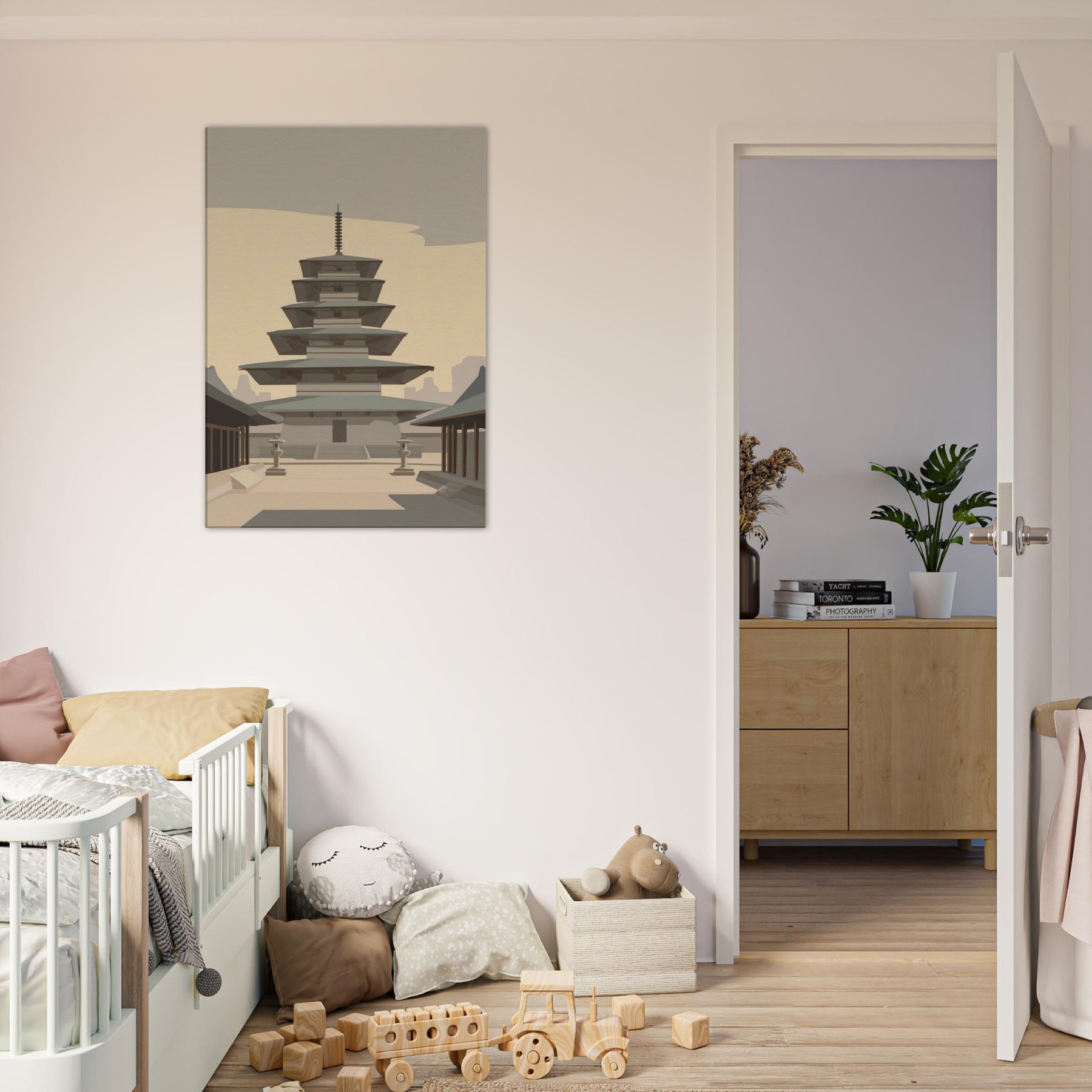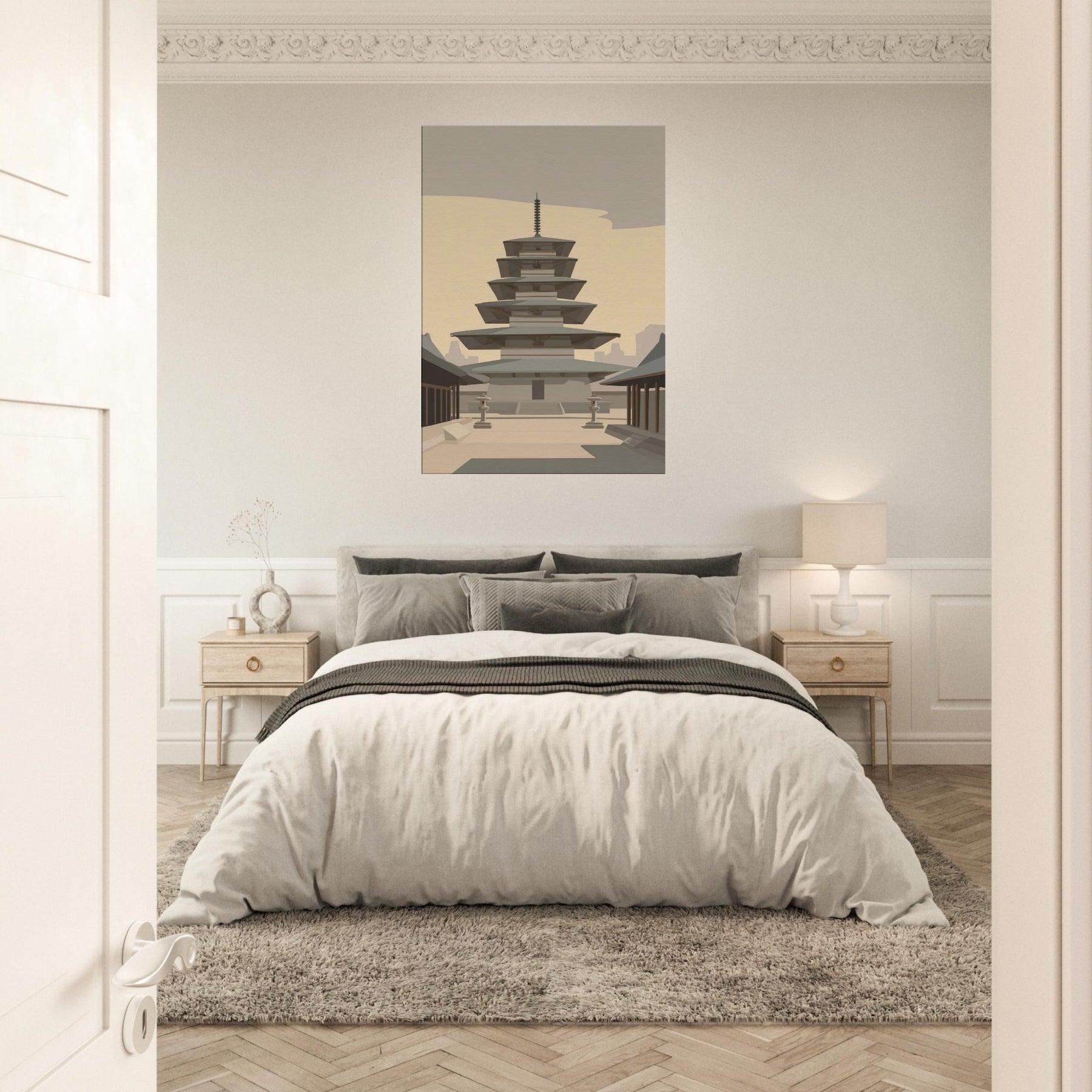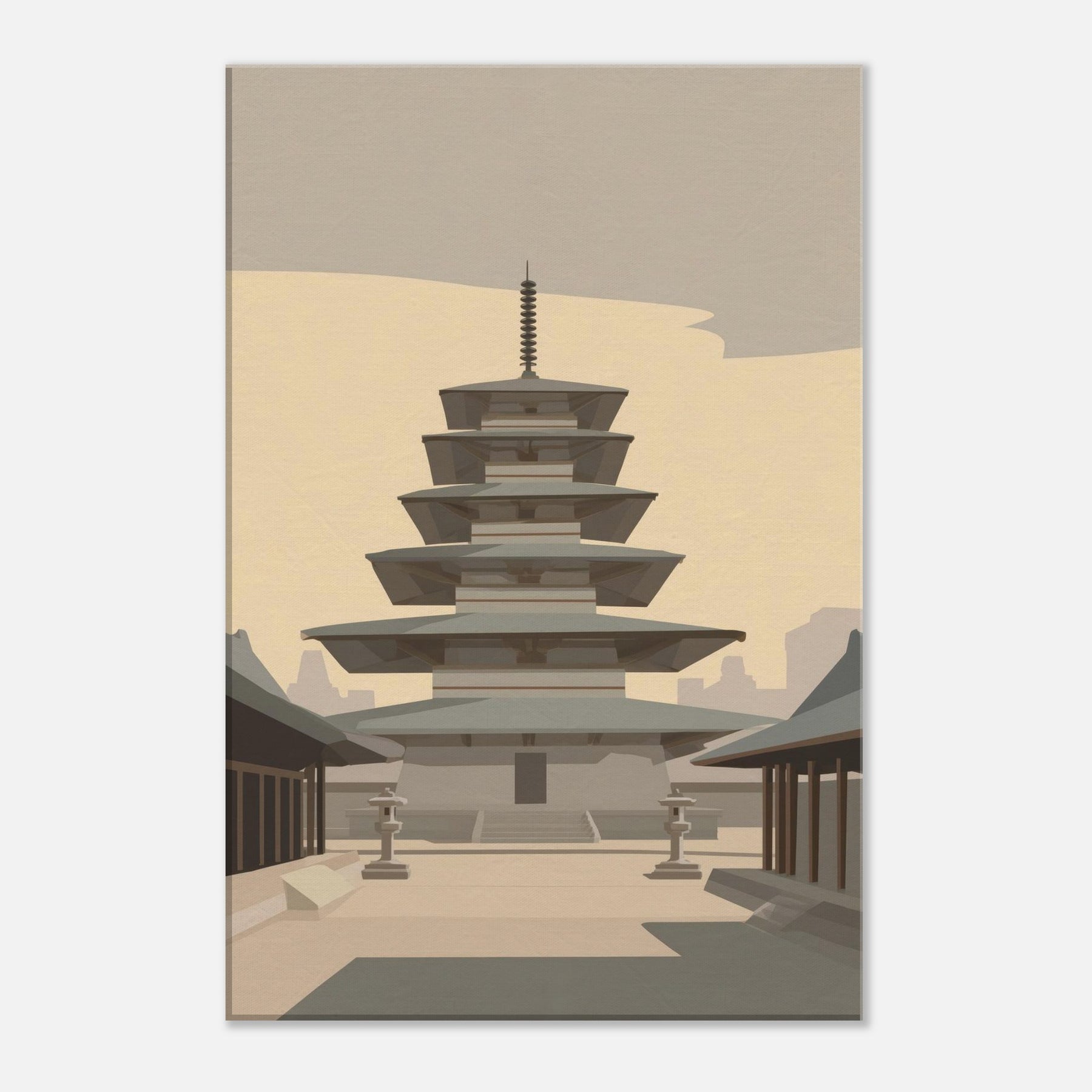 An elegant Pagoda rises in a tranquil cityscape, rendered in soft, sun washed tones. This minimalist composition invites quiet reflection, as each tier unfolds like a step toward morning light. The Pagoda acts as a poised focal point, marrying centuries of architecture with contemporary calm. Surrounding spaces soften into warmth and stillness, making the room feel more expansive. Hang it in a living room or study to foster serenity, balance, and a subtle sense of ascent.