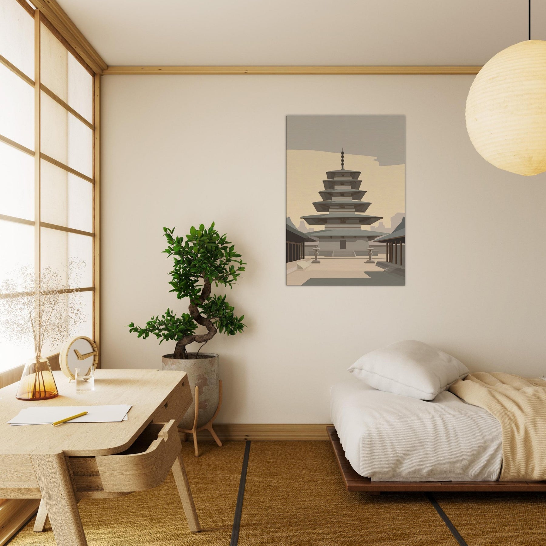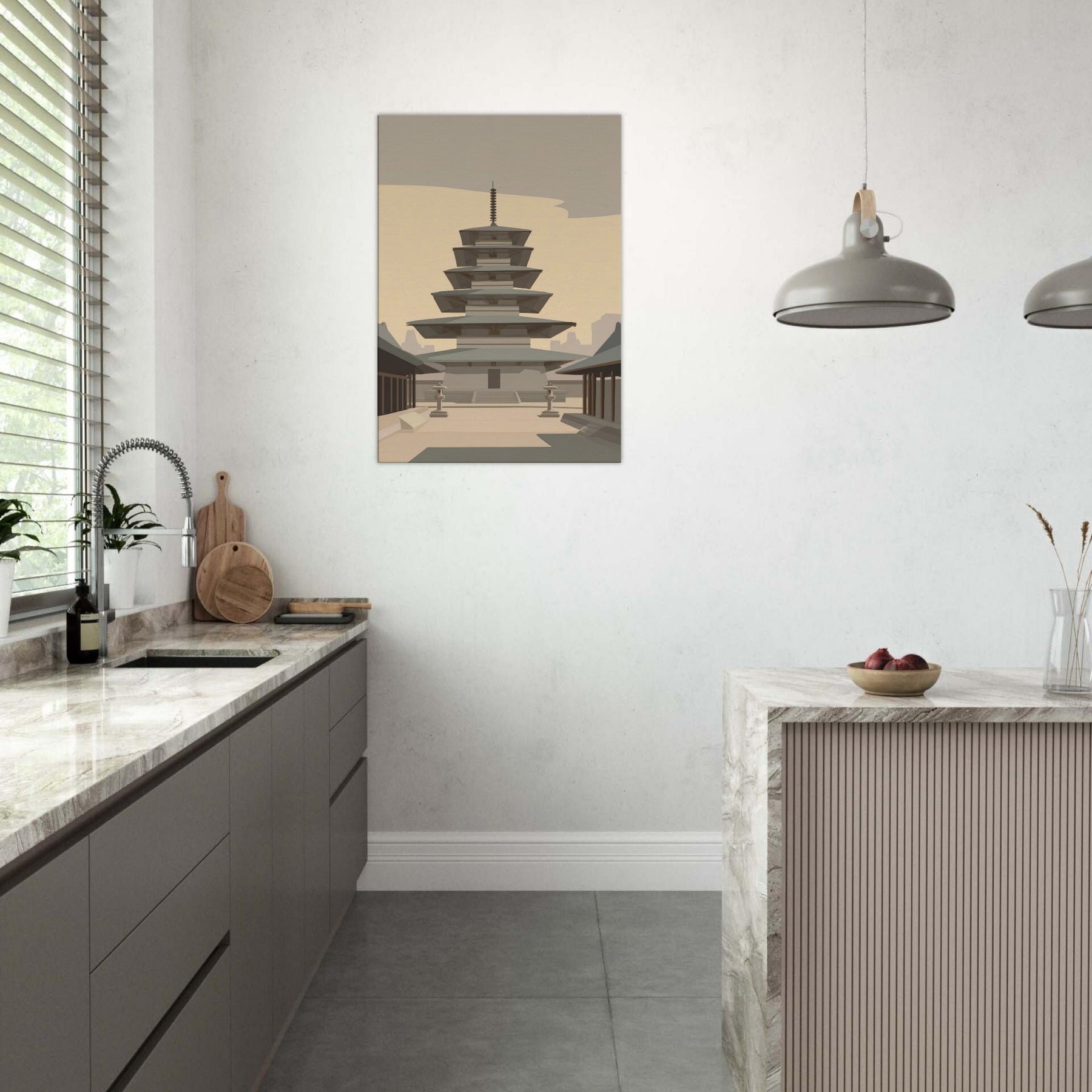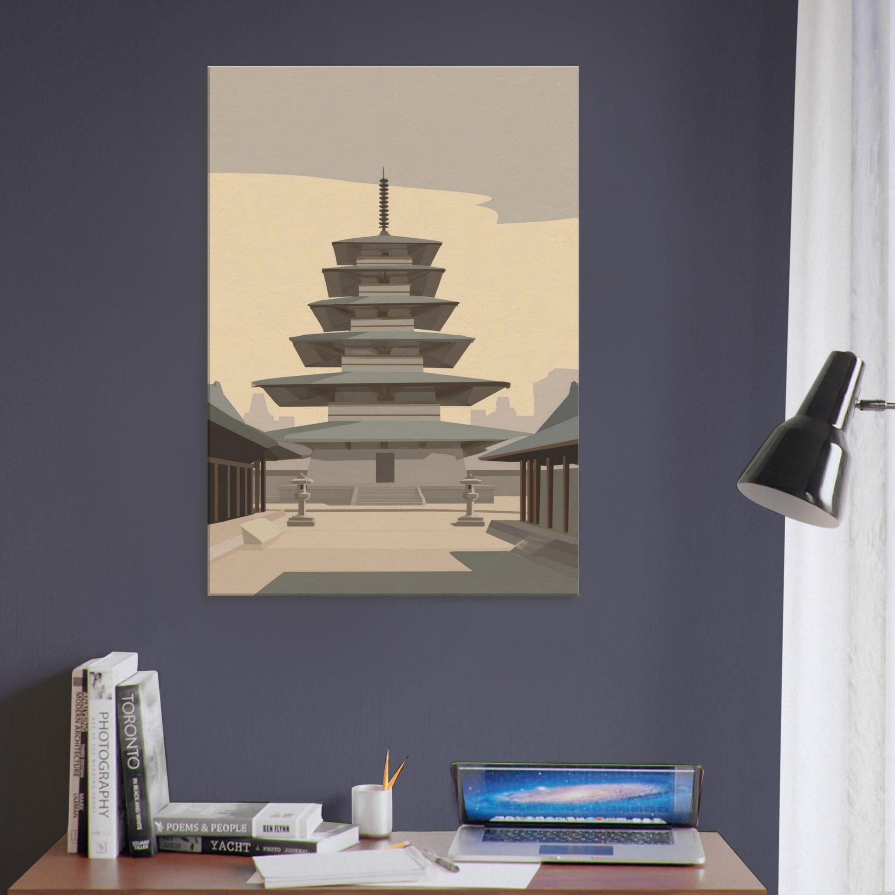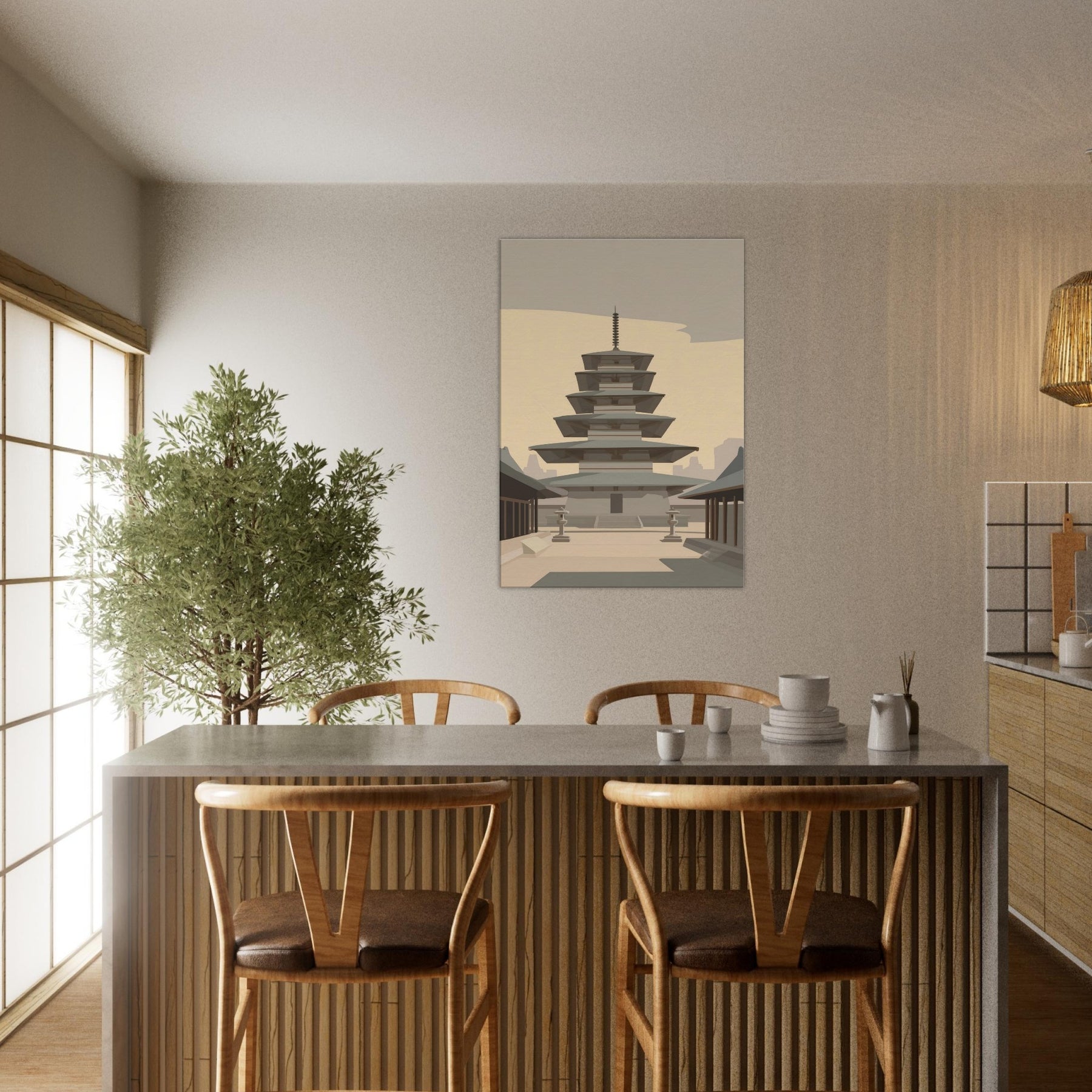 An elegant Pagoda rises in a tranquil cityscape, rendered in soft, sun washed tones. This minimalist composition invites quiet reflection, as each tier unfolds like a step toward morning light. The Pagoda acts as a poised focal point, marrying centuries of architecture with contemporary calm. Surrounding spaces soften into warmth and stillness, making the room feel more expansive. Hang it in a living room or study to foster serenity, balance, and a subtle sense of ascent.