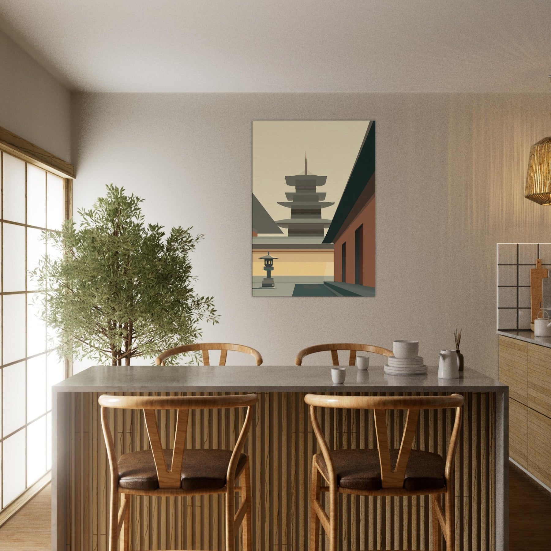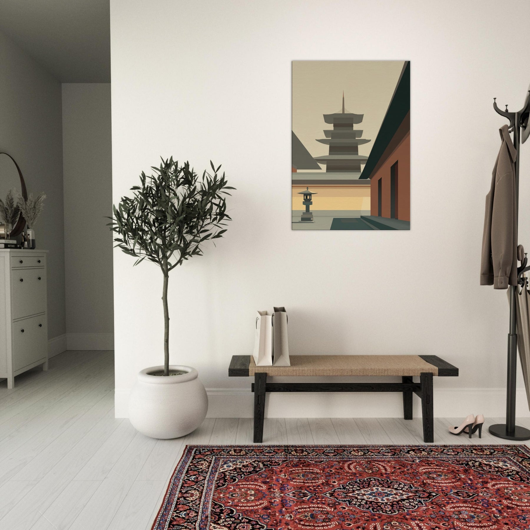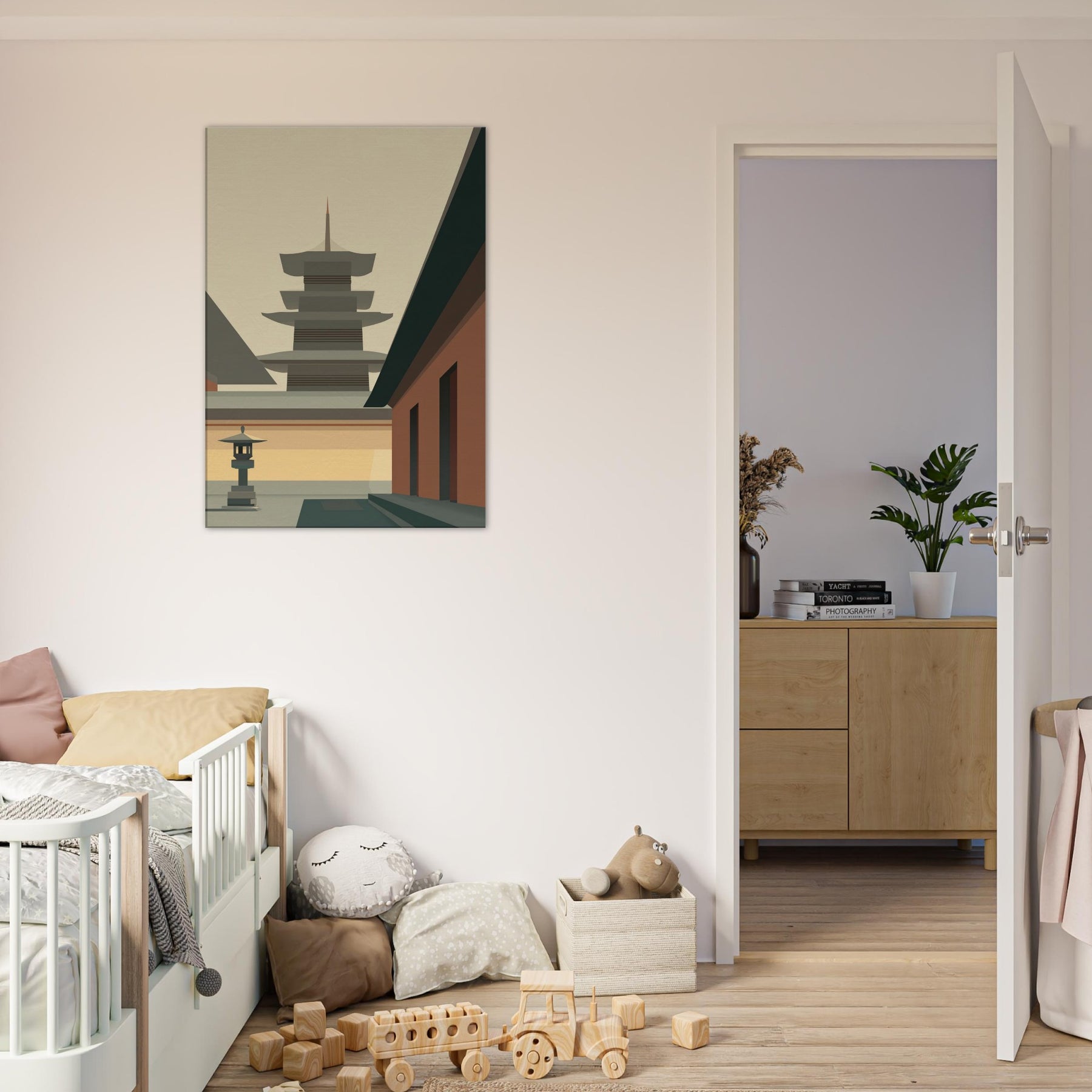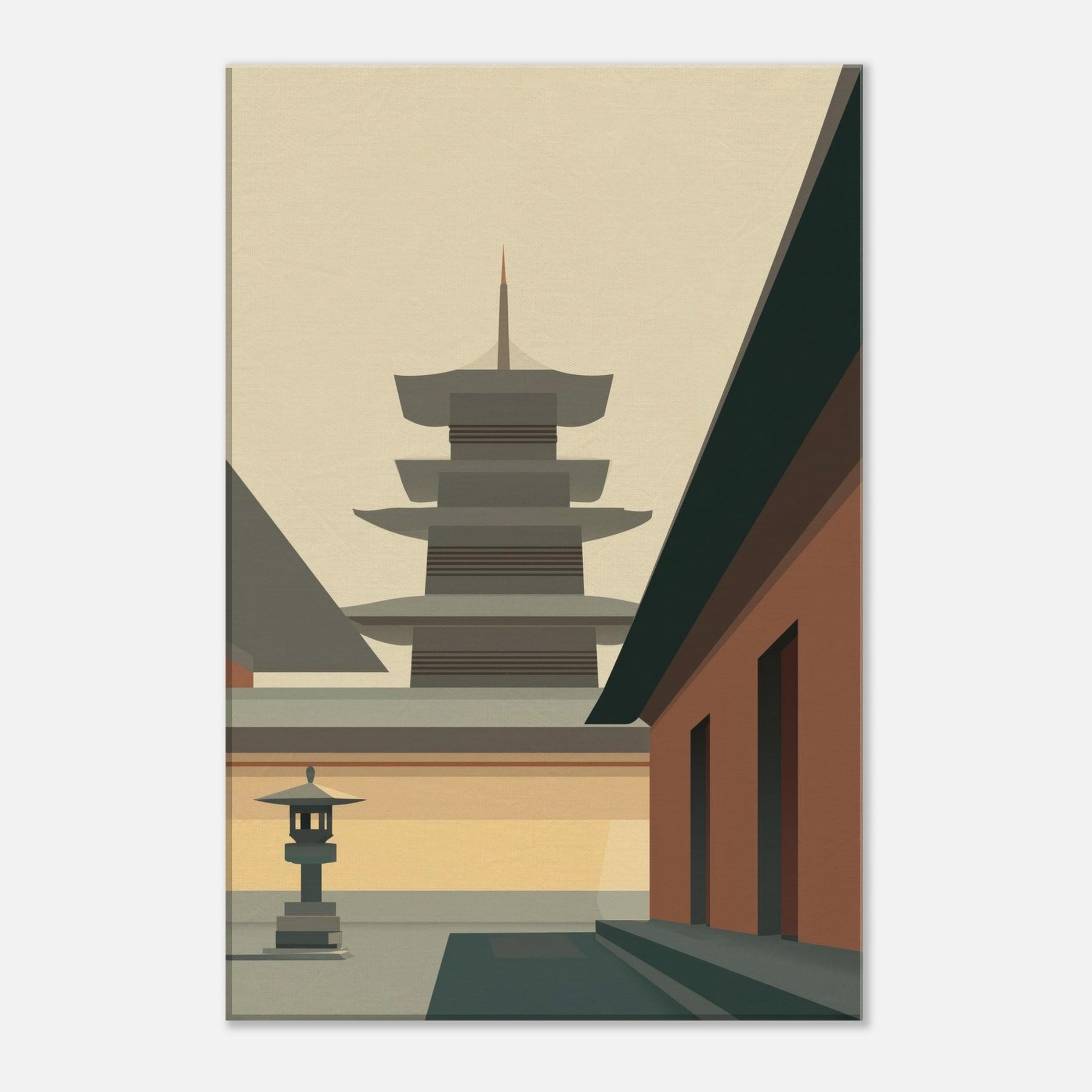 Step into a tranquil courtyard where a towering Pagoda rises in simplified, geometric calm. The restrained palette stone gray, warm sand, and muted greens evokes dusk at a temple, inviting contemplation and balance in your living room. This piece captures the breath between shadow and light, the quiet contemplation of stone and sky. Hang it beside a sofa or in a hallway to create a focal point of serenity, guiding conversation without shouting. It's a reminder that architecture can be a doorway to stillness.