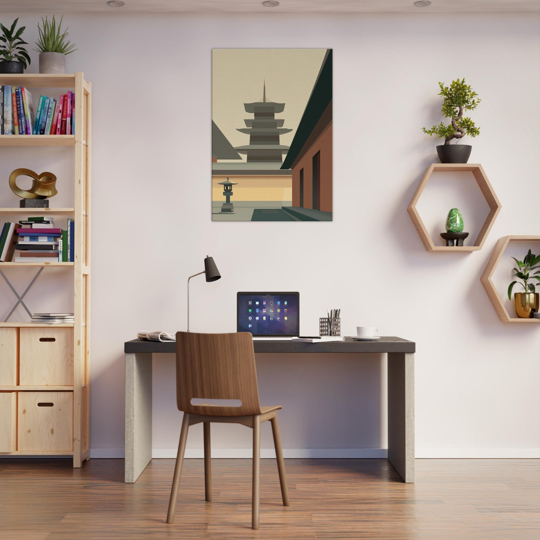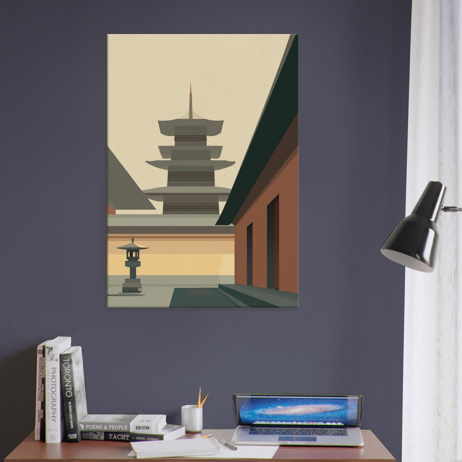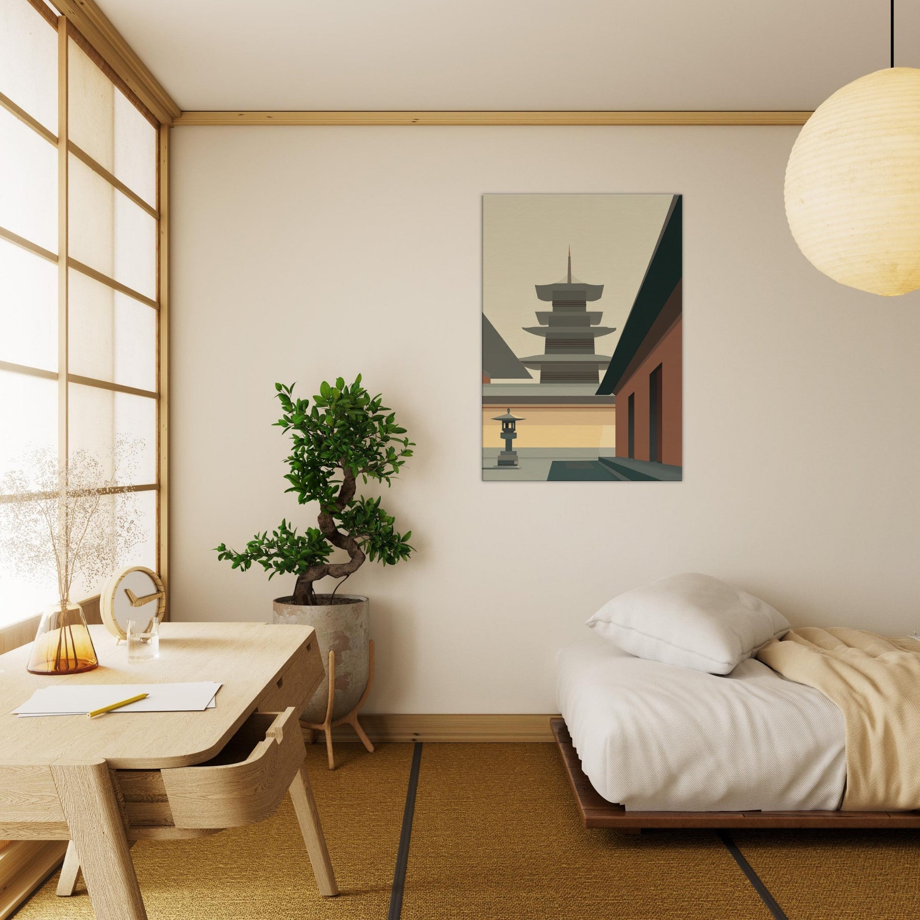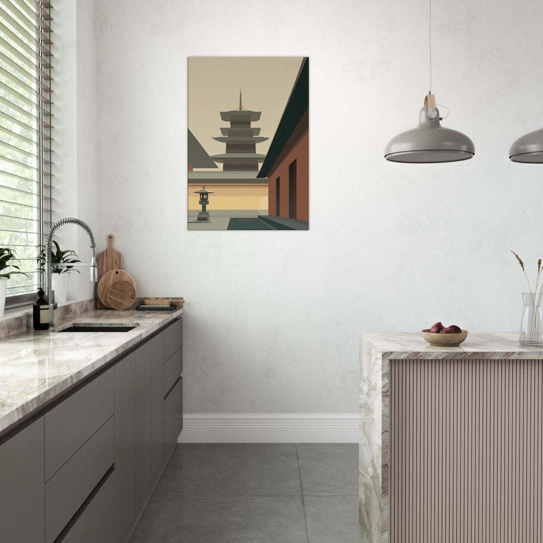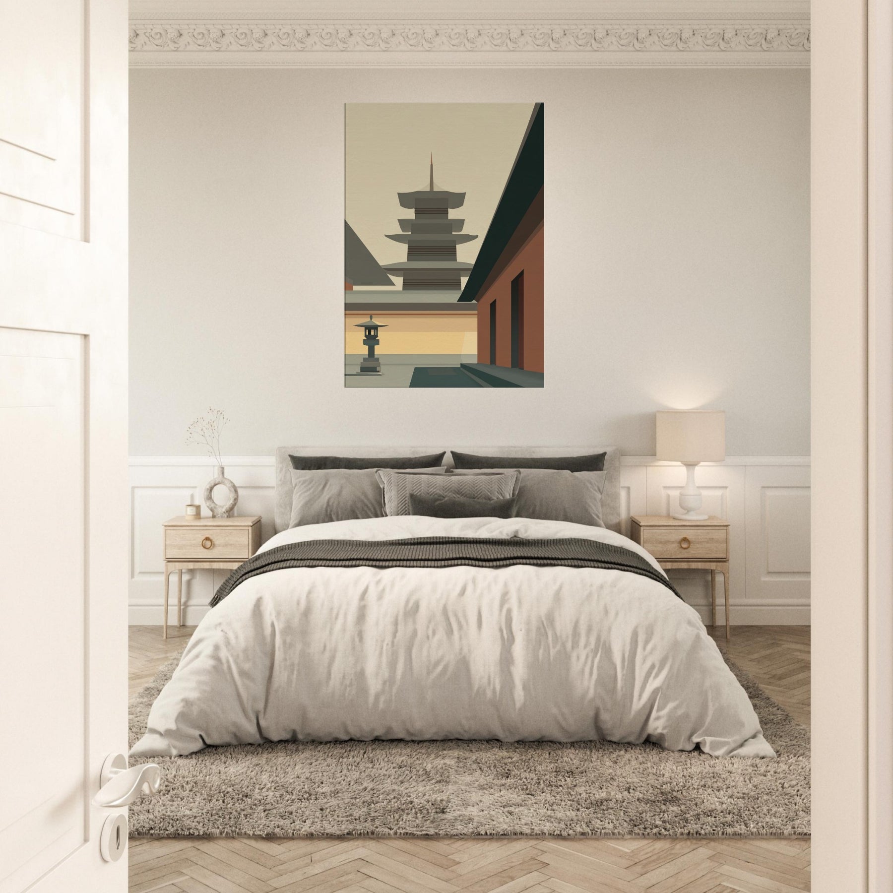 Step into a tranquil courtyard where a towering Pagoda rises in simplified, geometric calm. The restrained palette stone gray, warm sand, and muted greens evokes dusk at a temple, inviting contemplation and balance in your living room. This piece captures the breath between shadow and light, the quiet contemplation of stone and sky. Hang it beside a sofa or in a hallway to create a focal point of serenity, guiding conversation without shouting. It's a reminder that architecture can be a doorway to stillness.