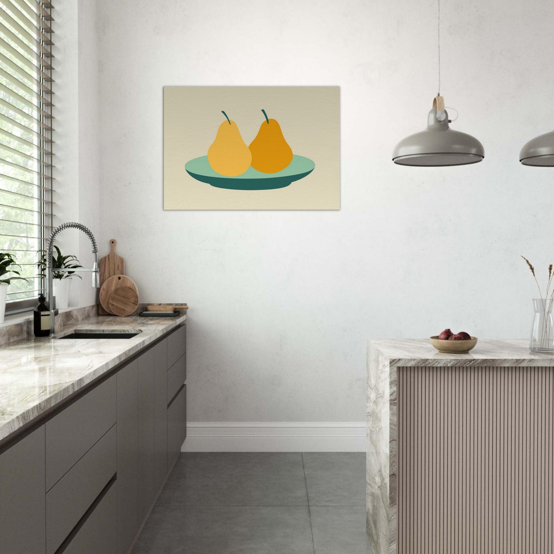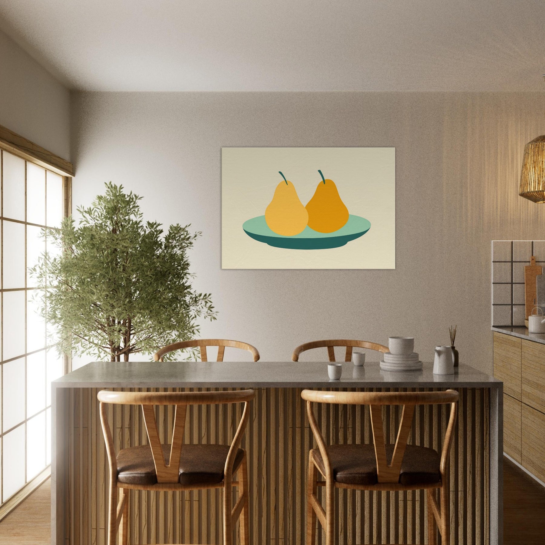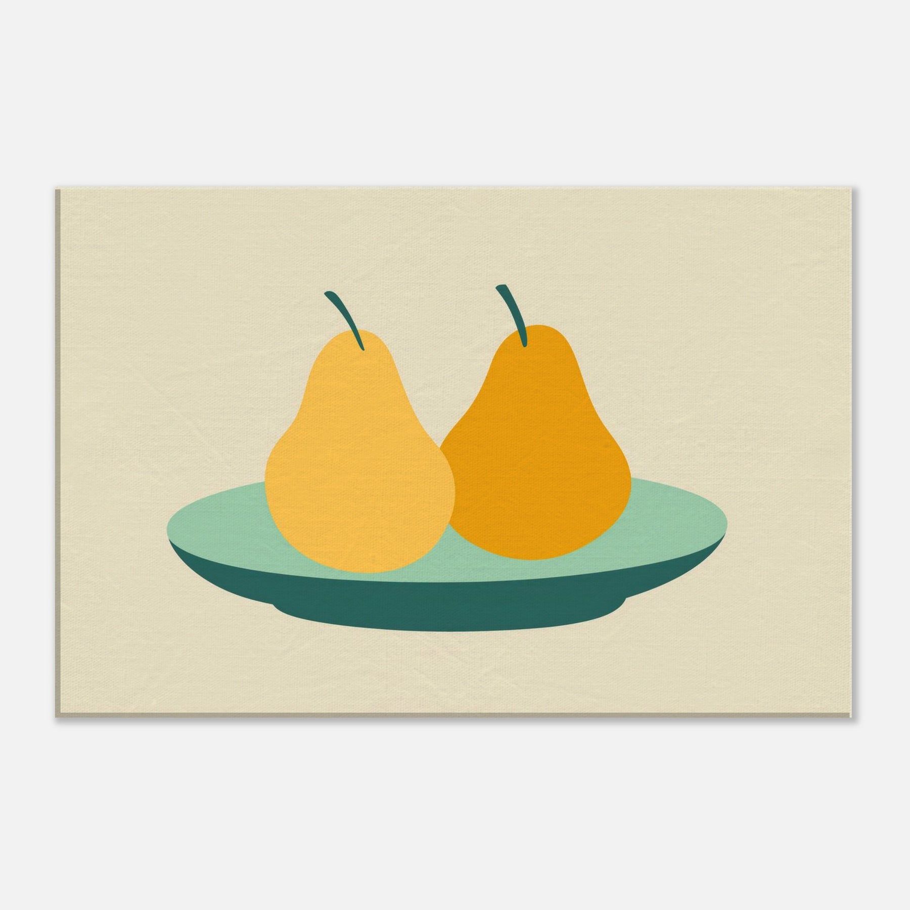 Let this minimalist still life wash your room in quiet warmth. The Primary Subject Pears on Plate appears as serene, sun kissed silhouettes, pairing soft ochres with a cool, sea green plate. The restrained palette and generous negative space invite slow, lingering moments, turning a wall into a gentle table of memory. Perfect for a kitchen nook or living area, it suggests everyday abundance without clutter, inviting conversation and a calm, centering energy into your space.