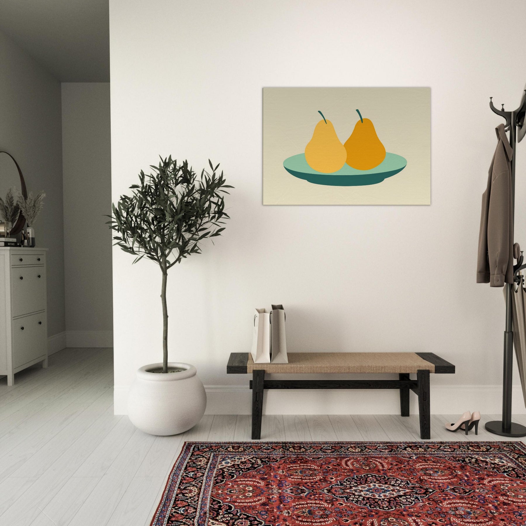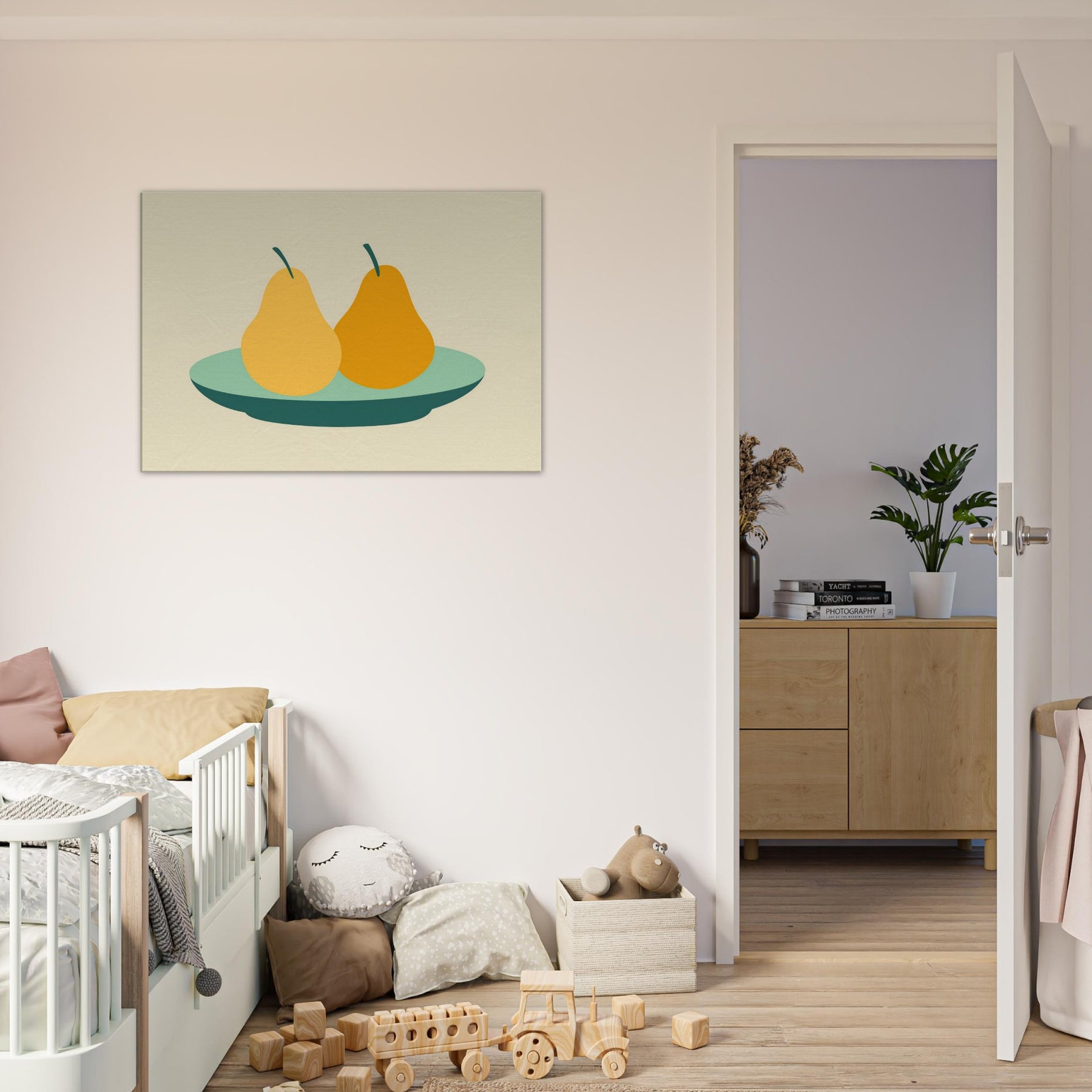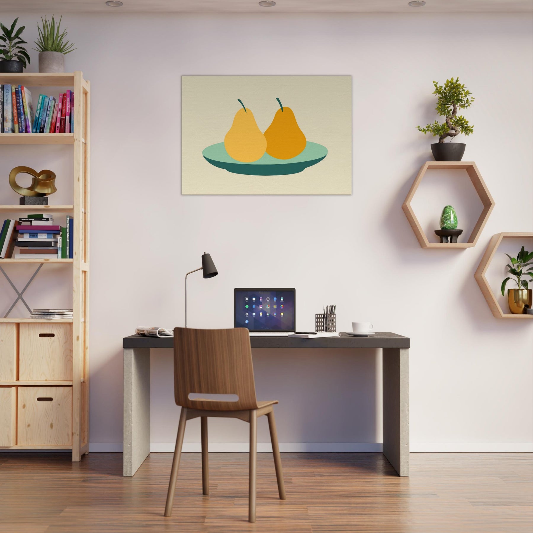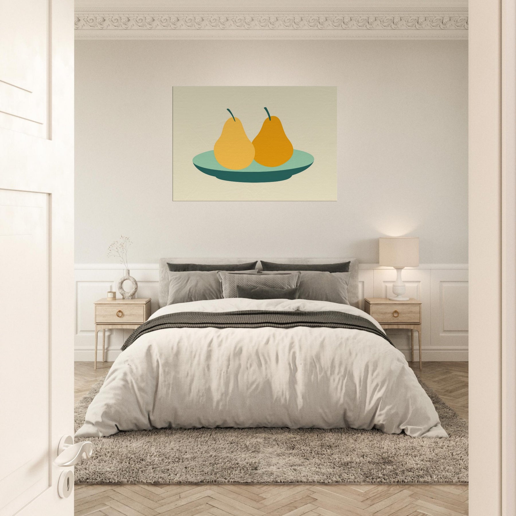 Let this minimalist still life wash your room in quiet warmth. The Primary Subject Pears on Plate appears as serene, sun kissed silhouettes, pairing soft ochres with a cool, sea green plate. The restrained palette and generous negative space invite slow, lingering moments, turning a wall into a gentle table of memory. Perfect for a kitchen nook or living area, it suggests everyday abundance without clutter, inviting conversation and a calm, centering energy into your space.