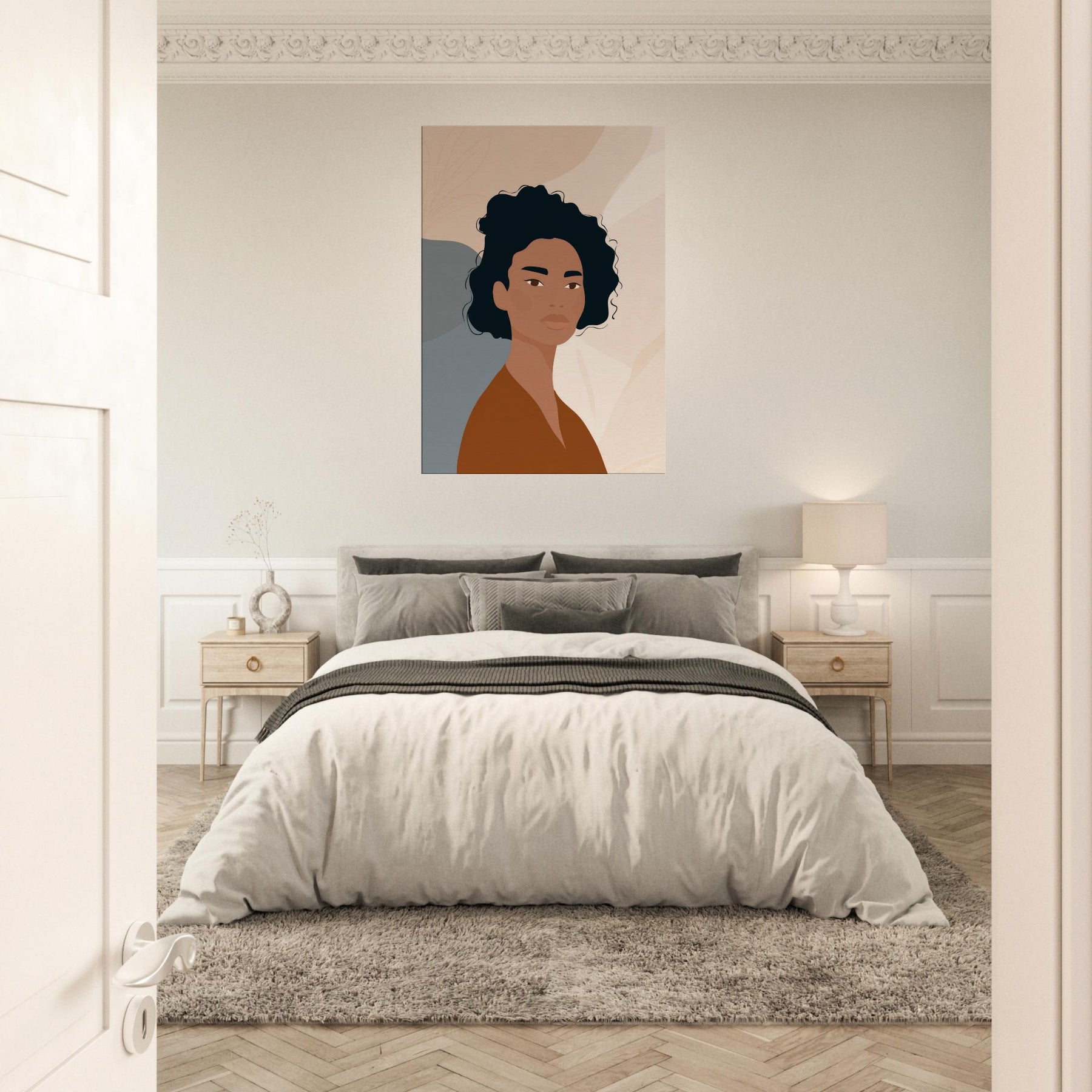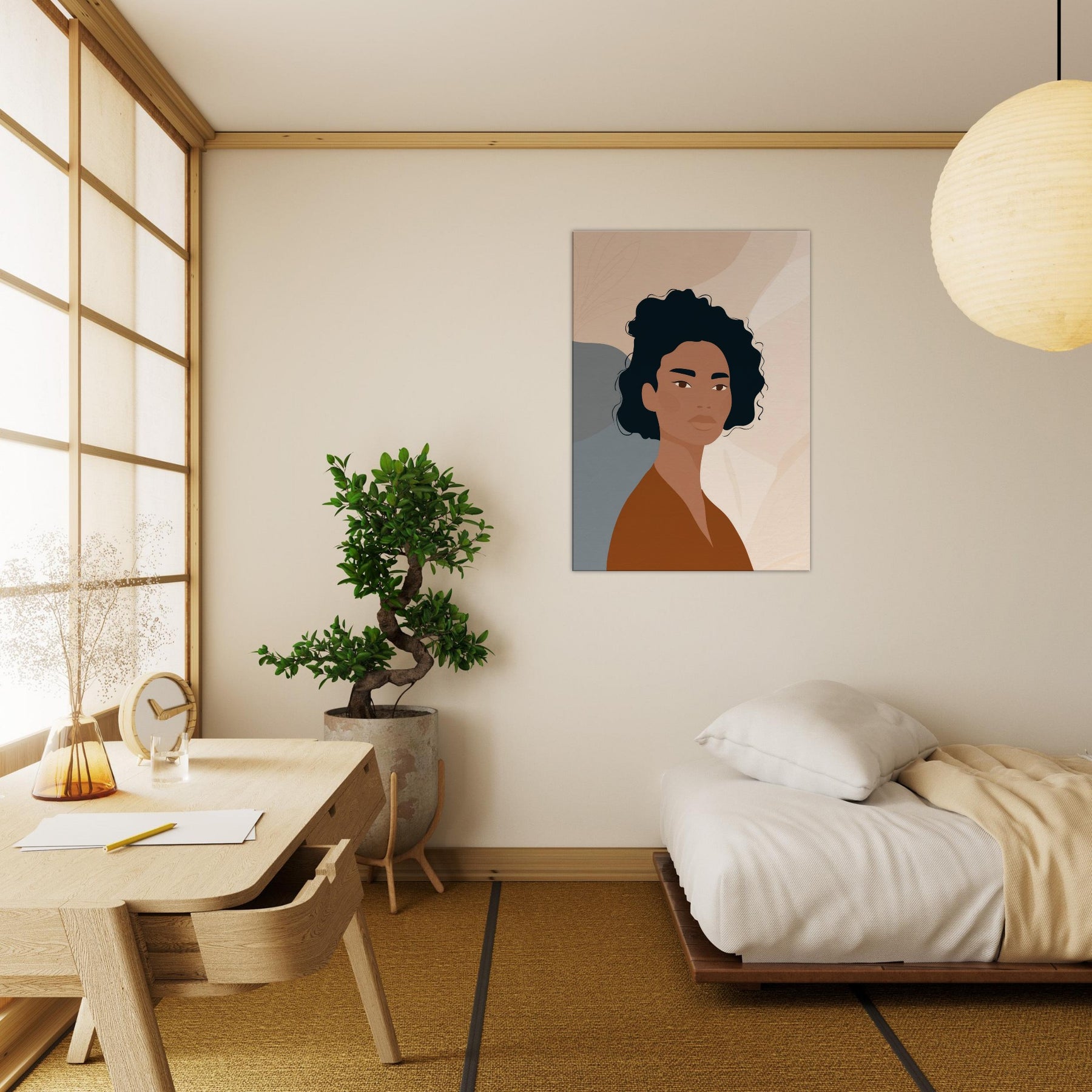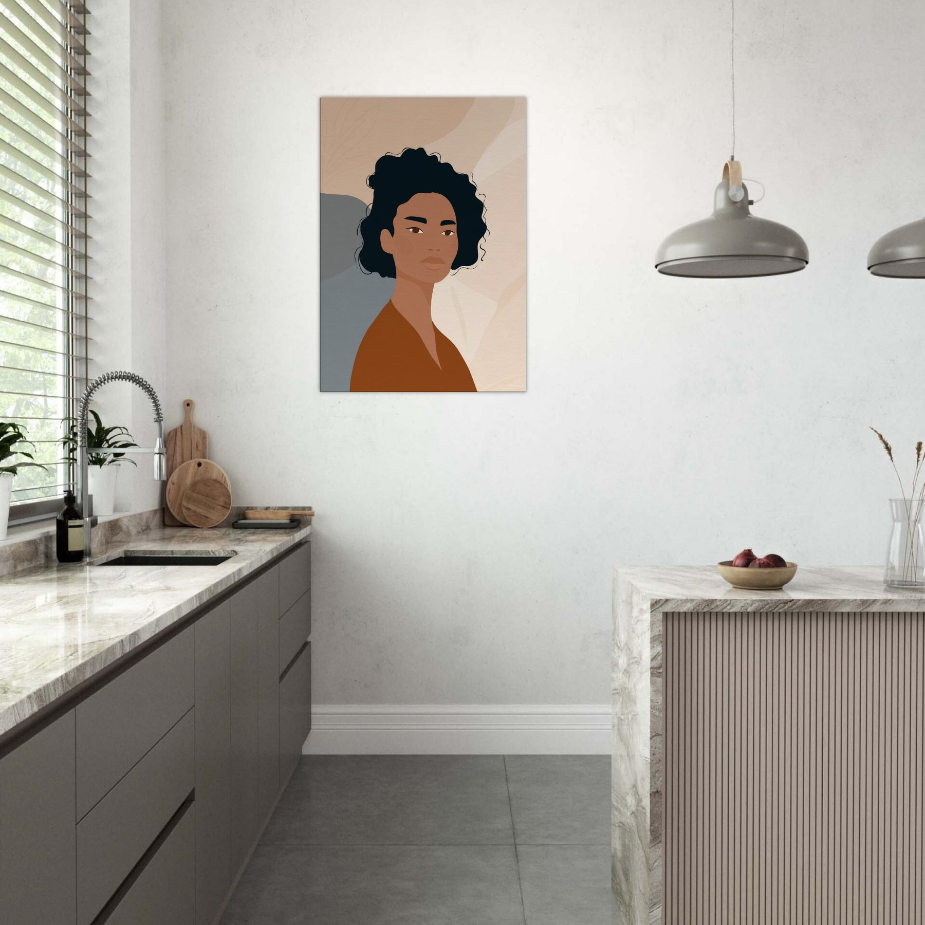 This African Woman , rendered in quiet, confident tones, embodies a moment of poised calm through minimalist lines. Warm browns meet soft neutrals, while precise, subtle contrasts let light play across the face and neck. It softens a space with dignity and grace, turning a plain wall into a contemplative moment ideal above a sofa, in a bedroom nook, or beside a console. The restrained composition invites slow breathing and reflection, making everyday living feel more generous and centered.