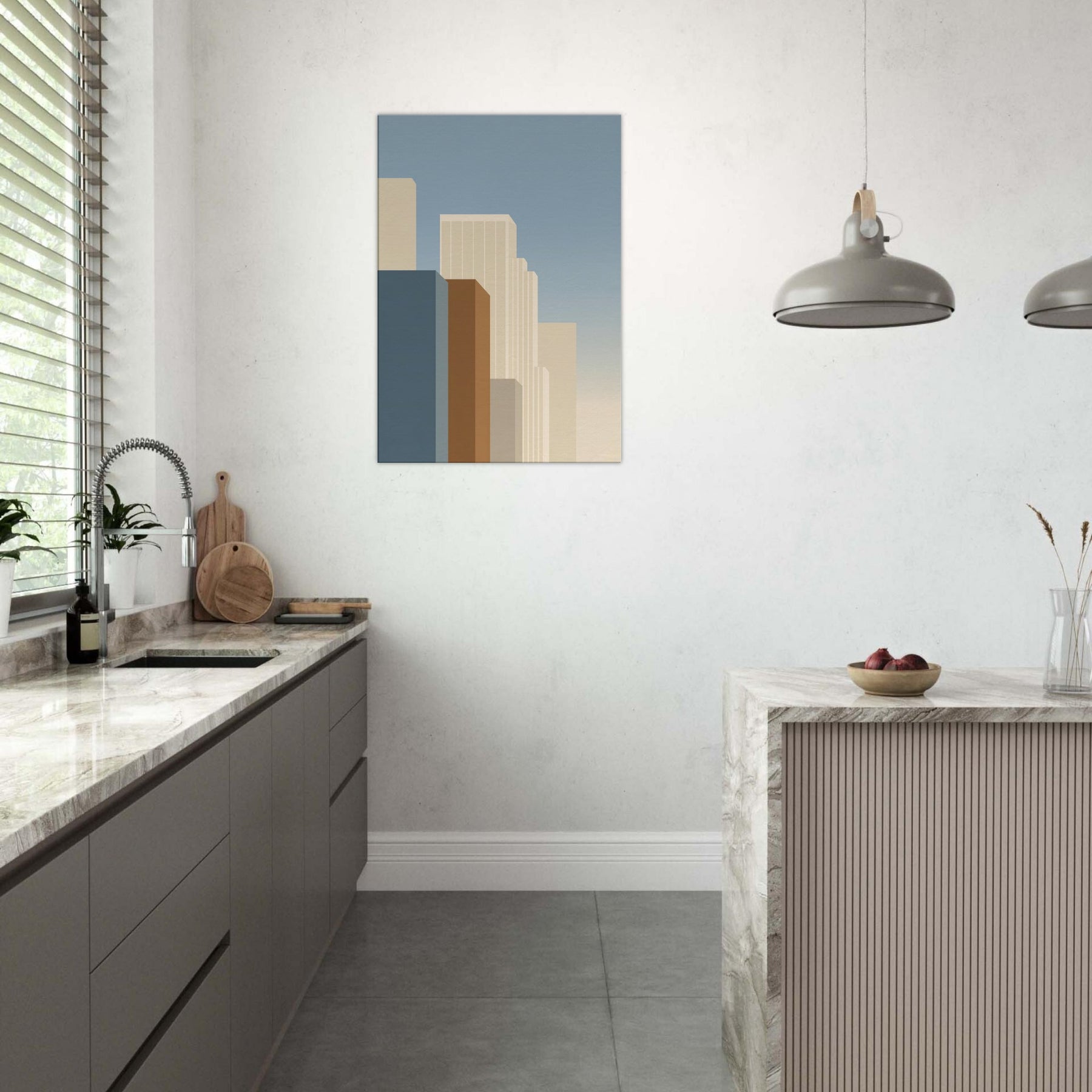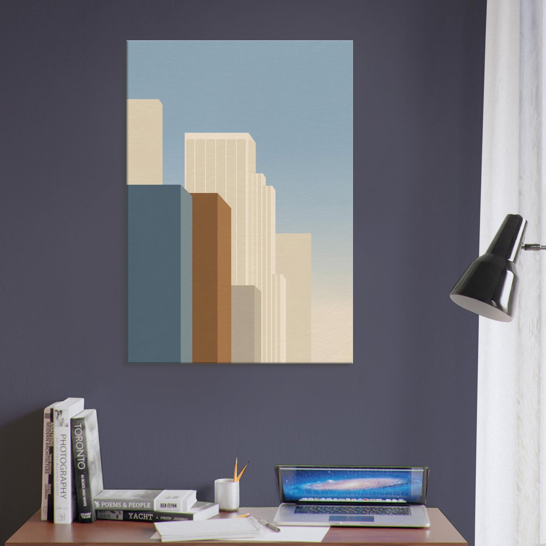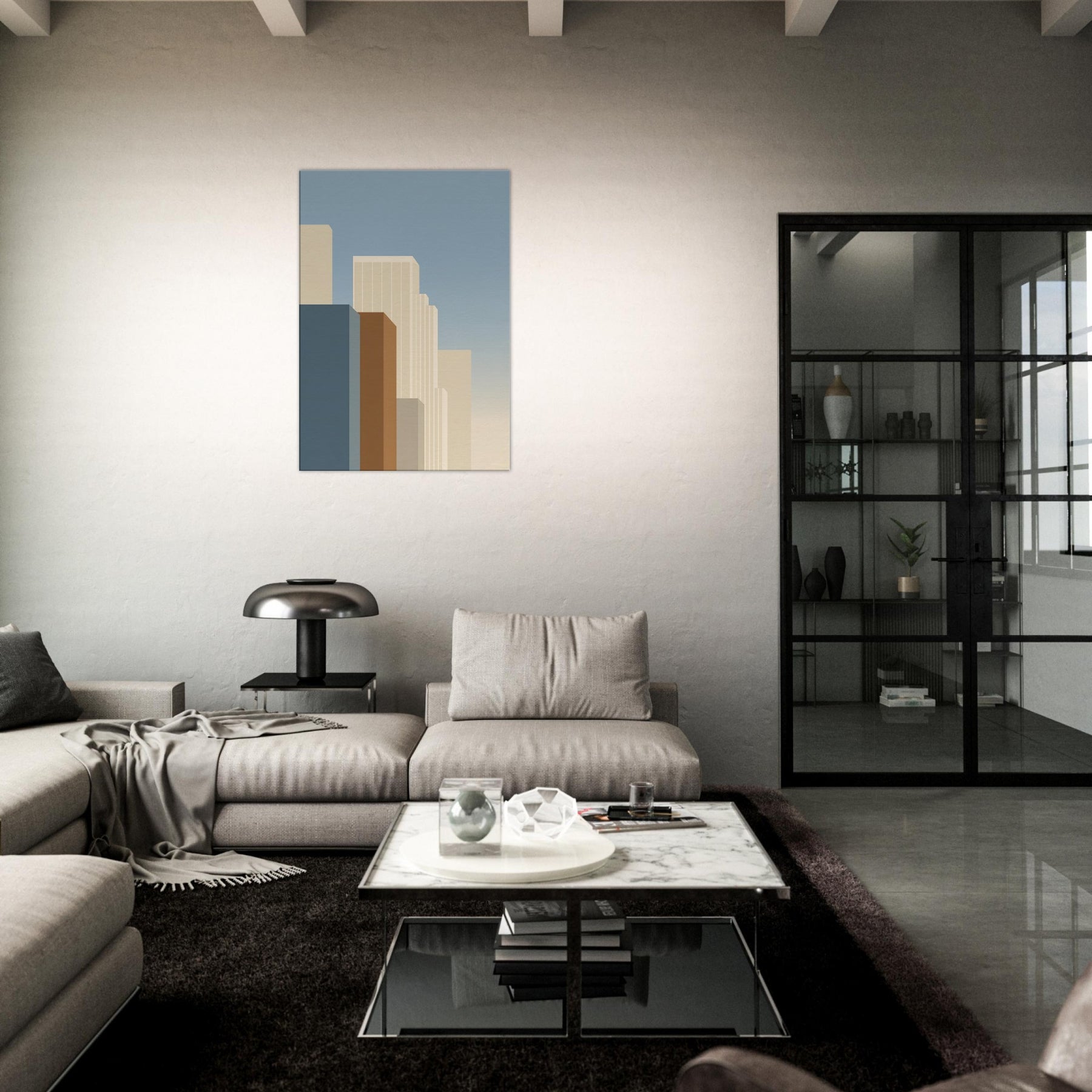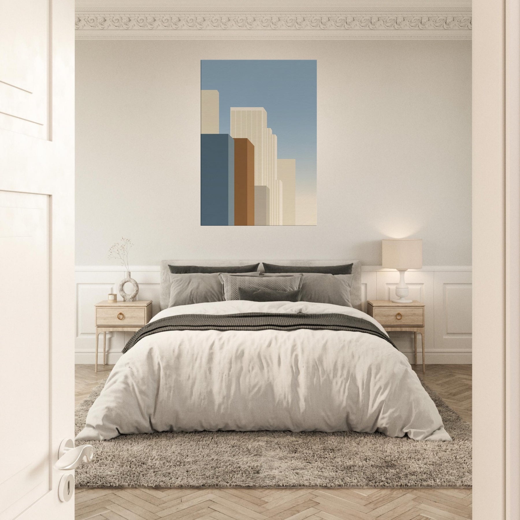 New York ascends in a serene, architectural hush. This minimalist cityscape dissolves the bustle into clean blocks of color and quiet lines, inviting the eye to drift along a sunrise gradient skyline. The gentle verticals feel like breath in a spacious room, offering balance and focus without overpowering. Hang it where you seek calm above a sofa, in a study, or a hallway nook and let the restrained glow, soft shadows, and refined geometry nurture moments of contemplative stillness.