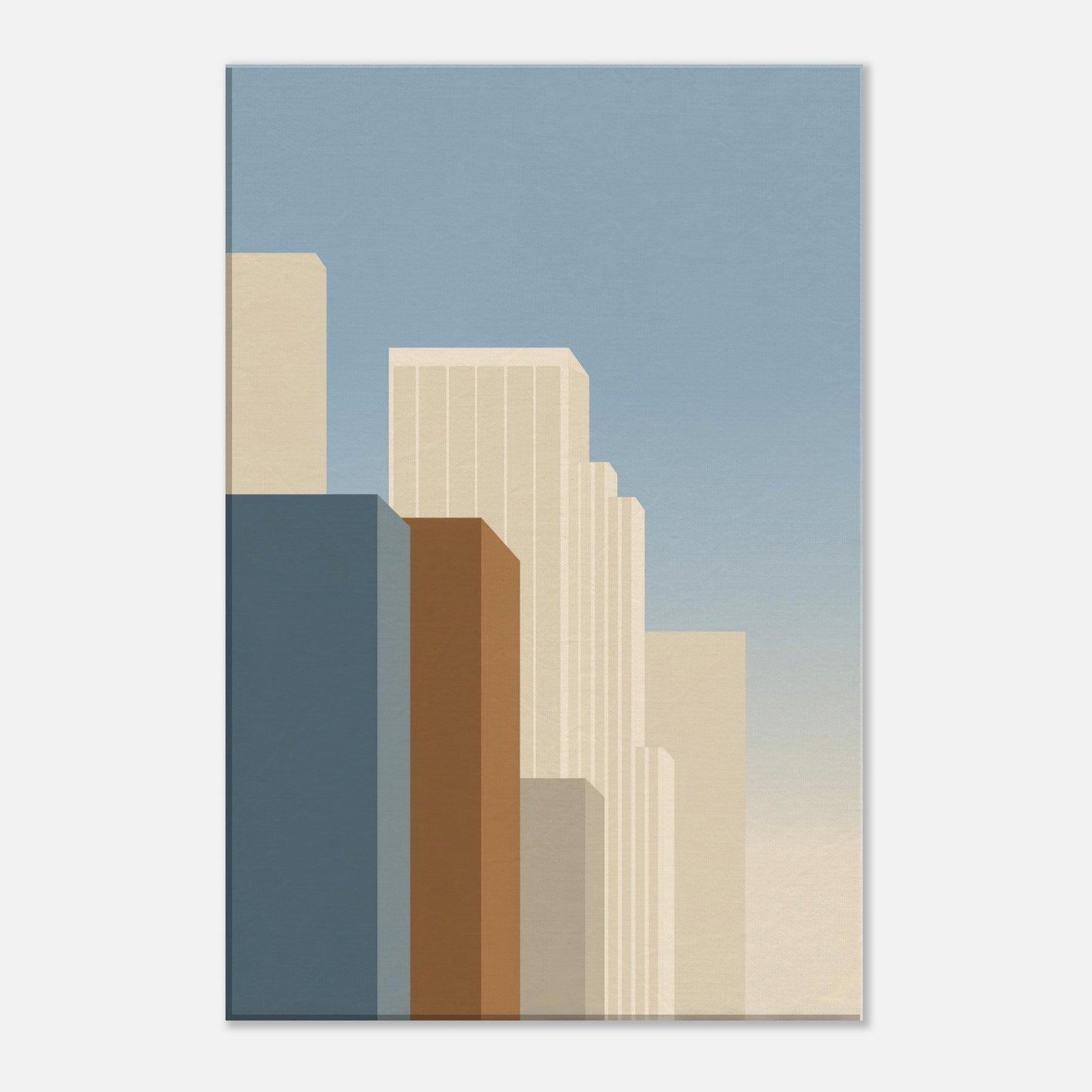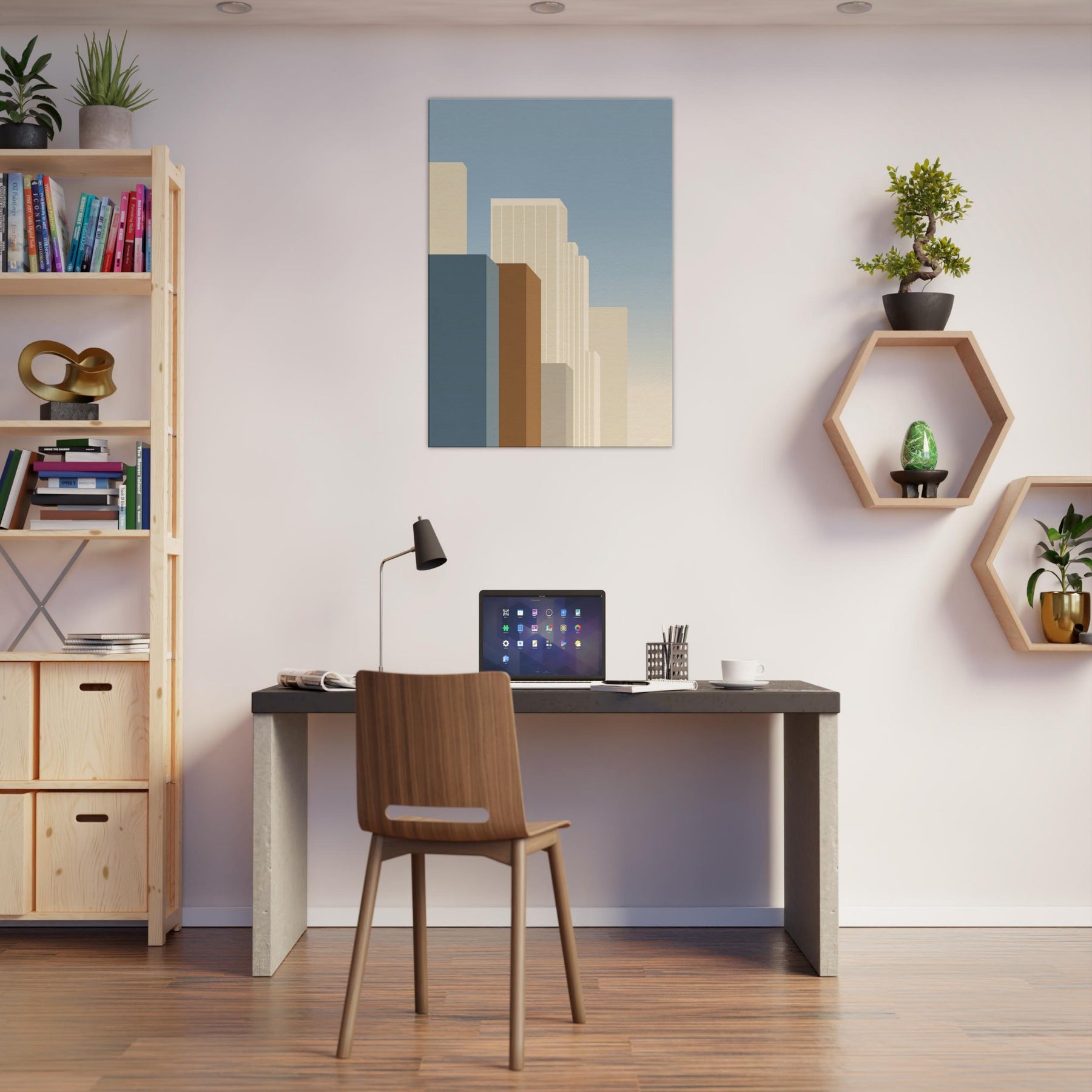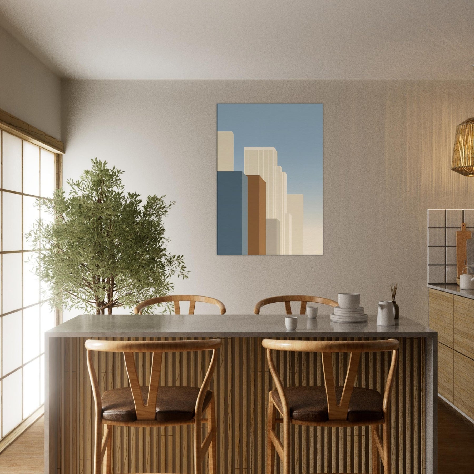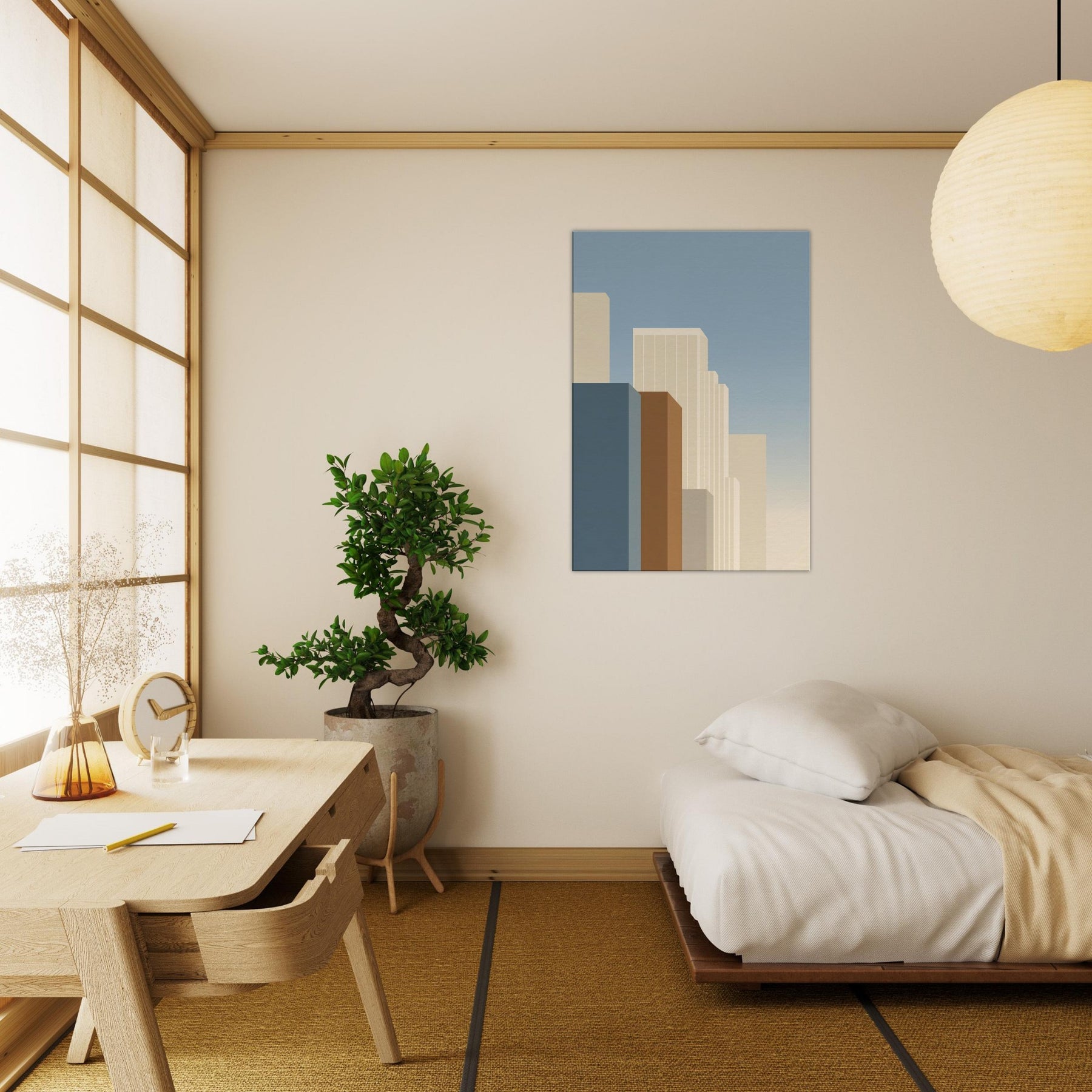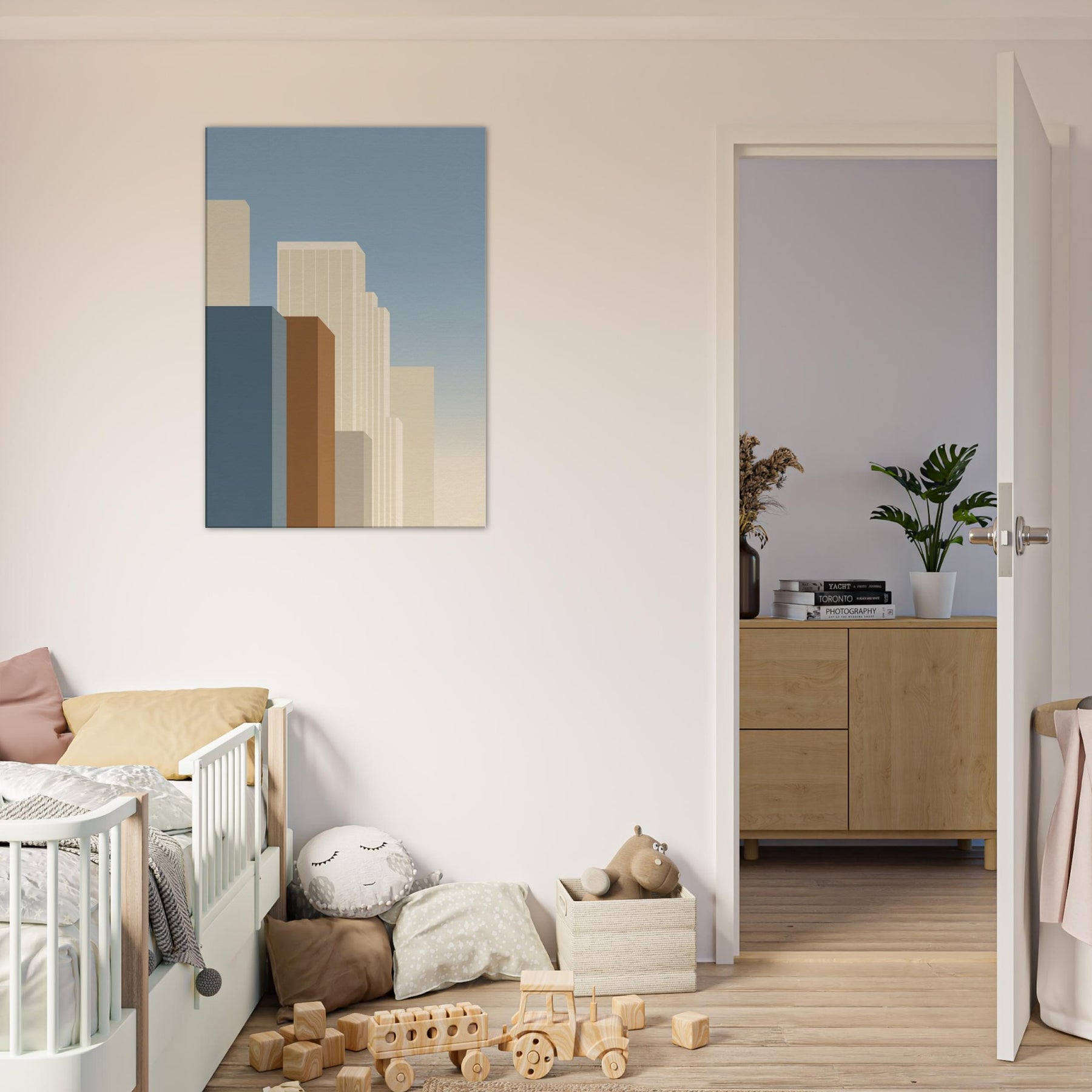New York ascends in a serene, architectural hush. This minimalist cityscape dissolves the bustle into clean blocks of color and quiet lines, inviting the eye to drift along a sunrise gradient skyline. The gentle verticals feel like breath in a spacious room, offering balance and focus without overpowering. Hang it where you seek calm above a sofa, in a study, or a hallway nook and let the restrained glow, soft shadows, and refined geometry nurture moments of contemplative stillness.