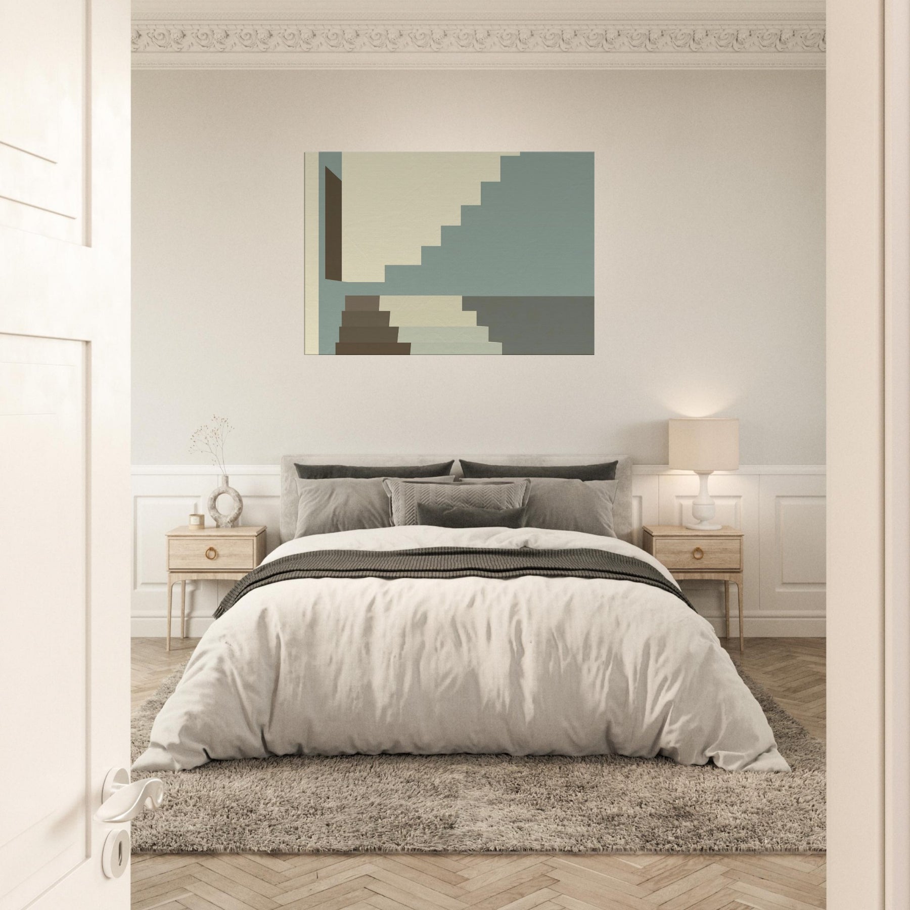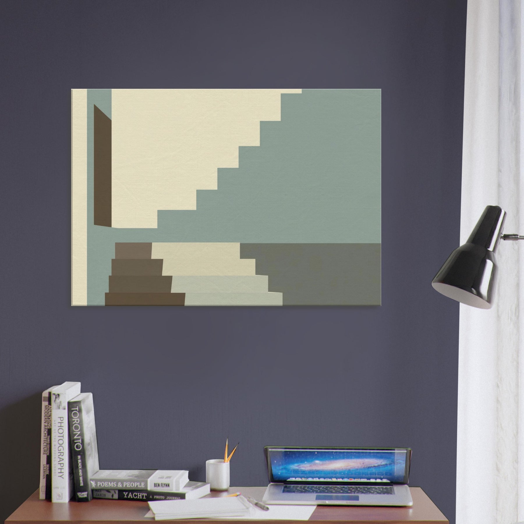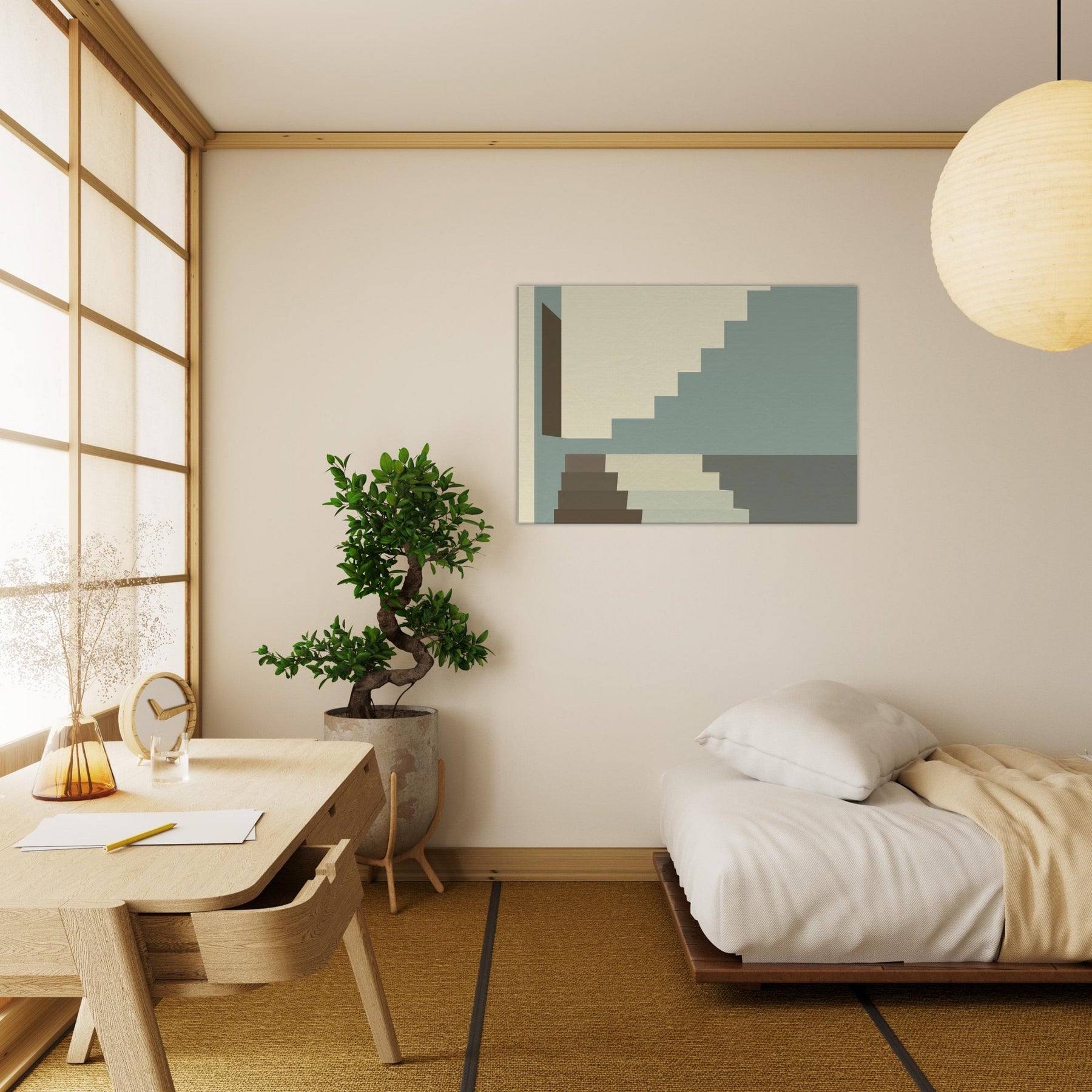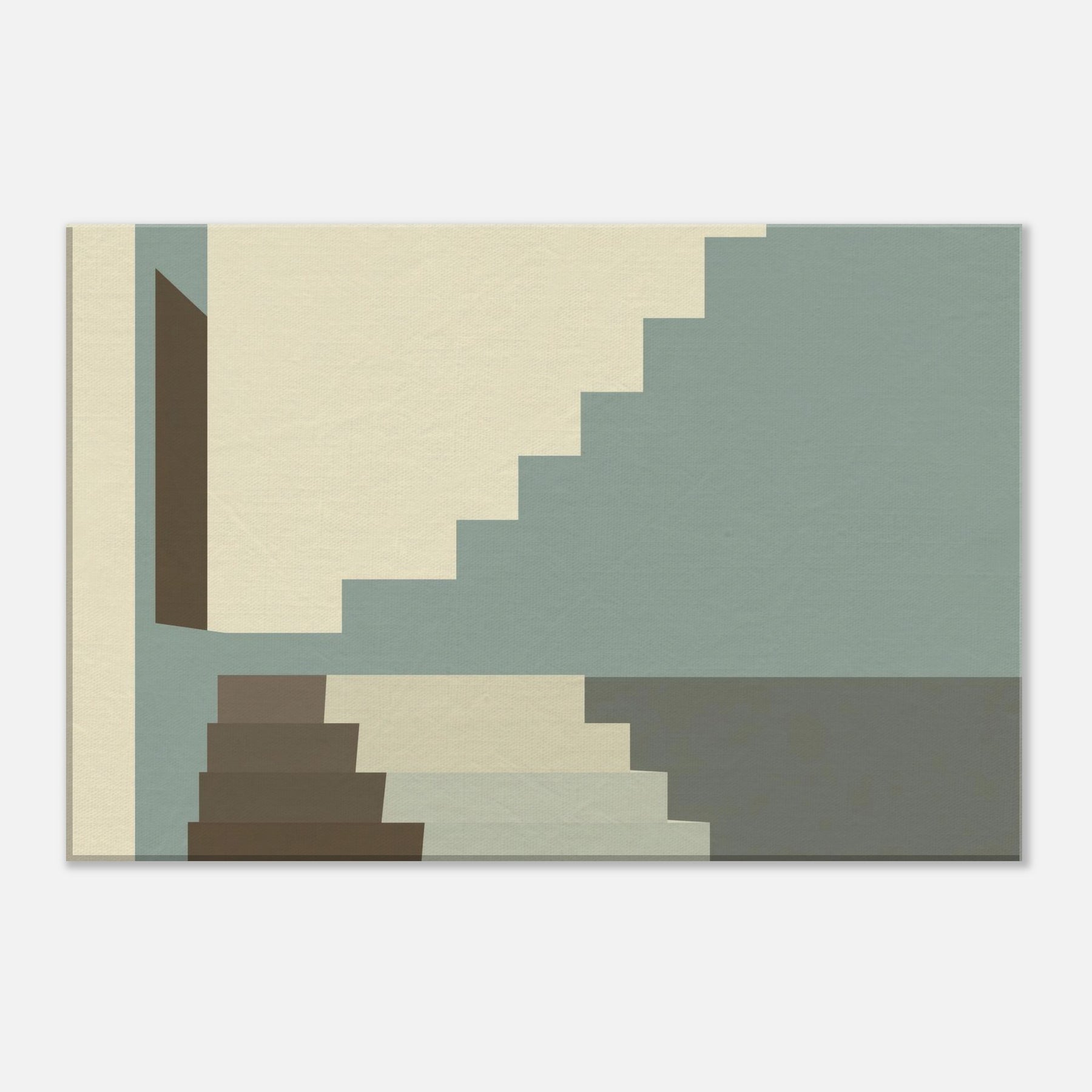 Let Staircase Switchback lead your gaze into a calm city interior. The minimalist composition uses soft beige, sage, and charcoal a serene rhythm that mirrors architectural discipline. The stacked geometry invites you to breathe with the steps as light slides along clean planes, widening the sense of space. Perfect for living rooms or hallways, this piece elevates your space with quiet sophistication and a whisper of urban poetry.