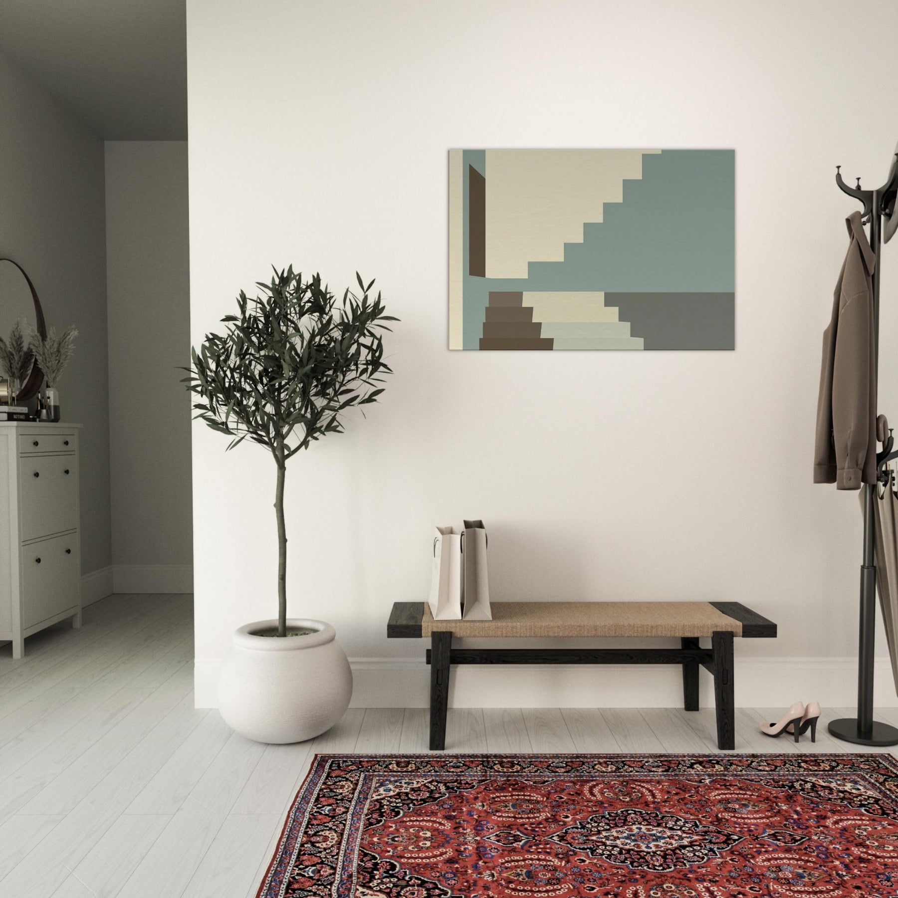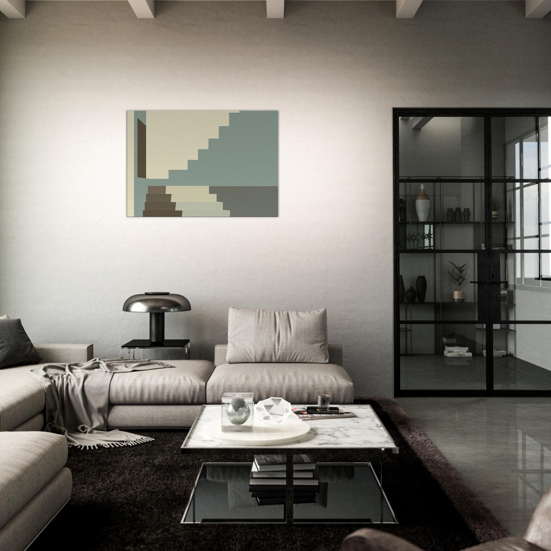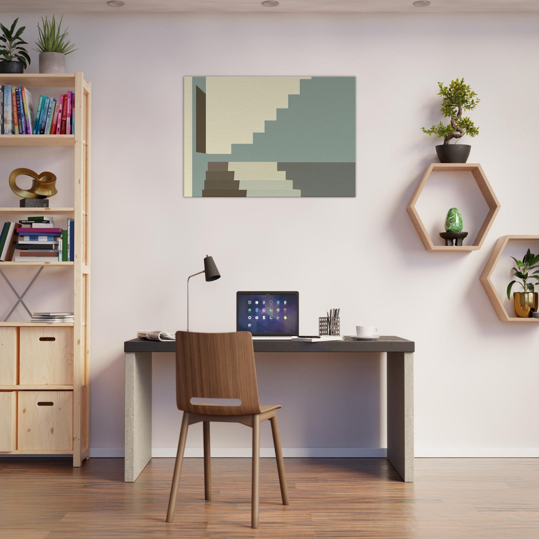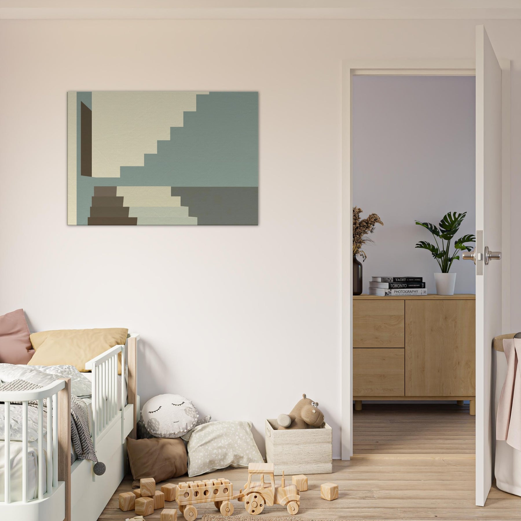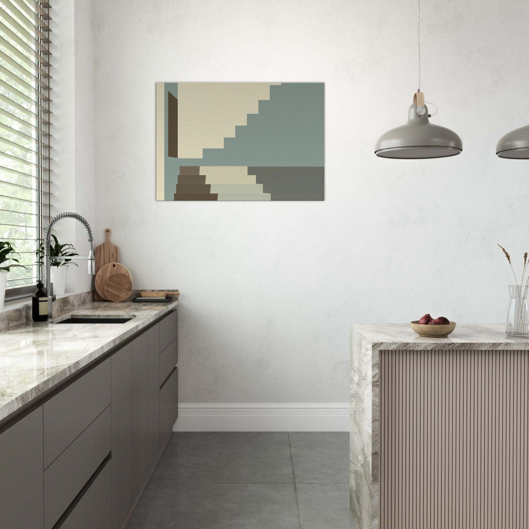 Let Staircase Switchback lead your gaze into a calm city interior. The minimalist composition uses soft beige, sage, and charcoal a serene rhythm that mirrors architectural discipline. The stacked geometry invites you to breathe with the steps as light slides along clean planes, widening the sense of space. Perfect for living rooms or hallways, this piece elevates your space with quiet sophistication and a whisper of urban poetry.