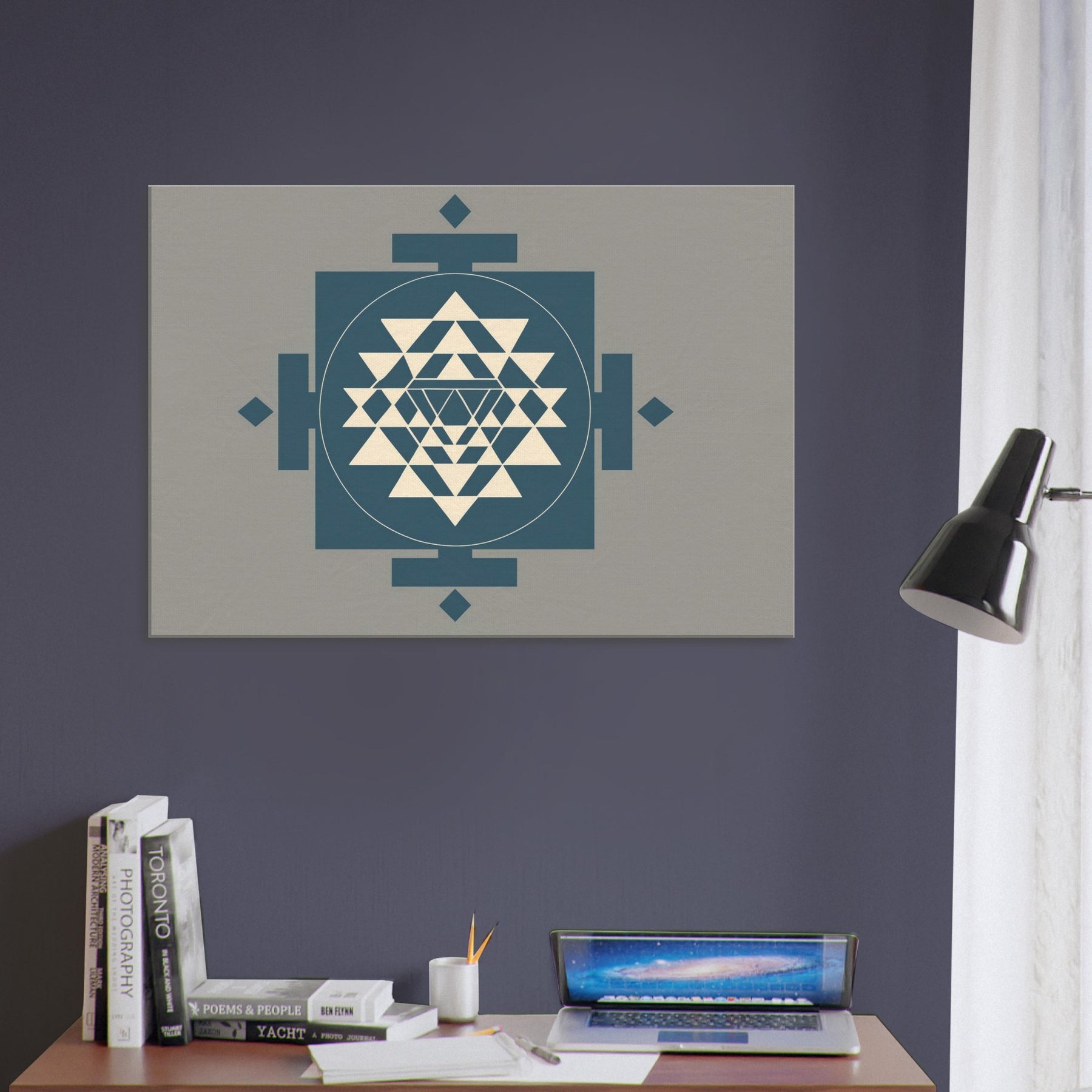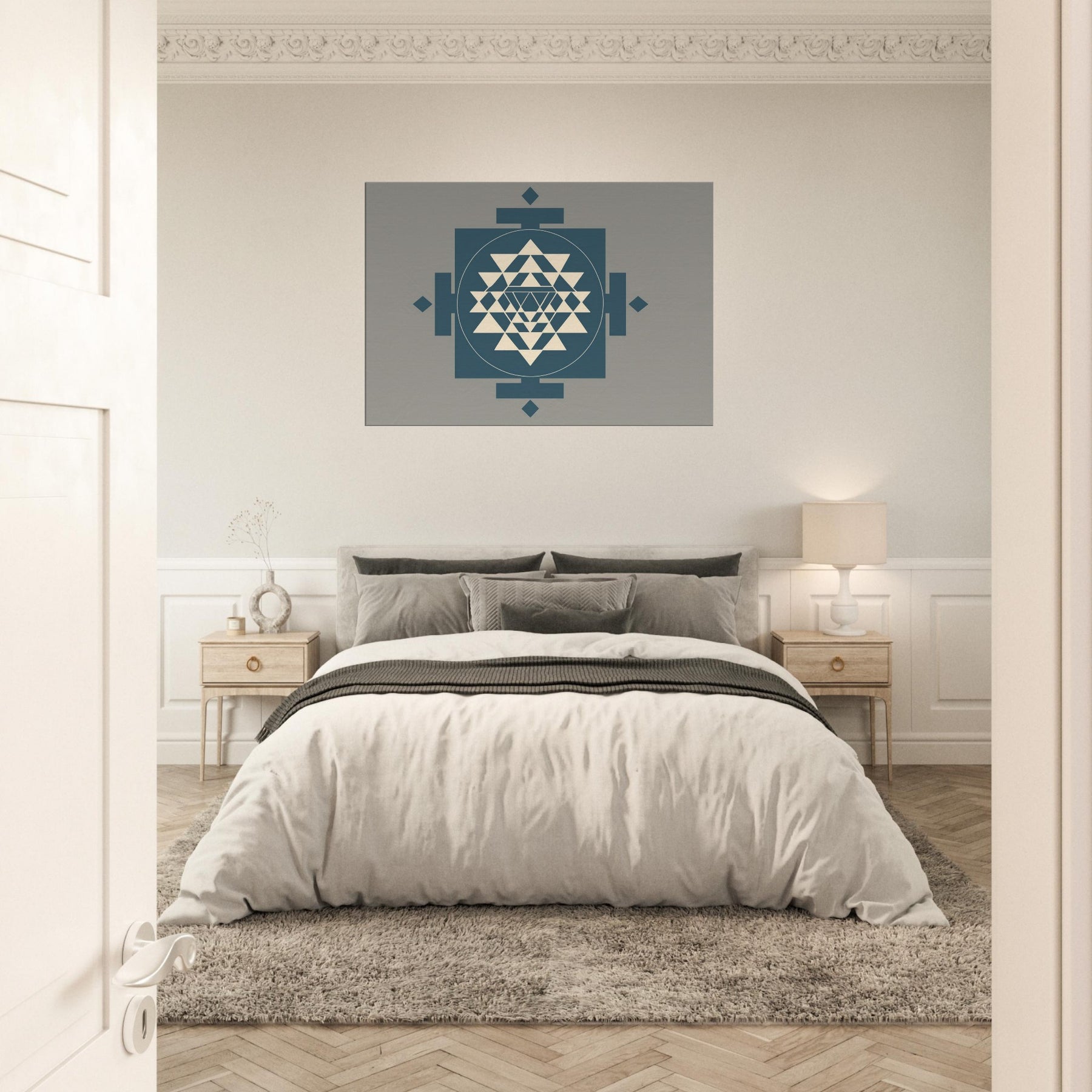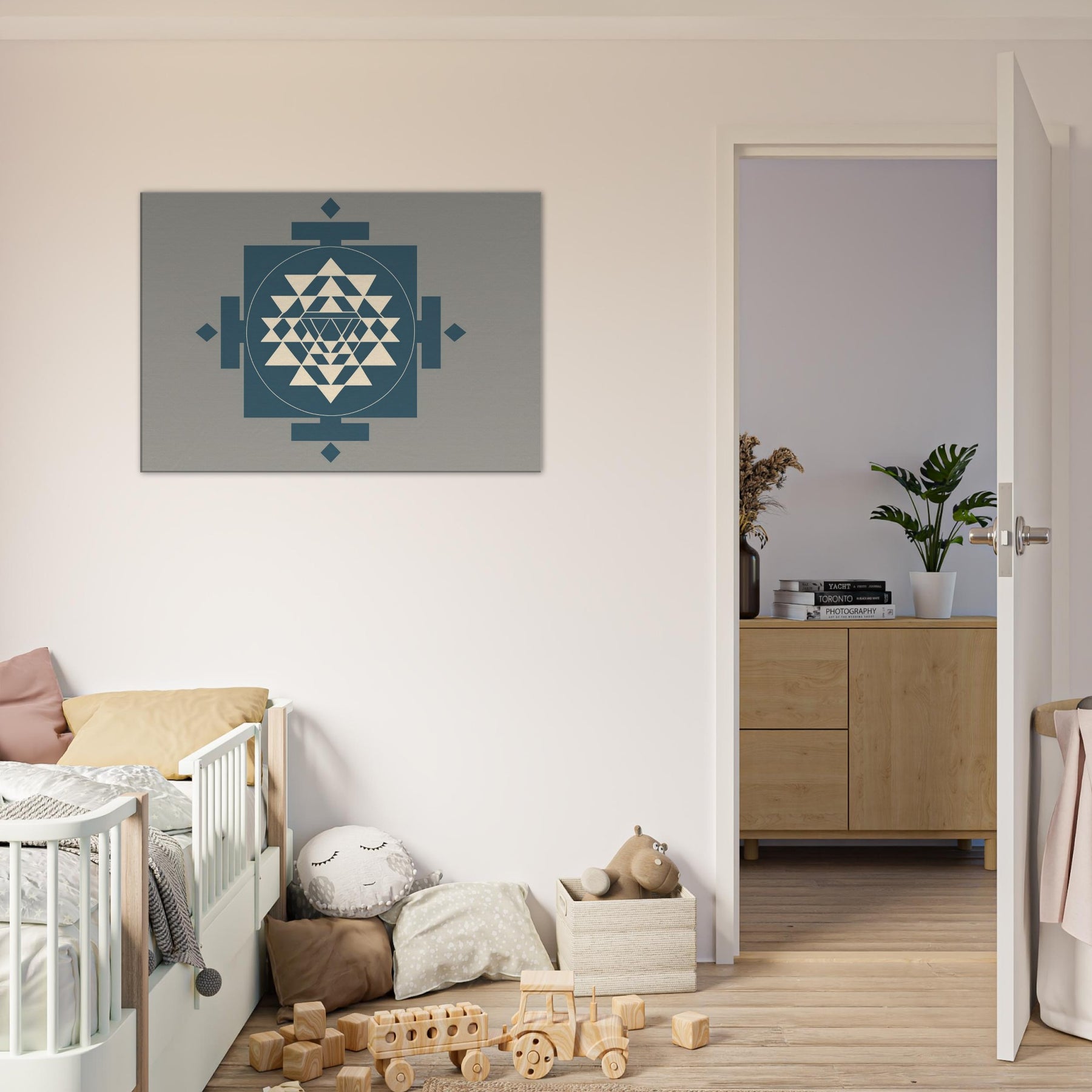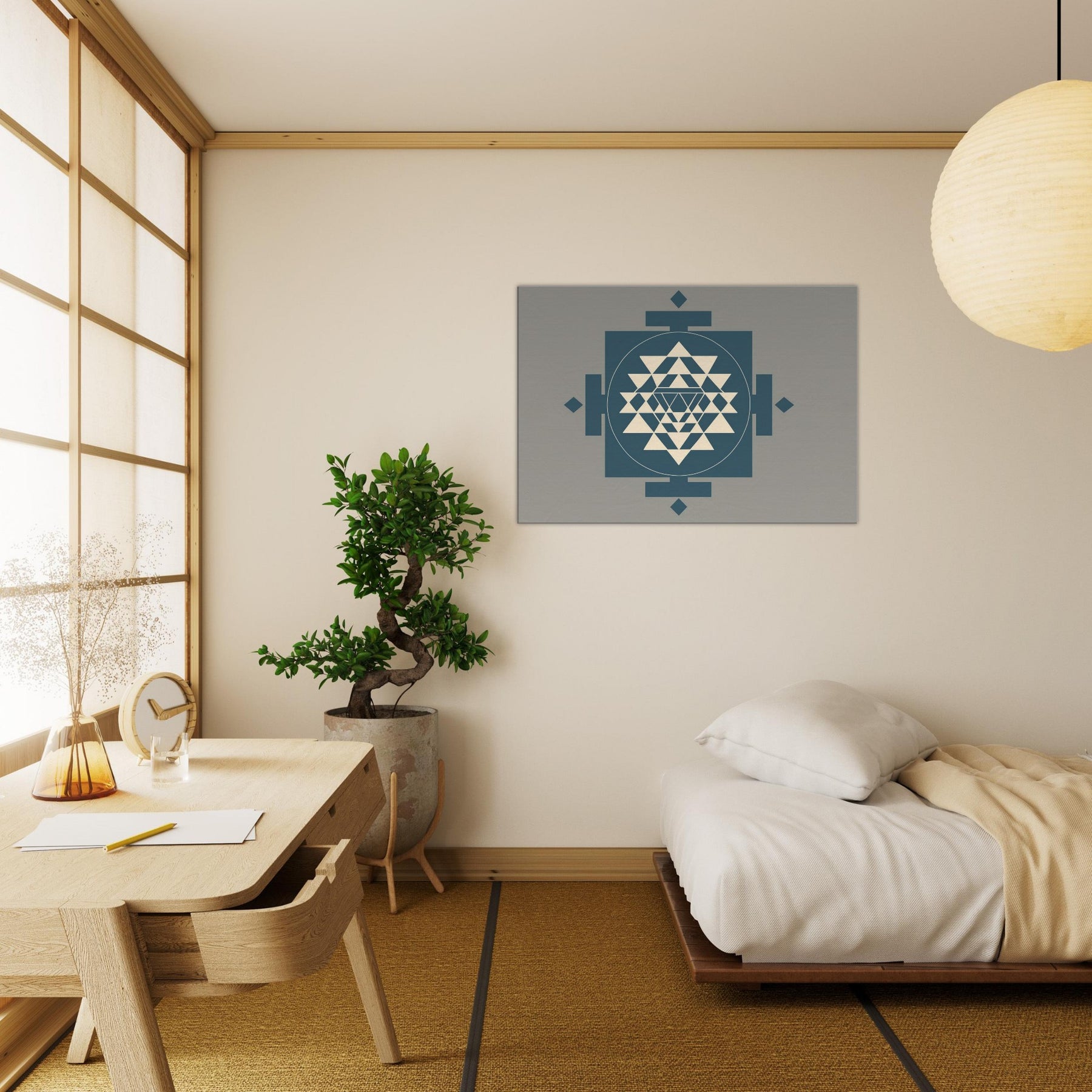 Within a hush of blue and warm sand, the Sri Yantra unfolds in a minimalist hush. This hypnotic geometric mandala gathers intention into a single, breathing surface, inviting quiet focus and mindful presence. The composition radiates balance, turning any wall into a contemplative altar perfect for a living room, study, or entryway. Light plays along its lines, and the atmosphere softens, creating a serene backdrop that enhances conversations, dreams, and daily rituals with a subtle, mystical resonance.