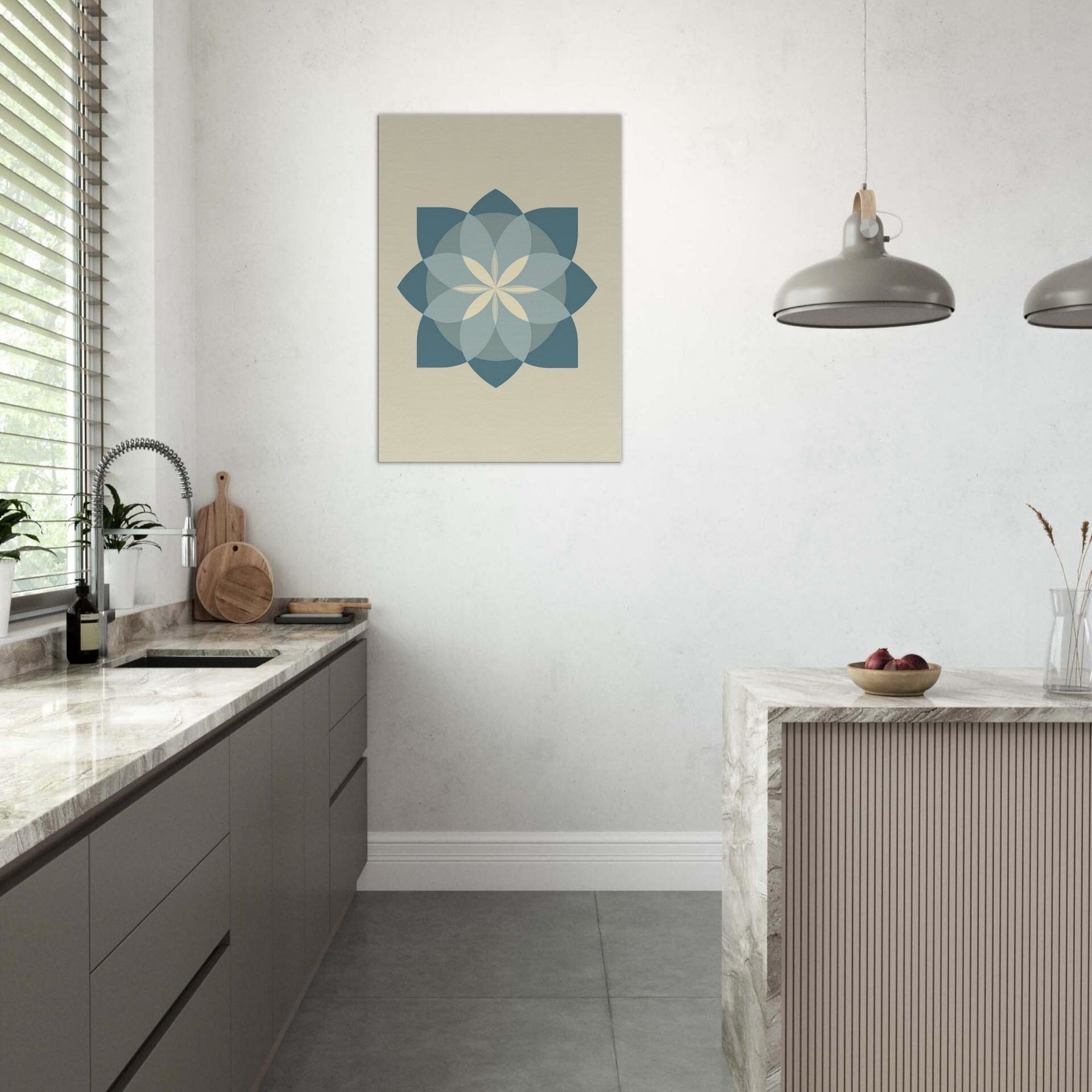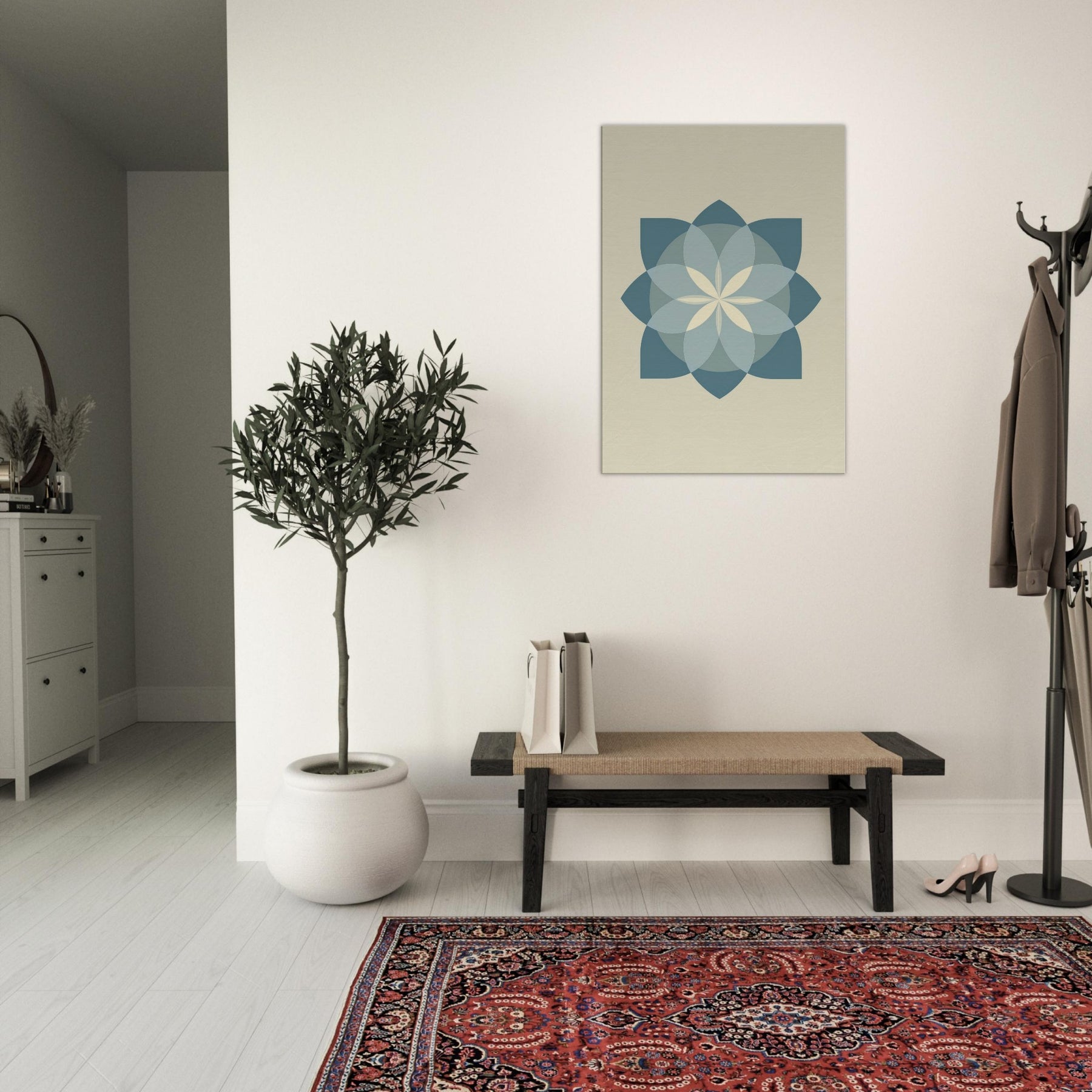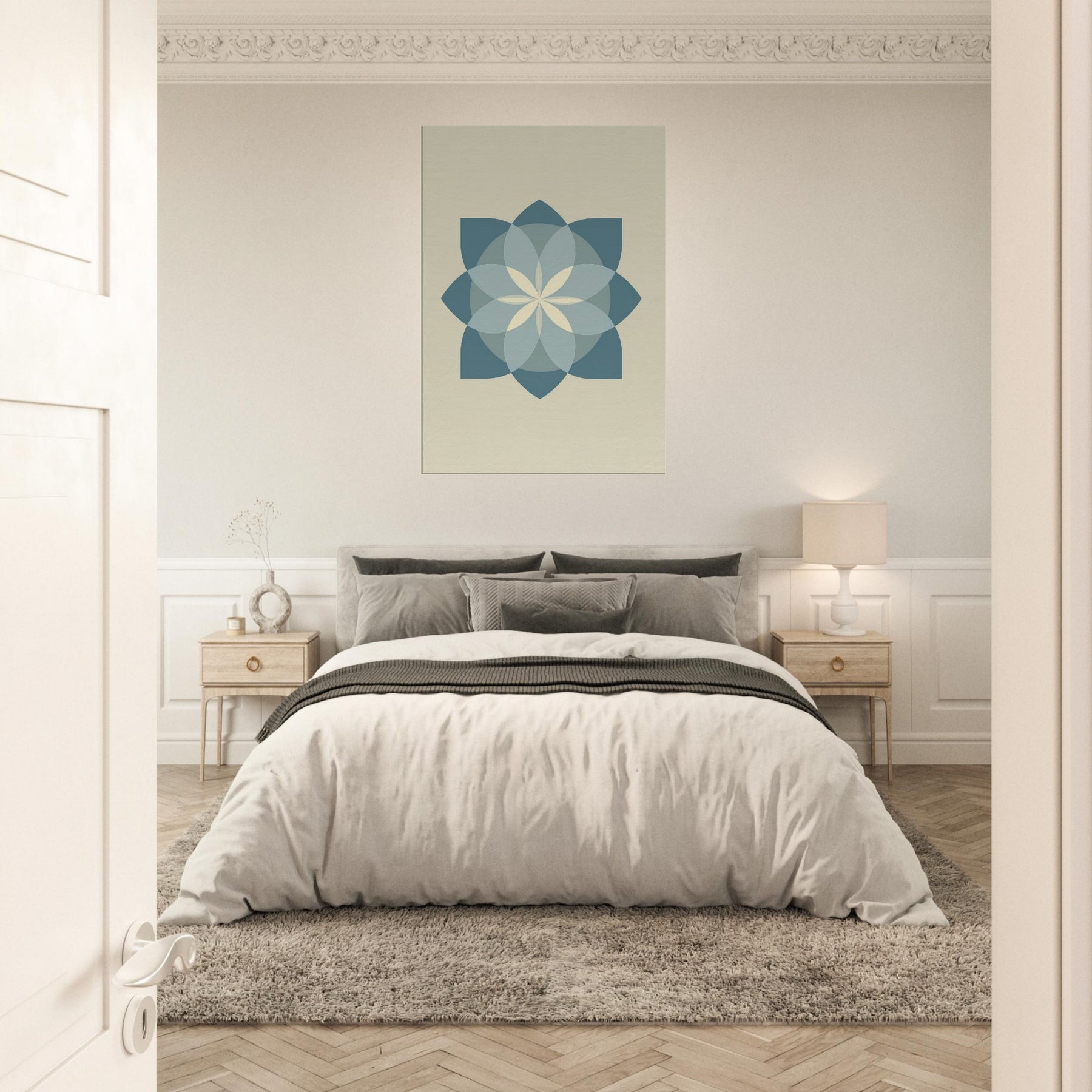 Immerse yourself in Sacred Geometry expressed through a serene, minimalist blossom. This calm, symmetrical design radiates quiet certainty, turning walls into a meditative space with cool blues and warm cream. Layered arcs invite slow eye movement, inviting contemplation and serenity into the room. Perfect for a living room, study, or bedroom, it elevates atmosphere, sustains focus, and lends a timeless, mystical order to modern living.