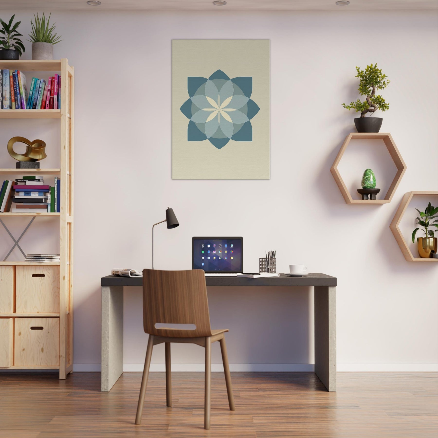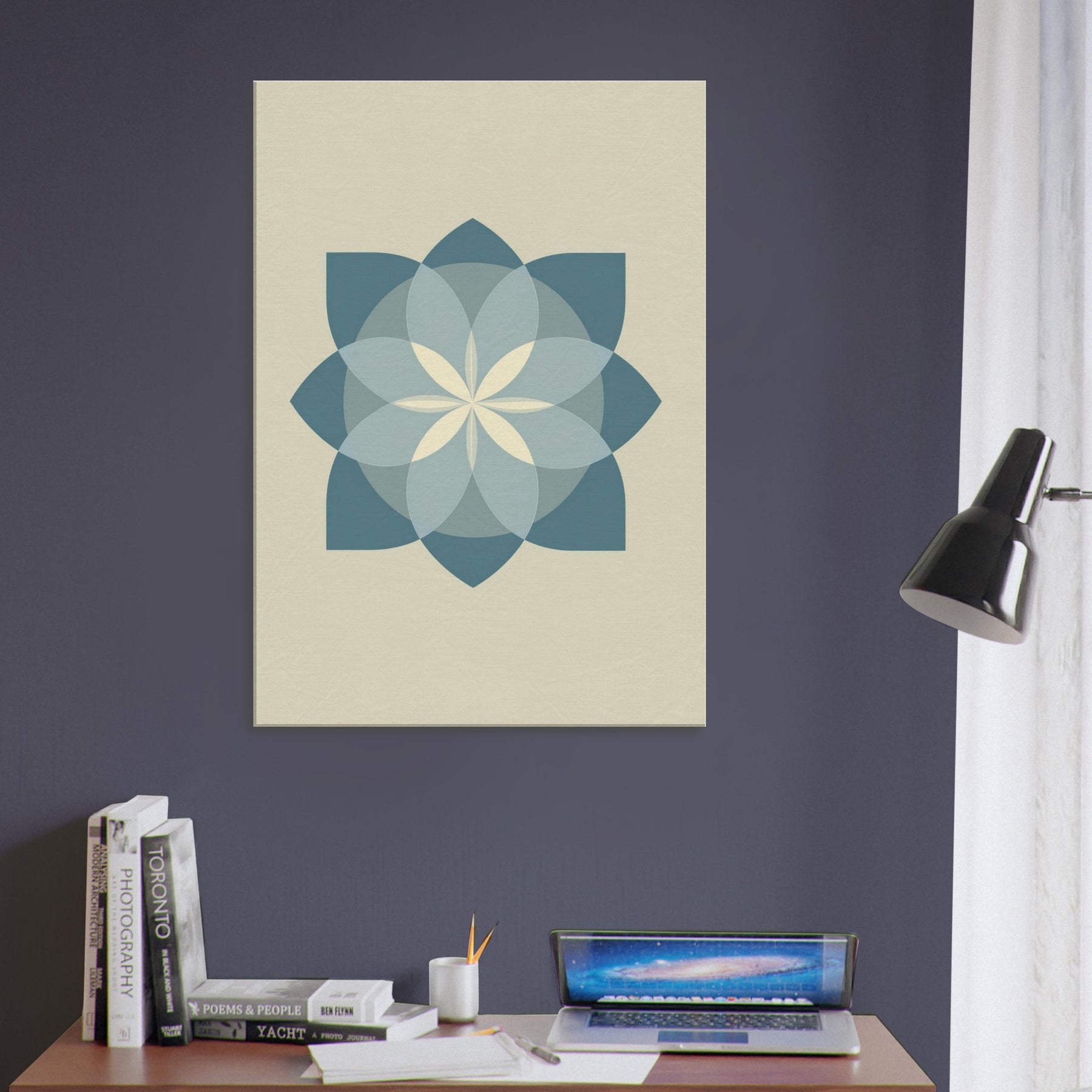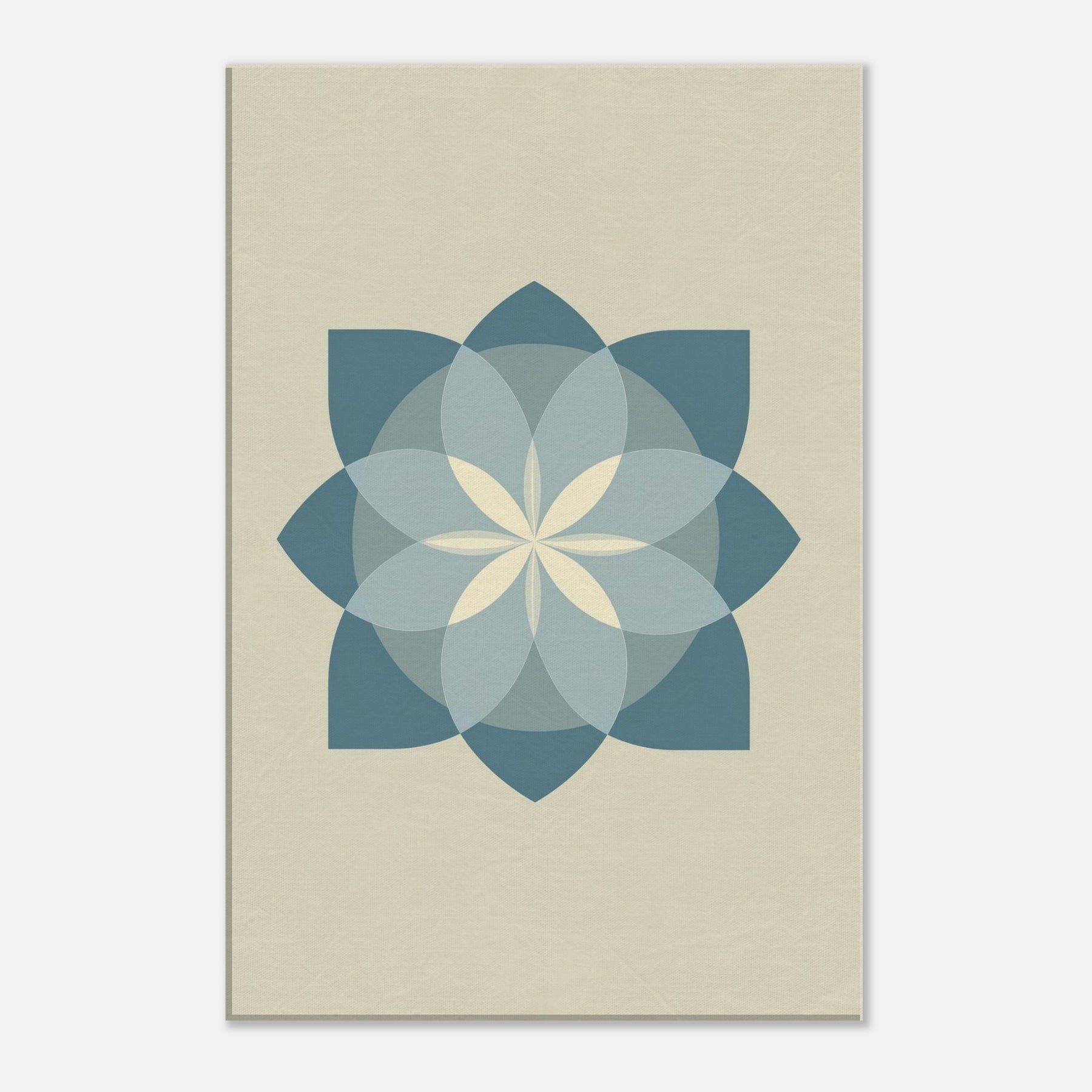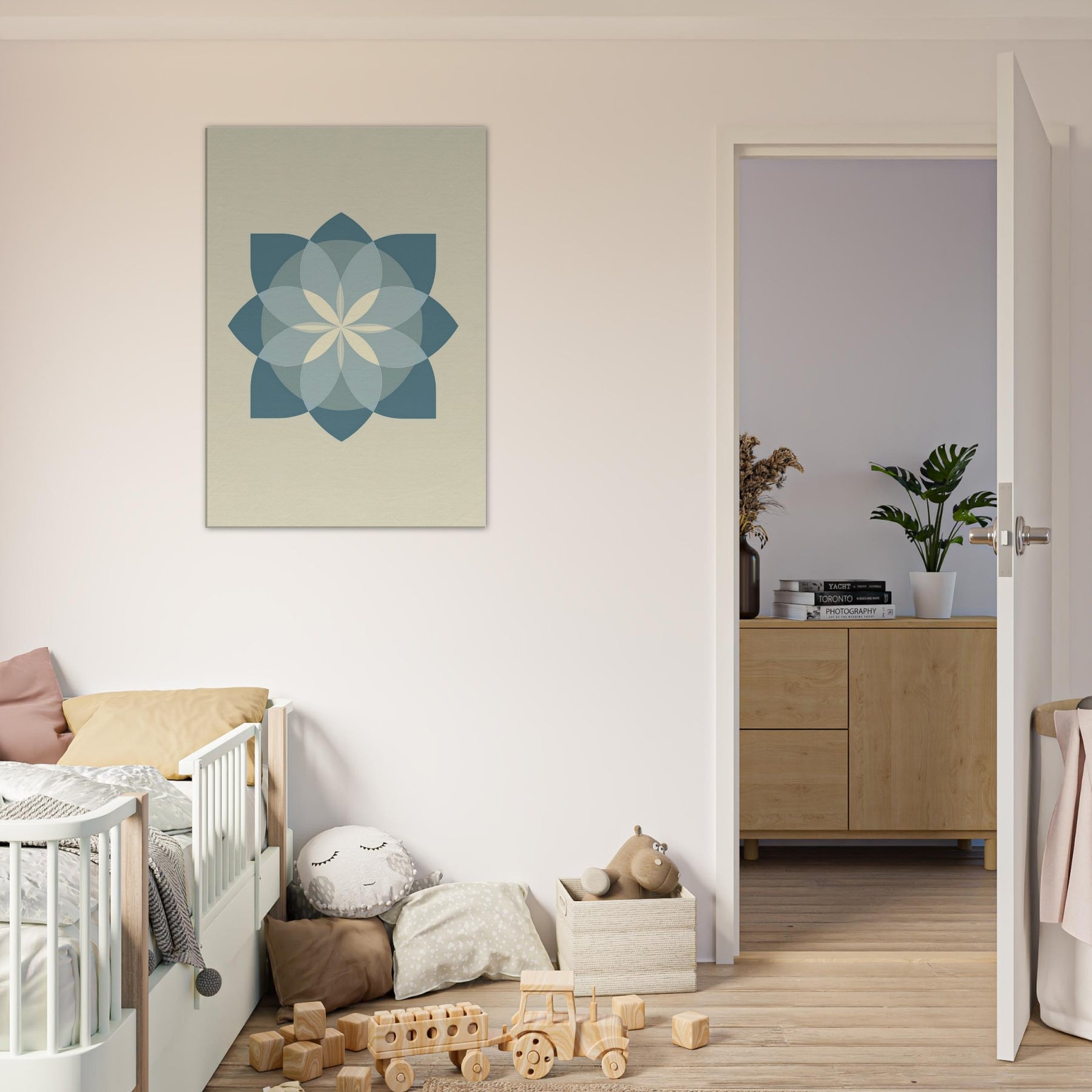 Immerse yourself in Sacred Geometry expressed through a serene, minimalist blossom. This calm, symmetrical design radiates quiet certainty, turning walls into a meditative space with cool blues and warm cream. Layered arcs invite slow eye movement, inviting contemplation and serenity into the room. Perfect for a living room, study, or bedroom, it elevates atmosphere, sustains focus, and lends a timeless, mystical order to modern living.
