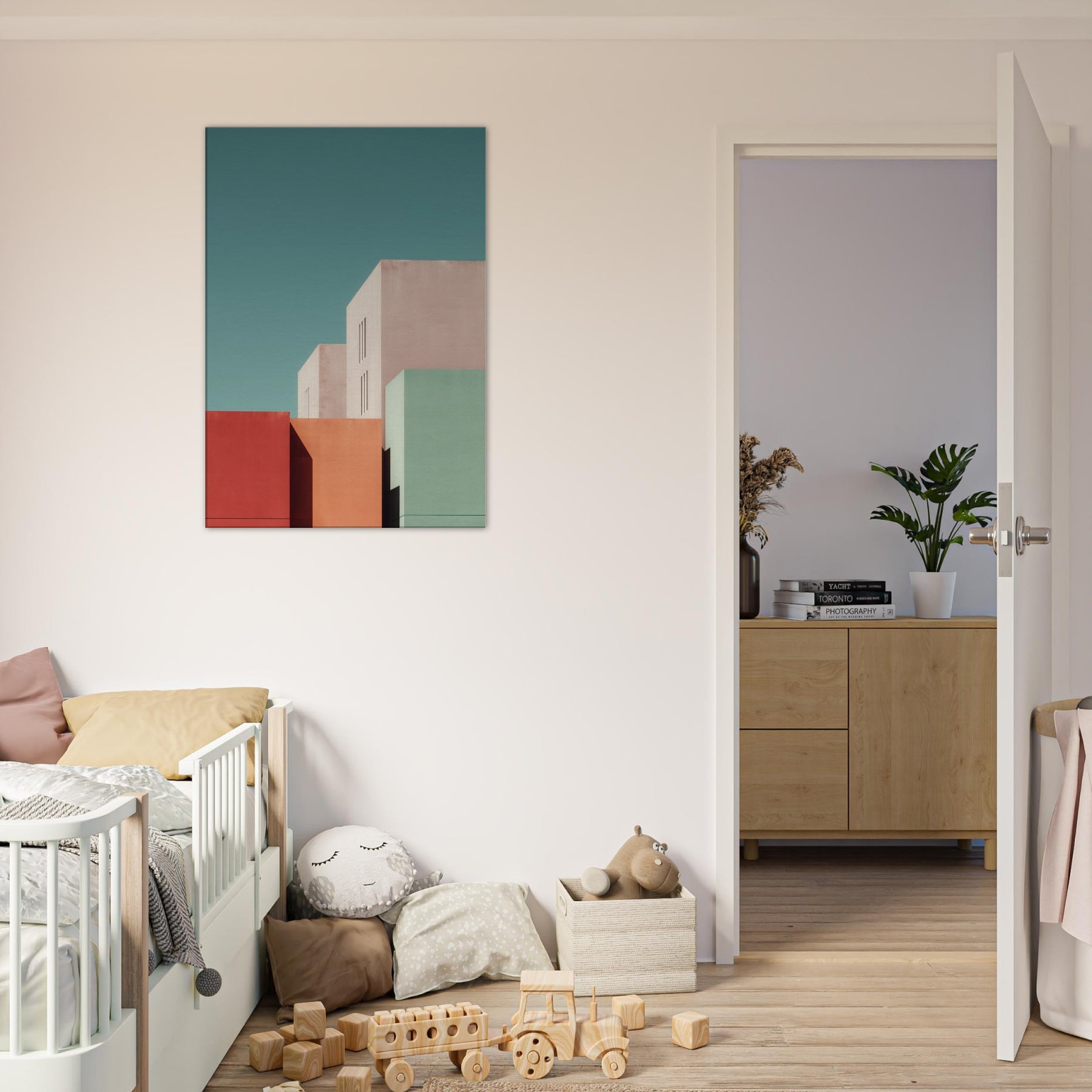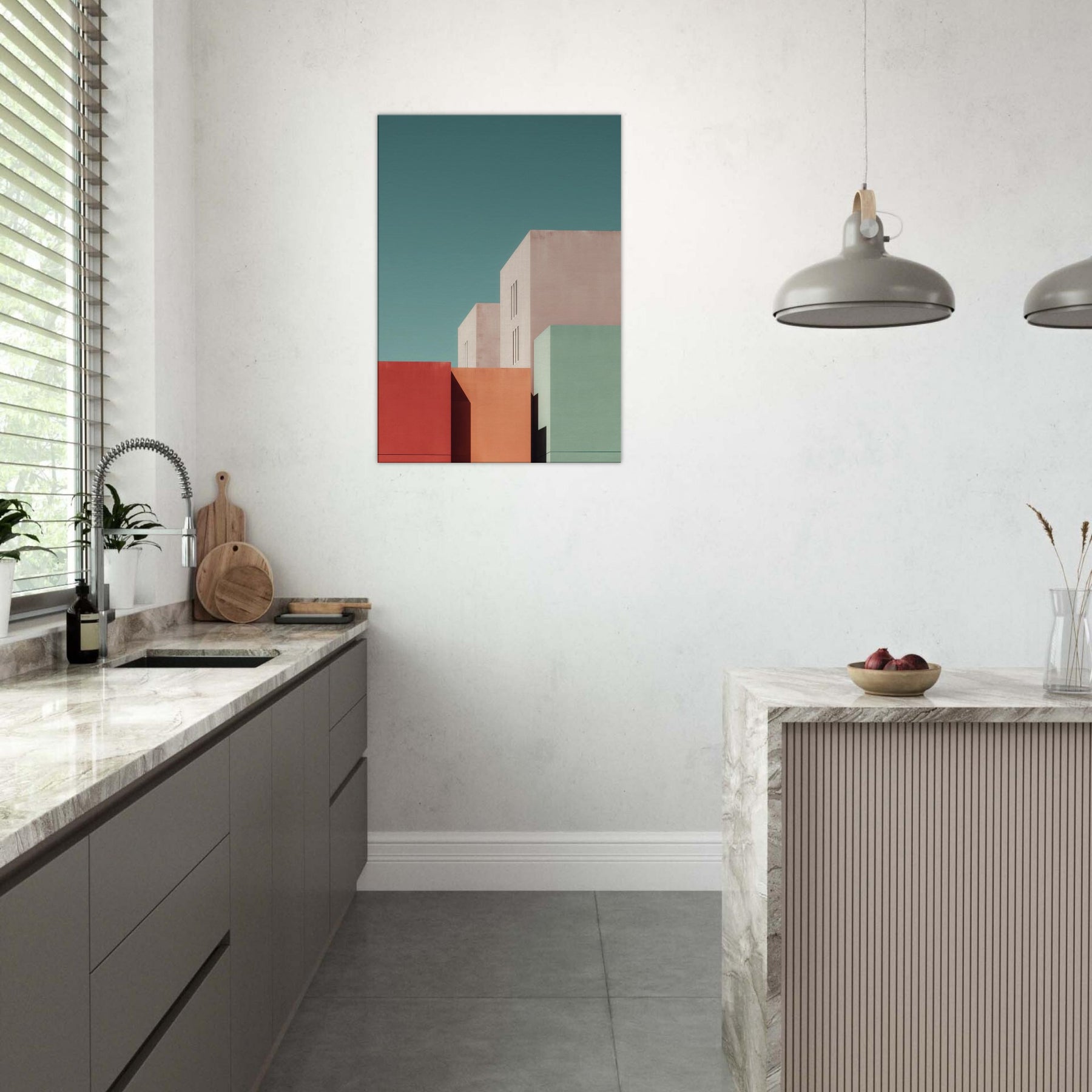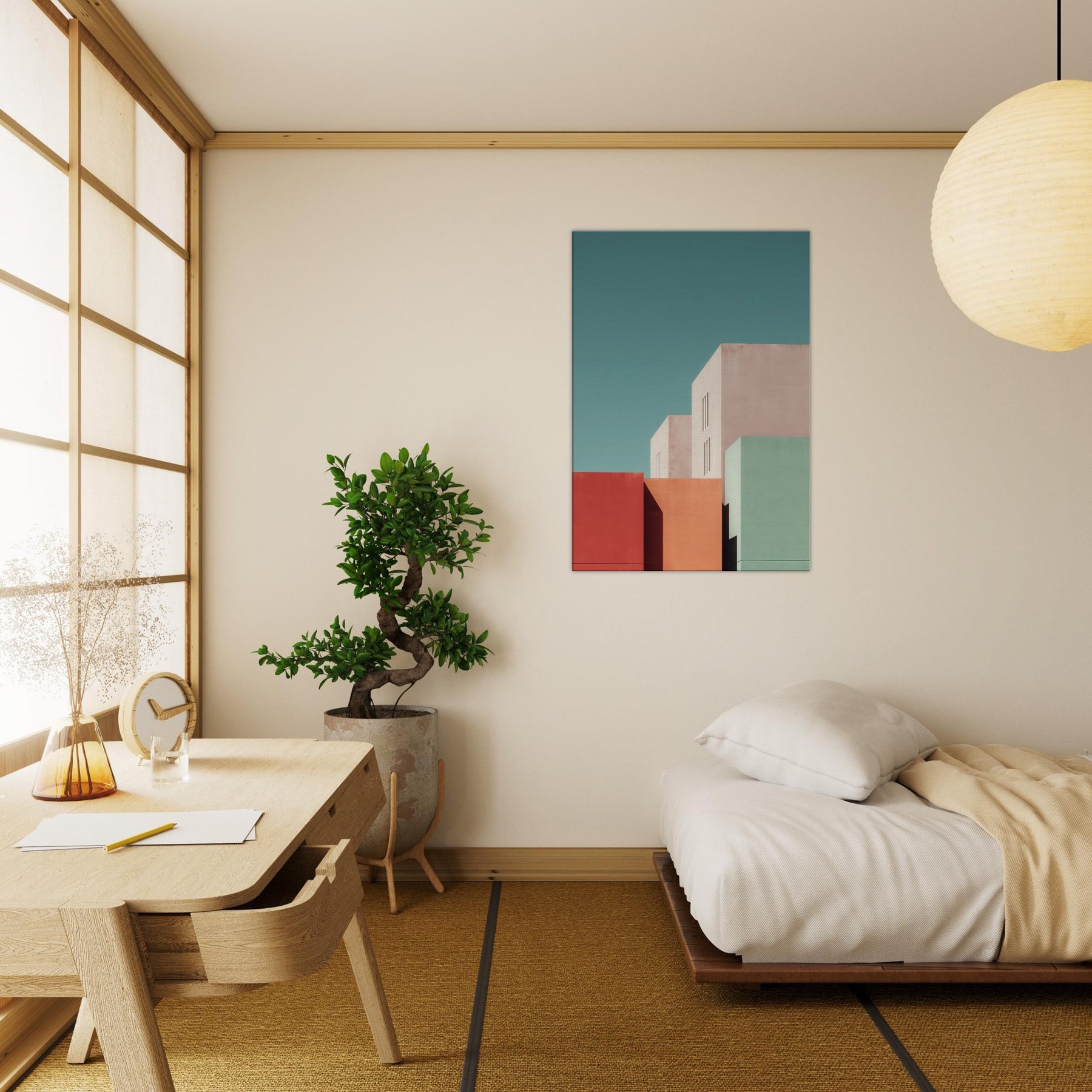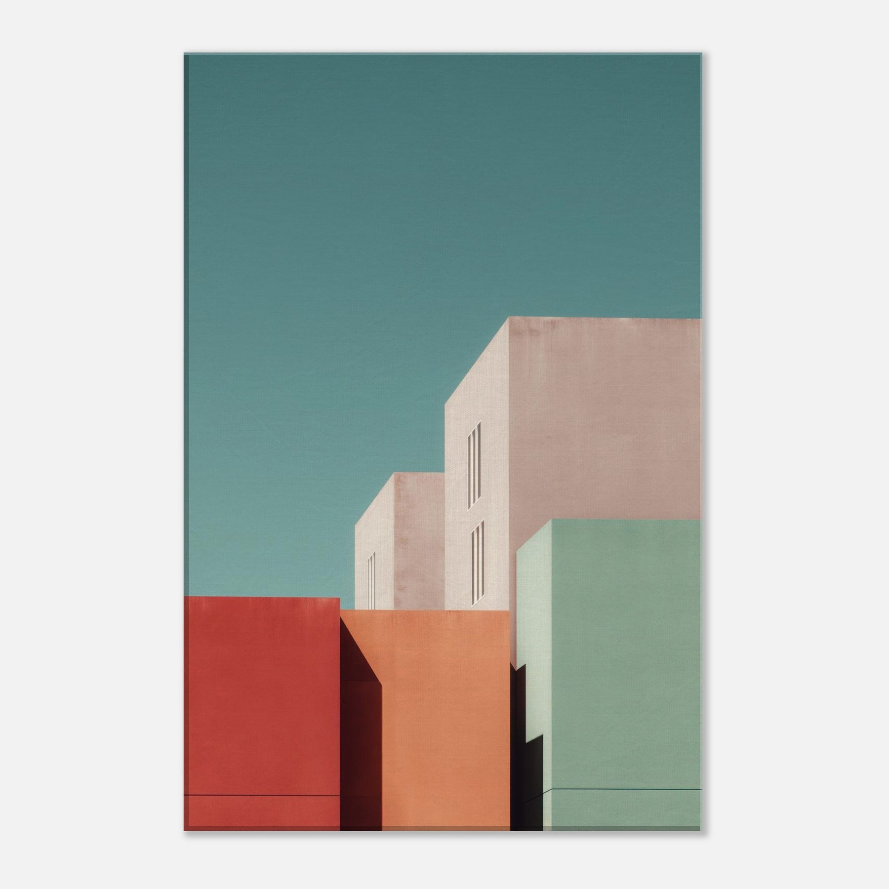Seattle settles into a study of color and form. This minimalist composition gathers bold blocks of rose, seafoam, and sand, balanced by pale architectural planes that breathe with soft light. Hang it in a living room or bedroom to invite calm focus, the way dusk settles over city streets. The artwork reshapes space with urban stillness, complementing clean lines, warm textures, and thoughtful conversations.