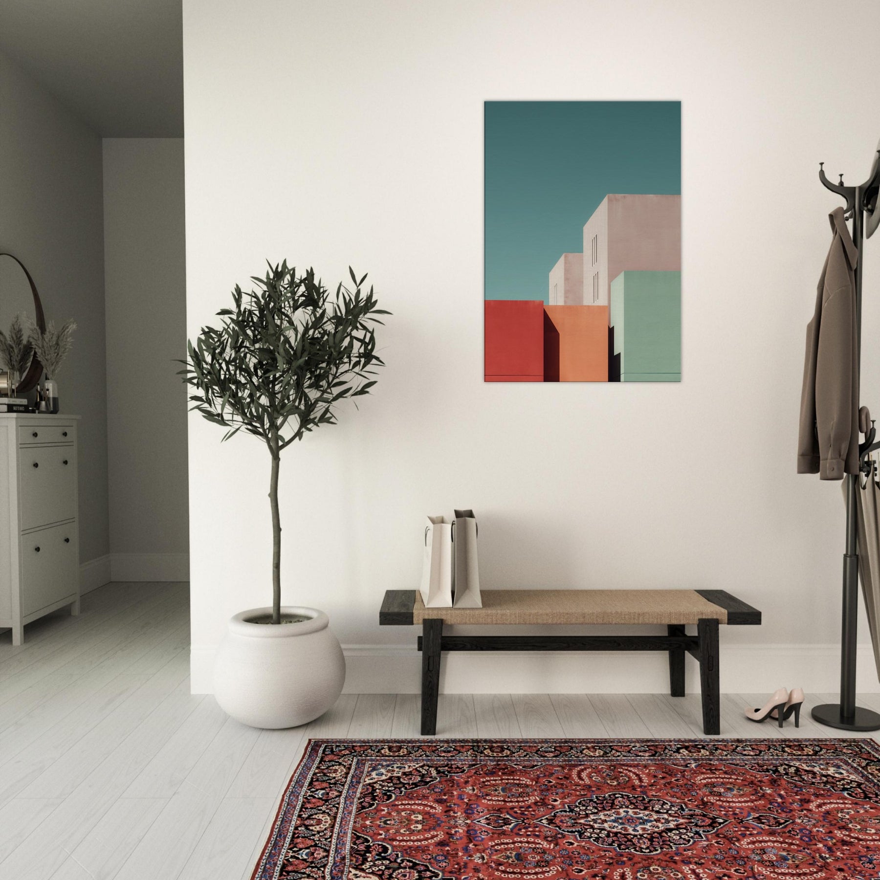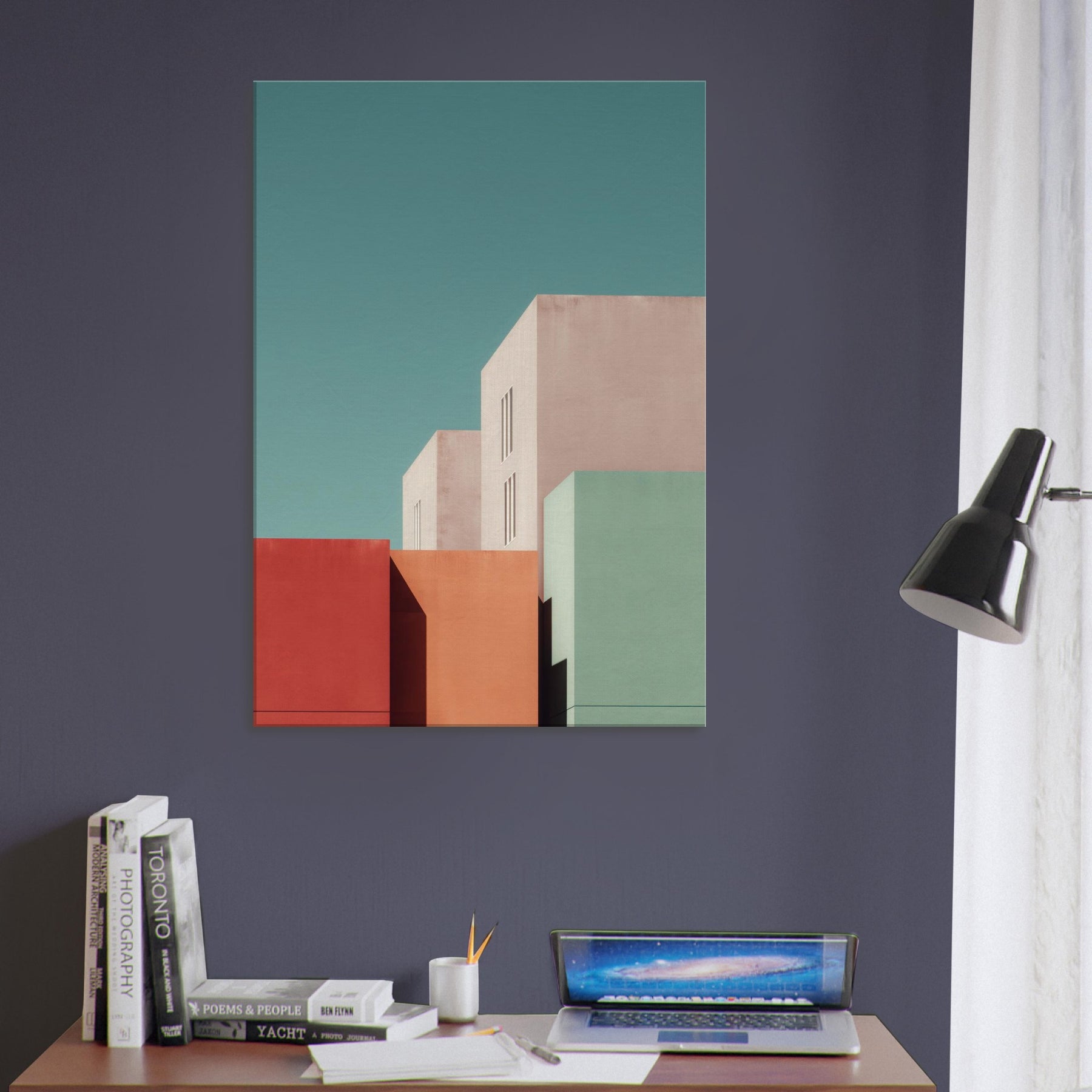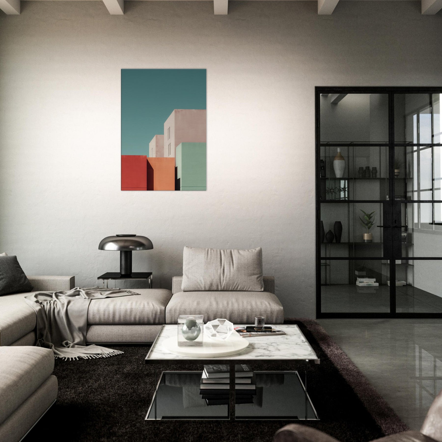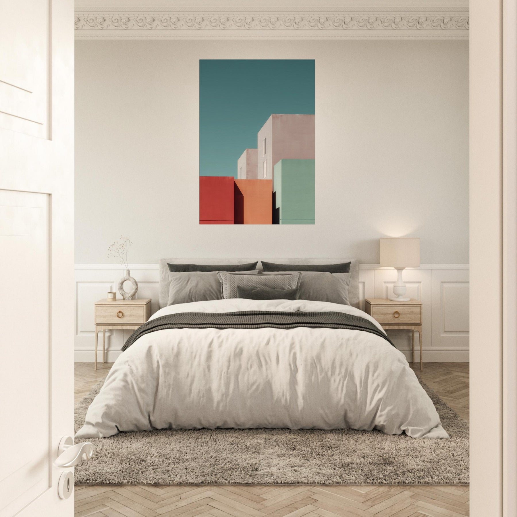 Seattle settles into a study of color and form. This minimalist composition gathers bold blocks of rose, seafoam, and sand, balanced by pale architectural planes that breathe with soft light. Hang it in a living room or bedroom to invite calm focus, the way dusk settles over city streets. The artwork reshapes space with urban stillness, complementing clean lines, warm textures, and thoughtful conversations.