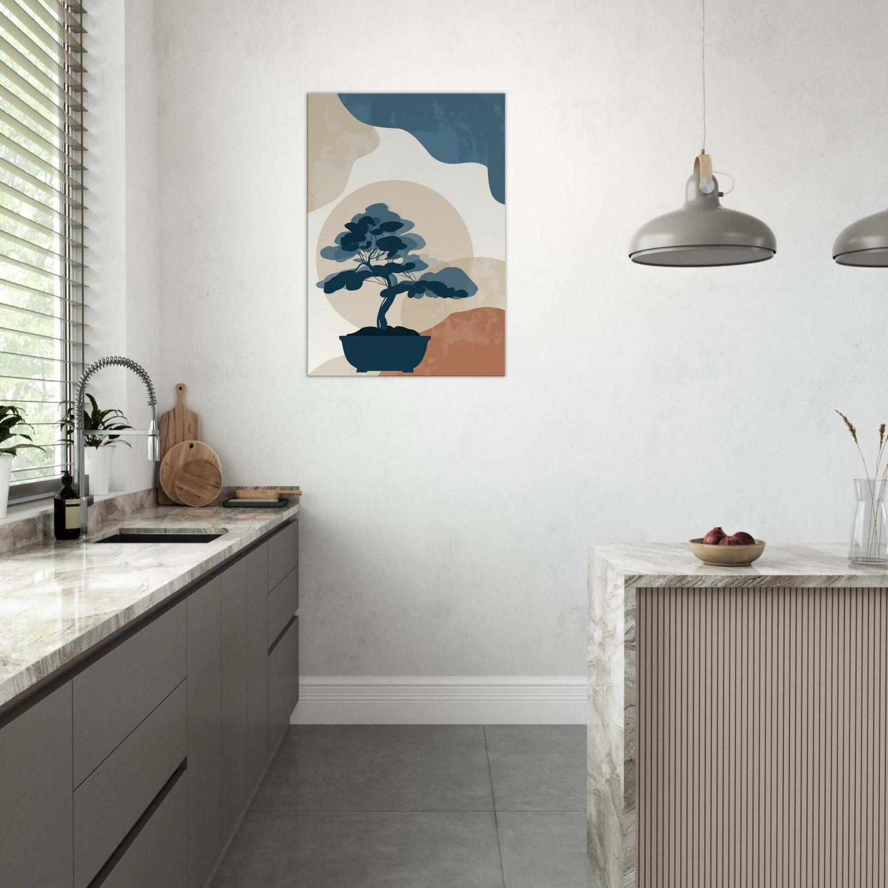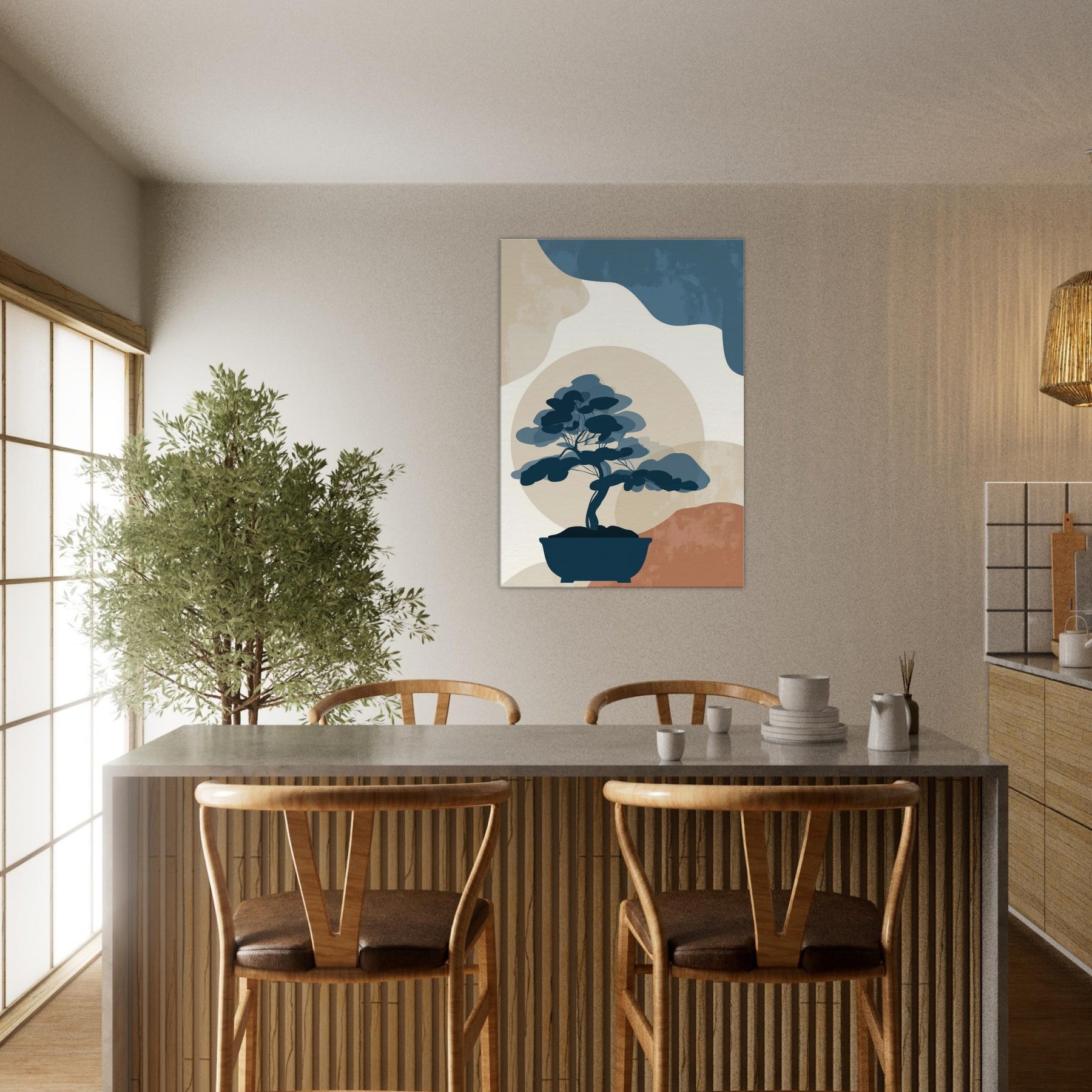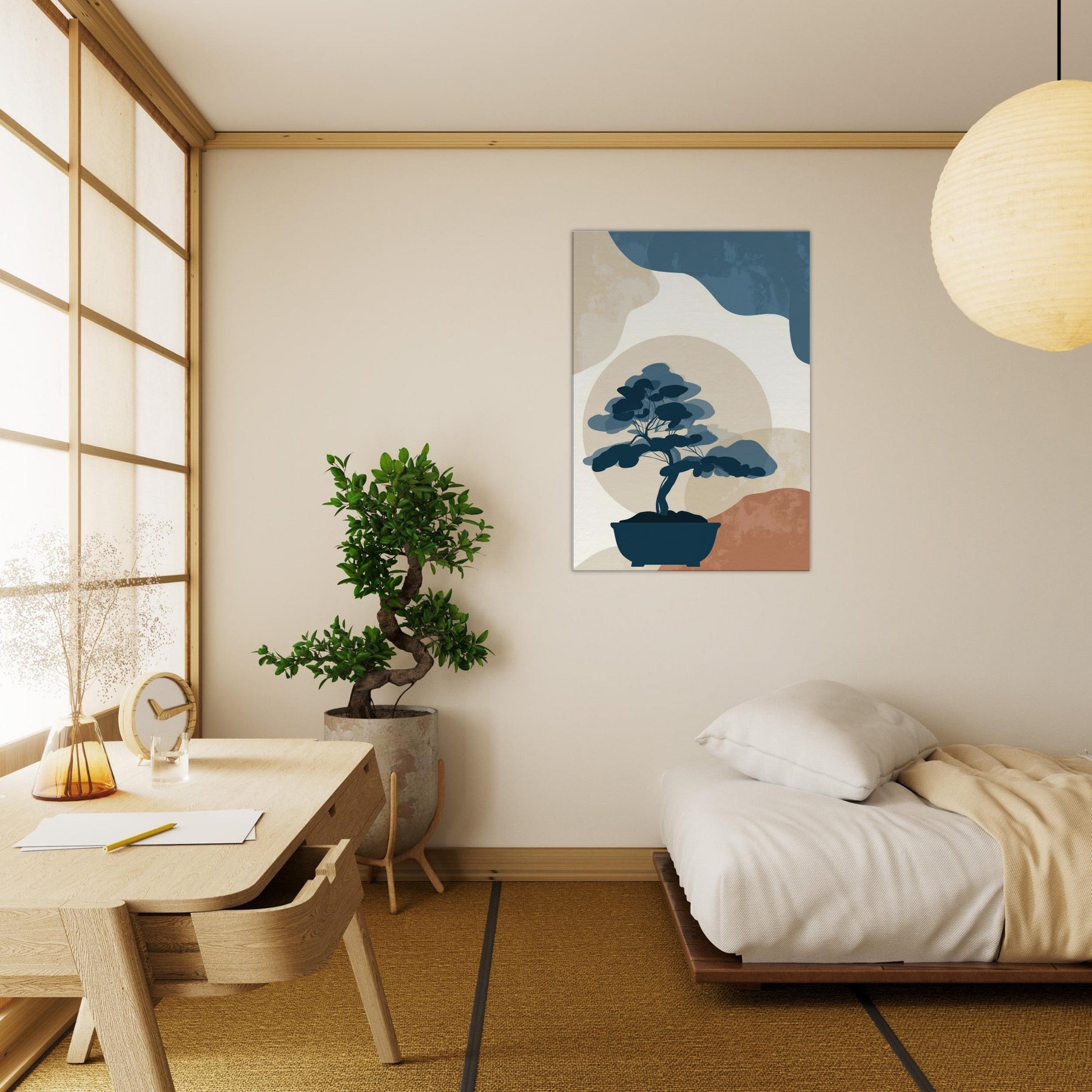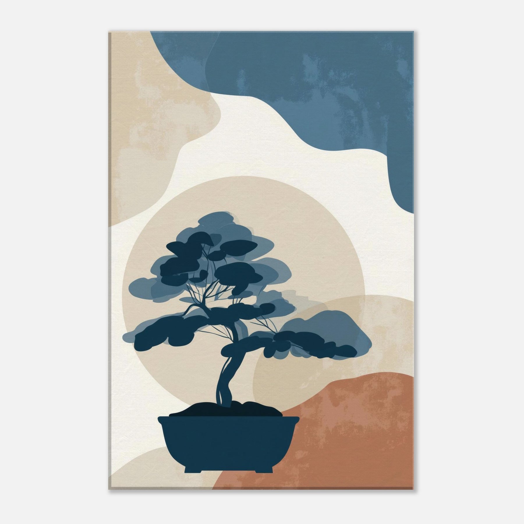 Bonsai Silhouette rests in quiet balance against a soft, sun warmed horizon. This minimalist study uses restrained blues, stone beiges, and a whisper of terracotta to evoke a tranquil without crowding the eye. It invites contemplation, turning any wall into a serene nook where light and shadow meet. The piece exudes refined ease, enhancing living spaces with a sense of quiet confidence, perfect beside a reading chair, in a hallway, or above a console, where everyday rituals become artful pauses.