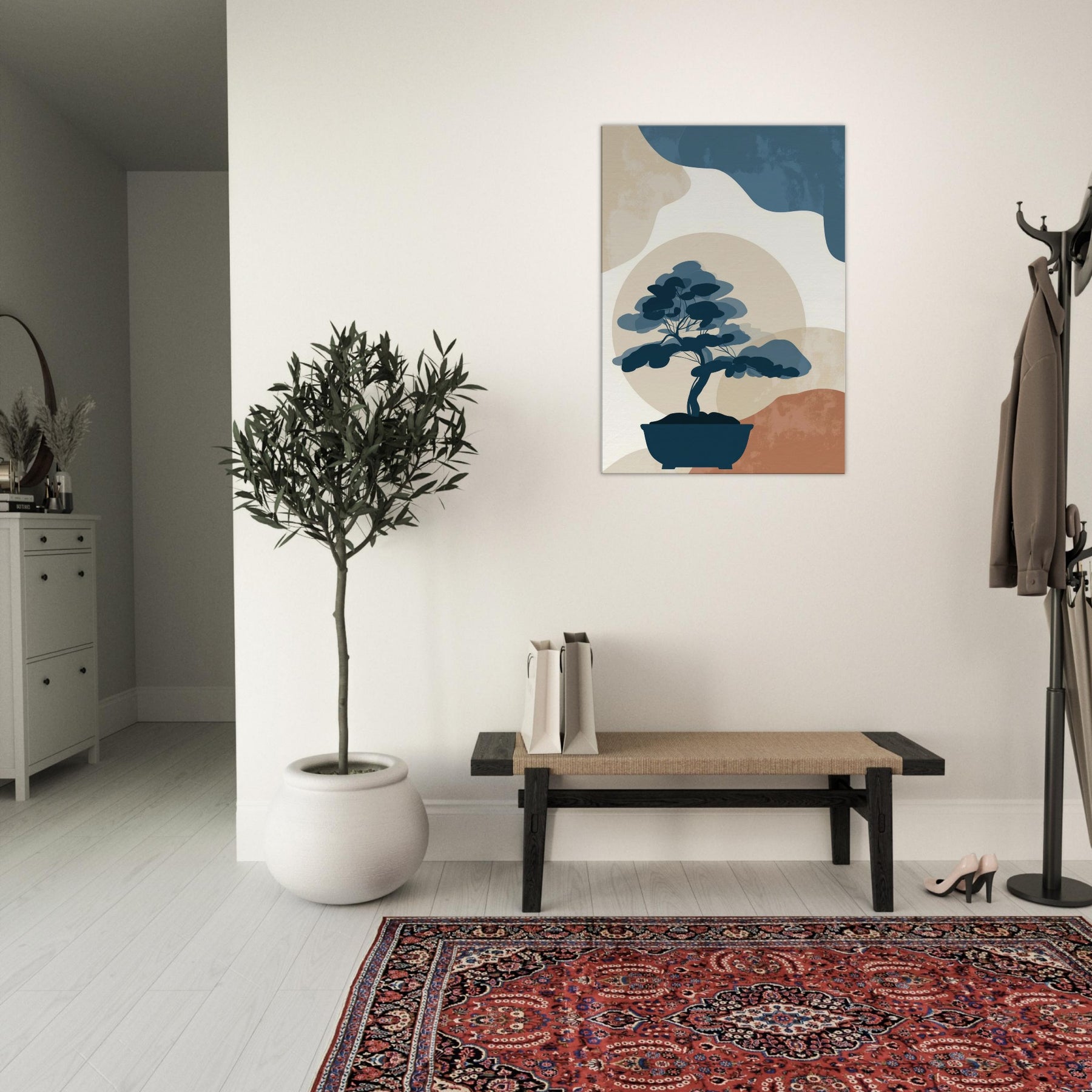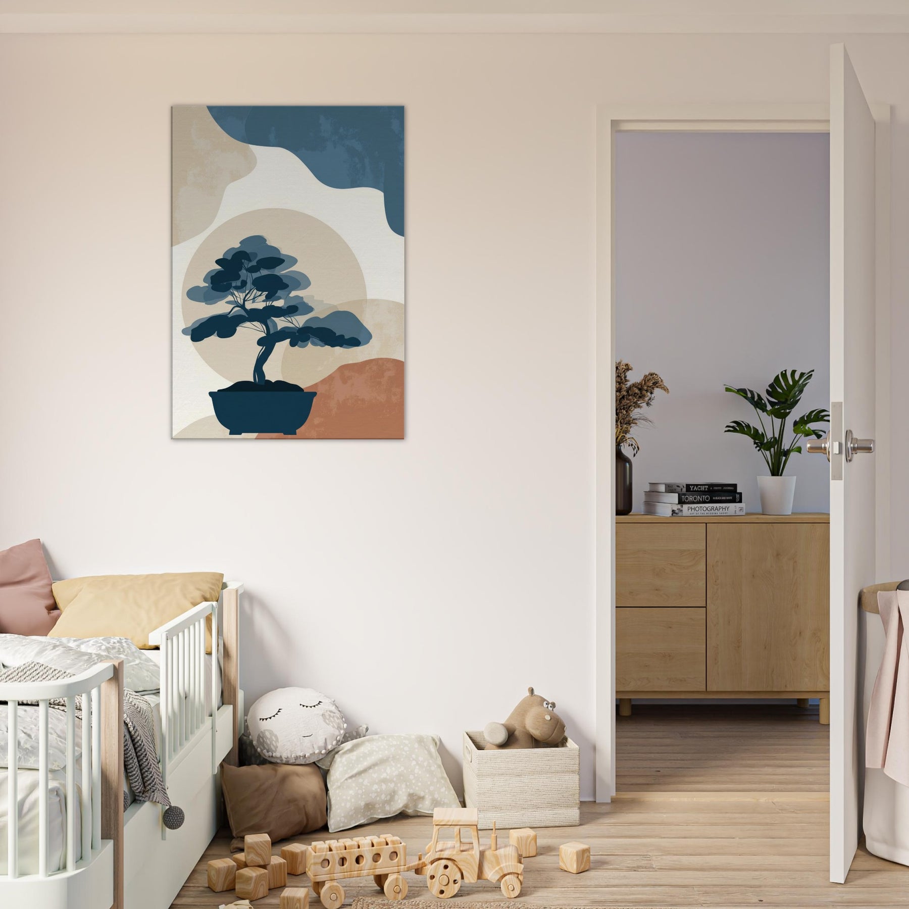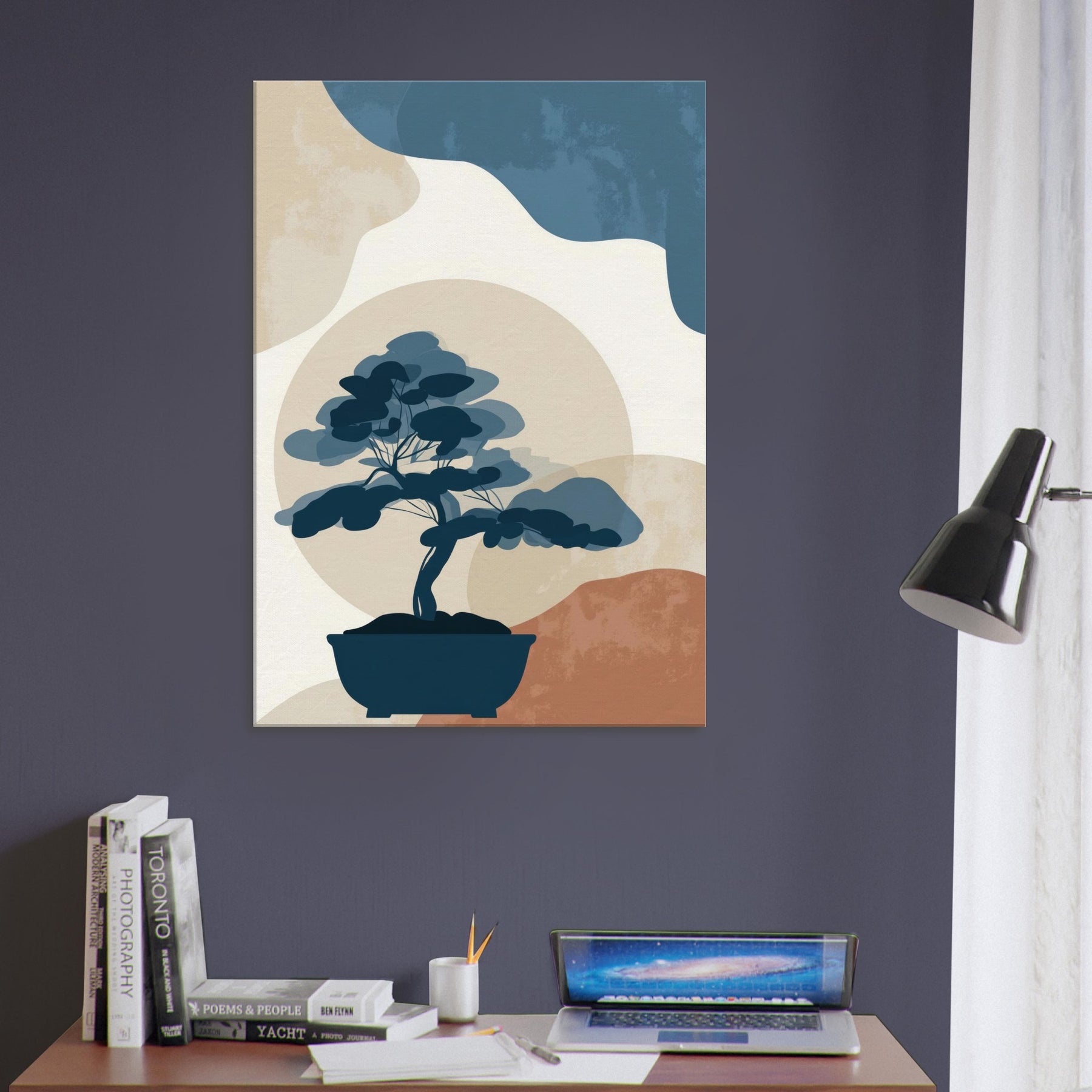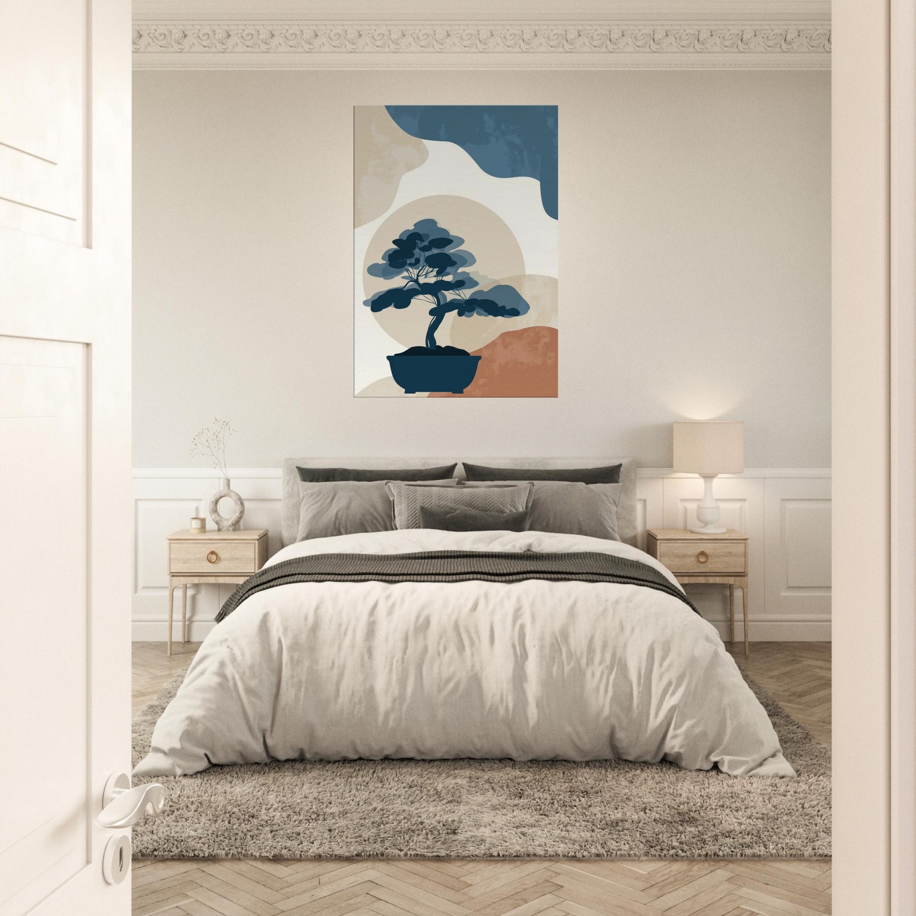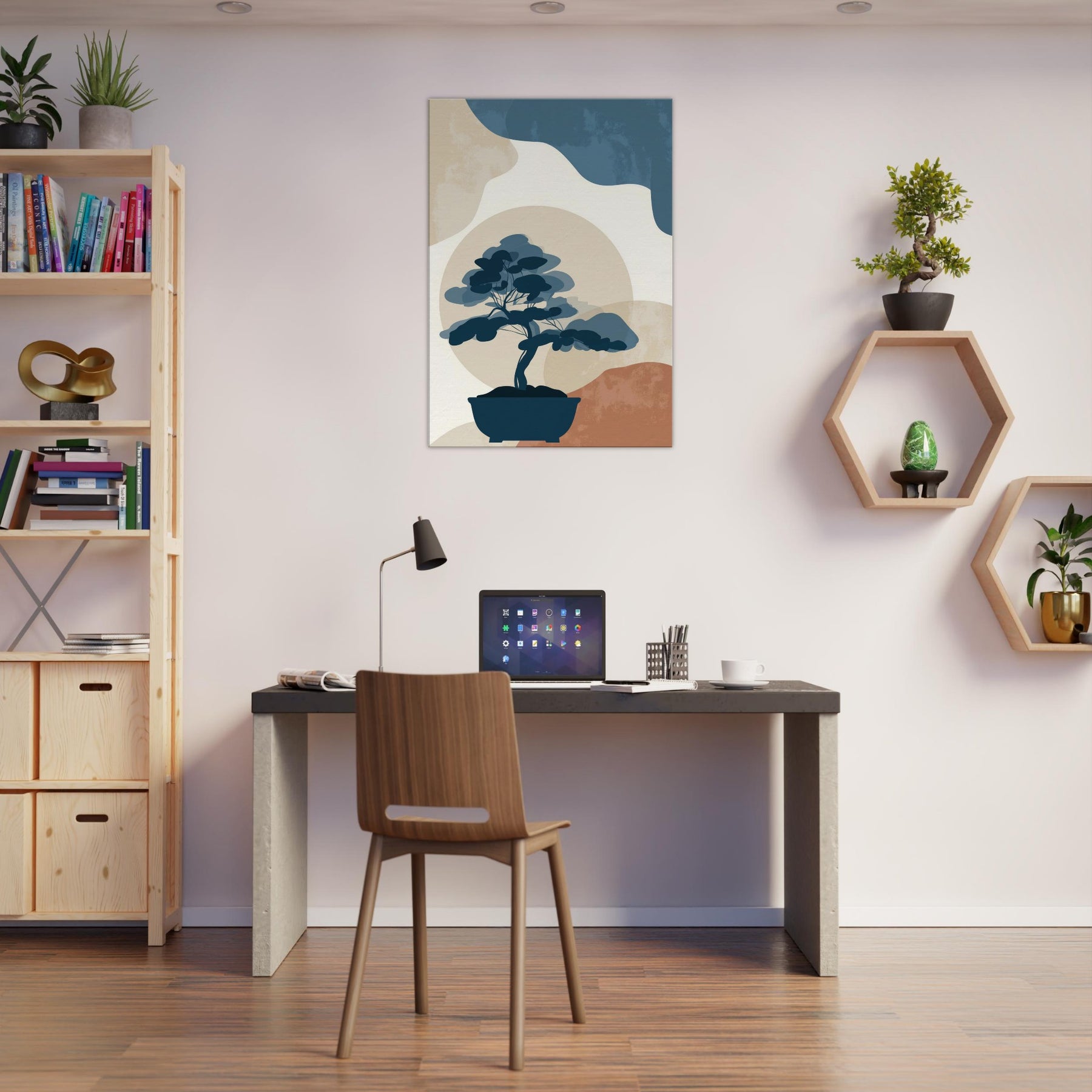 Bonsai Silhouette rests in quiet balance against a soft, sun warmed horizon. This minimalist study uses restrained blues, stone beiges, and a whisper of terracotta to evoke a tranquil without crowding the eye. It invites contemplation, turning any wall into a serene nook where light and shadow meet. The piece exudes refined ease, enhancing living spaces with a sense of quiet confidence, perfect beside a reading chair, in a hallway, or above a console, where everyday rituals become artful pauses.