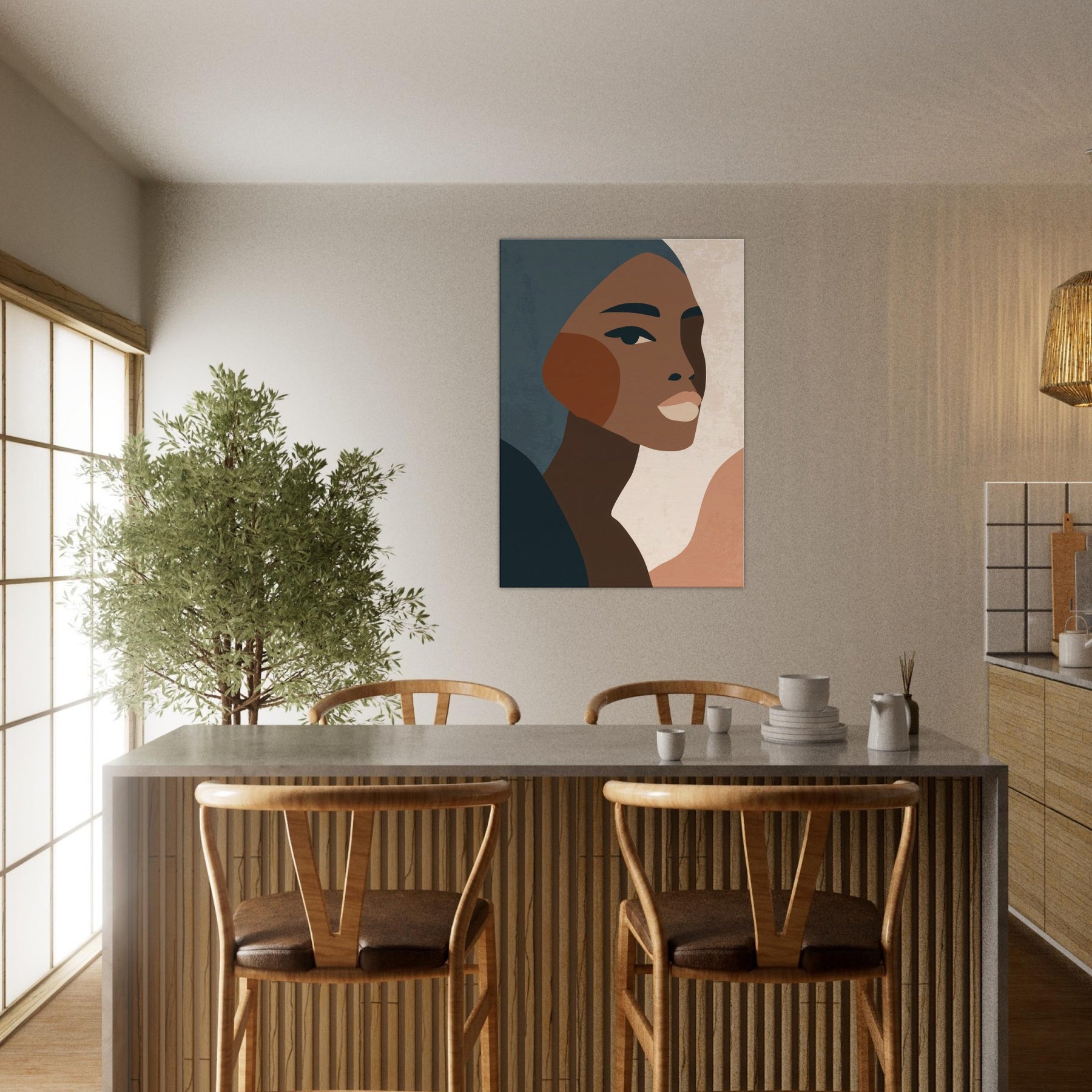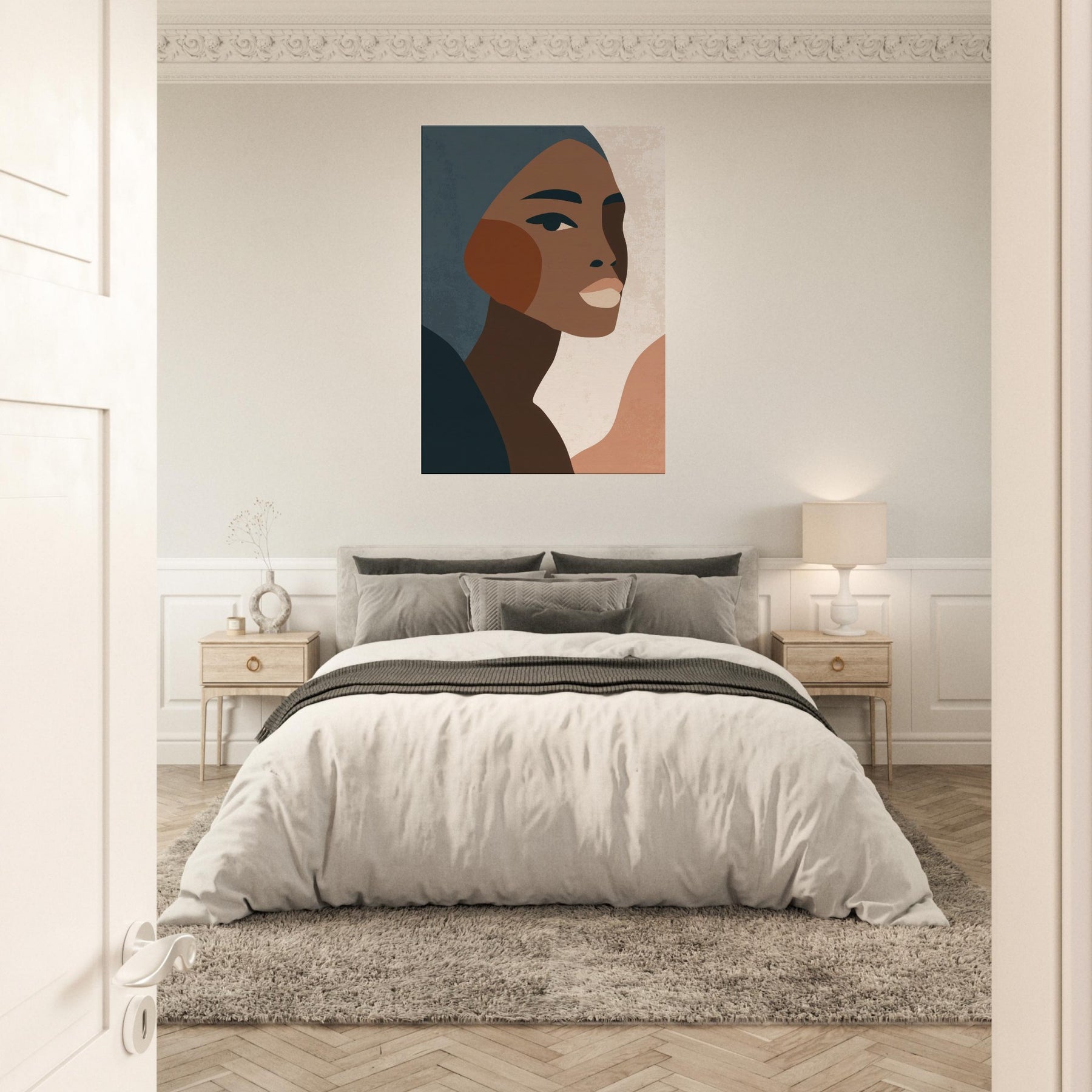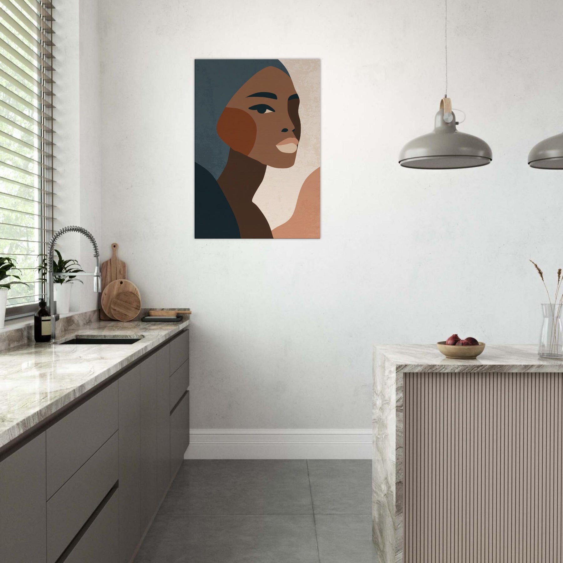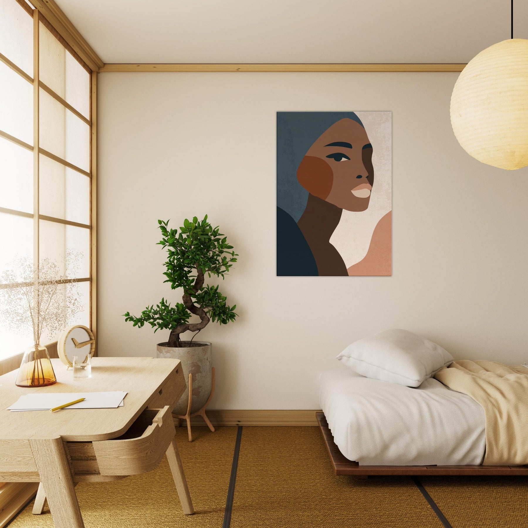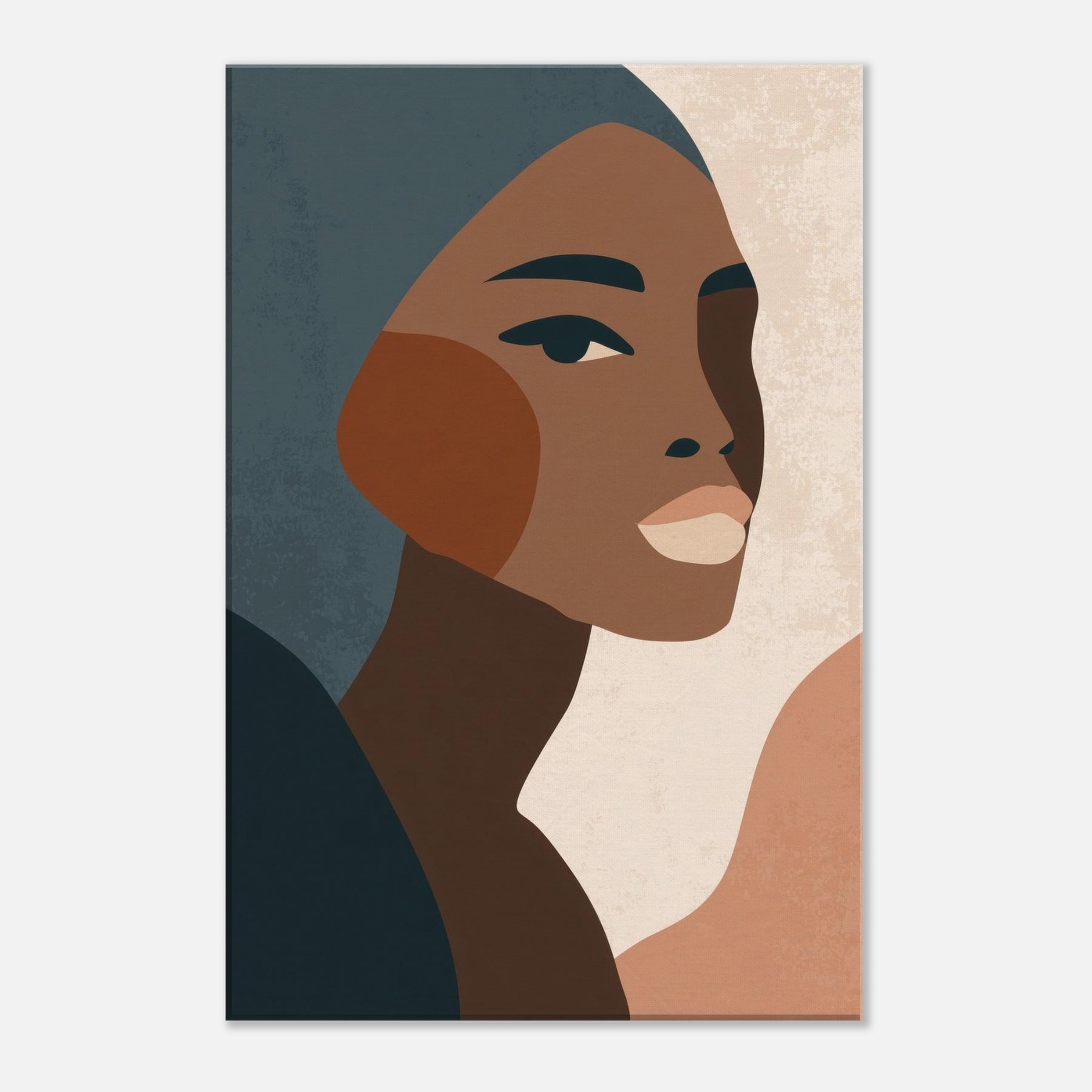 This minimalist African Woman exudes quiet grace through clean lines, warm earth tones, and subtle texture. The profile's poised gaze and elegant cheek curve invite a moment of reflection, turning any wall into a contemplative corner. Soft, layered tones drift against pale negative space, creating atmosphere rather than distraction. Perfect for a living room or bedroom, it layers beautifully with natural woods and muted textiles, elevating daily rituals with a sense of dignified calm. Let this become a timeless focal point in your home.