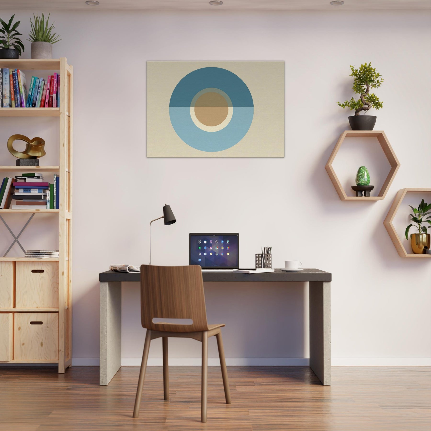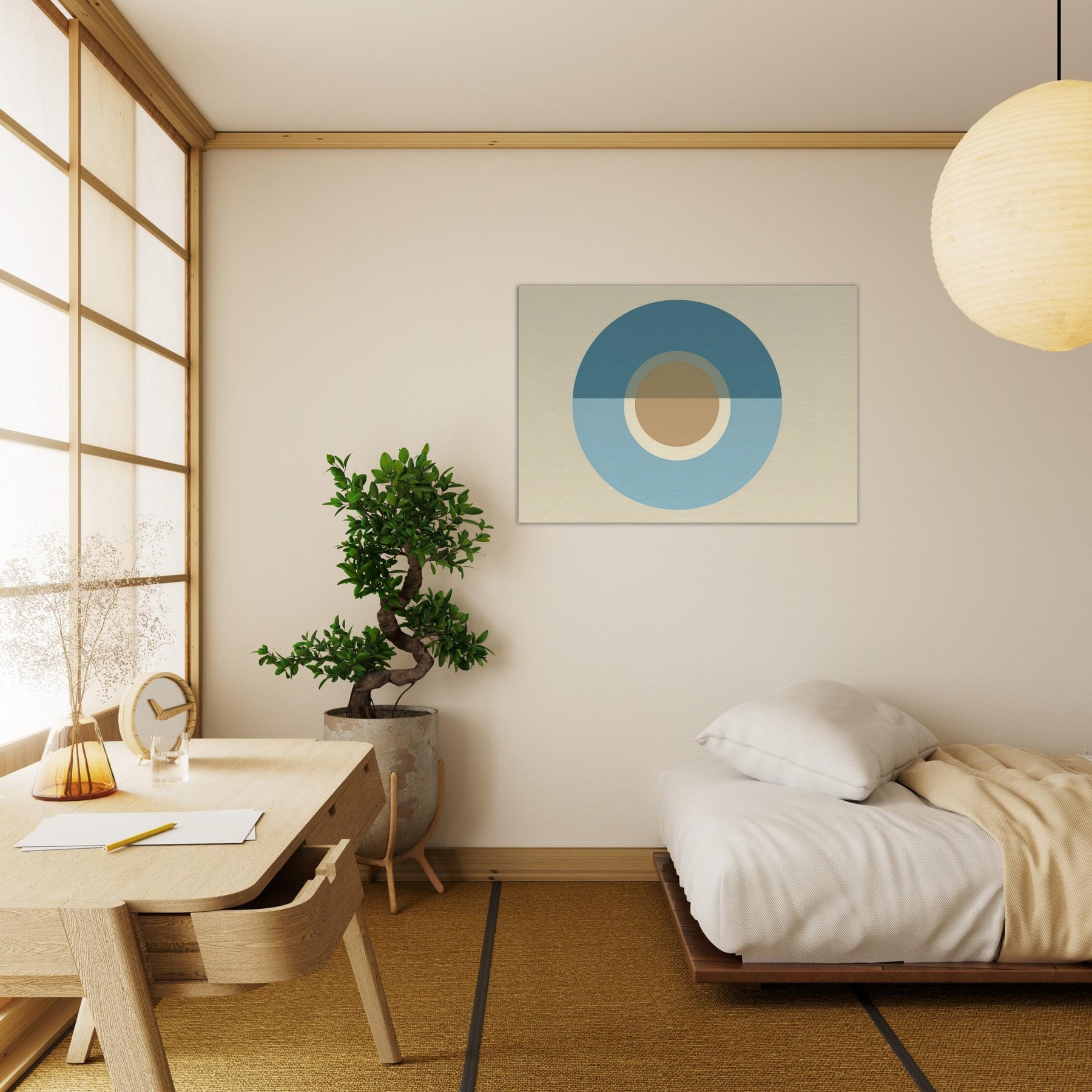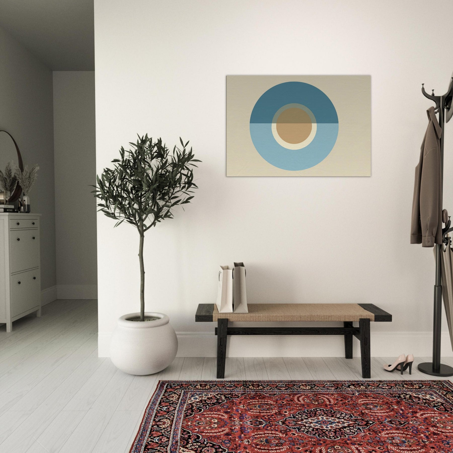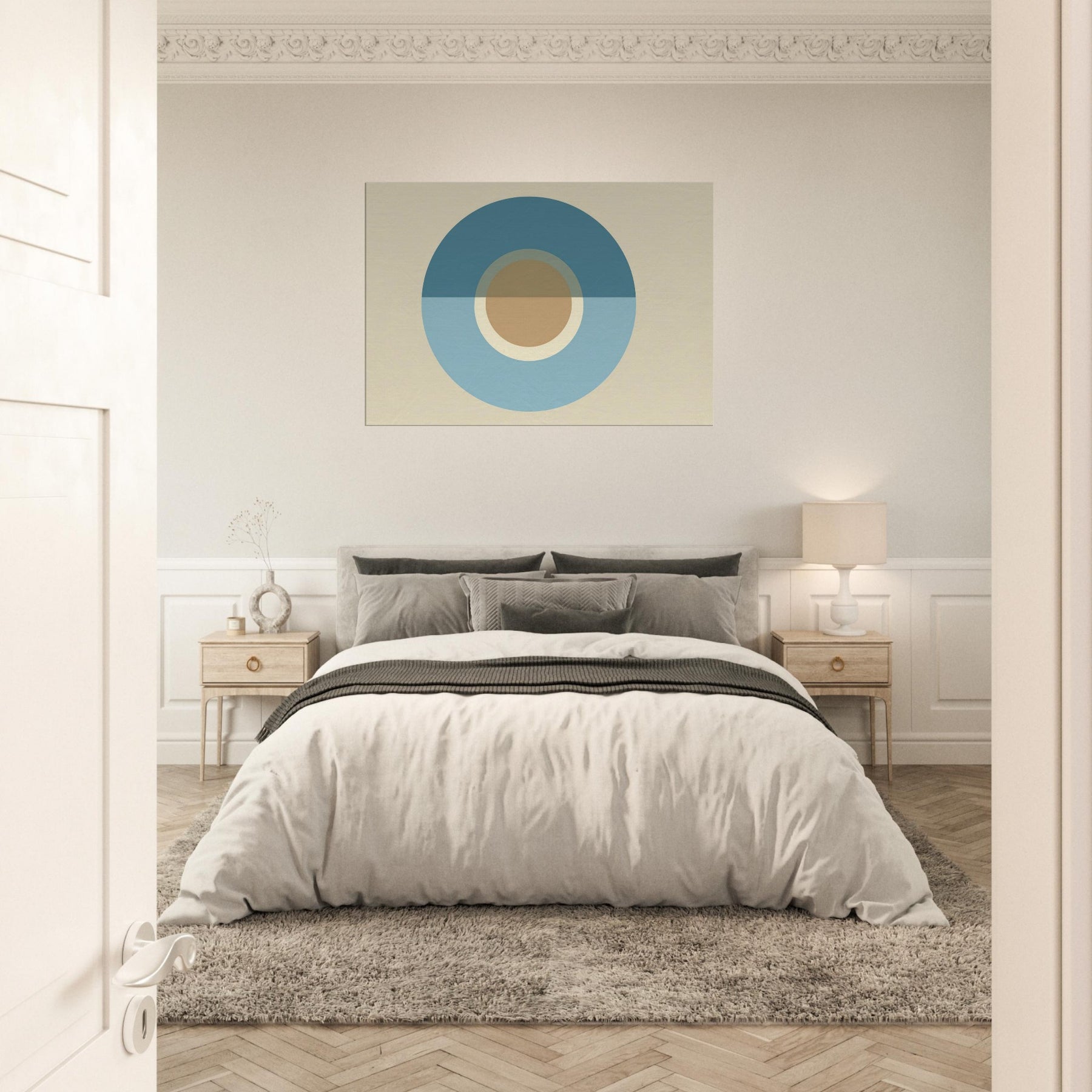 An elegant circle of quiet, this piece captures an Eclipse in serene, layered tones. The top half shifts from slate to deep sapphire, while the lower band rests in pale sky and sand, coaxing the room toward stillness. Its soft, rounded geometry invites contemplation without shouting, pairing with modern furnishings to soften edges and invite luminous reflection. Perfect above a sofa or in a study, it transforms a space into a sanctuary where a mystical hush descends, time slows, and moods settle into calm.