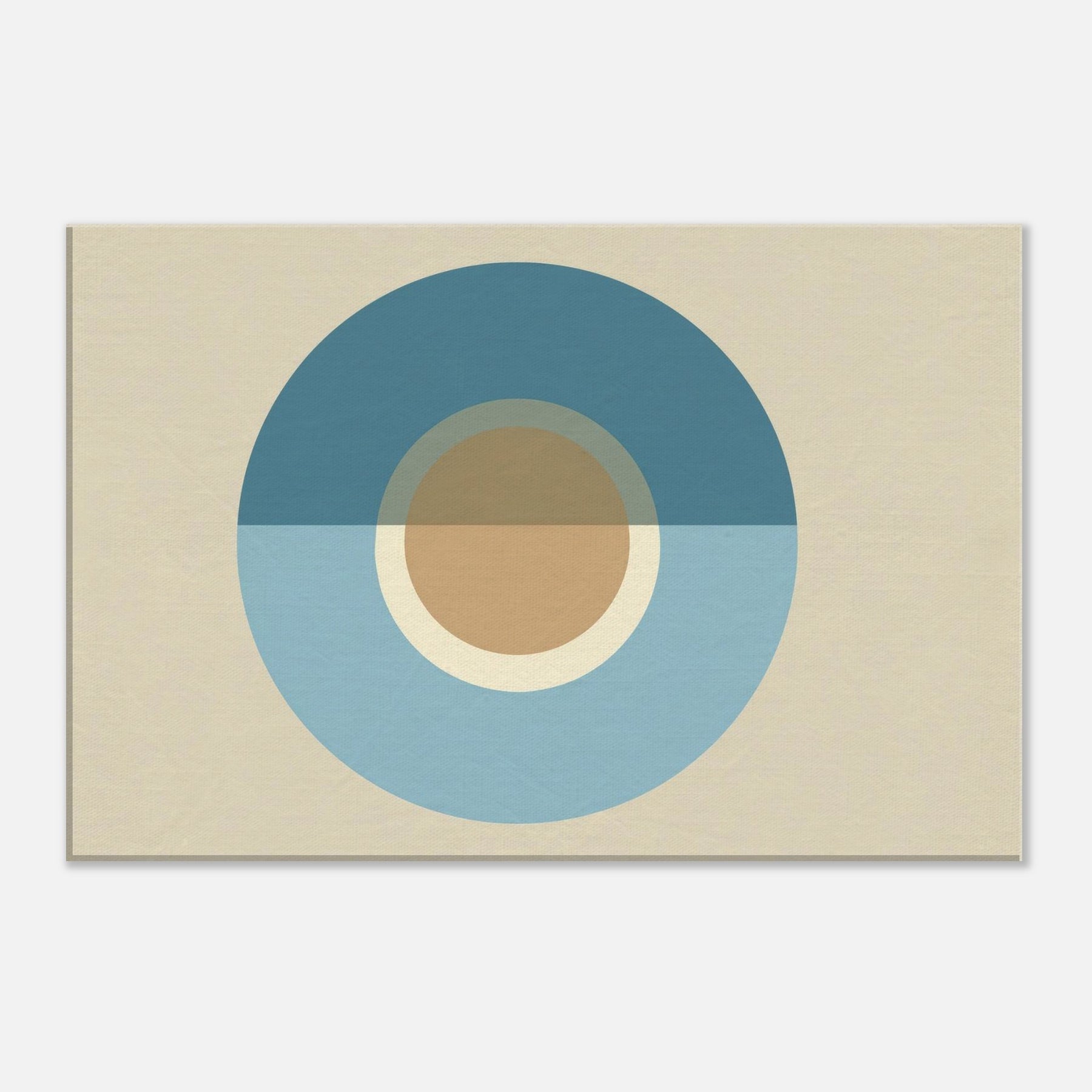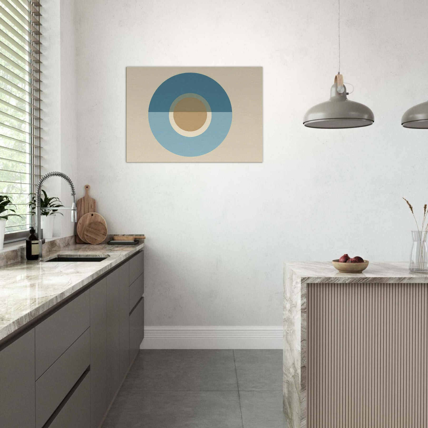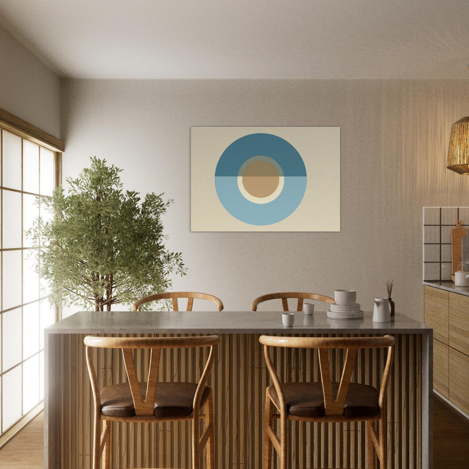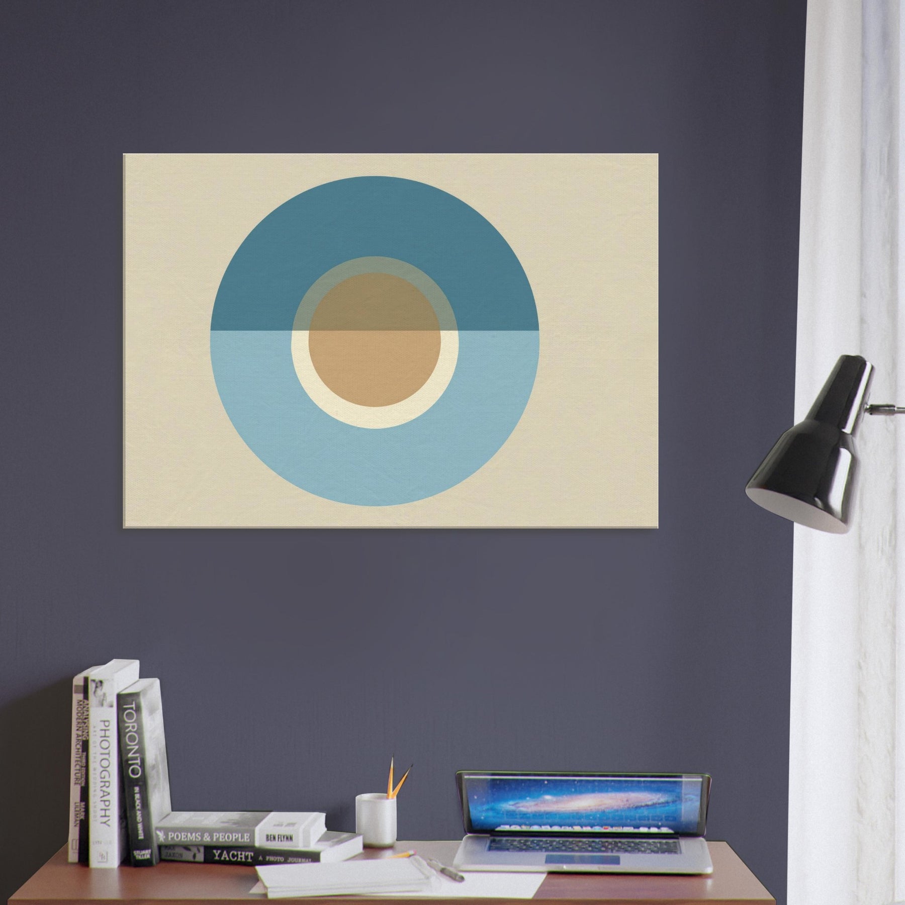 An elegant circle of quiet, this piece captures an Eclipse in serene, layered tones. The top half shifts from slate to deep sapphire, while the lower band rests in pale sky and sand, coaxing the room toward stillness. Its soft, rounded geometry invites contemplation without shouting, pairing with modern furnishings to soften edges and invite luminous reflection. Perfect above a sofa or in a study, it transforms a space into a sanctuary where a mystical hush descends, time slows, and moods settle into calm.