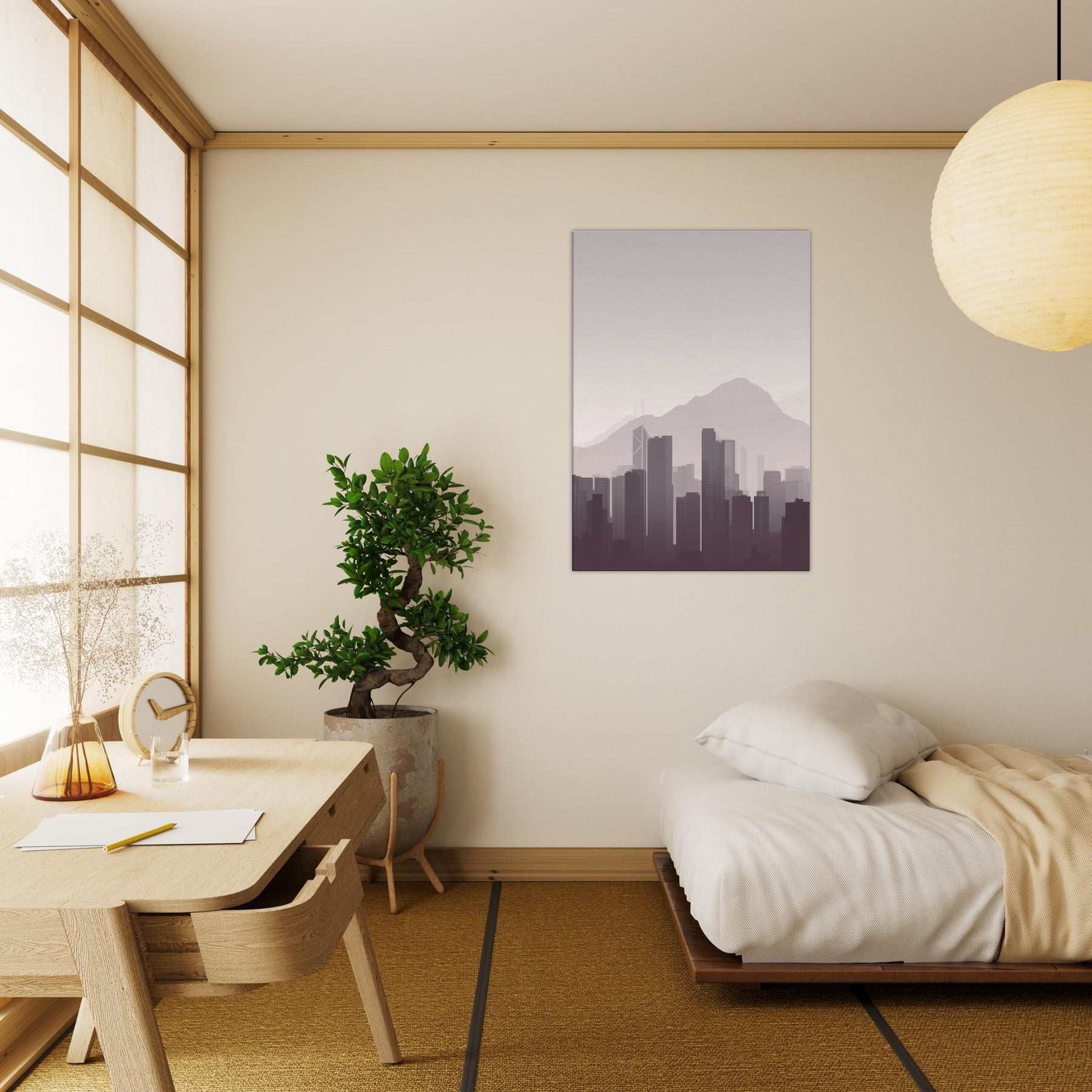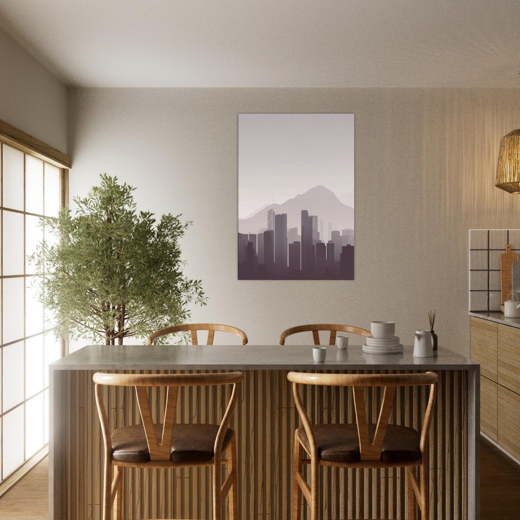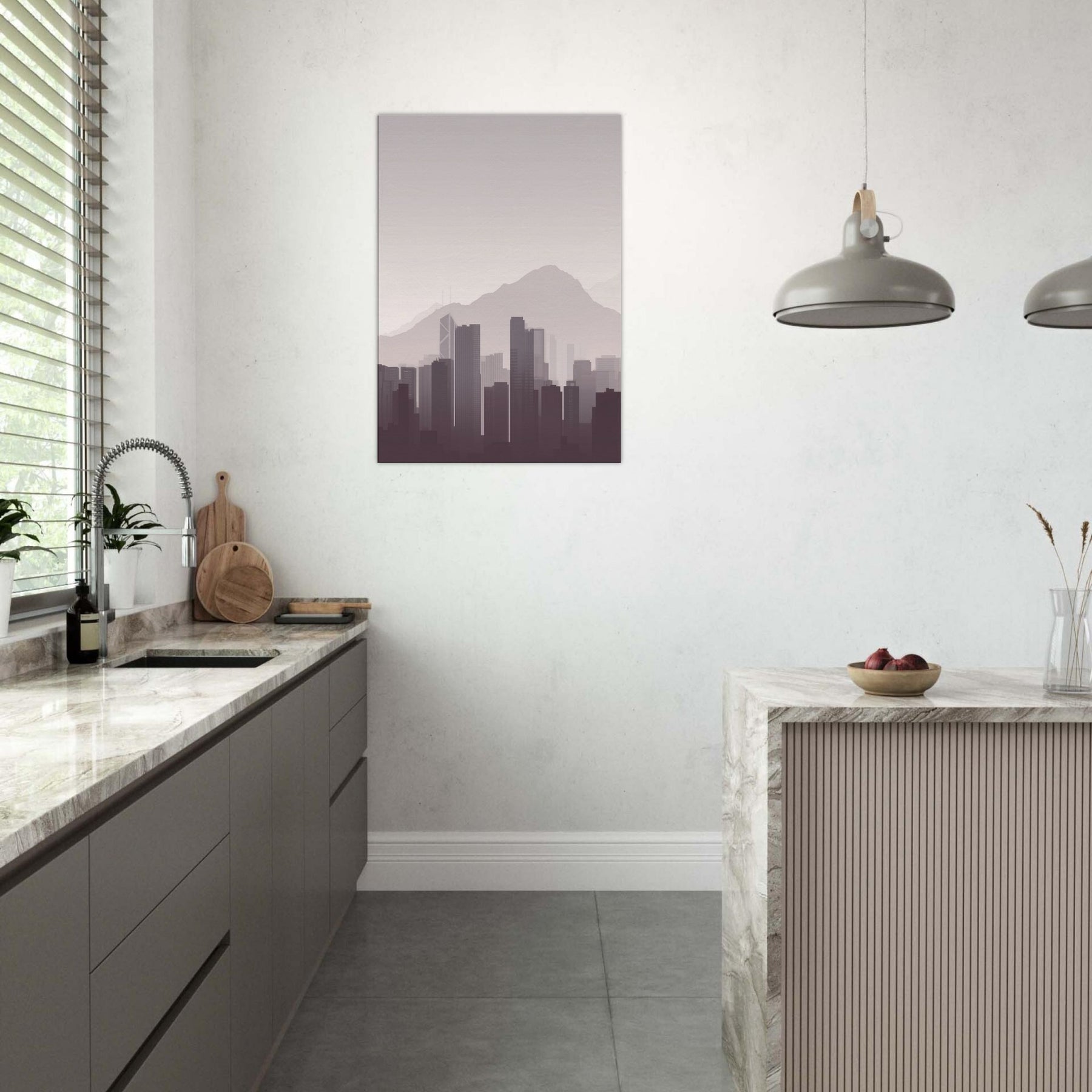 Subtle and serene, this minimalist study of Hong Kong captures the city's quiet drama: towering silhouettes soften into mist against a pale sky, the mountains humbling the skyline. It invites calm into a living room, study, or hallway, inviting you to breathe with the city rather than chase it. The restrained palette and clean lines create space for reflection, making every dawn feel near and every night feel intimate.