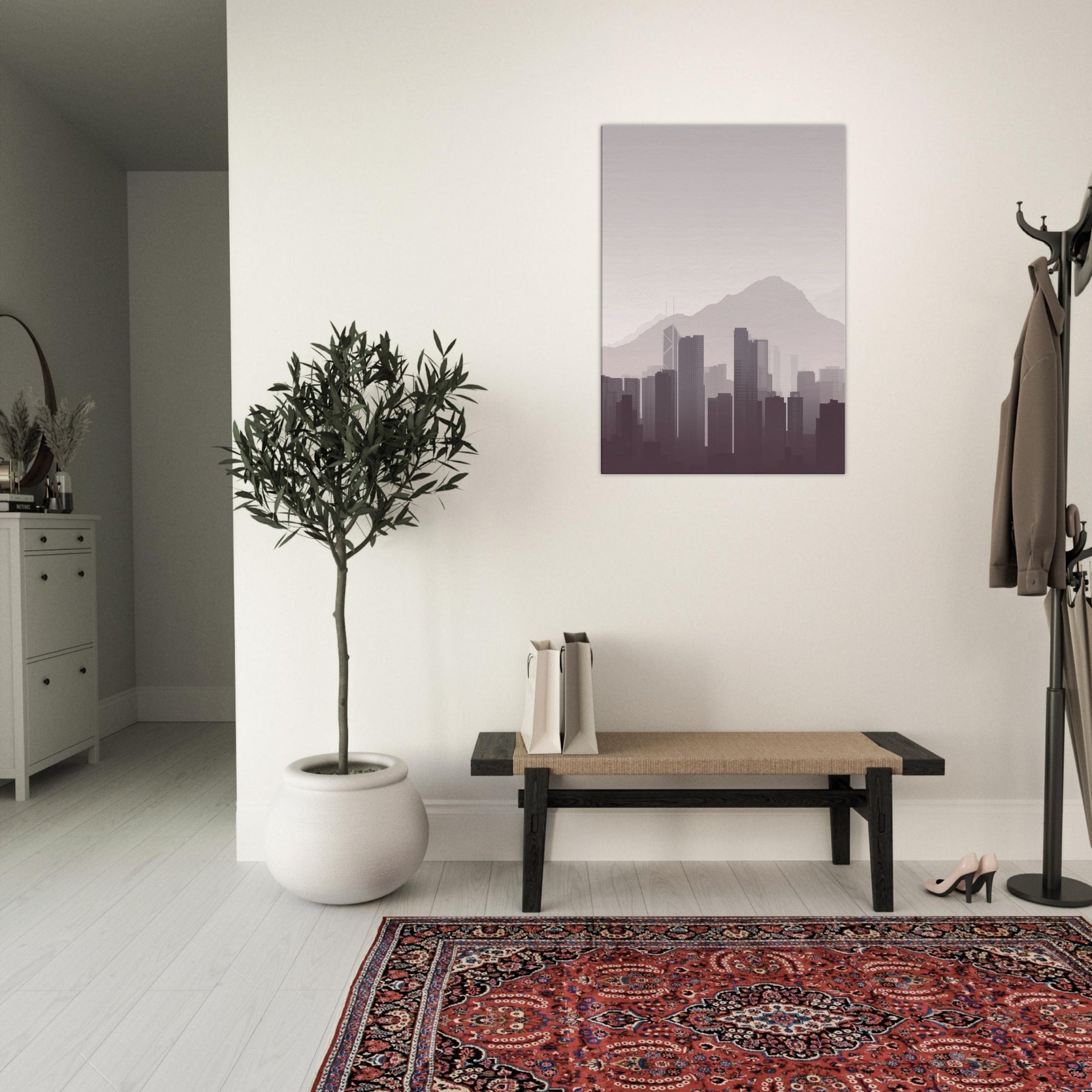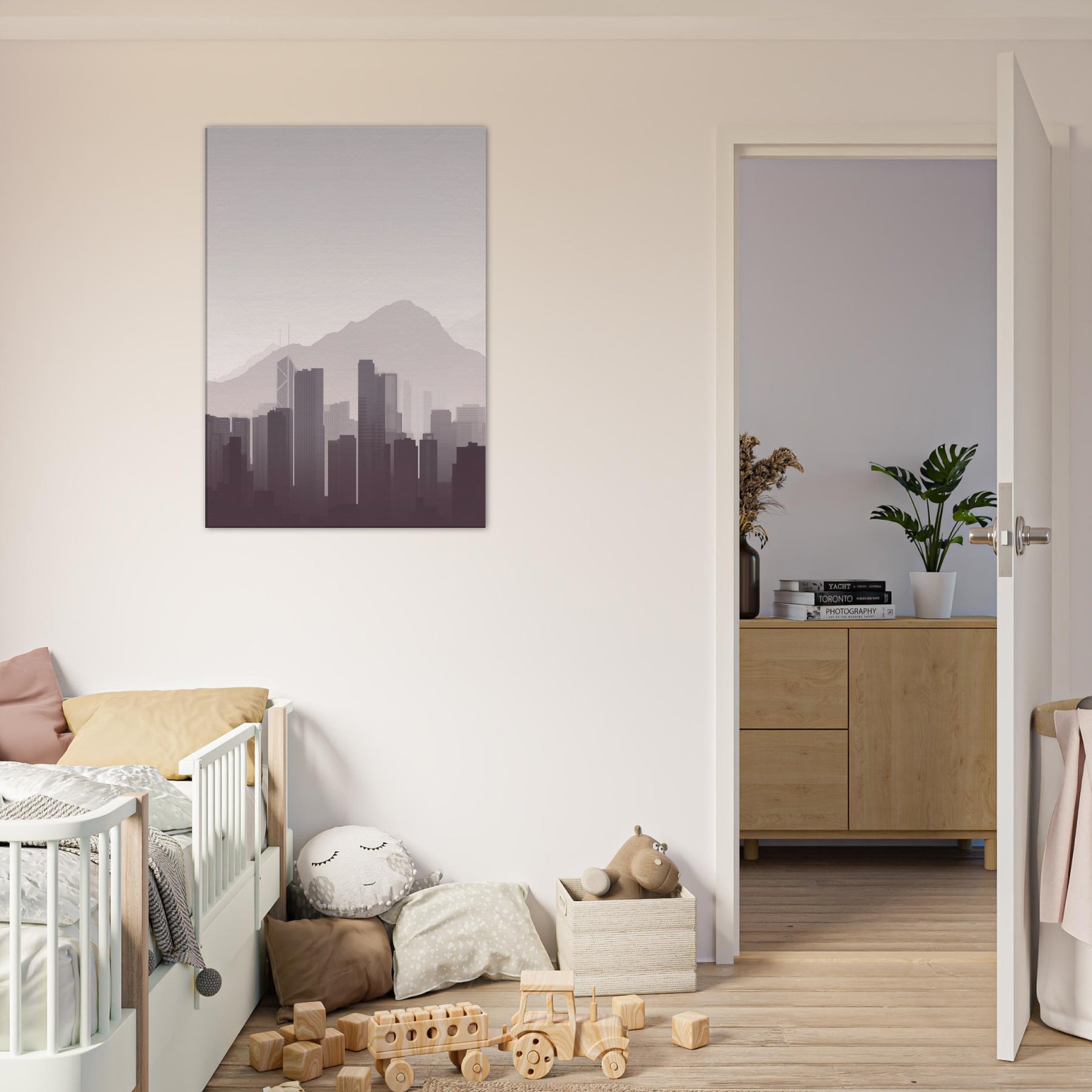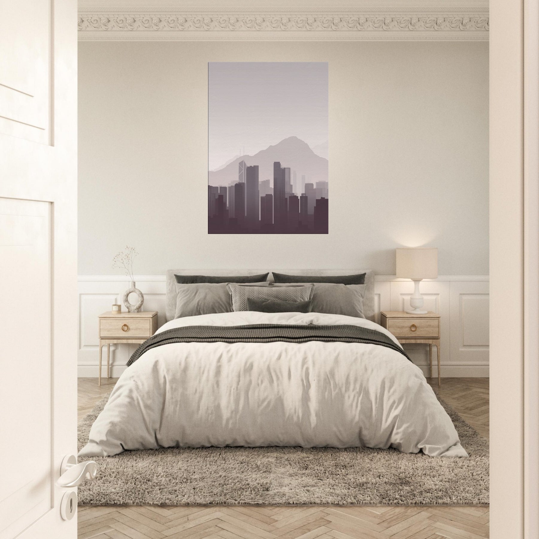 Subtle and serene, this minimalist study of Hong Kong captures the city's quiet drama: towering silhouettes soften into mist against a pale sky, the mountains humbling the skyline. It invites calm into a living room, study, or hallway, inviting you to breathe with the city rather than chase it. The restrained palette and clean lines create space for reflection, making every dawn feel near and every night feel intimate.