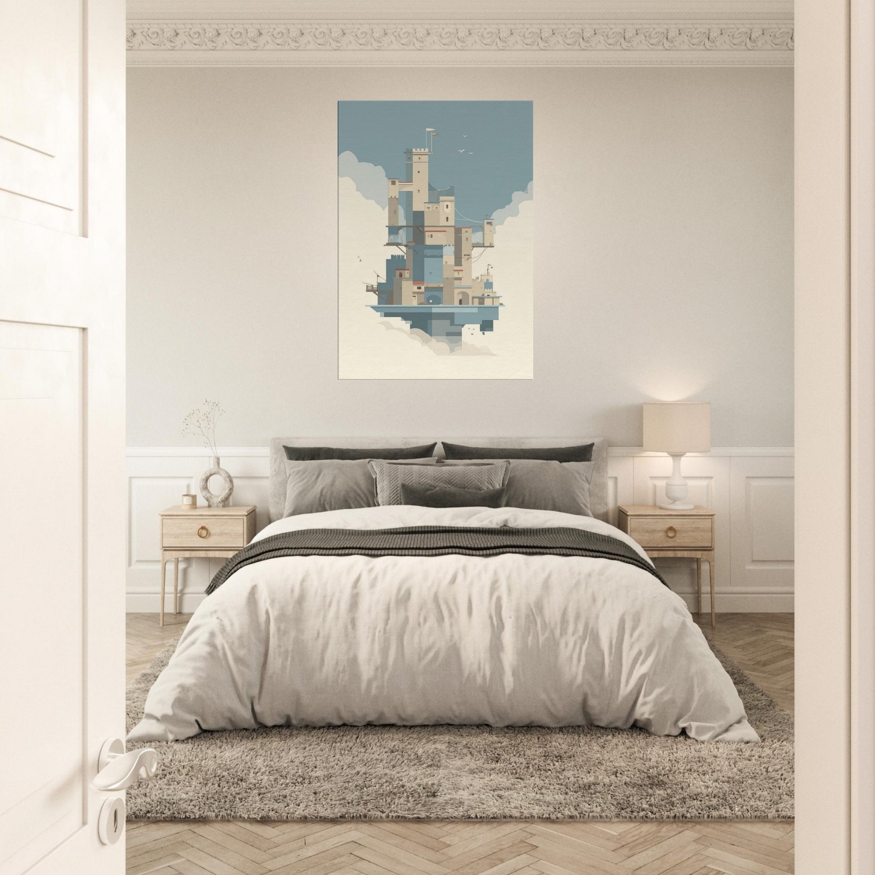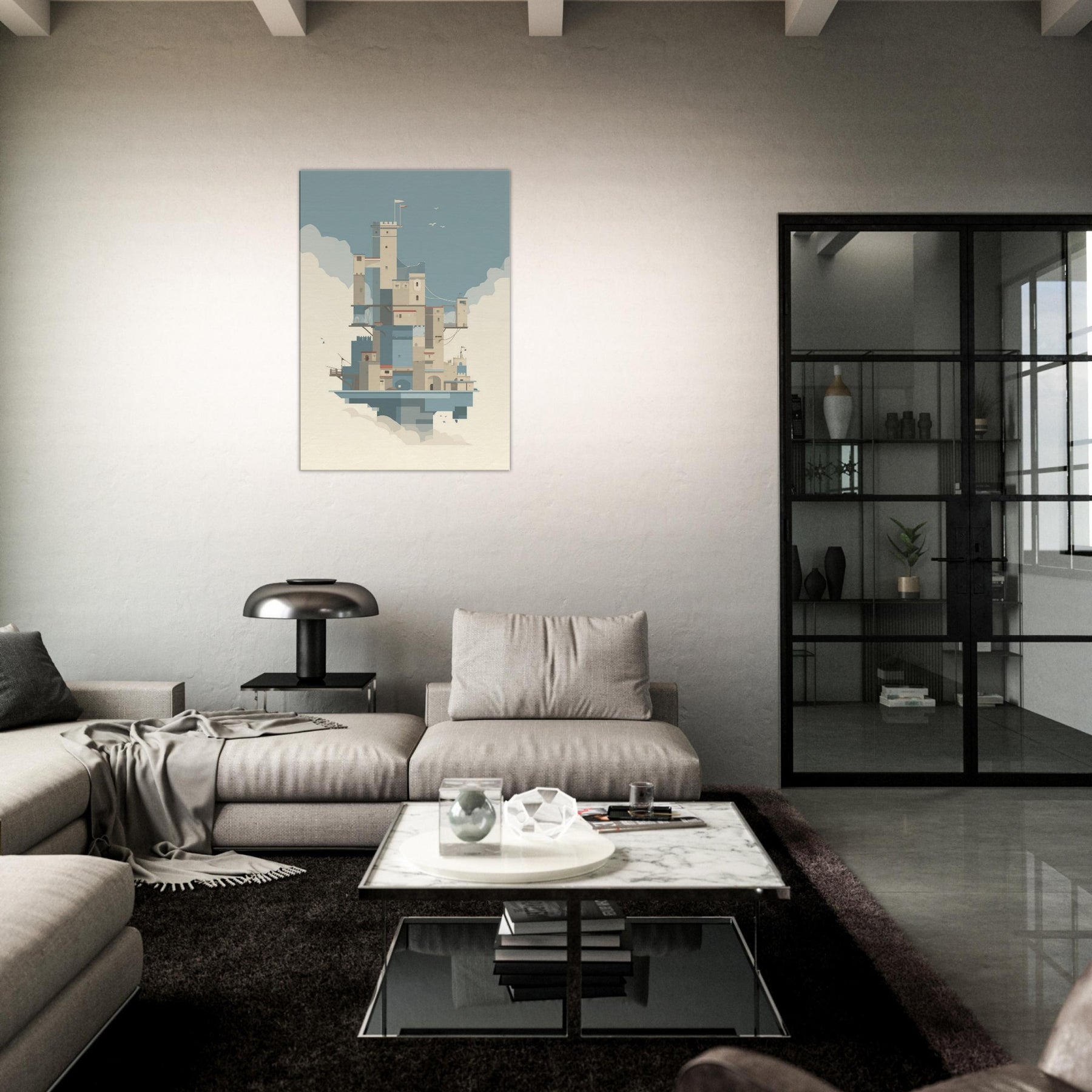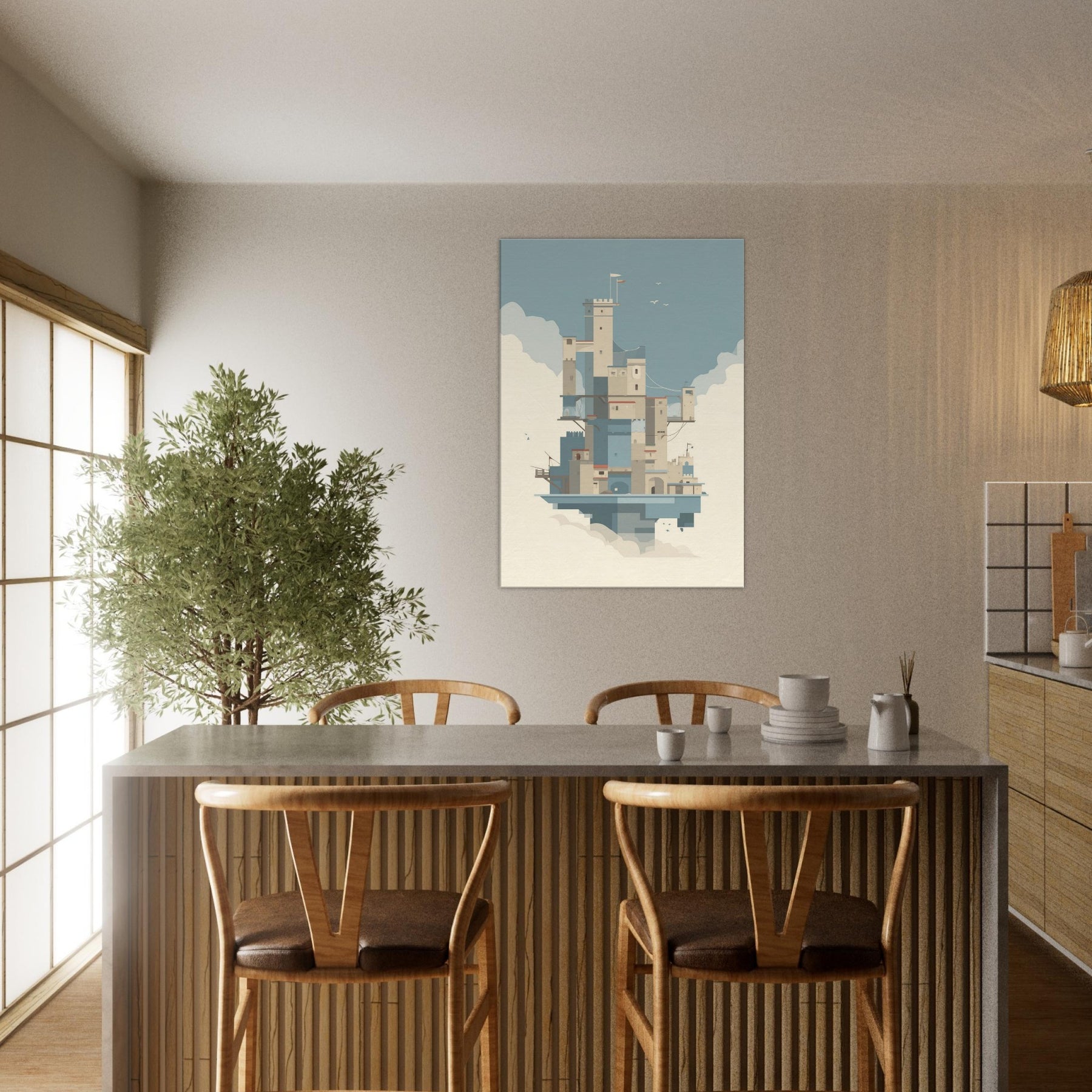 Let your walls breathe with a tranquil reverie as a Floating City rests among pale clouds, each blocky tower tied by pale bridges and whispered wind. This minimalist fantasy evokes quiet wonder rather than grandeur, inviting soft light and calm to your living space. The color palette cream, slate, oat, and sky textures the room with imagined sea breezes and distant bells. Perfect above a sofa or desk, it anchors conversations and offers a daily reminder that imagination can lift the room.